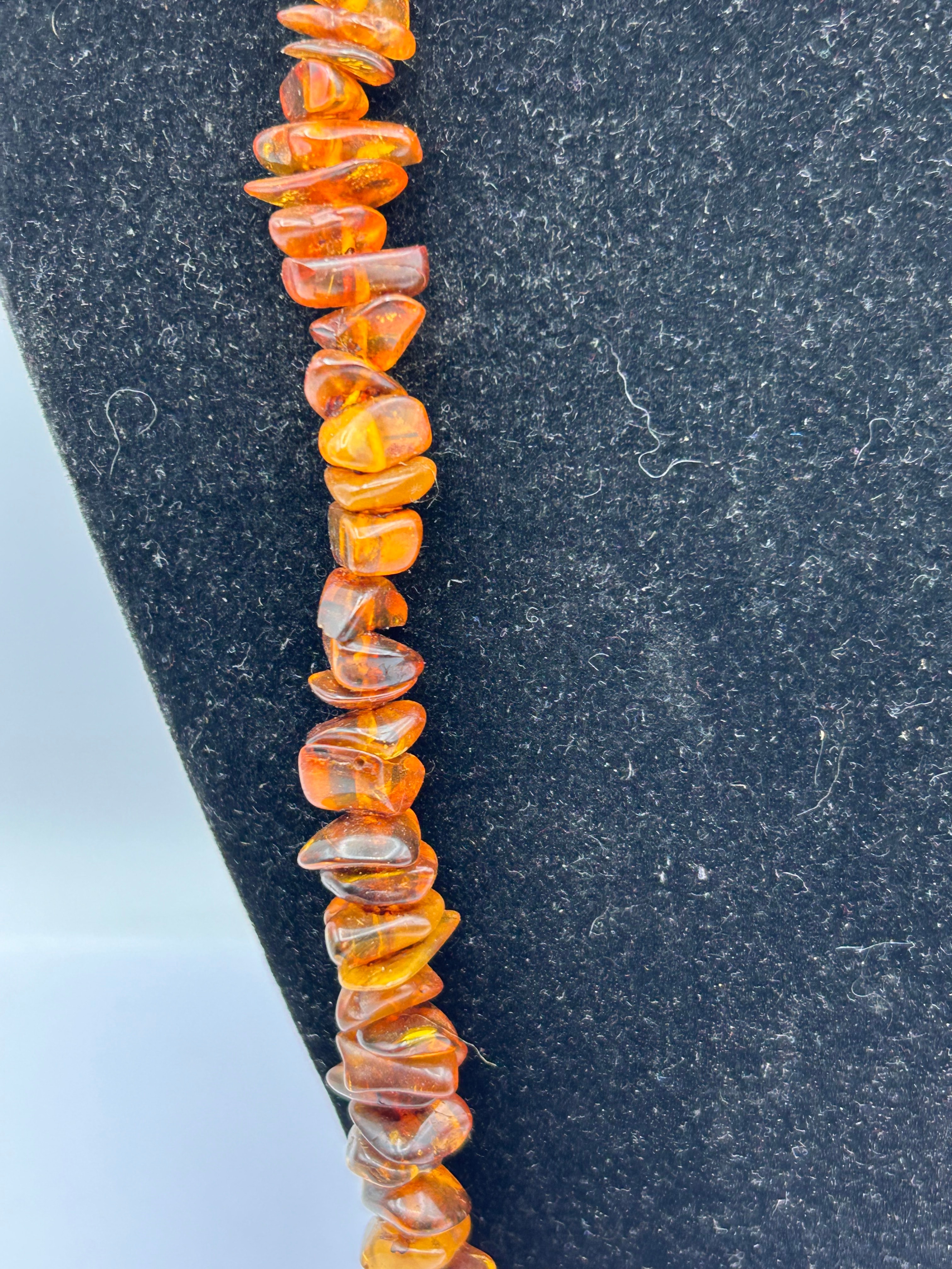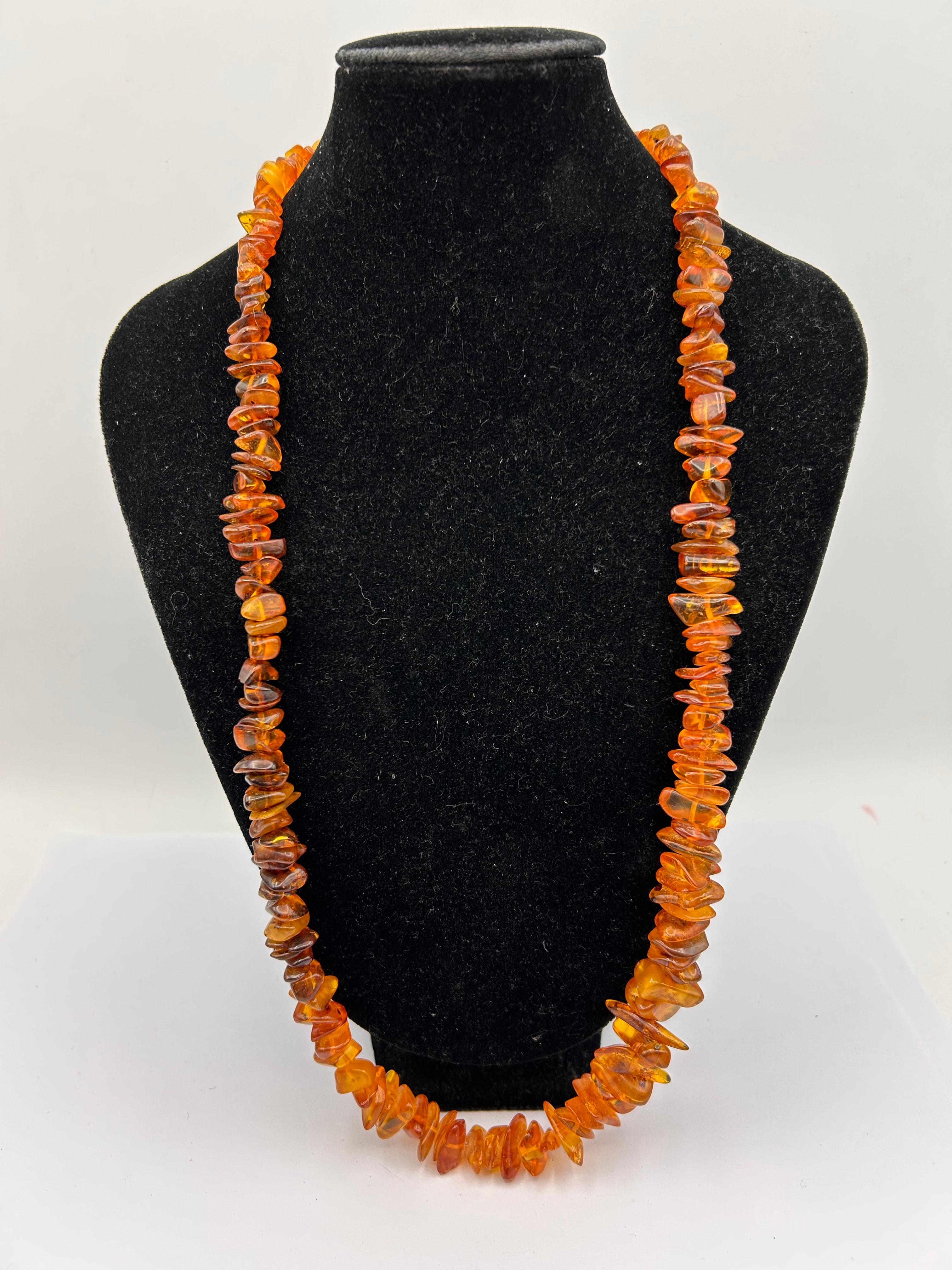 A Natural Baltic Amber Baroque Bead Strand Necklace. Composed of numerous irregular, somewhat polished, and tumbled-like pieces of natural amber, exhibiting a translucent to semi-translucent quality. The beads display a spectrum of warm tones, ranging from honey yellow to deep orange and cognac brown. The individual pieces vary in size and organic shape, strung together to form a continuous strand. No clasp or other metal components are visible. Natural inclusions and internal variations in color and clarity are visible within the individual beads.