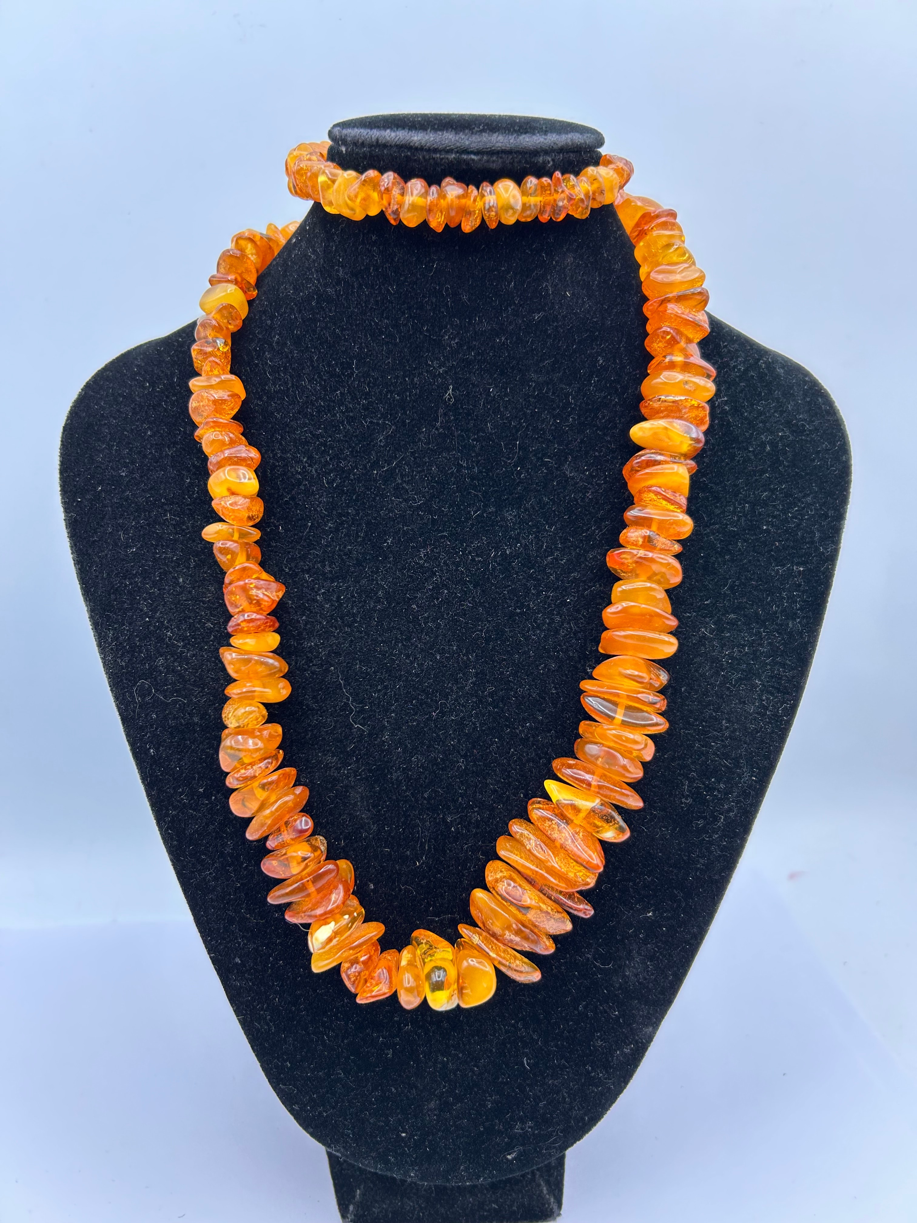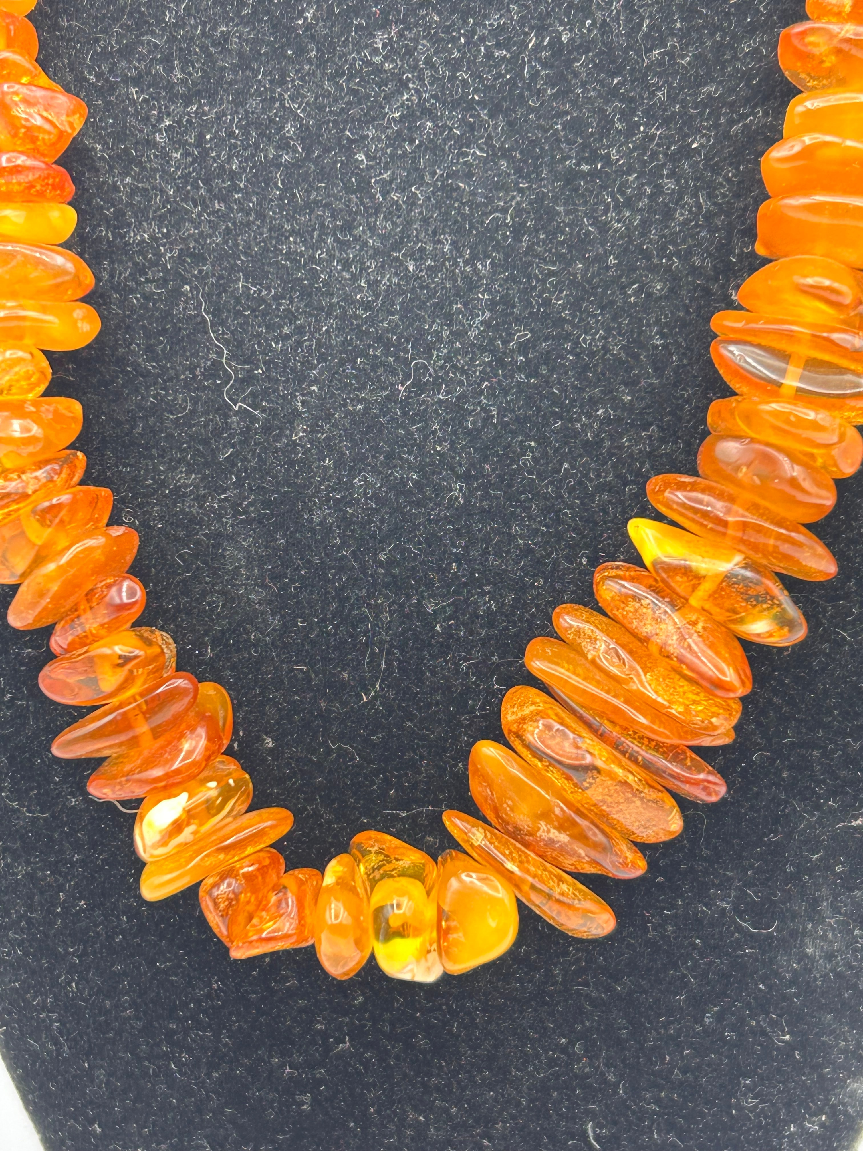 l Baltic amber jewelry, a necklace of irregularly shaped, tumble-polished, translucent amber beads, exhibiting a range of golden to deep orange-brown hues. Natural internal inclusions are visible in several beads, characteristic of natural amber. The necklace features graduated beads, larger towards the front
