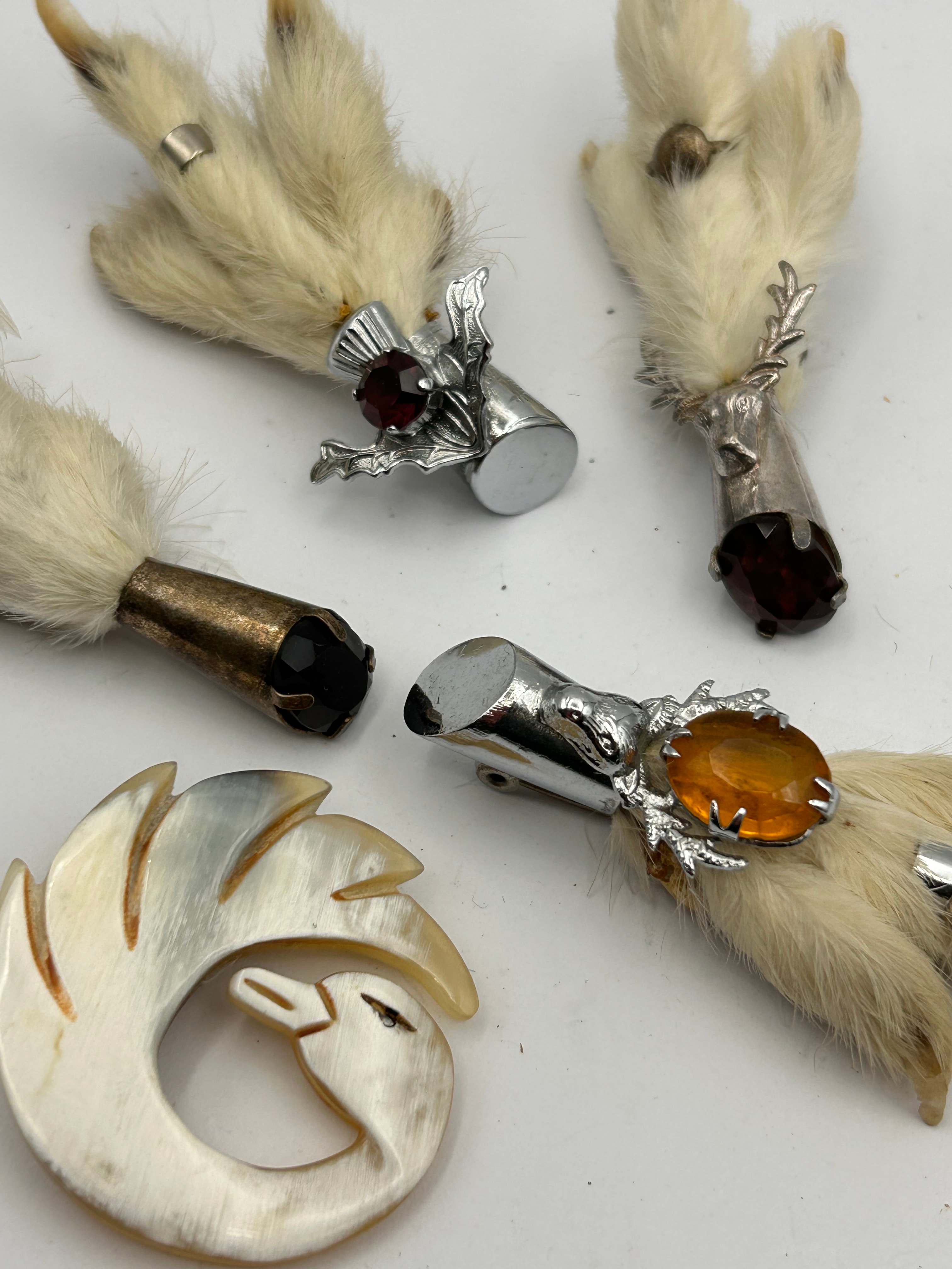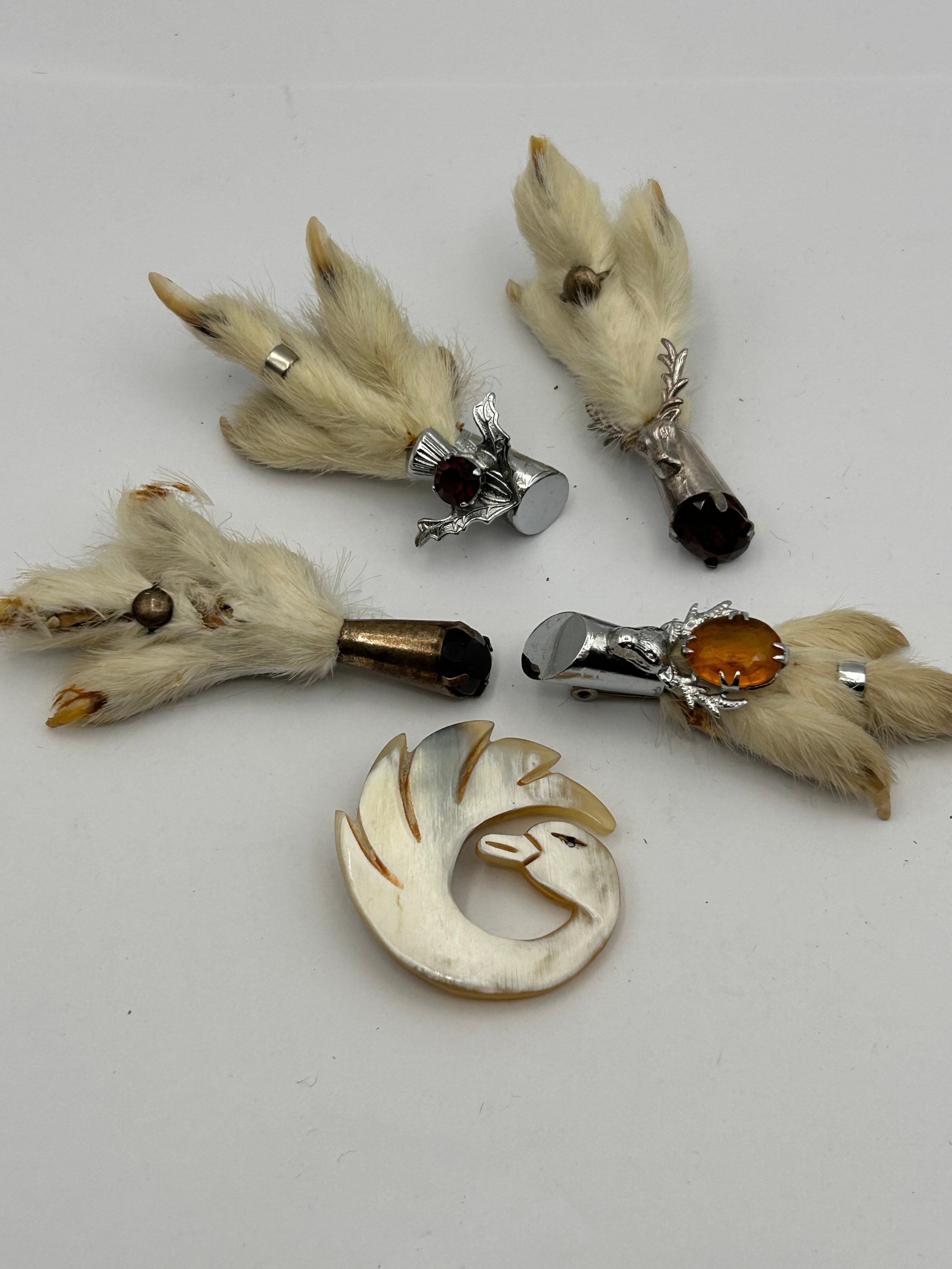 A collection of four grouse foot brooches or kilt pins and one carved shell brooch. The four taxidermy animal paws, likely from a small mammal, are each mounted with a metal cap and a gemstone. Two paws feature silver-toned metal caps with a stylized deer antler or stag head motif, each set with a faceted red gemstone. A third paw has a similar silver-toned metal cap and motif, set with an oval amber-colored cabochon gemstone. The fourth paw is fitted with a brass or bronze-toned metal cap holding a faceted black gemstone. The fifth item is a carved, iridescent natural material, likely shell or horn, depicting a stylized swan or goose, which appears to be a brooch or pendant. No visible text, hallmarks, or maker’s marks are discernible on any of the items.