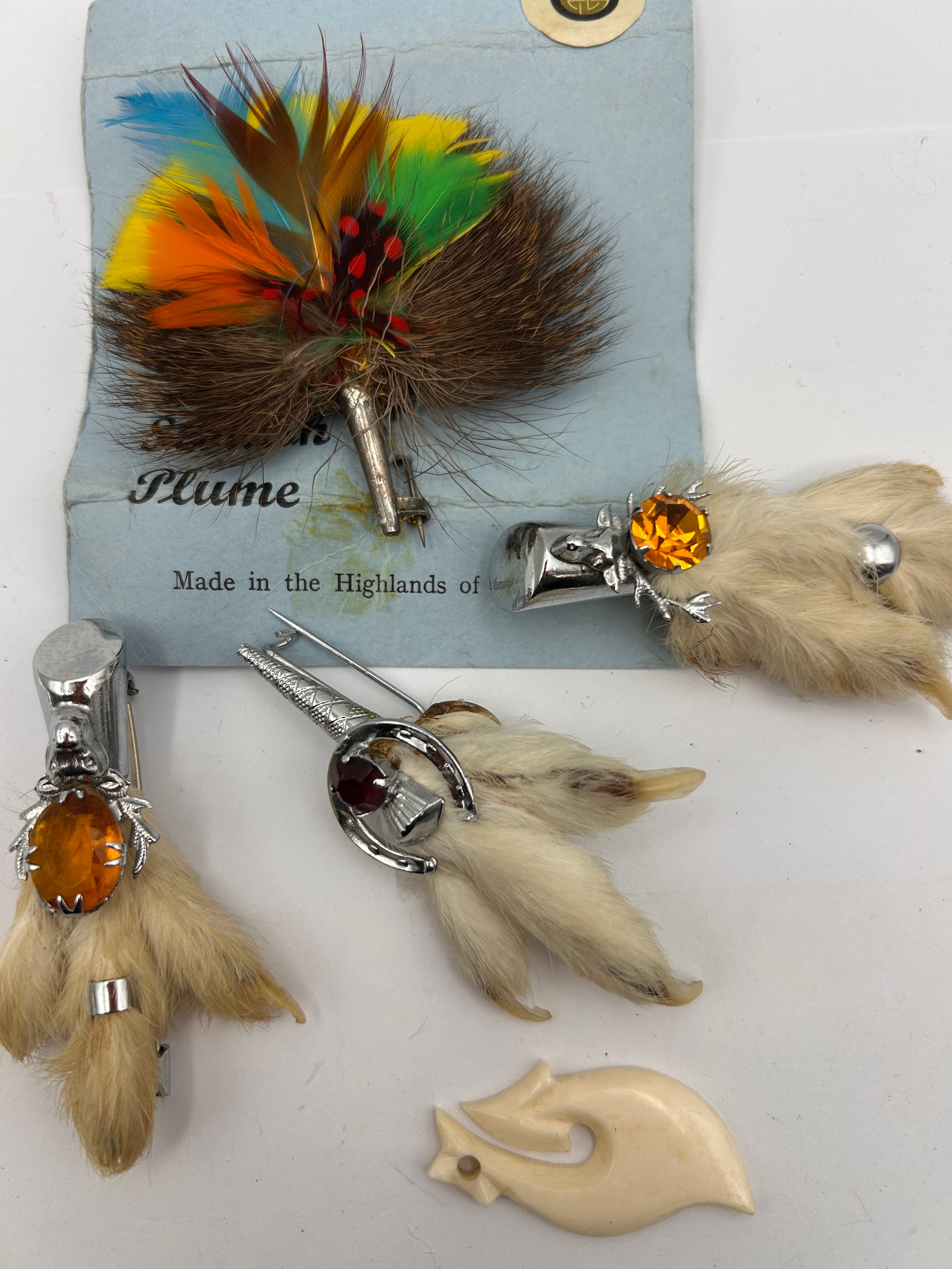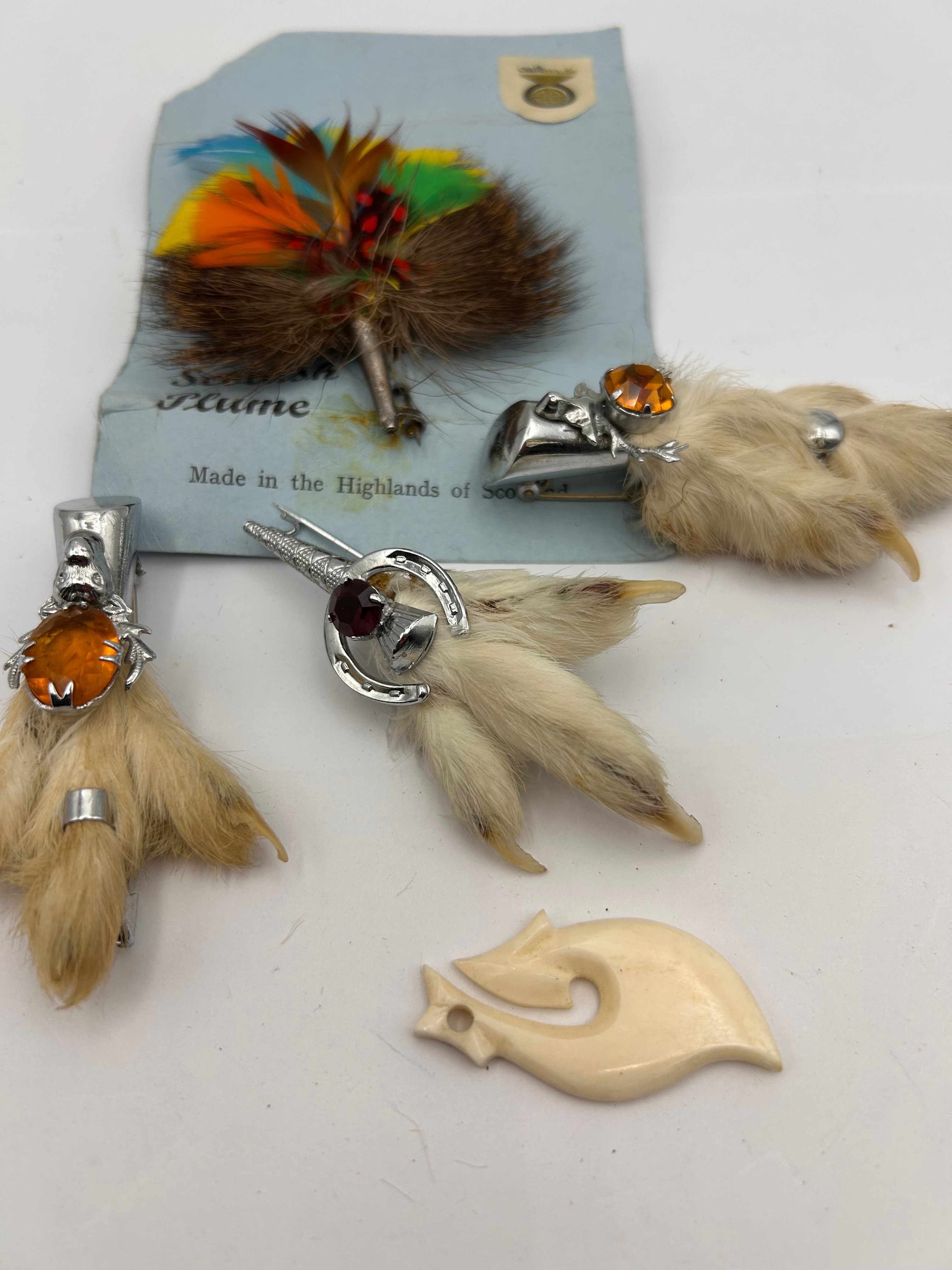 A collection of five Scottish souvenir items. This group includes three brooches crafted from preserved animal paws with natural fur and claws, each mounted with silver-colored metal fittings. Two feature faceted amber-colored glass or acrylic stones, while one incorporates a red glass or acrylic stone and a horseshoe motif. Also present is one “Scotsman Plume” brooch, composed of brown fur and vibrant multi-colored feathers, mounted on its original light blue card which reads “Scotsman Plume” and “Made in the Highlands of Scotland”. The collection is completed by a small, off-white carved charm depicting a stylized animal, possibly a fox or canine, with a star cut-out, likely made of bone, an ivory substitute, or a synthetic material.