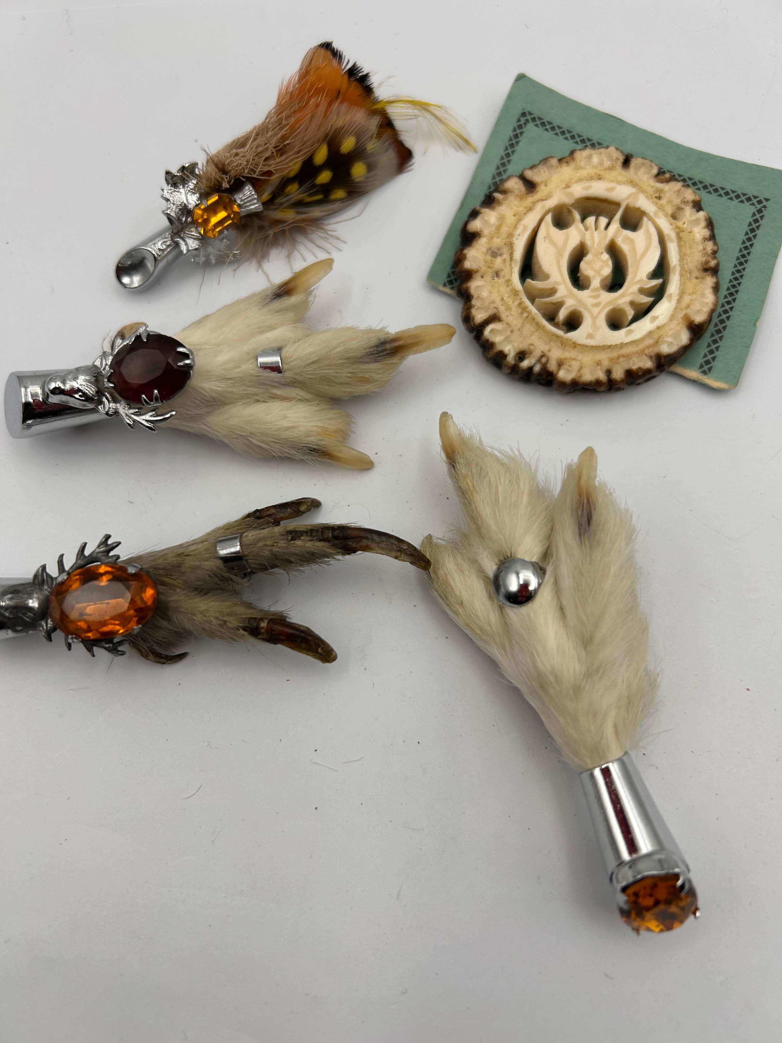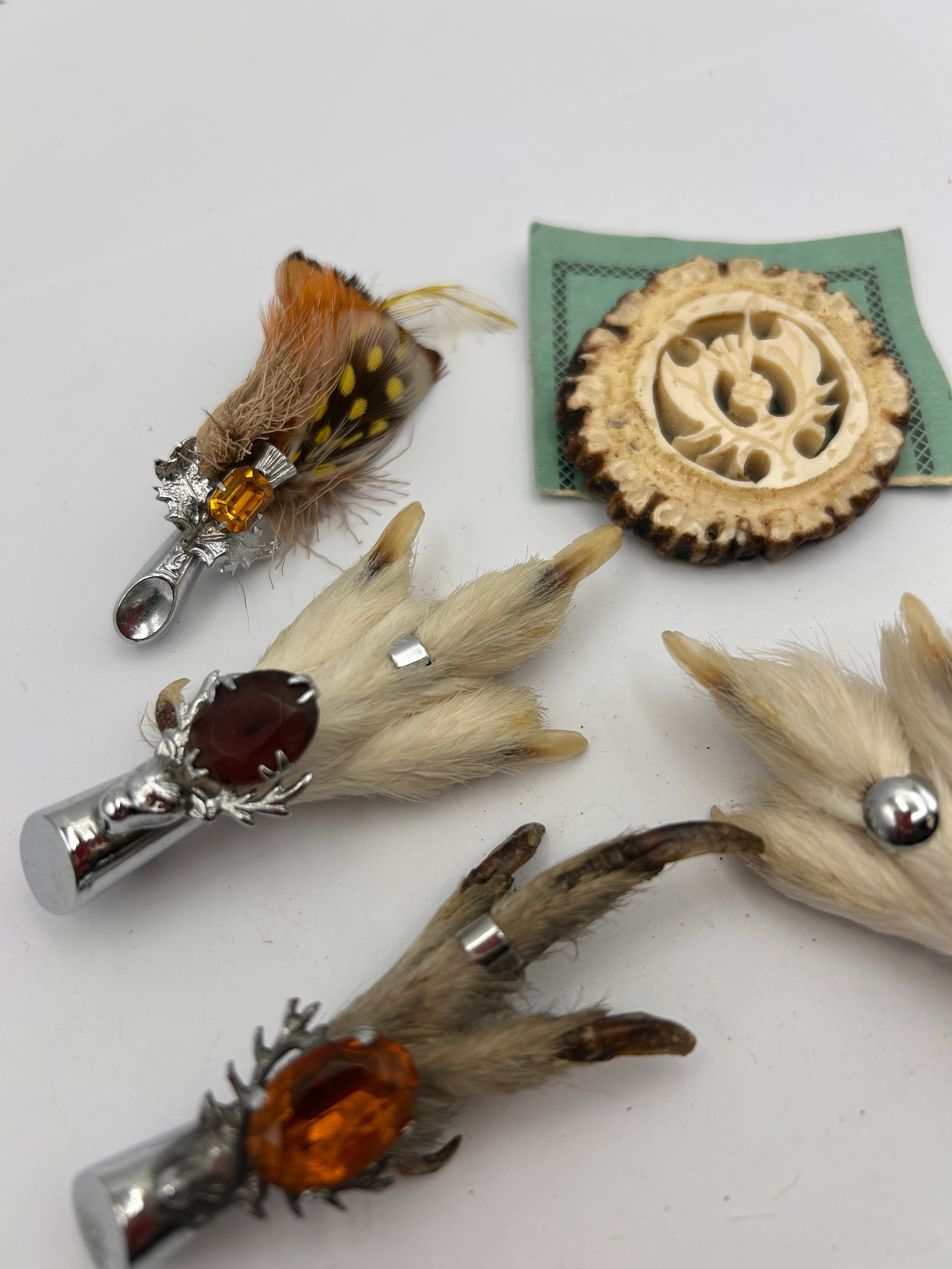 A collection of five vintage Scottish grouse foot and hunting-themed brooches and pins, consistent with traditional Central European hunting-trophy or Trachten aesthetics. The group includes three brooches crafted from real animal paws, identified in the market as grouse or rabbit feet, each fitted with polished silver-toned metal caps. Two of these paws prominently display large faceted glass cabochons (one dark reddish-brown, one amber) set in stylized antler-motif bezels, while the third features a simple spherical metal accent. An additional item is a feather arrangement, primarily brown with variegated orange and yellow plumage, mounted in a silver-toned metal setting which includes a small faceted yellow-orange glass cabochon and a tiny, spoon-like detail. The final piece is a circular, intricately carved disk of antler or bone, depicting a stylized animal surrounded by scrollwork, mounted on a small piece of green patterned cardstock. No discernible text or manufacturing marks are visible on any of the items or their backings.