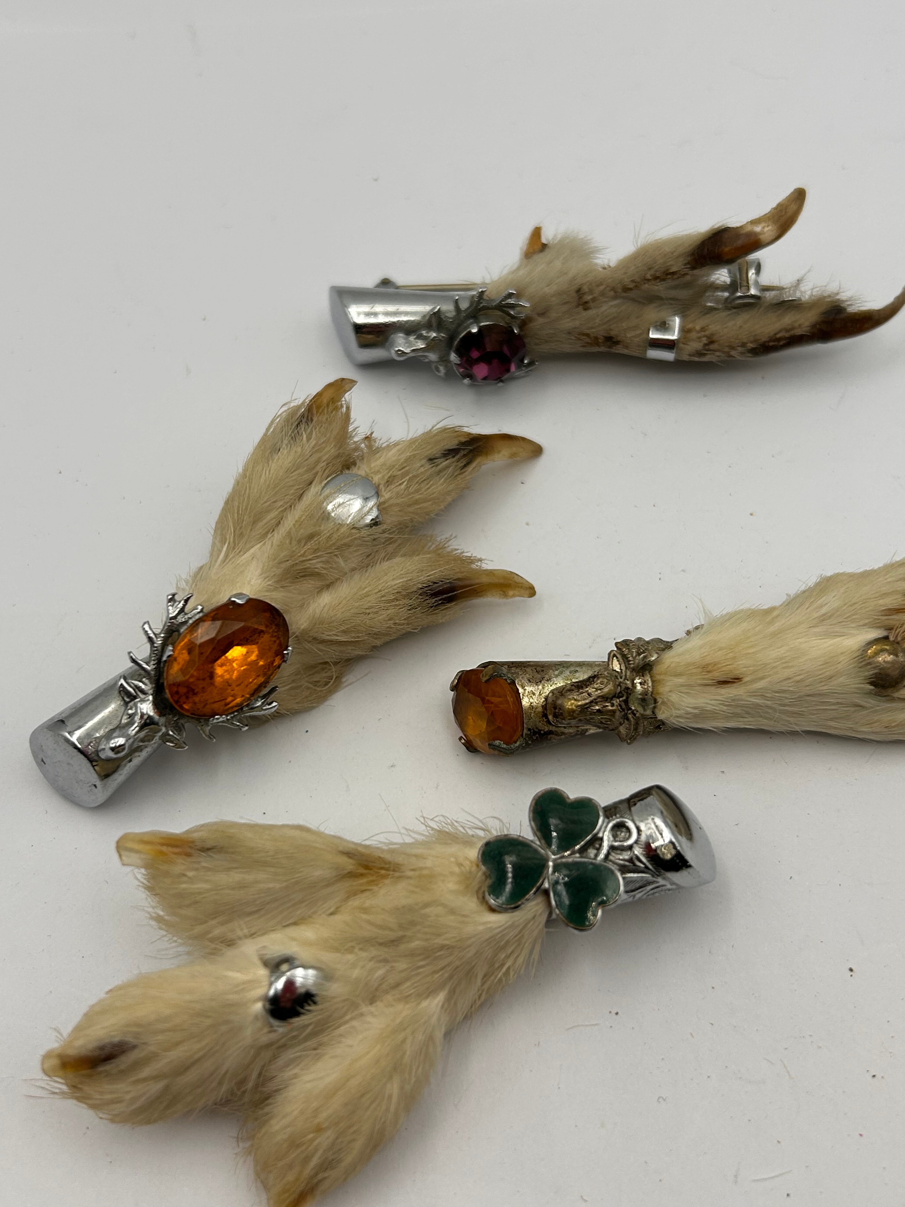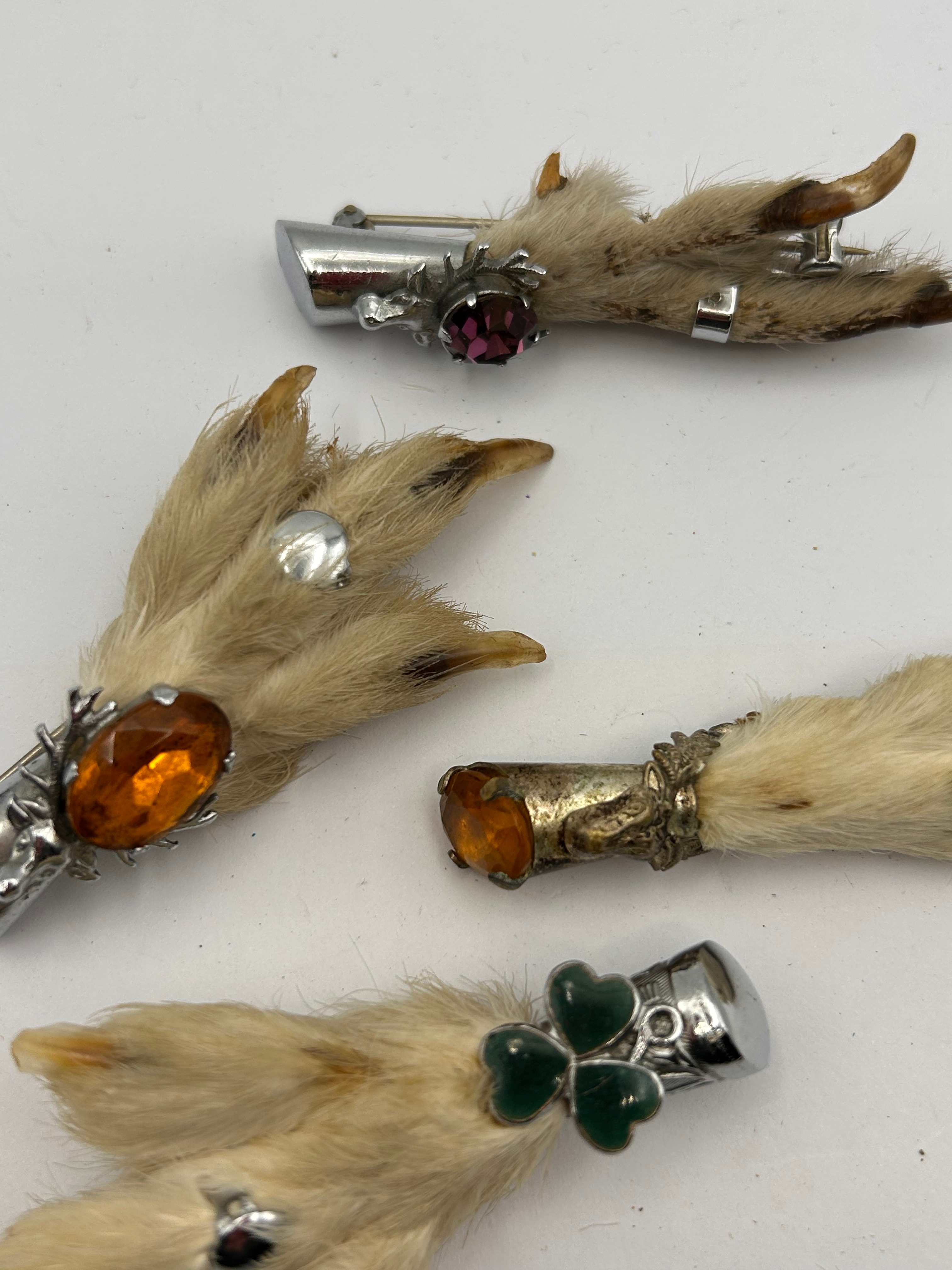 A collection of Scottish grouse foot brooches. Each brooch is fashioned from a small, furry animal paw, retaining its natural fur and claws. The items feature various metal findings, predominantly silver-tone, with one piece showcasing an antiqued gold-tone finish. Embellishments include faceted glass or synthetic gemstones in amber, purple, and clear, along with green enamel in a three-leaf clover design on one silver-tone cap. No discernible manufacturer’s marks, hallmarks, or text are visible on any of the components.