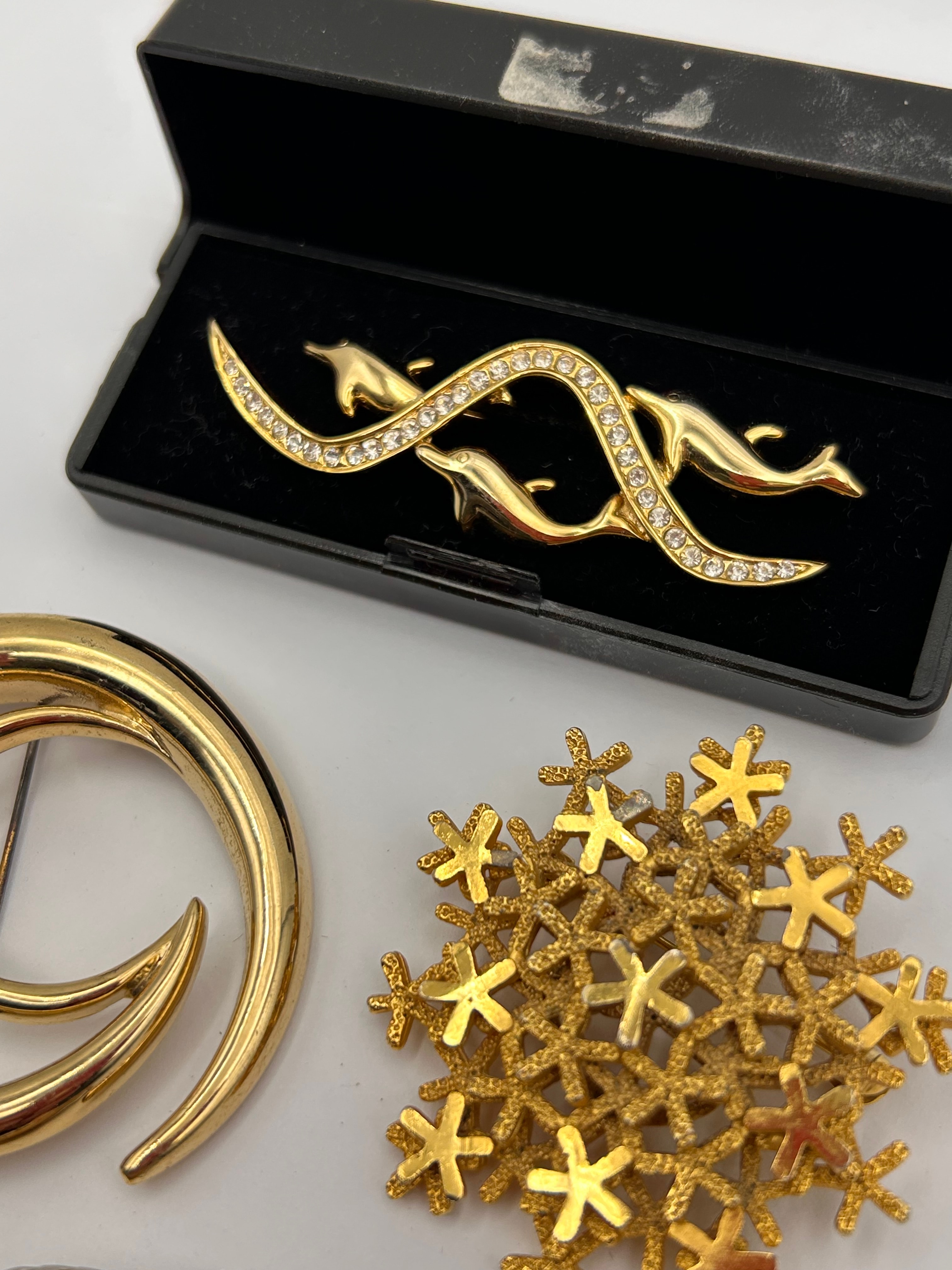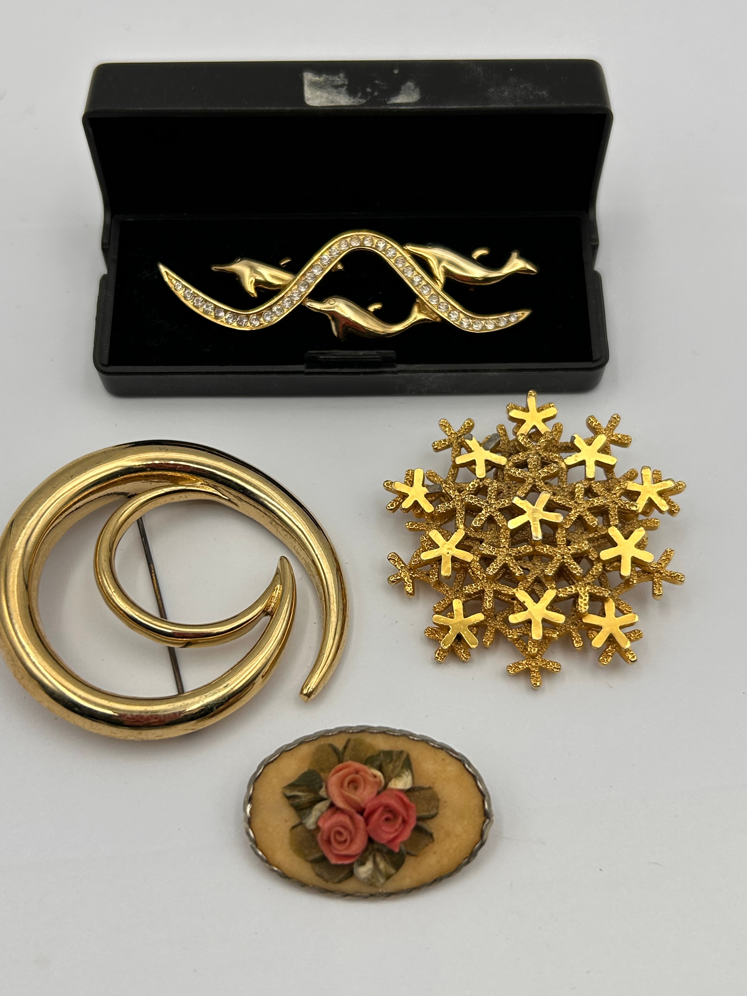 A collection of four brooches, all crafted predominantly from yellow-toned base metal. The collection includes a stylized double-dolphin motif brooch, featuring clear paste embellishments along intertwined wave elements, presented in a black velvet-lined hinged box. Also present is a large, polished abstract spiral brooch. A textured, cluster-form brooch composed of numerous small four-pointed star-like elements, resembling a snowflake motif. The fourth item is an oval-shaped brooch with a beaded-edge bezel, showcasing three raised, hand-colored pink and red floral (rose) details with green leaves set against a cream-colored background. No visible text, hallmarks, or maker’s marks are apparent on any of the pieces.