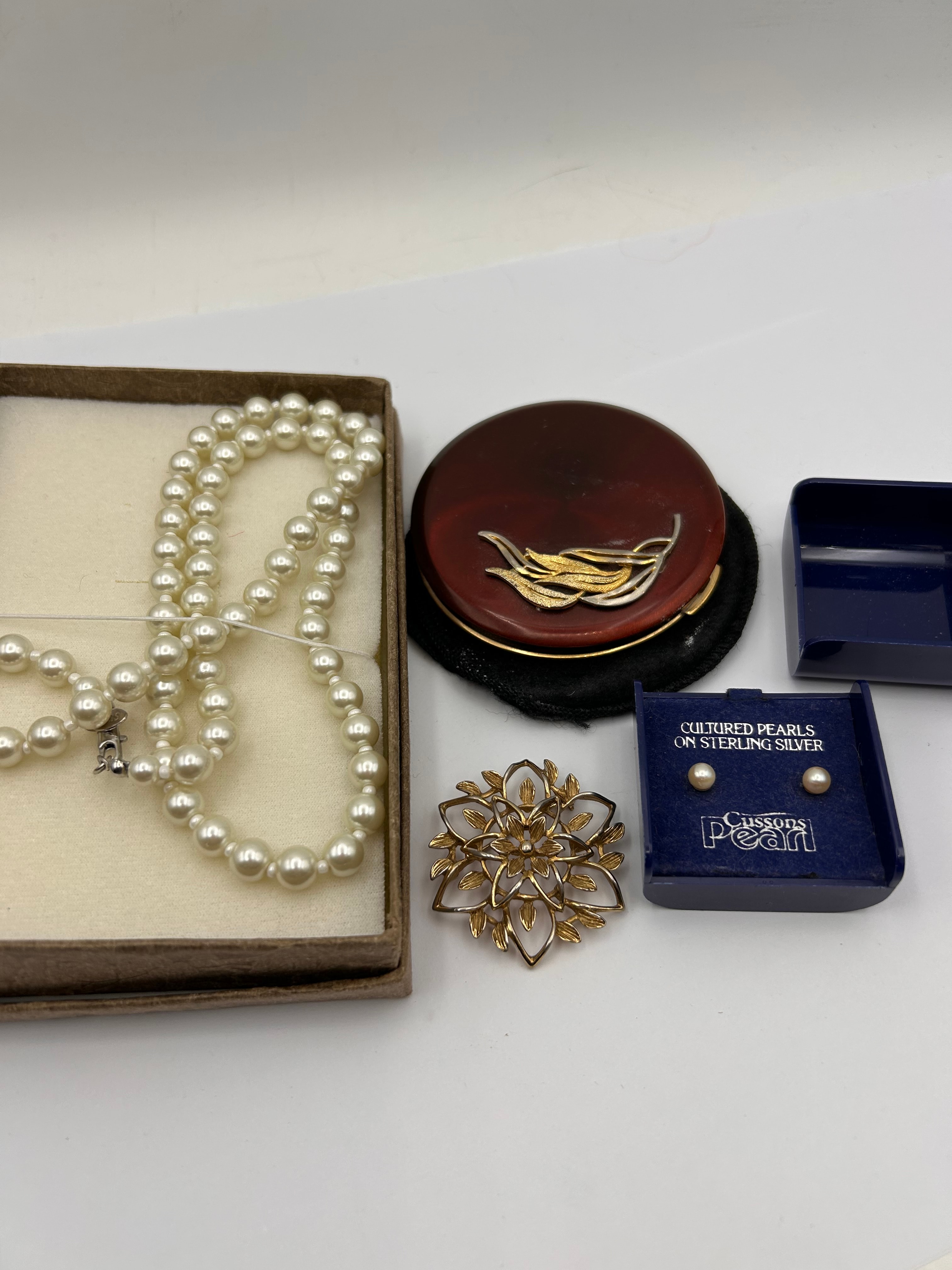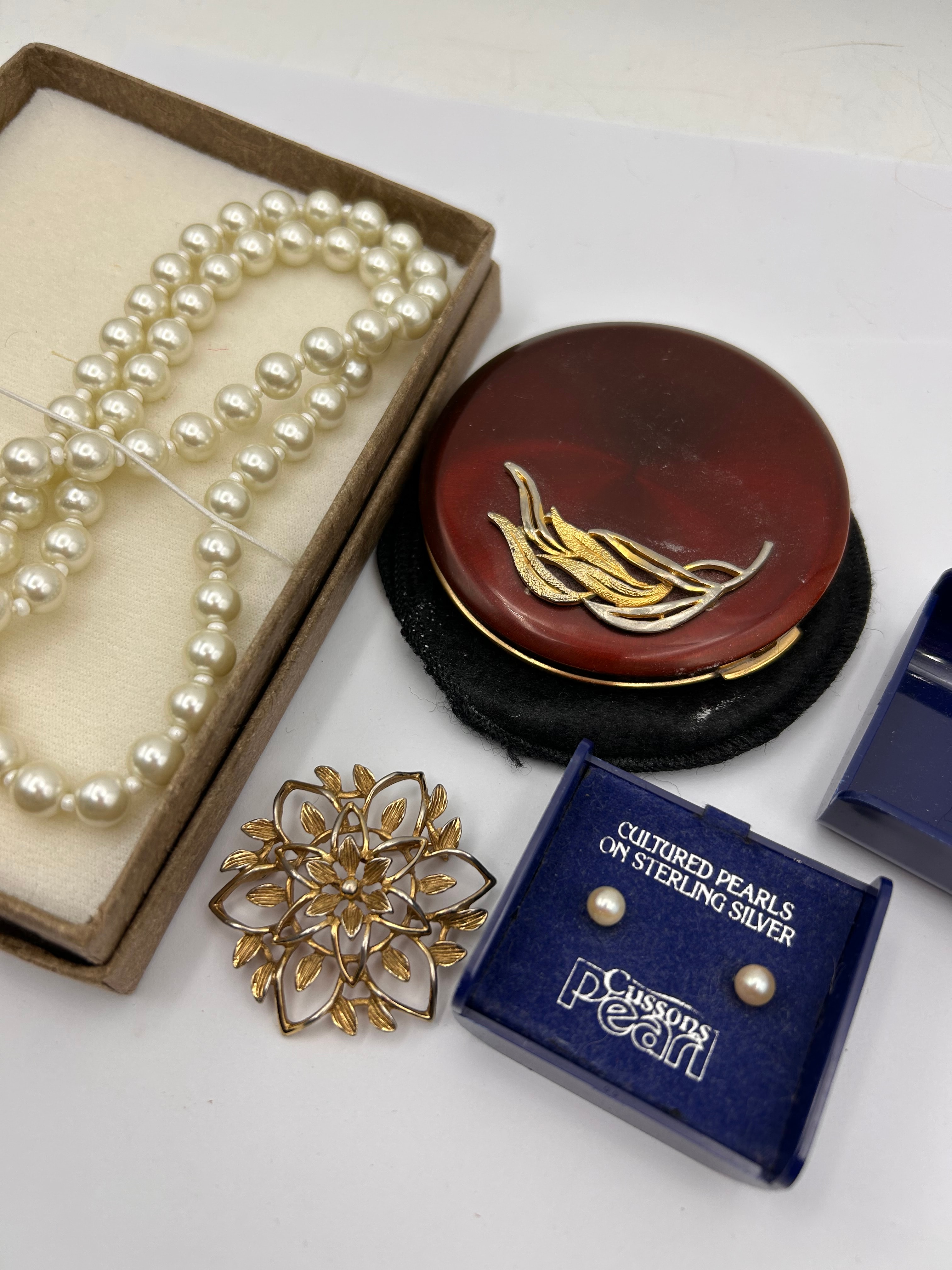 This collection comprises a vintage Mascot London compact, a long strand of pearls, a gold-tone brooch, and a pair of pearl stud earrings. The compact is round and features a dark red body, likely enamel, with a two-tone gold and silver-colored leaf motif on the lid. The pearl necklace consists of cream-colored pearls secured with a silver-tone clasp. The brooch is crafted from gold-tone metal, showcasing an intricate openwork floral design. The stud earrings, each set with a cream-colored pearl, are presented in their original blue box labeled “CULTURED PEARLS ON STERLING SILVER” and “Poussons Pearl.” A small, empty blue plastic tray is also included.
