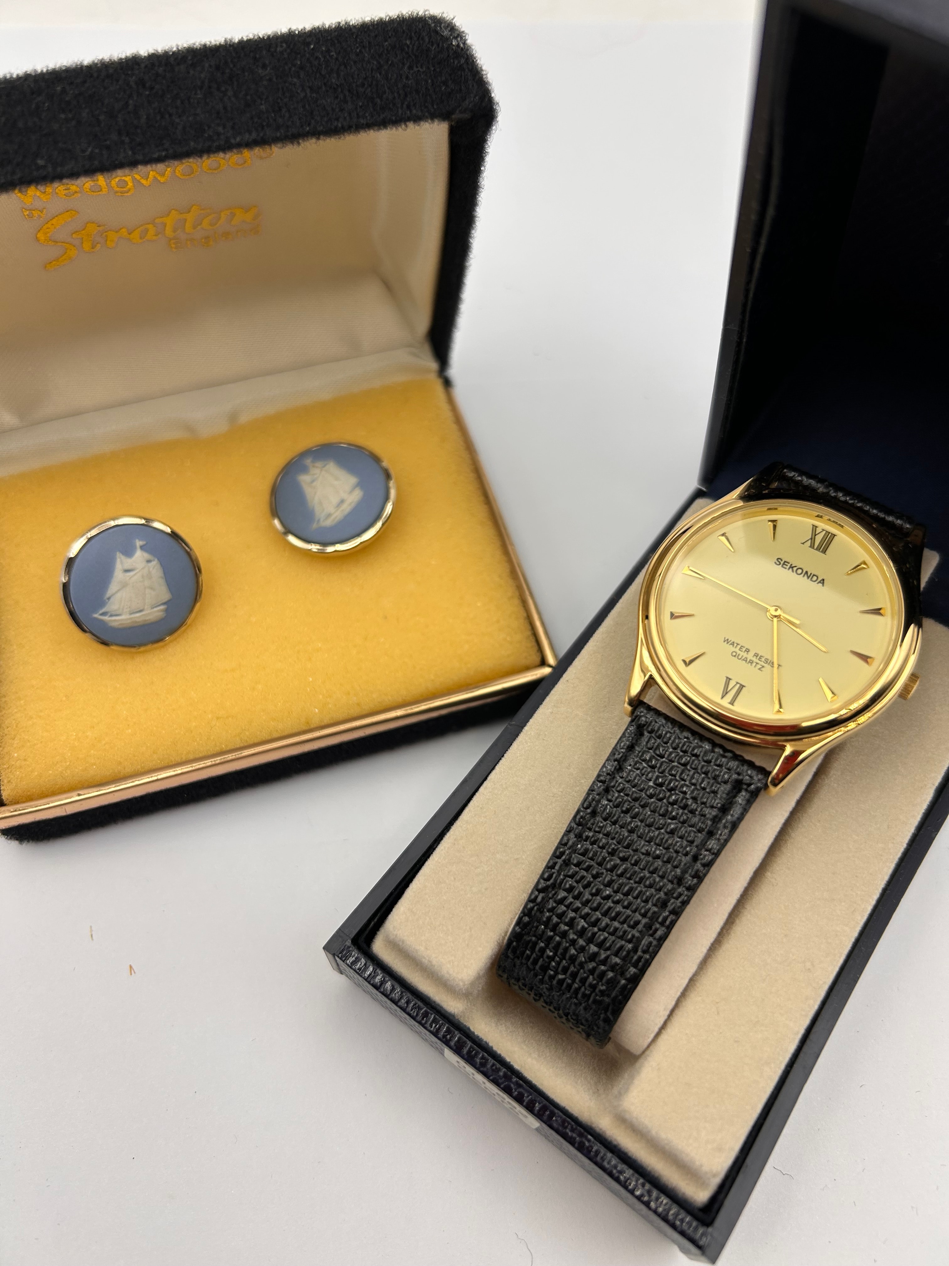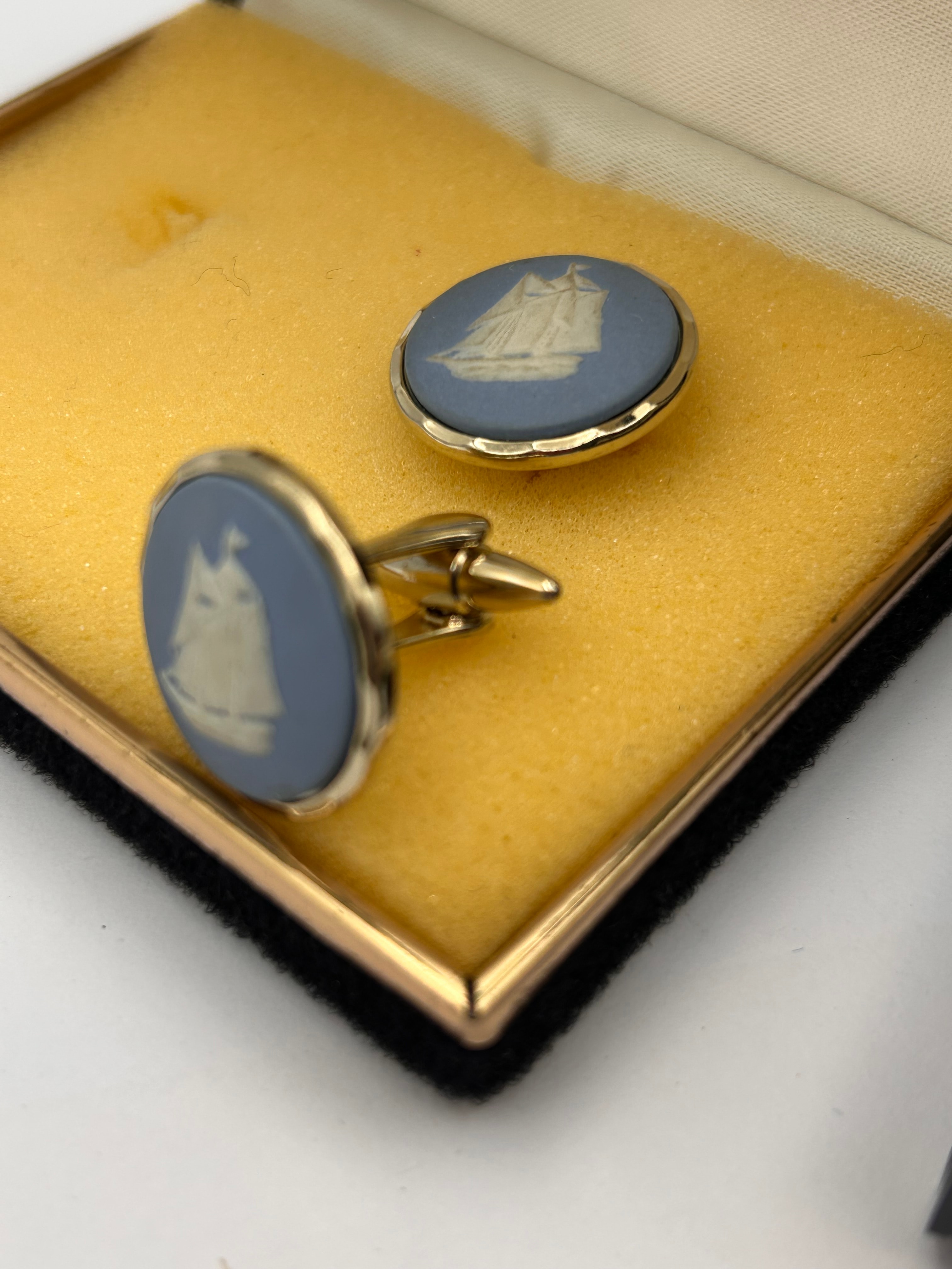 Accompanied by a pair of cufflinks, featuring neoclassical-inspired pale blue, jasperware-style ceramic inserts depicting white bas-relief sailing ships, set within gold-tone metal bezels. The cufflinks are presented in their original lidded box, marked ‘Wedgwood’ and ‘Stratton England’.