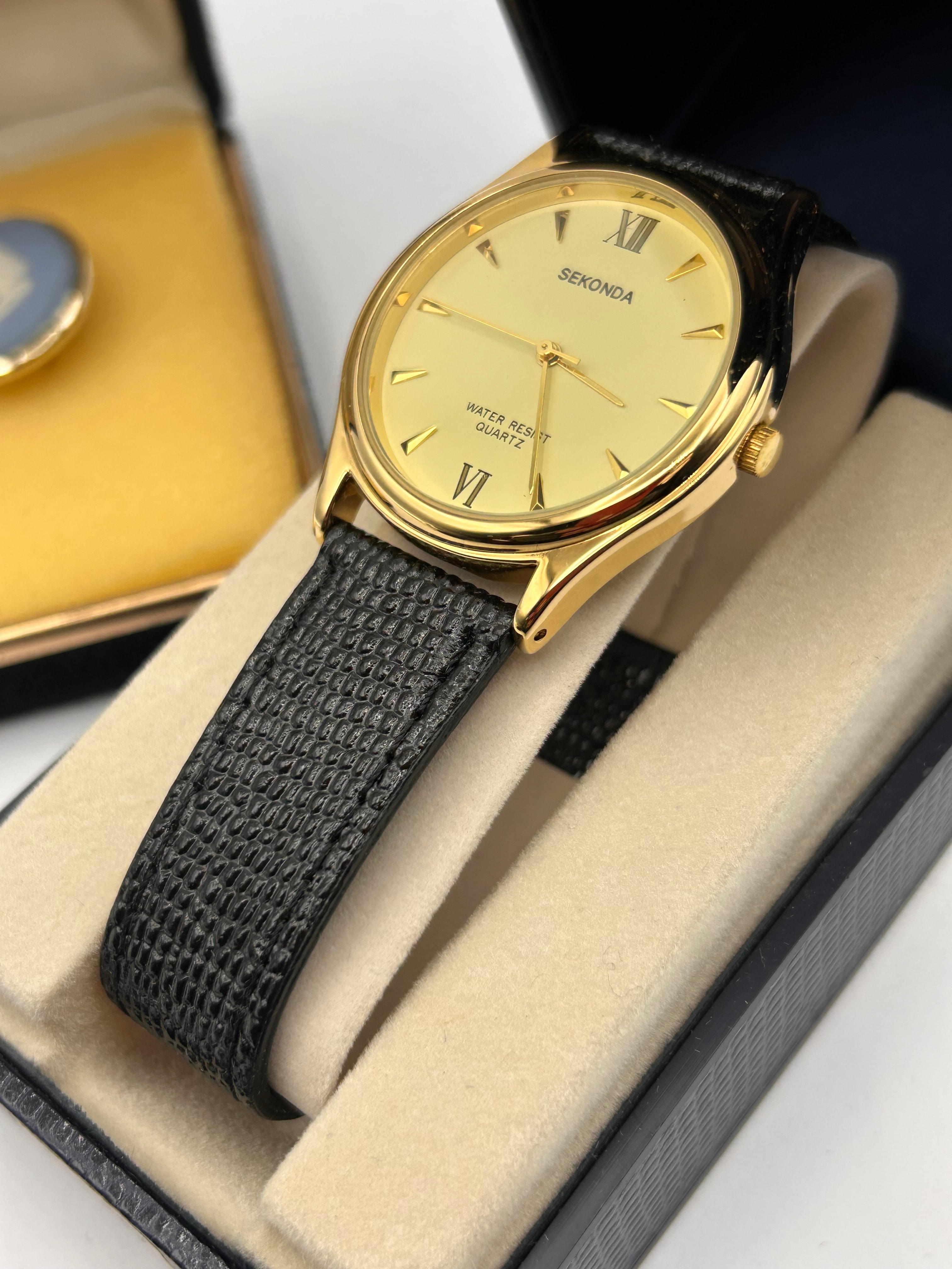 A Sekonda Quartz Men’s Watch, featuring a gold-tone round case and a matching gold-tone dial. The dial displays Roman numerals at the XII and VI positions, with stick markers for the remaining hours, and is marked ‘SEKONDA’ at 12 o’clock and ‘WATER RESISTANT’ and ‘QUARTZ’ at 6 o’clock. It is fitted with a black textured strap and presented in its original box.