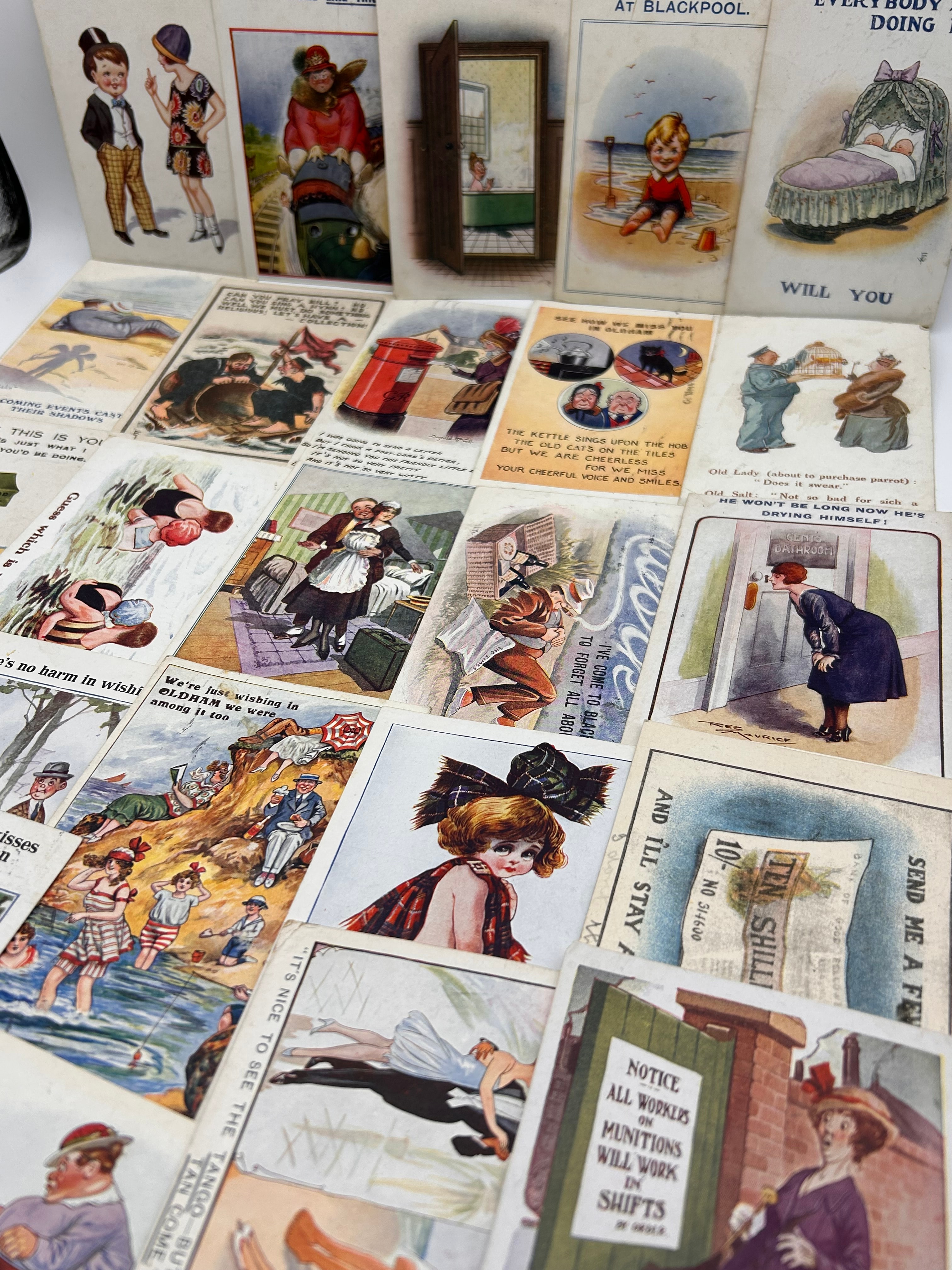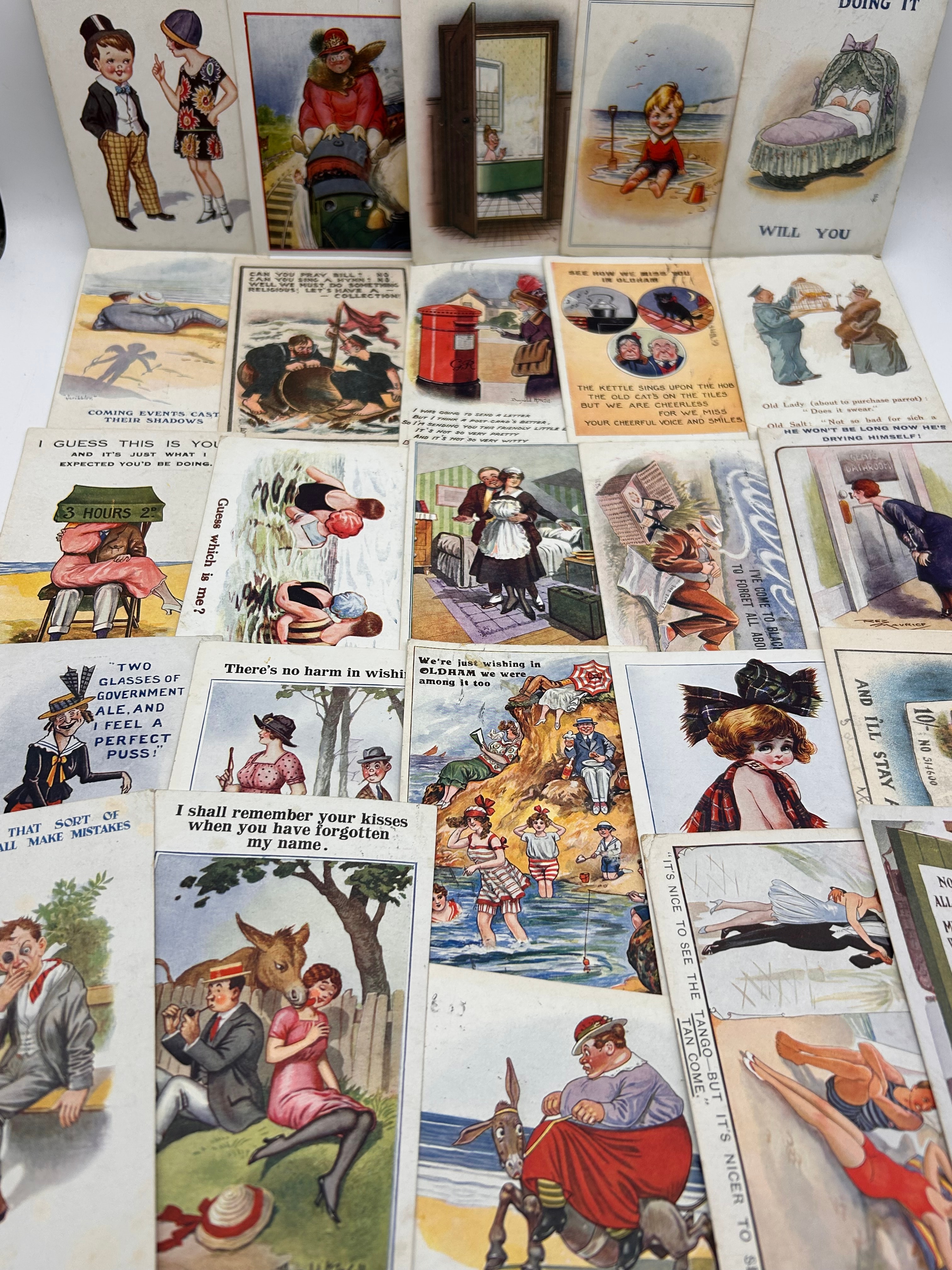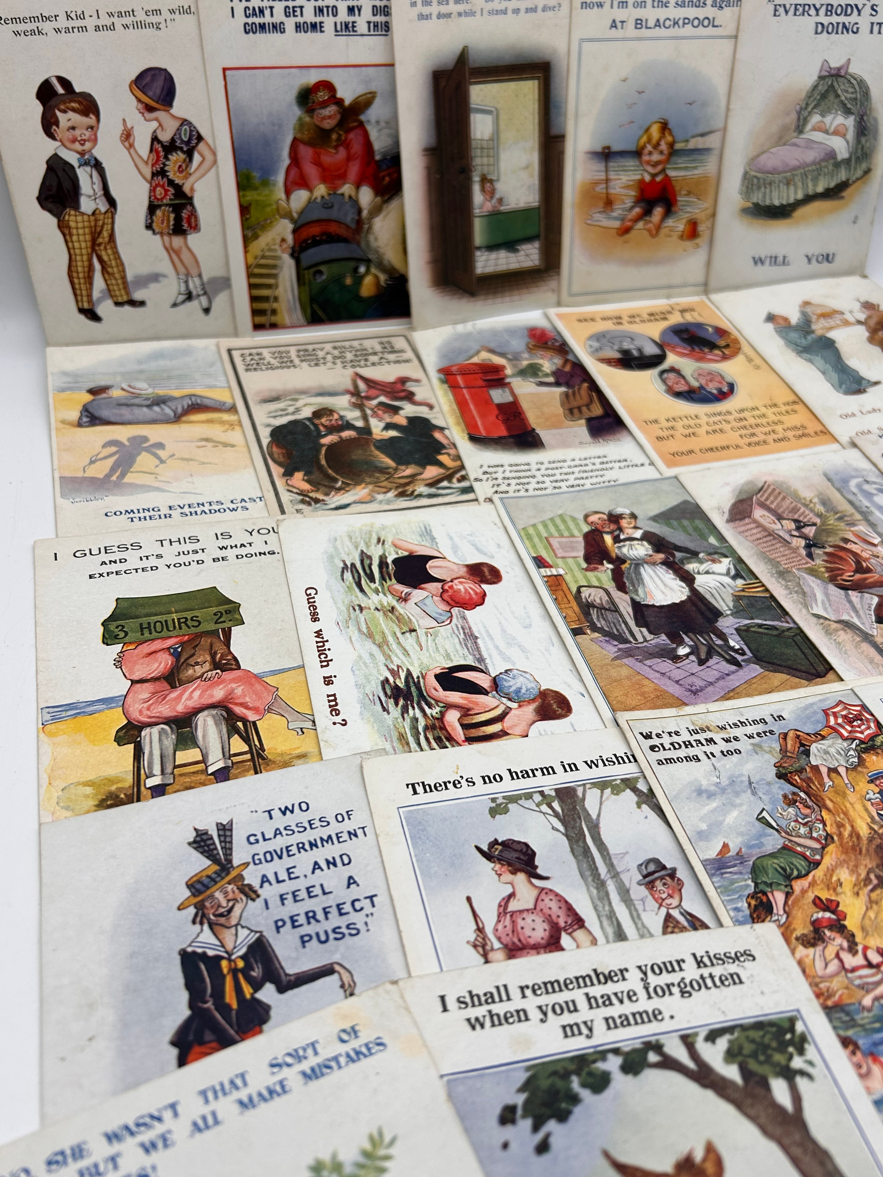 A collection of approximately 25-30 vintage humorous postcards, many in the style of Donald McGill. These postcards primarily feature humorous, romantic, and sometimes suggestive illustrations, characteristic of late Victorian to early 20th-century cartooning. The depictions include caricatures of people in various social settings such as seaside resorts, domestic scenes, and public life. Themes and fashion suggest the period from approximately 1900 to 1920s, with specific references like “munitions work” and locations such as “Blackpool.” English captions include phrases like “I GUESS THIS IS YOU,” “WILL YOU,” “I shall remember your kisses when you have forgotten my name,” and “NOTICE ALL WORKERS ON MUNITIONS WILL WORK ON SHIFTS.” Printed on cardstock.