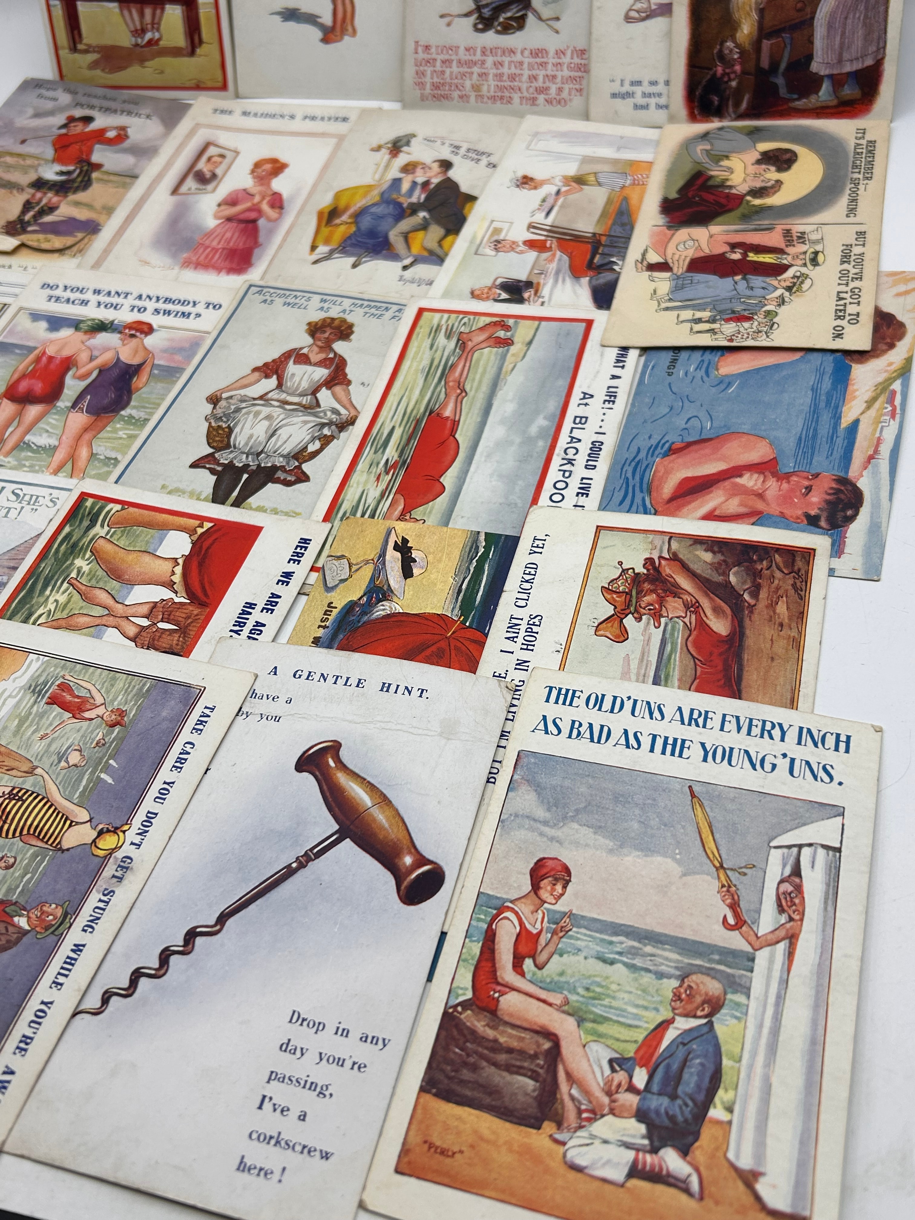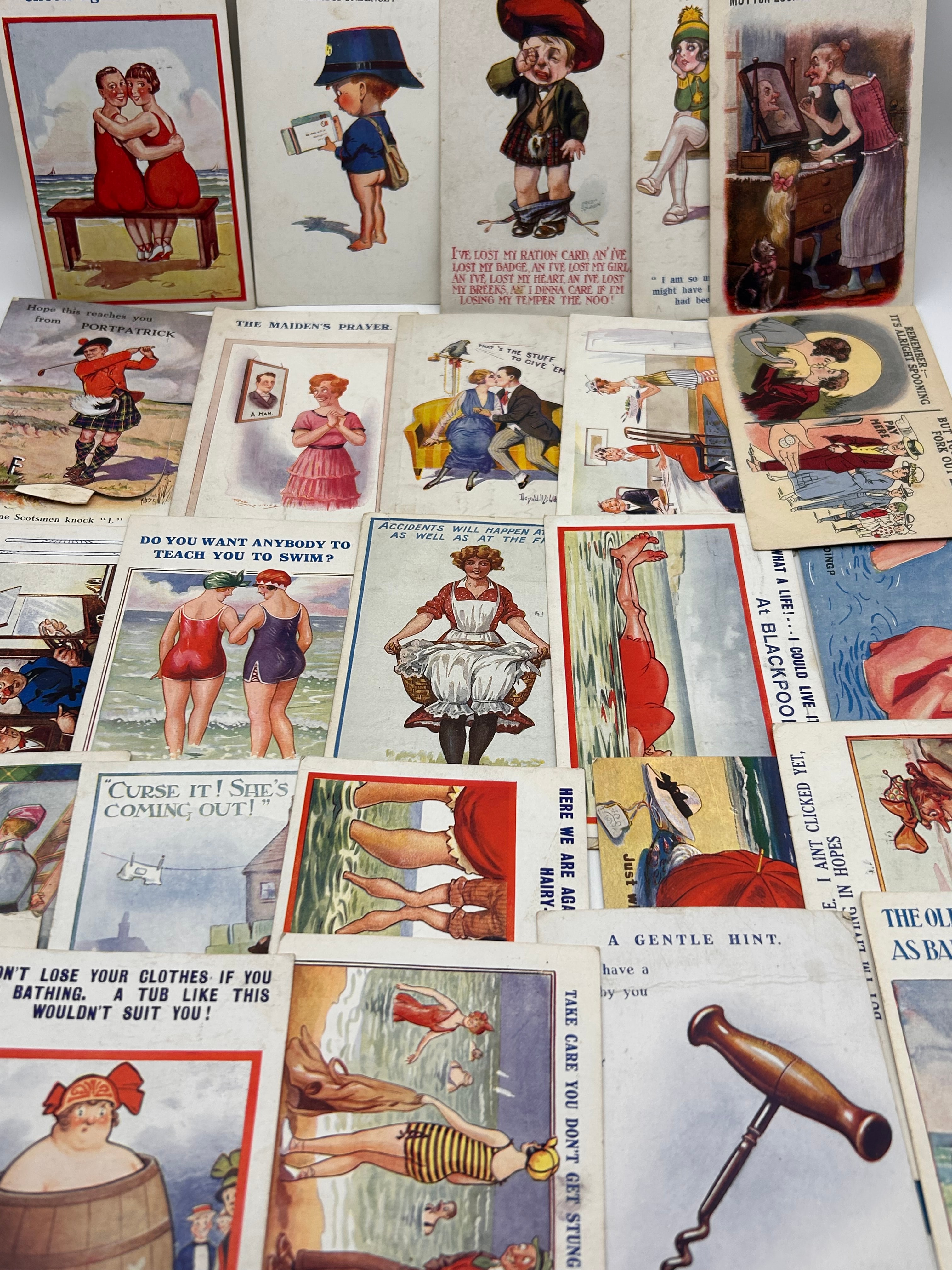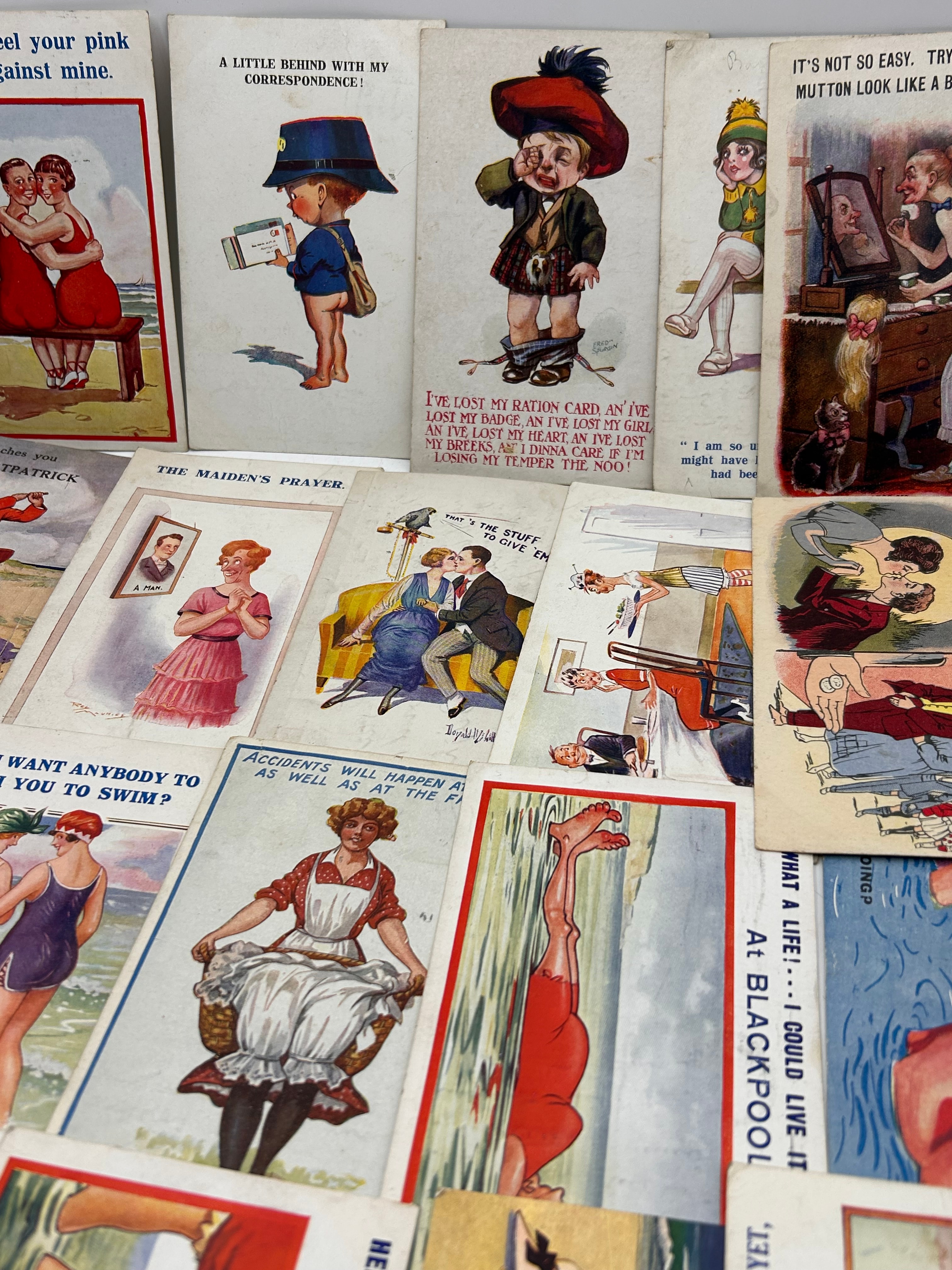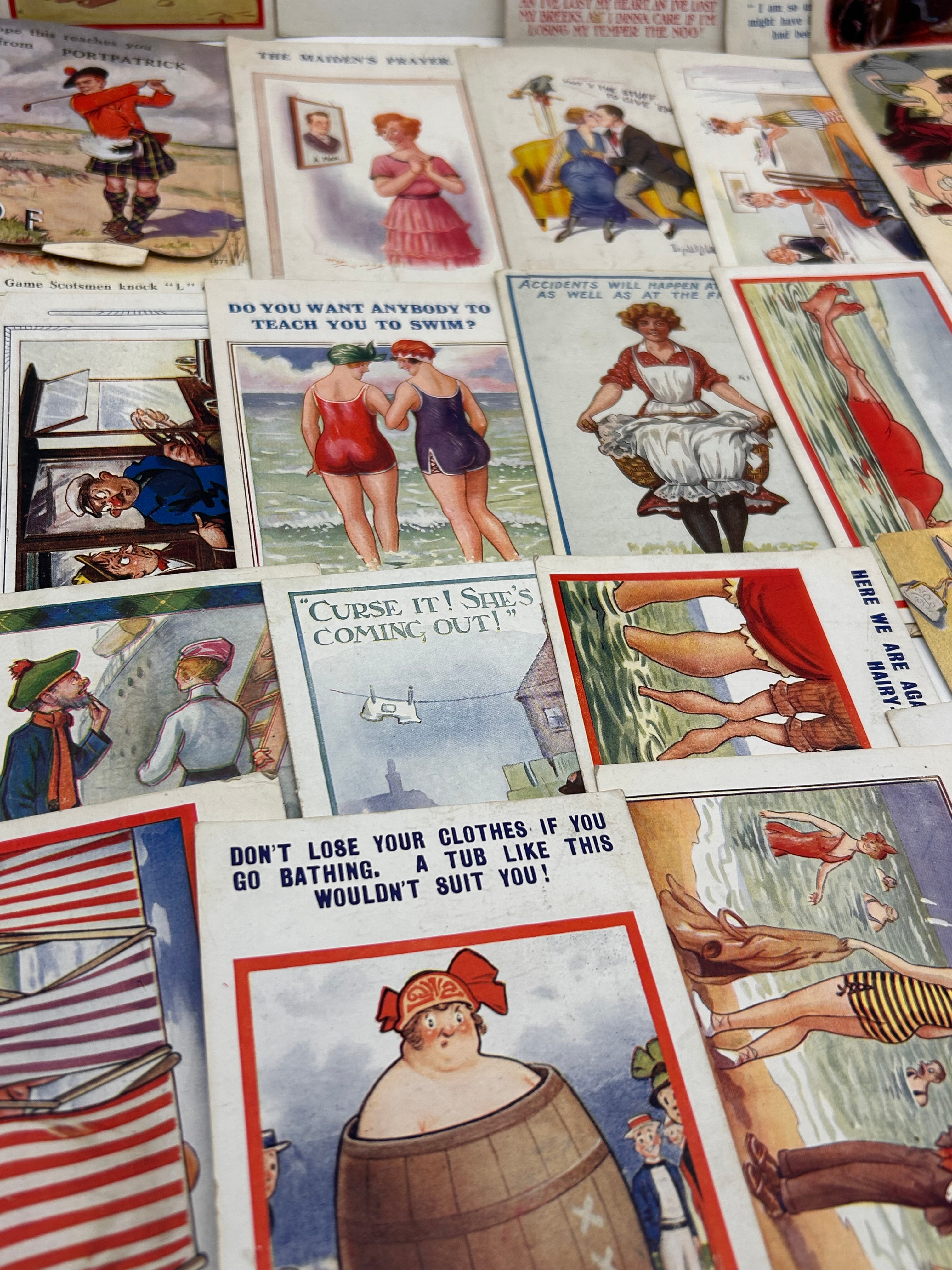 A collection of numerous vintage paper postcards, predominantly featuring humorous, often suggestive, early to mid-20th century cartoon illustrations. The style is consistent with British seaside or novelty postcards from the inter-war period through the mid-20th century. Each card features prominent English text serving as captions or punchlines to the images. Illustrations depict characters in period attire, such as bathing suits, kilts, and domestic wear, often with playful or risqué themes. Examples of captions include “A LITTLE BEHIND WITH MY CORRESPONDENCE!”, “I’VE LOST MY RATION CARD…”, “DO YOU WANT ANYBODY TO TEACH YOU TO SWIM?”, and “WHAT A LIFE!…I COULD LIVE AT BLACKPOOL!”. Some cards reference specific locations such as Portpatrick and Blackpool, aligning with popular comic and seaside humor of the era.