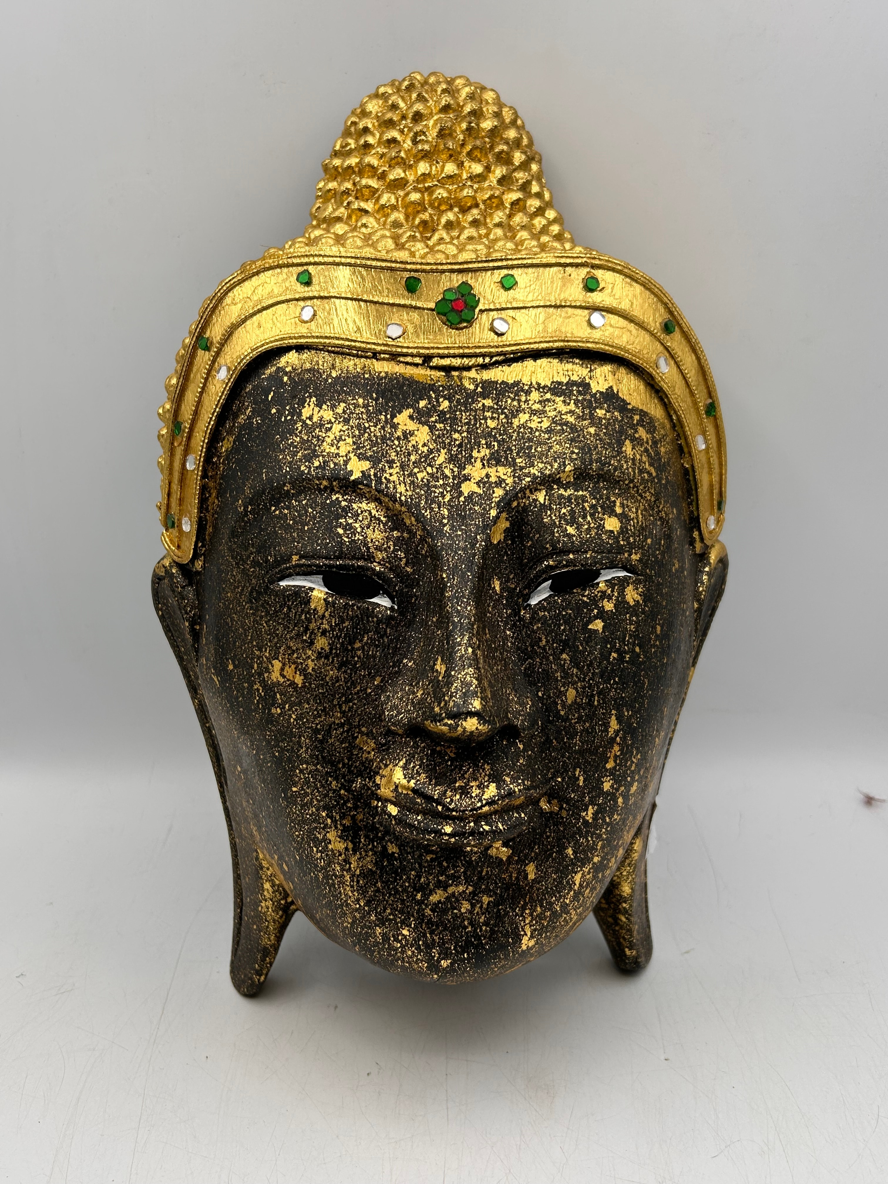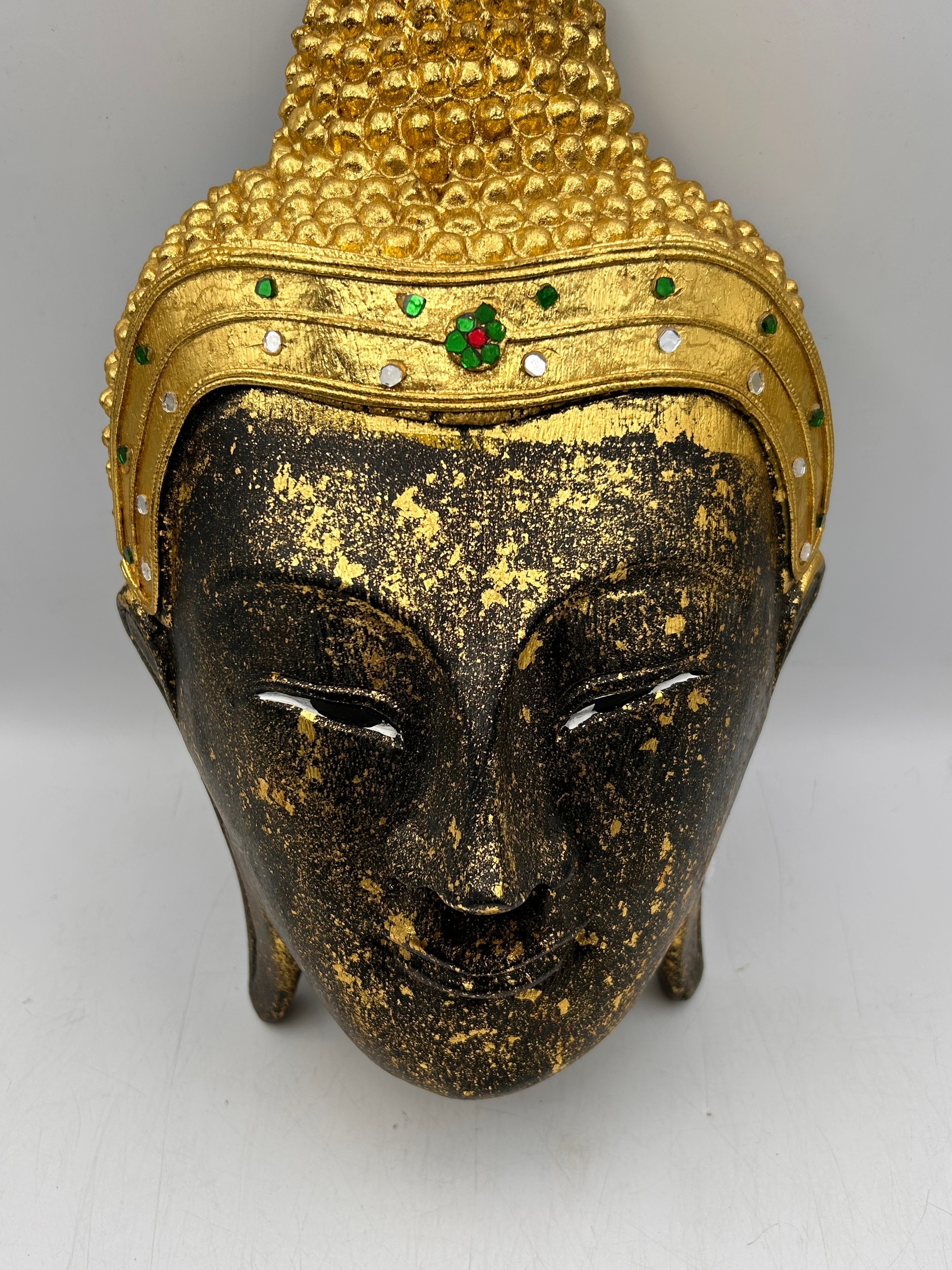 A Thai carved wooden Buddha mask, depicting the head of a Buddha figure, executed in a style evocative of Southeast Asian art. The piece features a dark, textured base material, extensively adorned with applied gold leaf or gilding, creating a distressed or patinated effect. The ushnisha and a distinct crown-like headband are also gilded and further embellished with small, colorful cabochon-style “gems” in green, red, and white/clear. The figure exhibits closed, serene eyes and a gentle smile. No visible text or markings are present.
