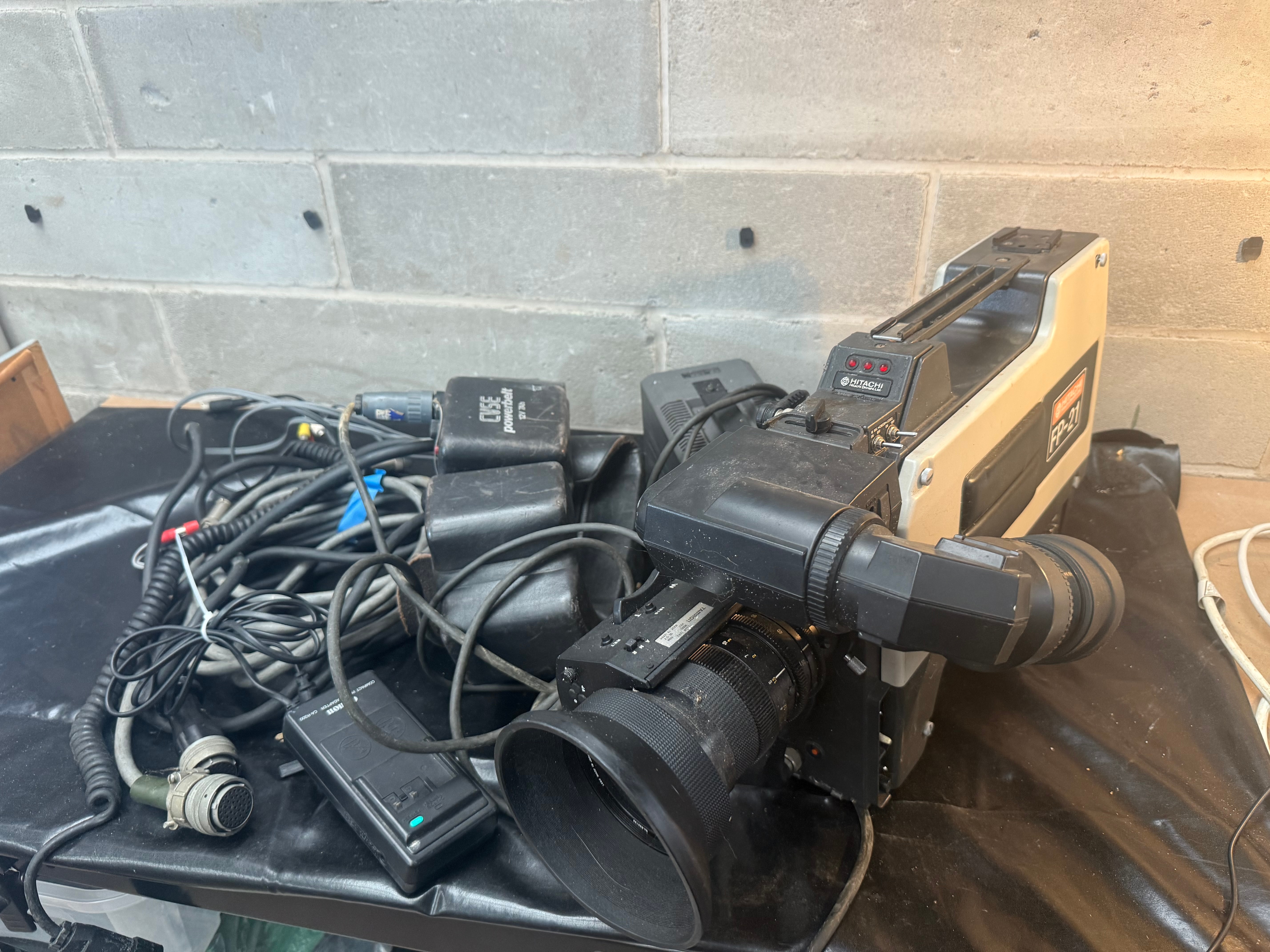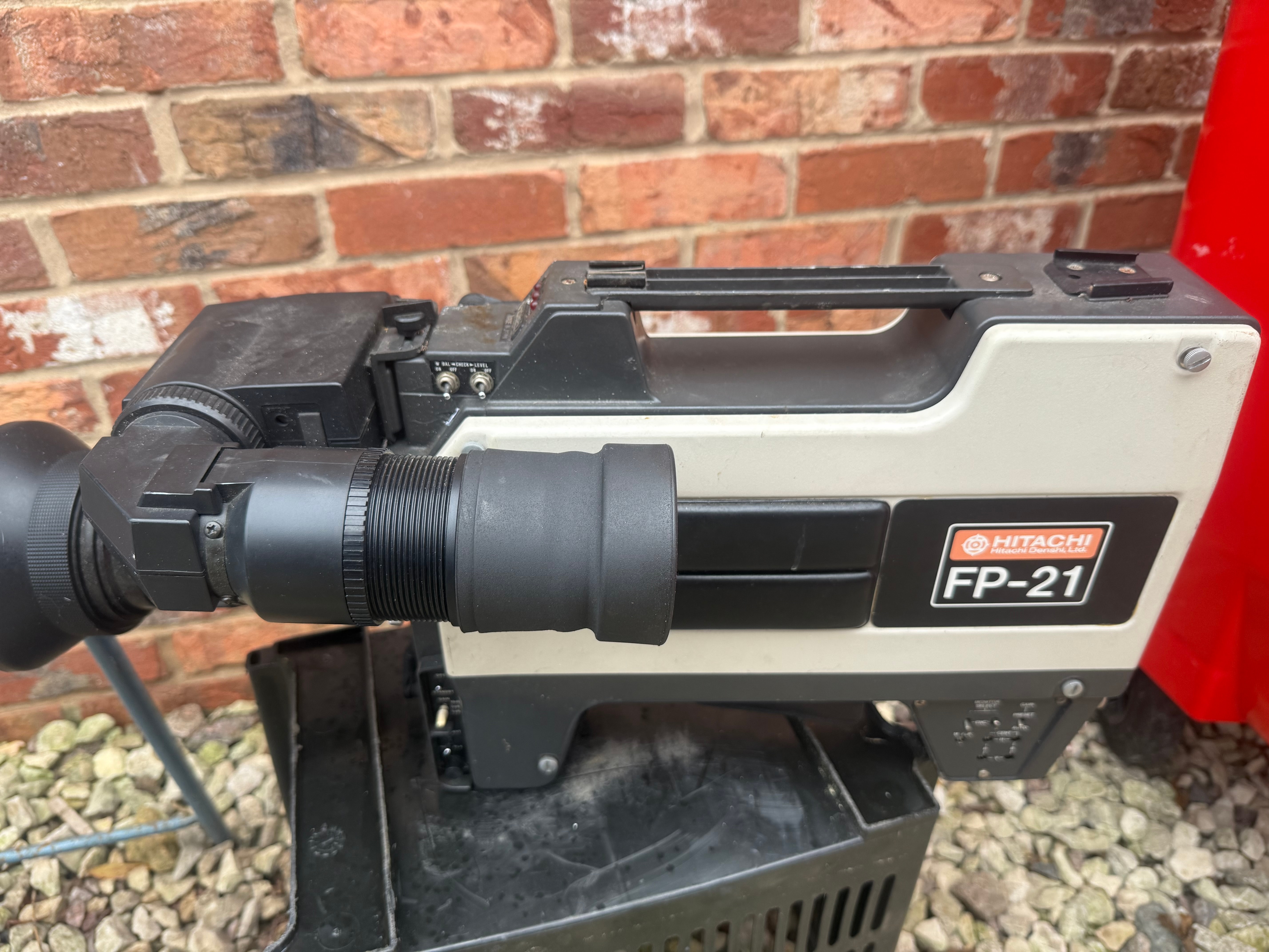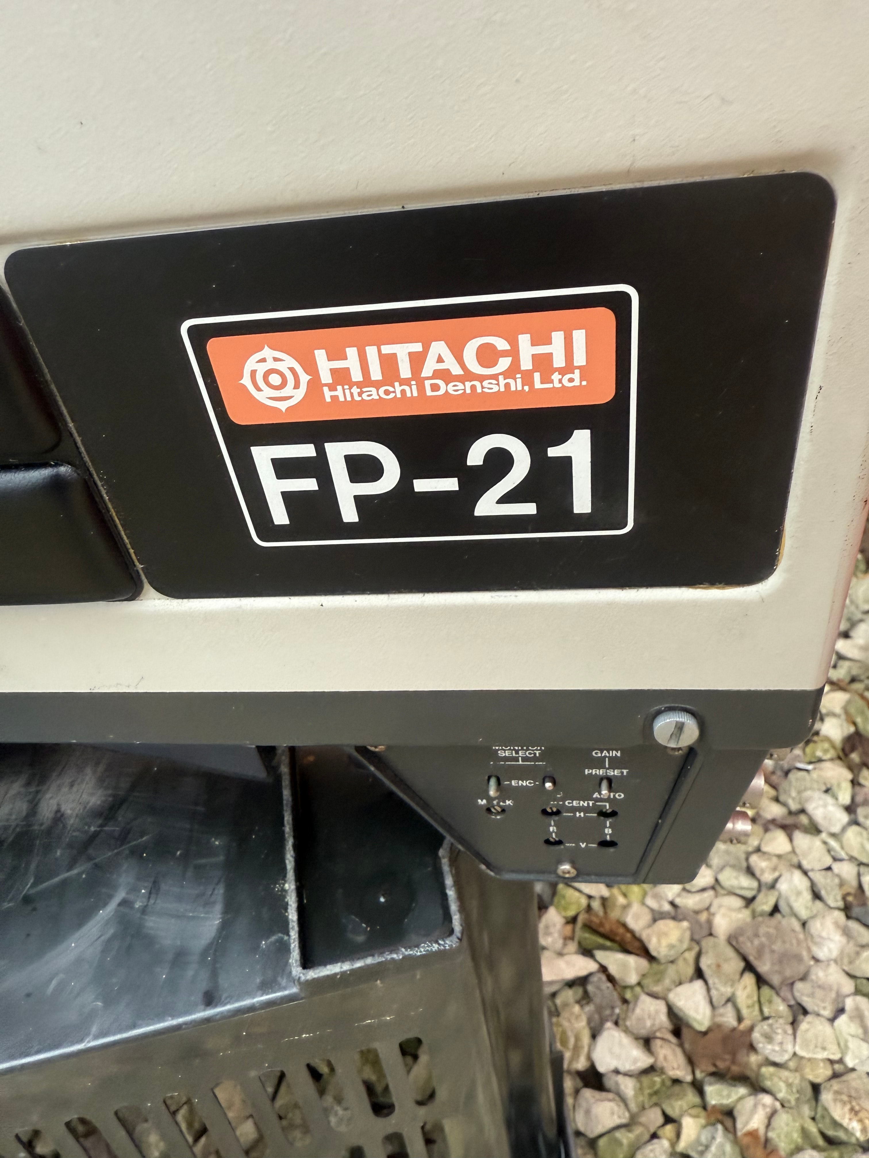 A vintage professional video camera system, featuring a Hitachi FP-21 broadcast camera, identifiable by its grey and black plastic and metal construction, prominent lens, and shoulder-mount design, typical of late 20th-century broadcast equipment. The camera unit displays “HITACHI Hitachi Denshi, Ltd. FP-21” markings, with accompanying Japanese characters (日立電子株式会社, meaning Hitachi Electronics Co., Ltd.), and various English control labels such as “MONITOR SELECT” and “GAIN”. Accompanying accessories include a Canon Compact Power Adapter CA-R300, a CVSE 12V 7Ah powerbelt, and a quantity of assorted cables and additional power units.