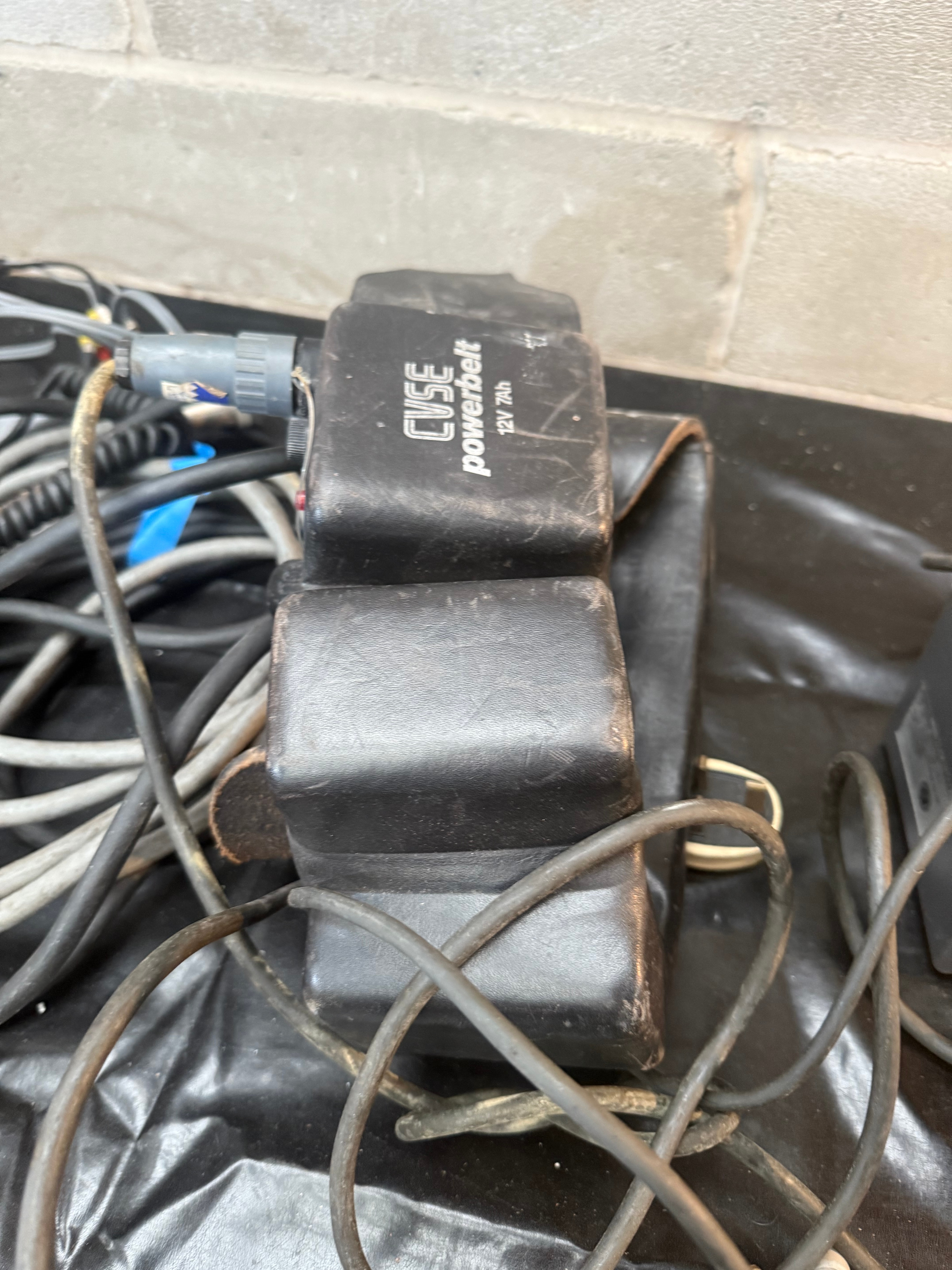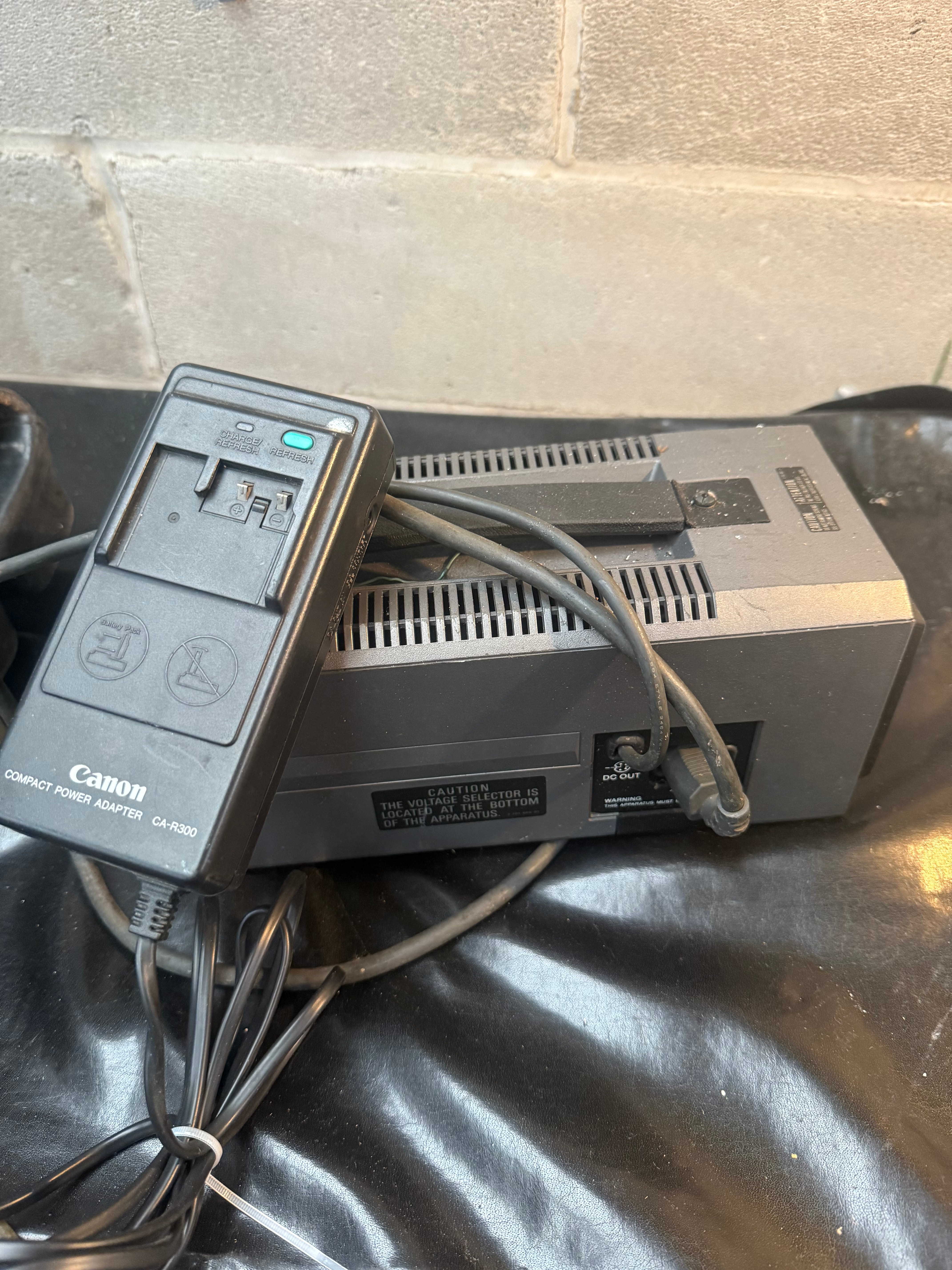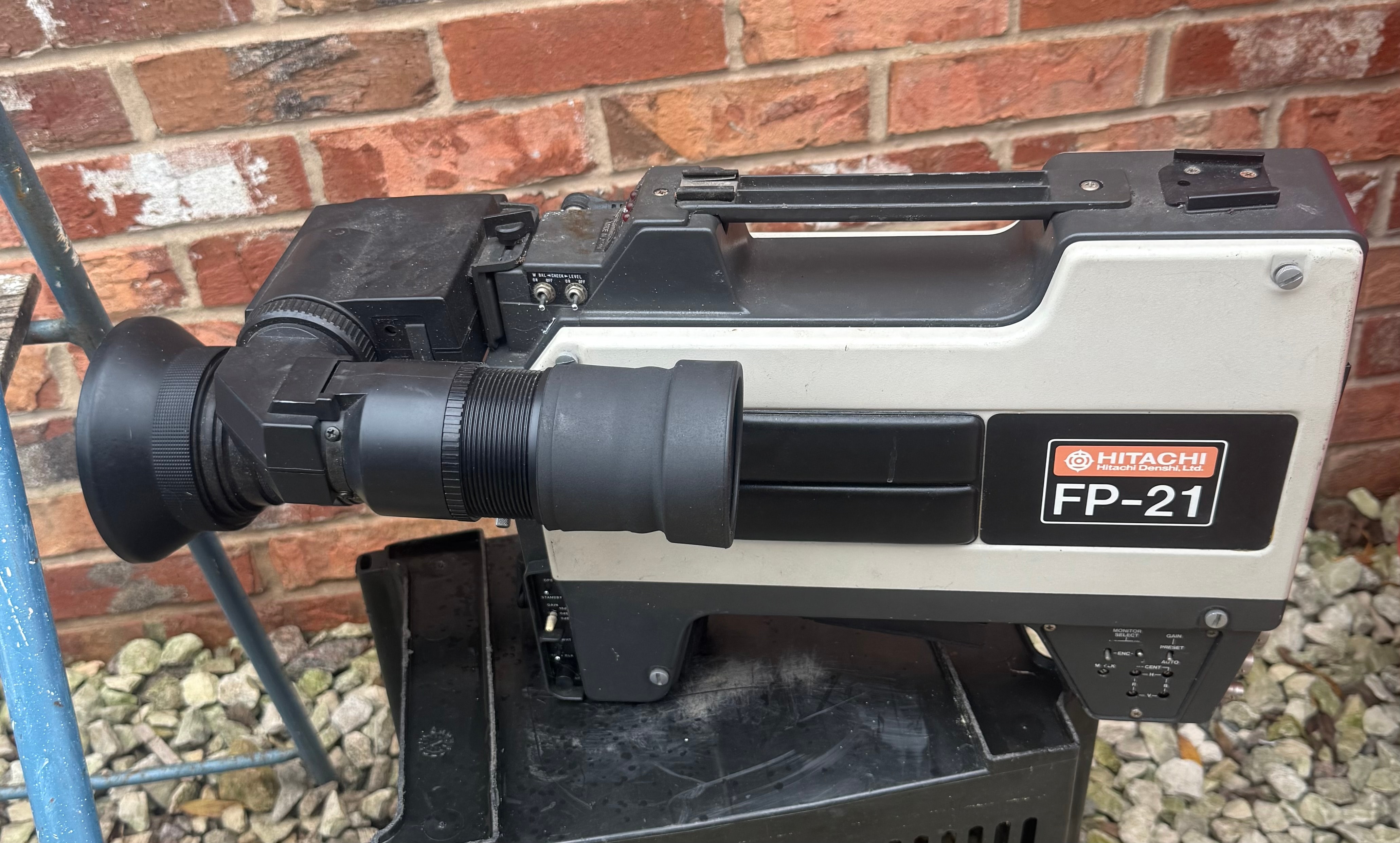 A vintage professional video camera system, featuring a Hitachi FP-21 broadcast camera, identifiable by its grey and black plastic and metal construction, prominent lens, and shoulder-mount design, typical of late 20th-century broadcast equipment. The camera unit displays “HITACHI Hitachi Denshi, Ltd. FP-21” markings, with accompanying Japanese characters (日立電子株式会社, meaning Hitachi Electronics Co., Ltd.), and various English control labels such as “MONITOR SELECT” and “GAIN”. Accompanying accessories include a Canon Compact Power Adapter CA-R300, a CVSE 12V 7Ah powerbelt, and a quantity of assorted cables and additional power units.