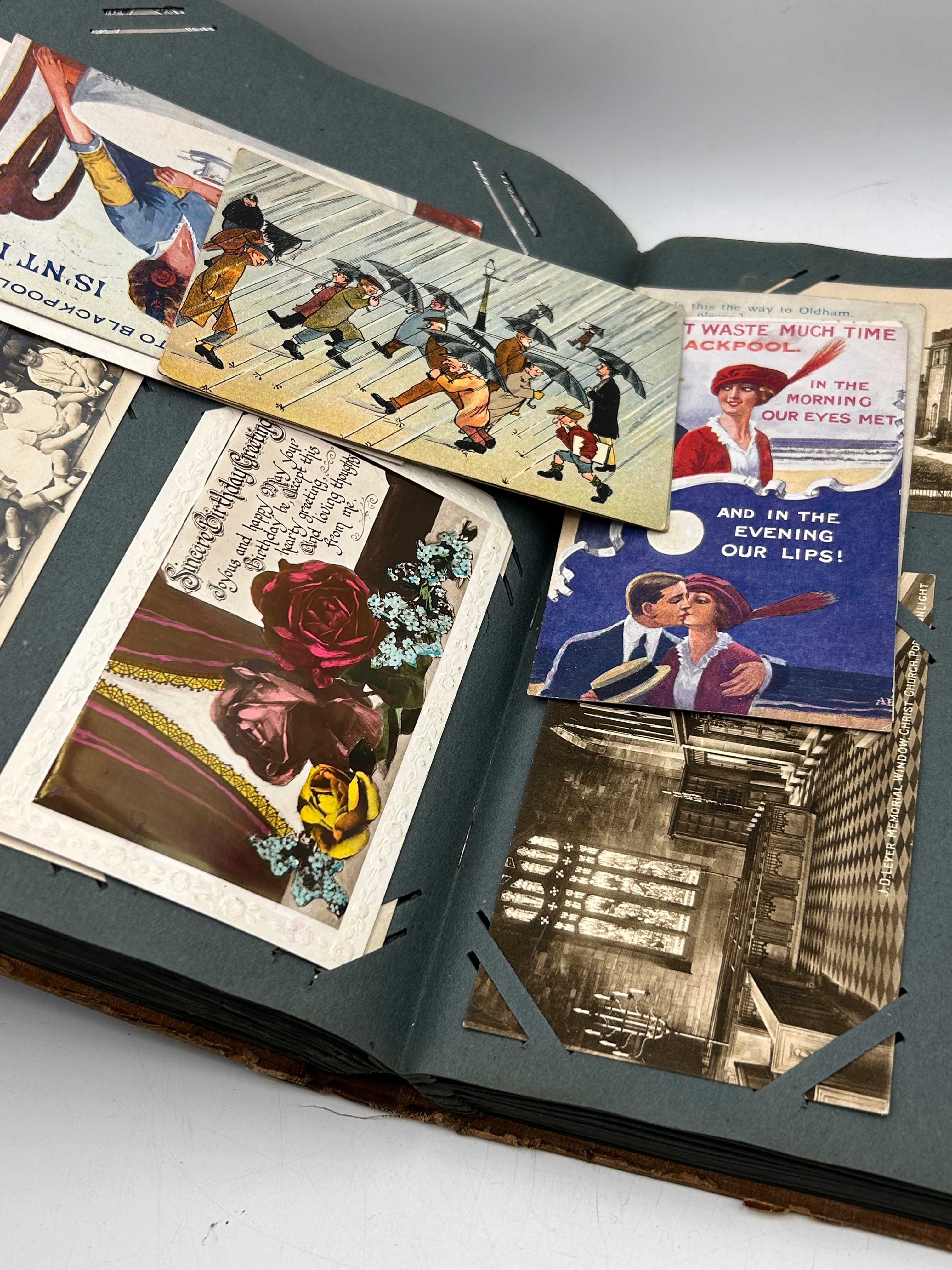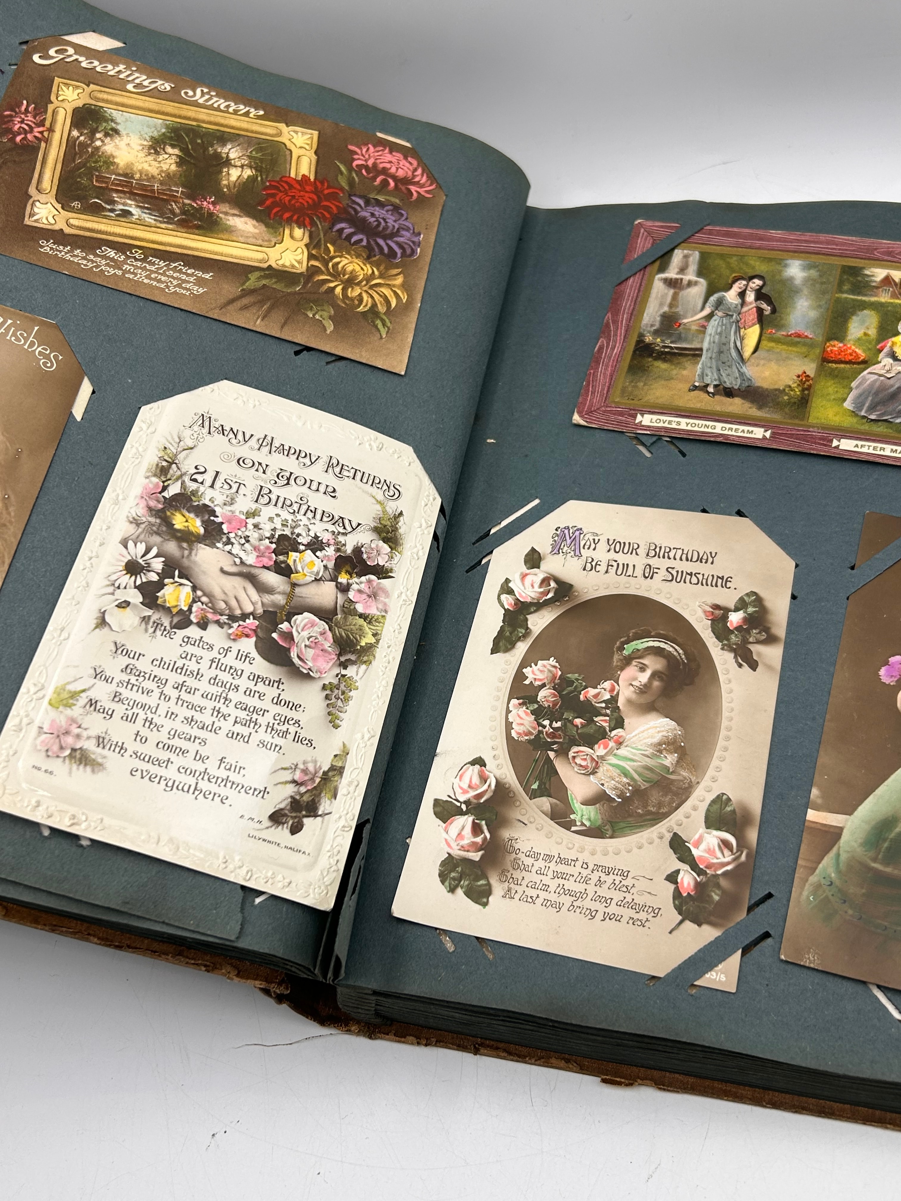 A vintage postcard album, likely dating to the early 20th century, featuring a reddish-brown hardboard or heavy card cover. The cover is adorned with an Art Nouveau or Arts & Crafts-influenced design, prominently displaying the text ‘POST CARDS’ within a stylized heart motif, accompanied by geometric lines and hanging decorative elements. Inside, the album contains numerous postcards secured in thick, dark gray/blue pages via corner slits. The collection of postcards includes a mix of sepia-toned photographic portraits, often depicting women in period attire, various landscapes such as ‘A Reminder from Southport,’ and colorful printed greetings with phrases including ‘Many Happy Returns of the Day,’ ‘With Birthday Wishes,’ and ‘May Your Birthday Be Full of Sunshine.’