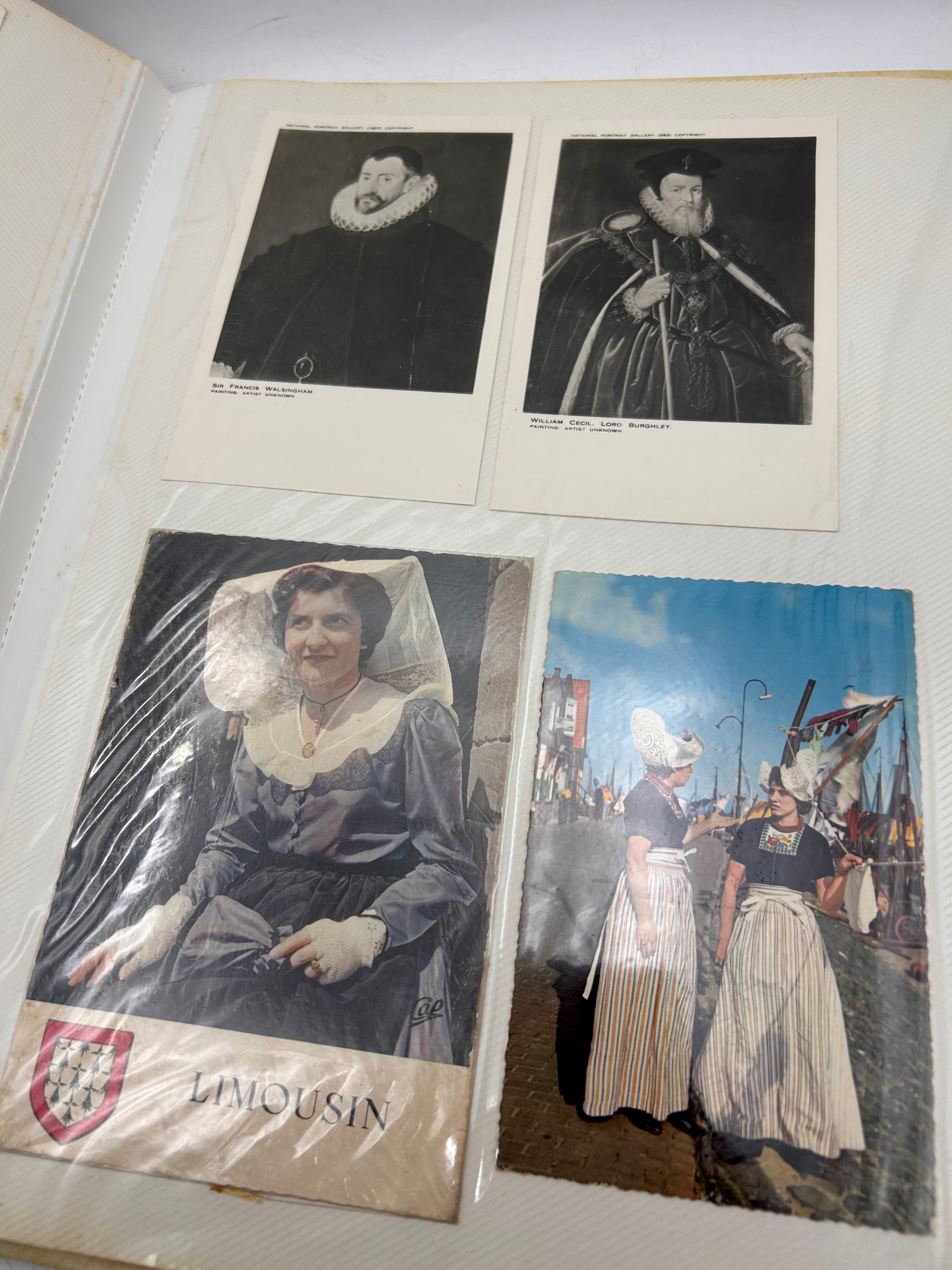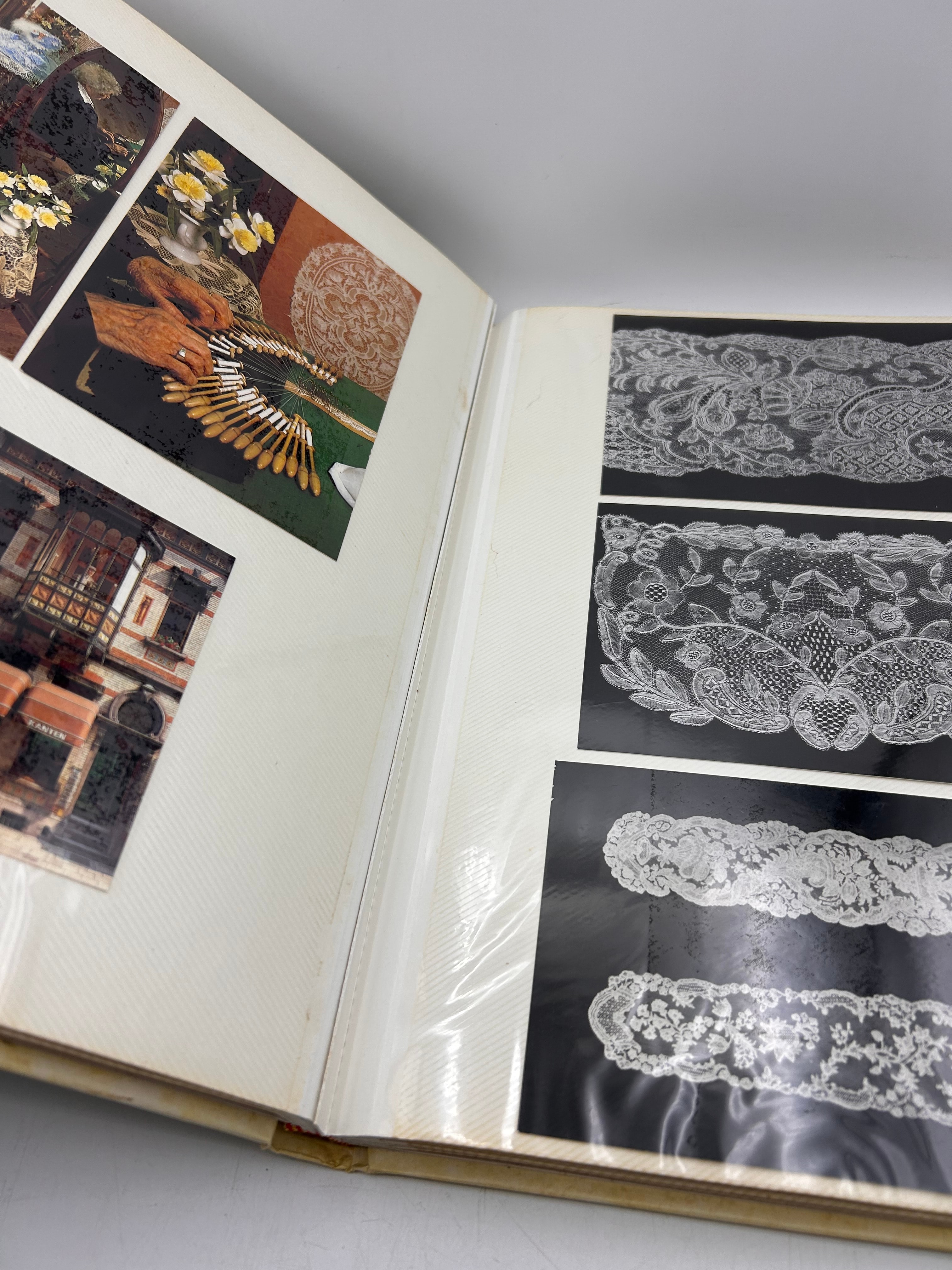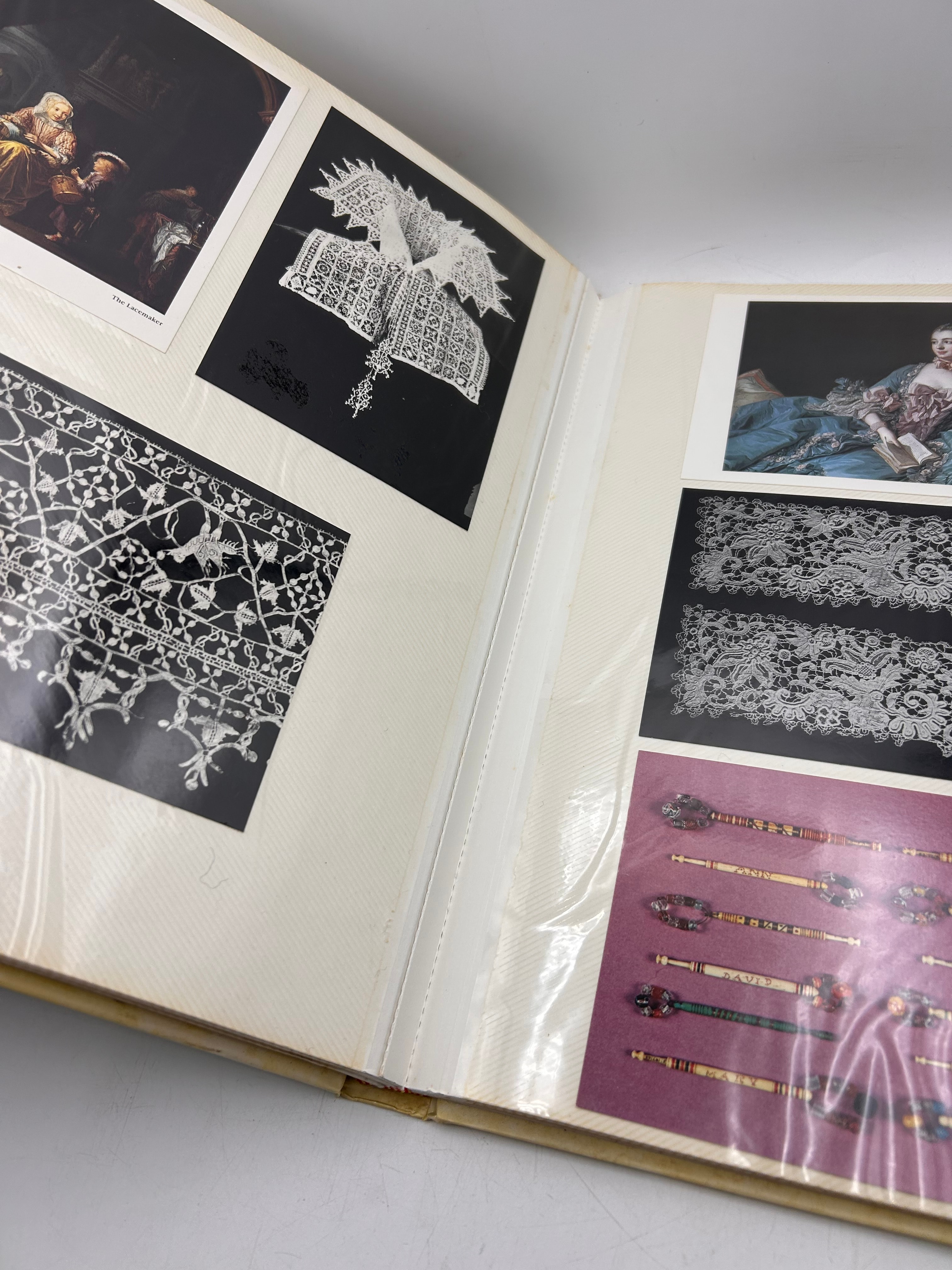 This bound album contains a diverse collection of postcards, reproductions of historical portraits, images of lace designs, and postage stamps, all housed within clear plastic sleeves. The contents suggest a thematic focus on lacemaking, European history, and regional culture. Visible imagery includes historical portraits suchs as Sir Francis Walsingham, William Cecil, Lord Burghley, John Donne, and Mary Queen of Scots, alongside depictions of lacemaking processes and various lace patterns. Textual elements found within the album include “Depuis 1898 au service de la qualité,” “ten dienste van kwaliteit,” “2054. – Jeune Fille de Pont-Aven,” “Bruges – Brugge,” “Rue du Houdien. Straat.,” and “LIMOUSIN.” Postage stamp examples include “USA 22 Lacemaking, First Day of Issue,” as well as stamps from “DDR” (East Germany) and “CCCP” (Soviet Union). The thematic content aligns with areas of interest such as museum studies, 18th-century fashion, and historical detail, as indicated by web research.