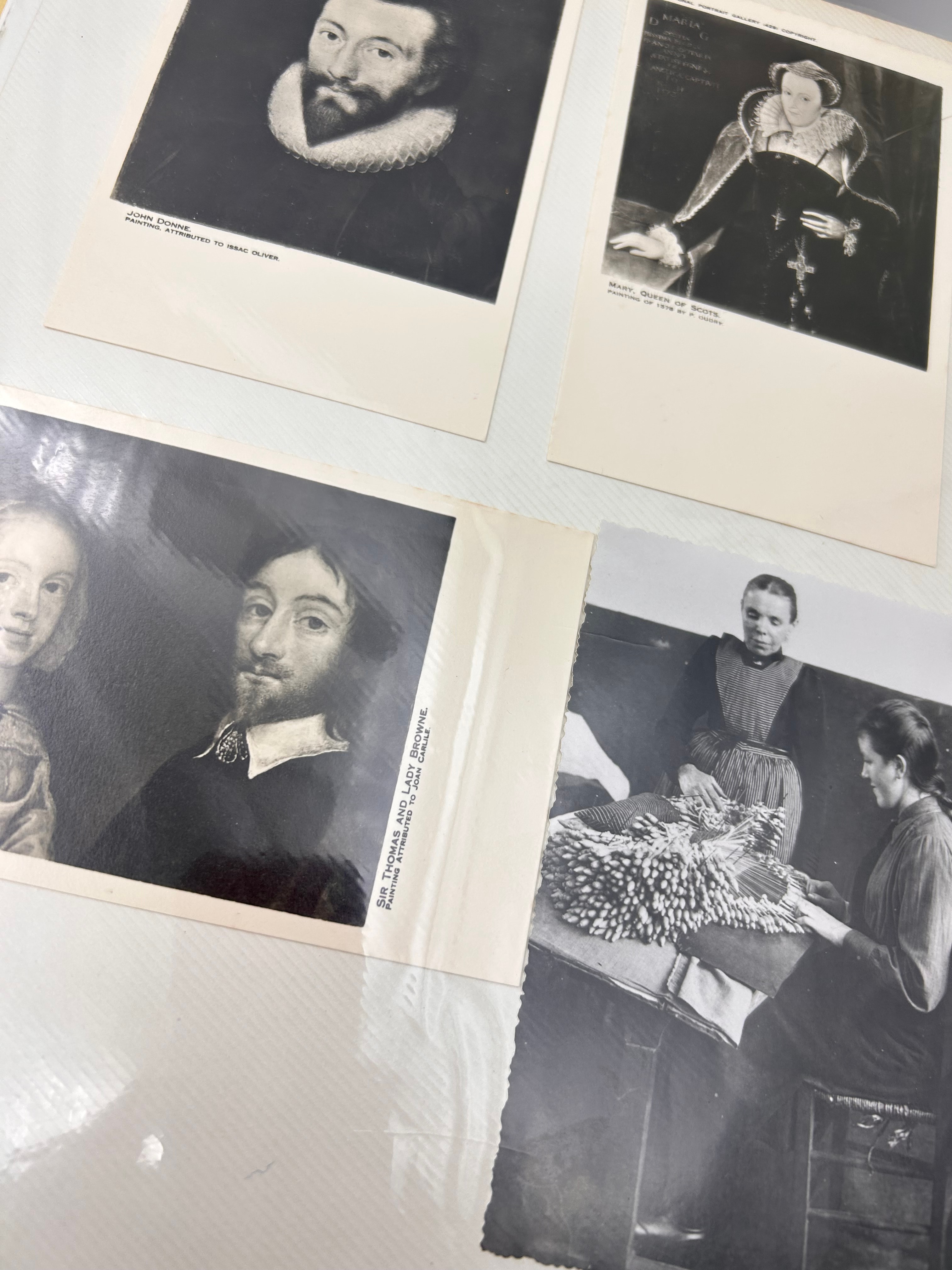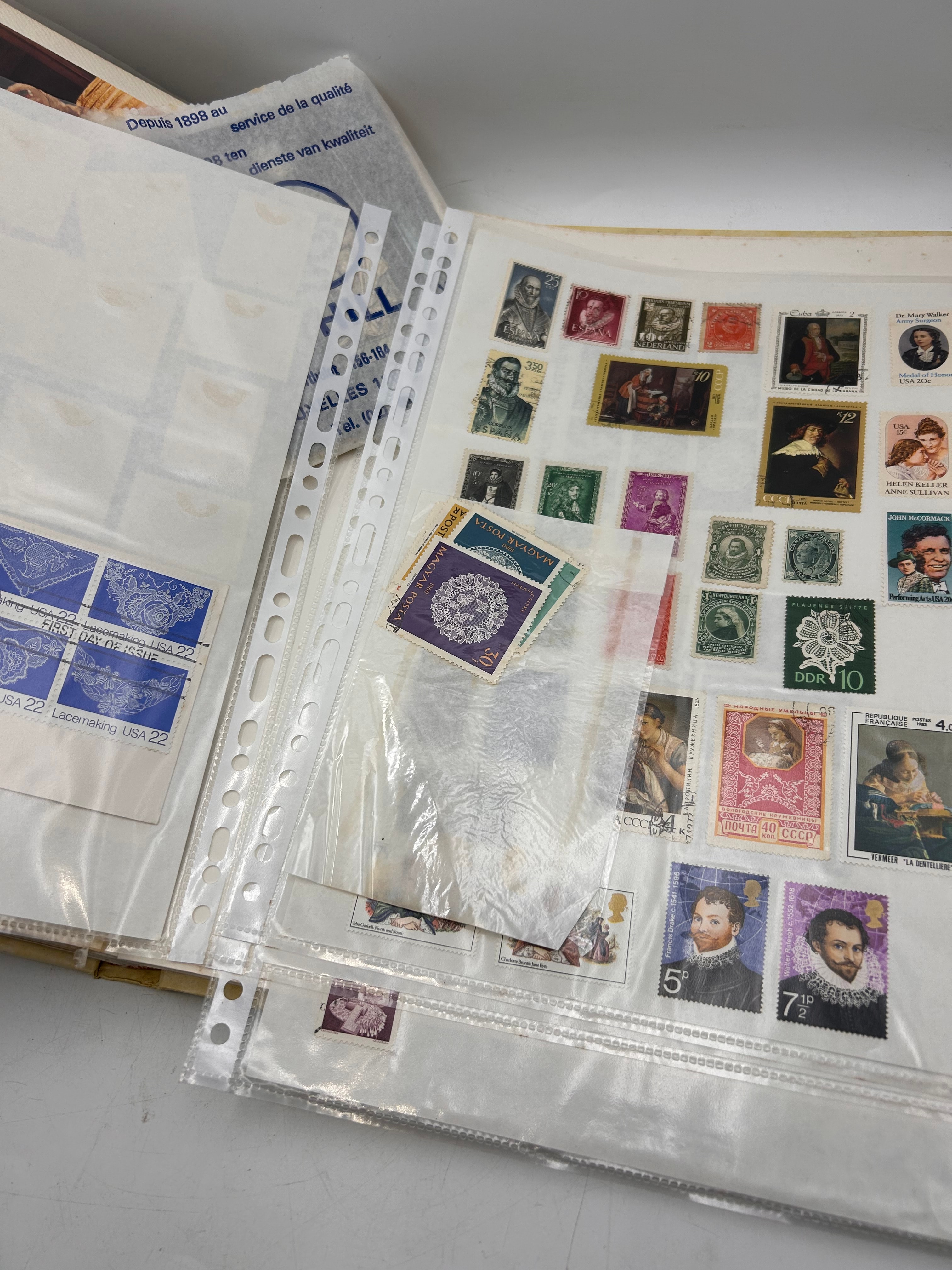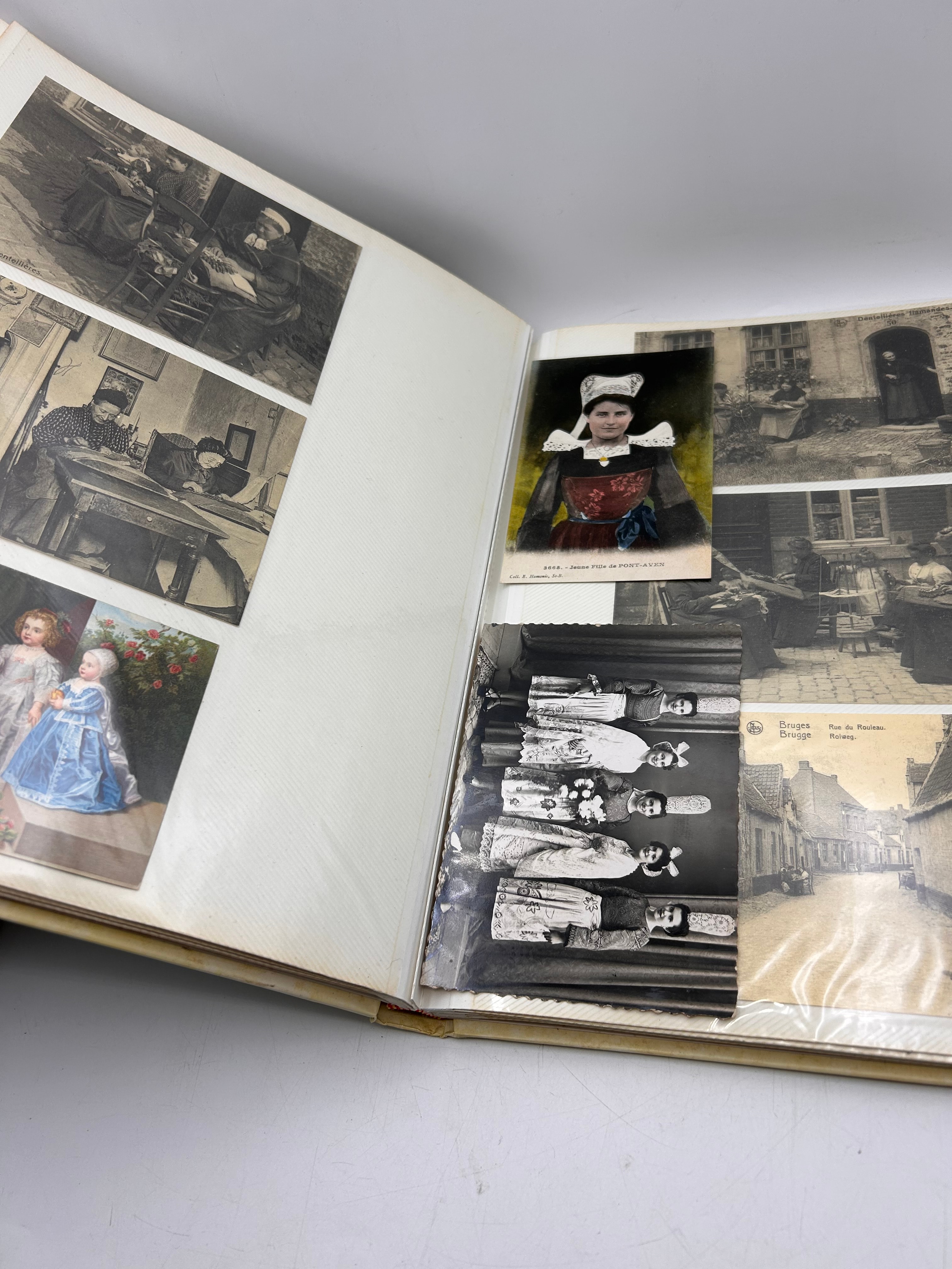 This bound album contains a diverse collection of postcards, reproductions of historical portraits, images of lace designs, and postage stamps, all housed within clear plastic sleeves. The contents suggest a thematic focus on lacemaking, European history, and regional culture. Visible imagery includes historical portraits suchs as Sir Francis Walsingham, William Cecil, Lord Burghley, John Donne, and Mary Queen of Scots, alongside depictions of lacemaking processes and various lace patterns. Textual elements found within the album include “Depuis 1898 au service de la qualité,” “ten dienste van kwaliteit,” “2054. – Jeune Fille de Pont-Aven,” “Bruges – Brugge,” “Rue du Houdien. Straat.,” and “LIMOUSIN.” Postage stamp examples include “USA 22 Lacemaking, First Day of Issue,” as well as stamps from “DDR” (East Germany) and “CCCP” (Soviet Union). The thematic content aligns with areas of interest such as museum studies, 18th-century fashion, and historical detail, as indicated by web research.