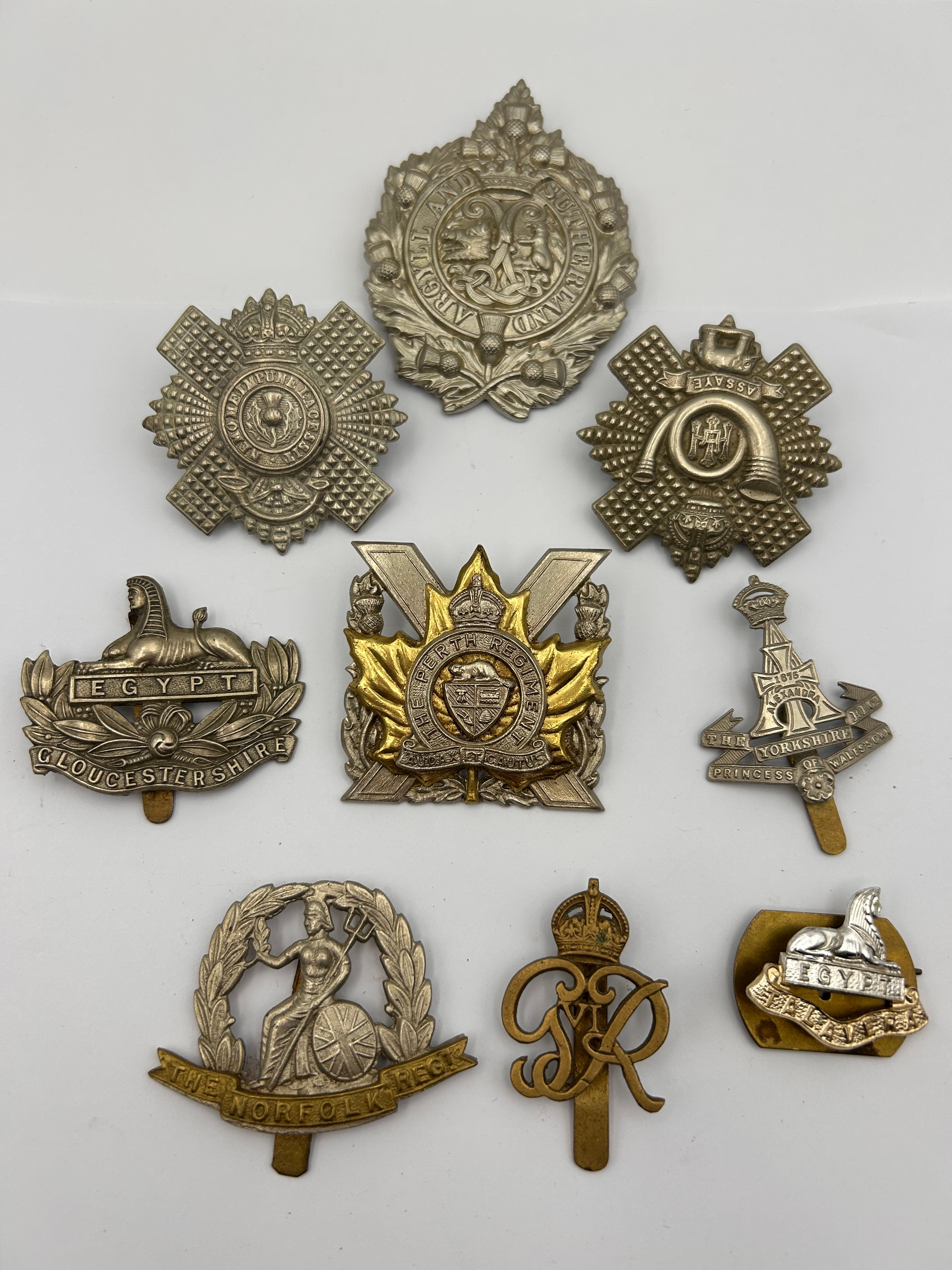 This collection features a Perth Regiment Cap Badge, bi-metallic in construction, displaying the Latin motto ‘AUDACES ET CAUTUS’ (Bold and Cautious). Also included are badges for the ARGYLL AND SUTHERLAND HIGHLANDERS, the BLACK WATCH ROYAL HIGHLANDERS with the Latin motto ‘NEMO ME IMPUNE LACESSIT’ (No one provokes me with impunity), the GLOUCESTERSHIRE Regiment featuring the battle honour ‘EGYPT’, and THE NORFOLK REGIMENT. Further badges include one marked ‘ASSAYE’, one featuring both ‘EGYPT’ and ‘TALAVERA’ battle honours, and THE YORKSHIRE PRINCESS OF WALES’S OWN (dated ‘1875’ and referencing ‘ALEXANDRA’). A separate badge exhibits the royal cipher ‘GR VI’ (George Rex VI), dating it to the reign of King George VI (1936-1952). The badges are primarily crafted from a silver-toned metal, with several examples showcasing bi-metal construction incorporating brass or bronze-toned elements.