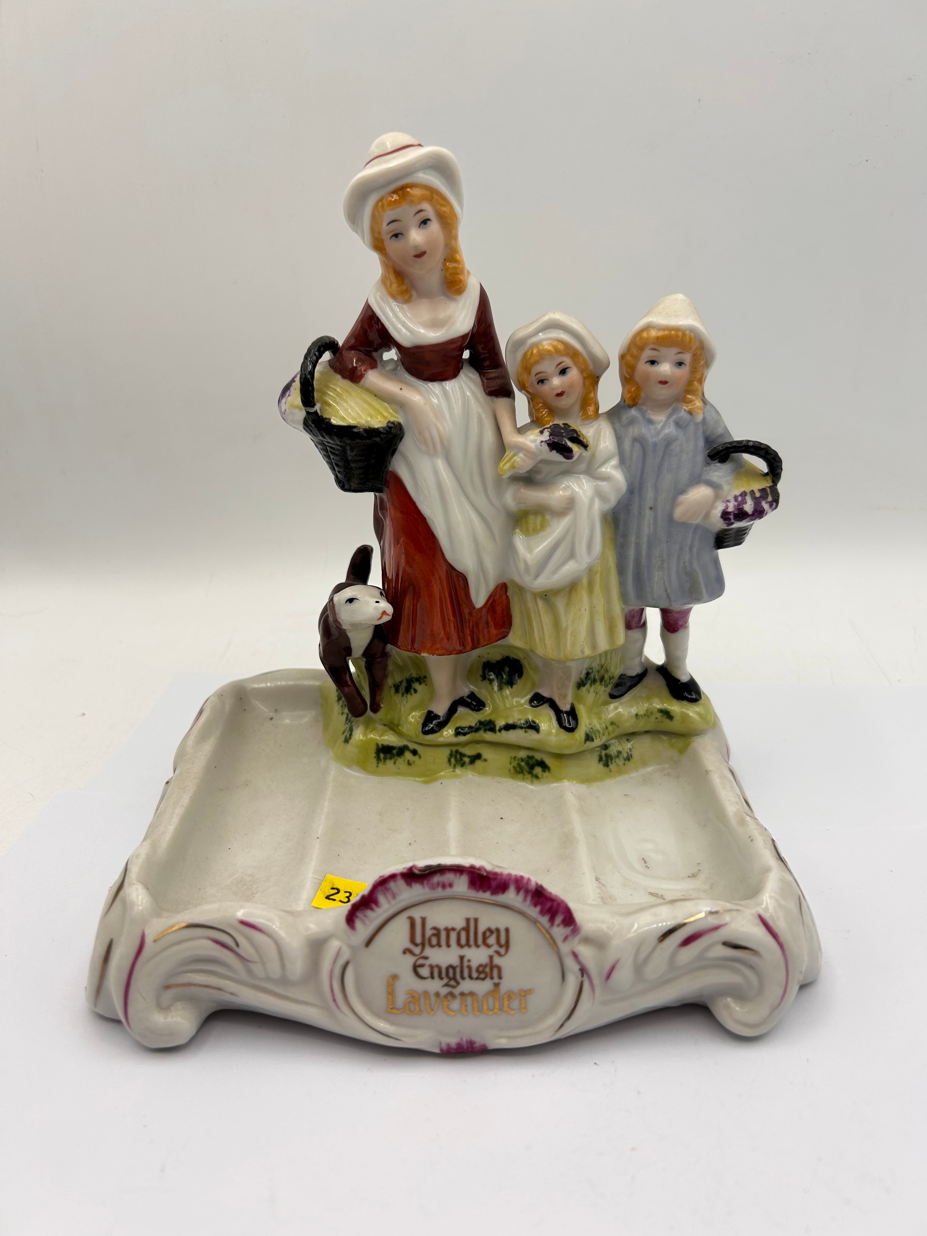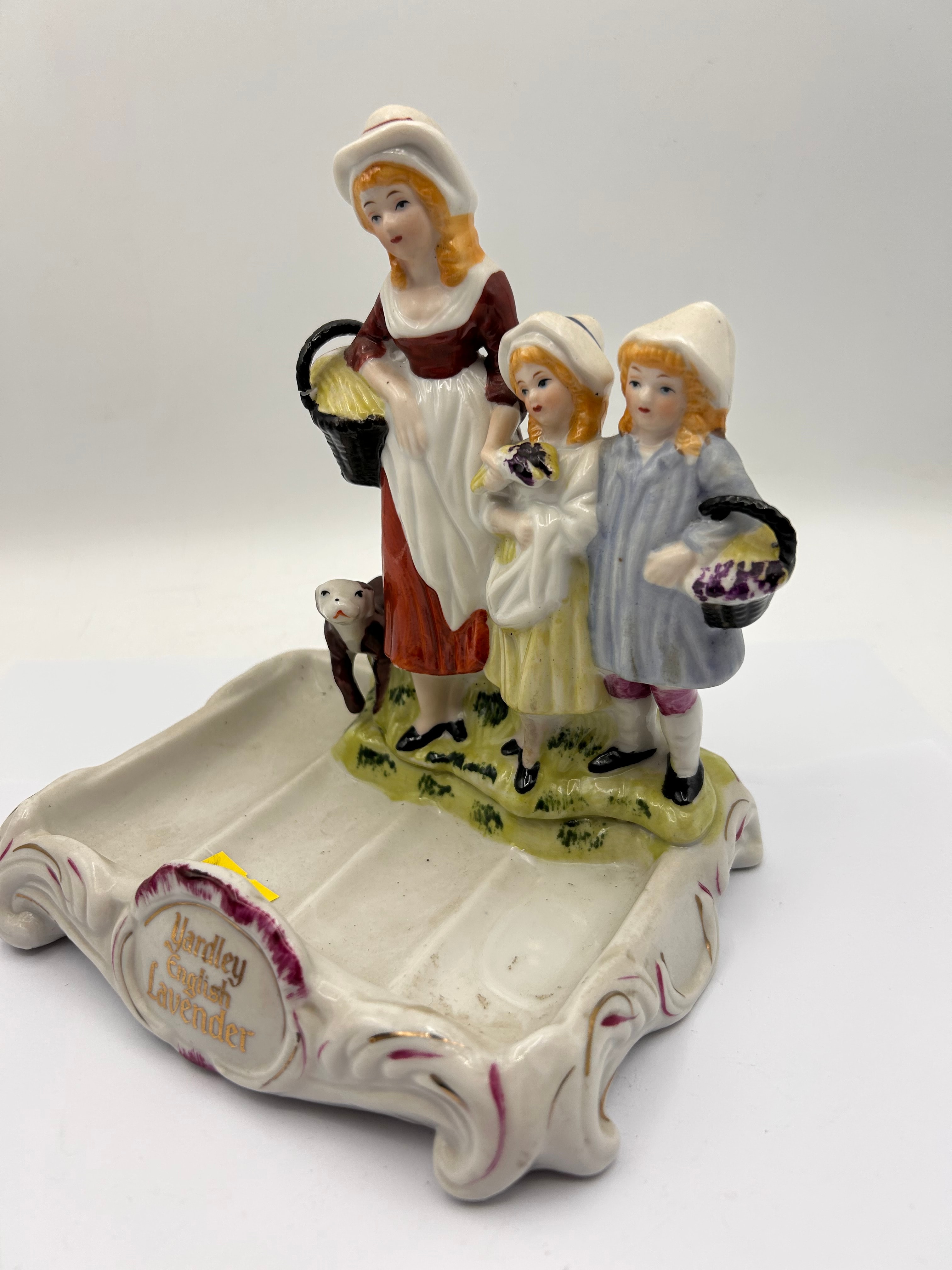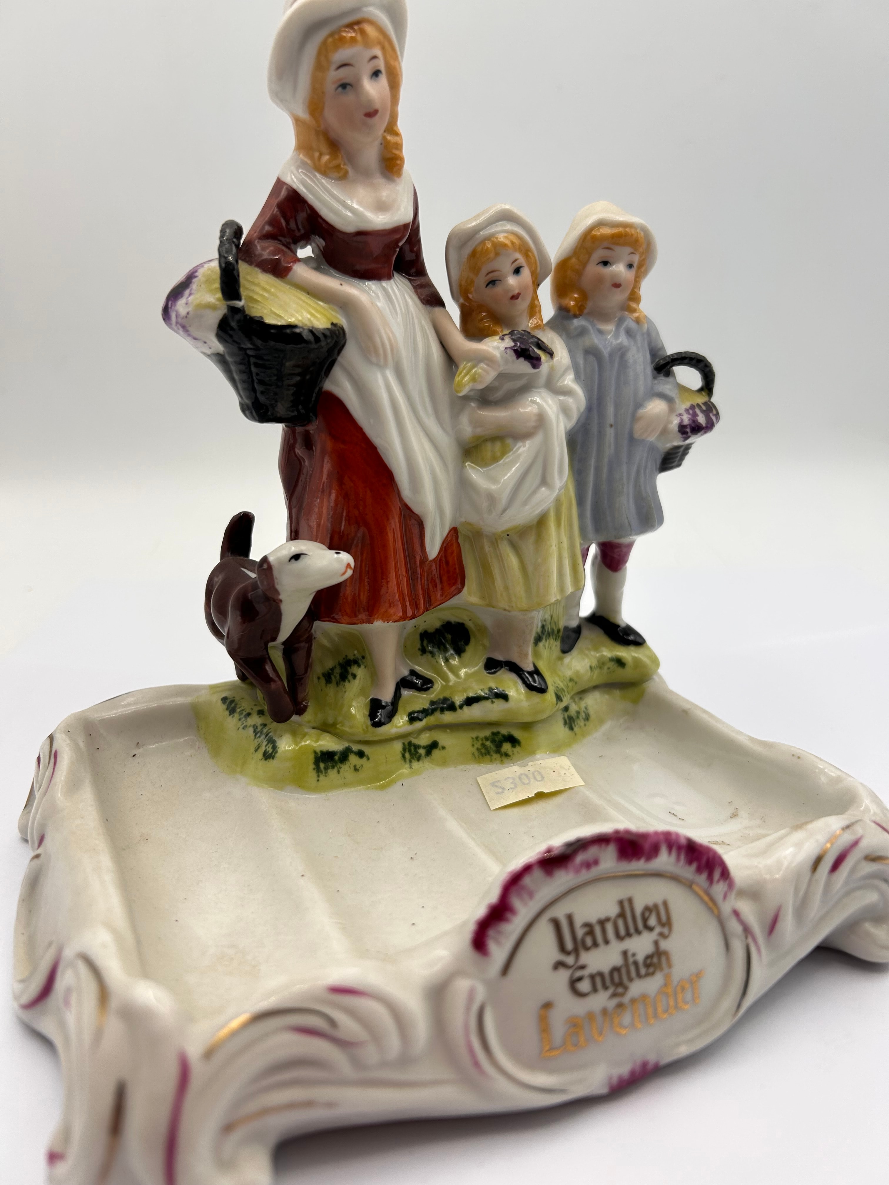 A glazed porcelain figural soap dish, depicting a pastoral scene. The figurine group features a standing woman in a red dress and white apron holding a basket, flanked by two children, one holding flowers and the other a basket of purple items, accompanied by a small brown and white dog, all on a green grassy base. This group is affixed to an off-white, rectangular tray with multiple indented channels and an ornate, scrolled border detailed with gold and purplish-red accents. A prominent oval cartouche on the front of the tray reads “Yardley English Lavender,” indicating its use as a promotional item for the English fragrance brand.