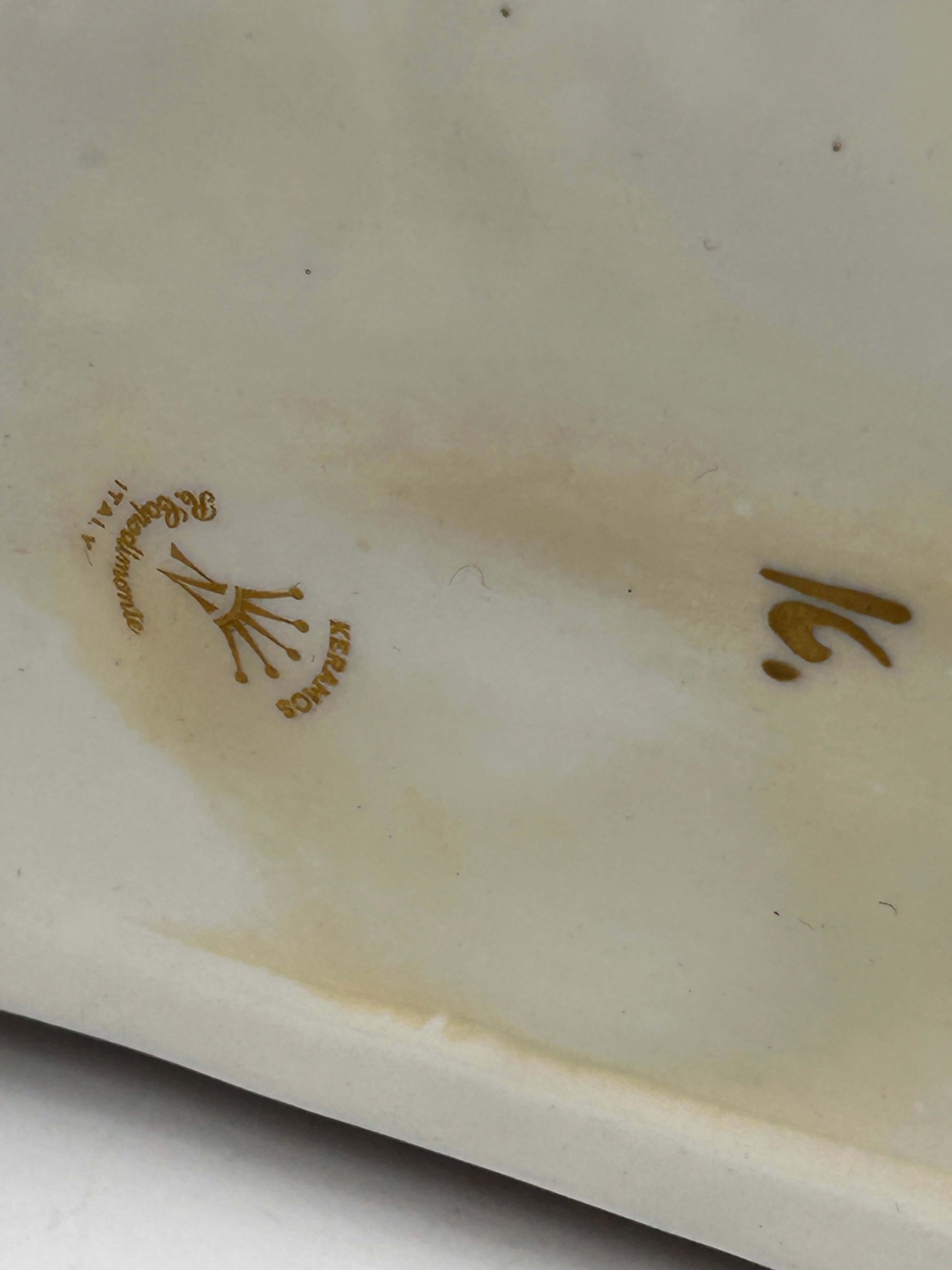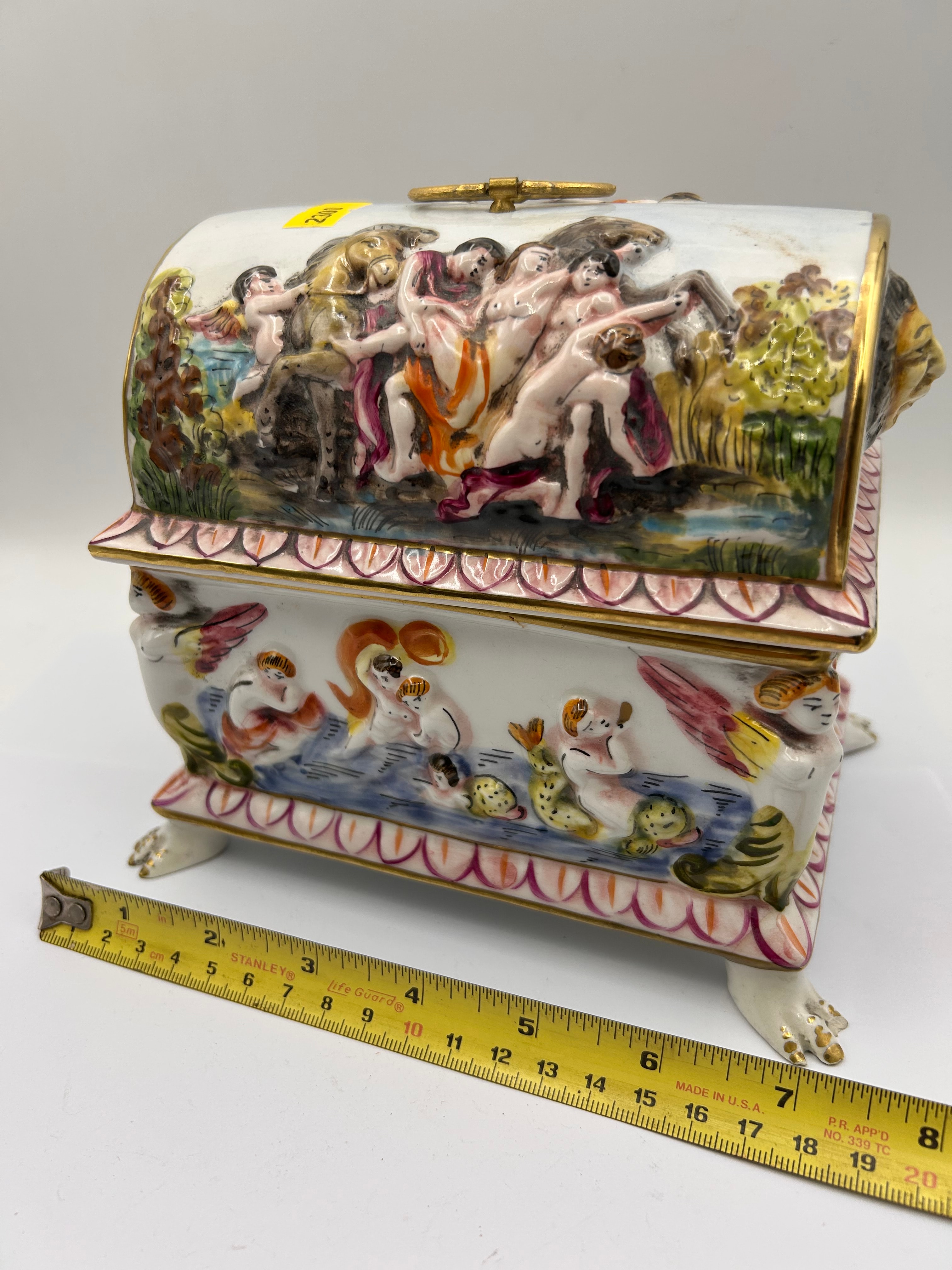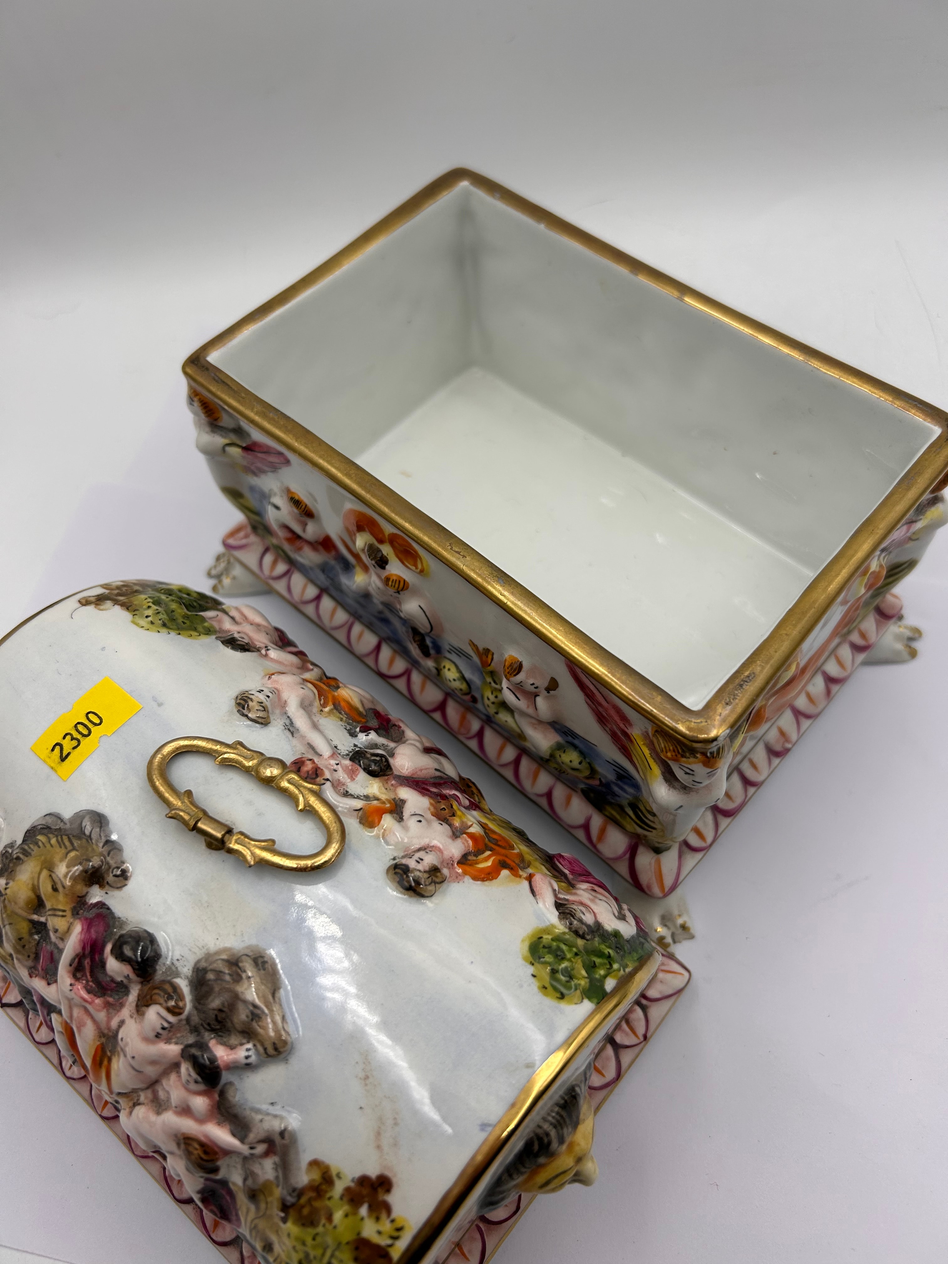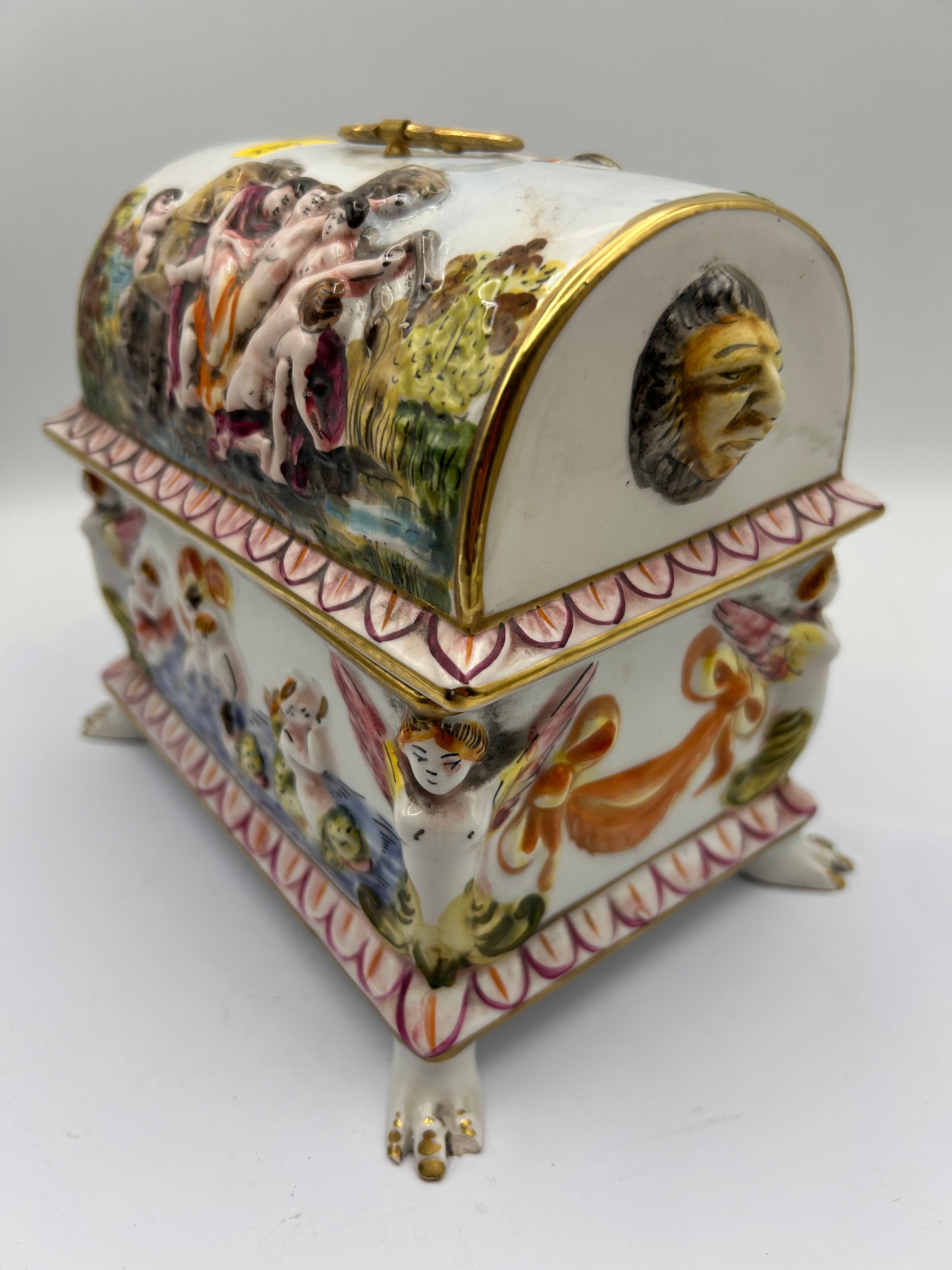 A Capodimonte porcelain domed casket, rectangular in form, extensively decorated with vibrant polychrome enamels in high relief. The domed lid depicts classical or mythological figural scenes with numerous nude and draped figures. The sides feature winged putti amidst aquatic creatures. The lid is fitted with an ornate, gold-colored handle/latch and a prominent relief of a male head on one end. Gilded rims accent both the lid and the body. The box is supported by four ornate feet. The interior is plain white with a gilded rim. The base bears a stylized crown above an “N,” encircling the word “KERAMOS,” with “S. Capodimonte” (Società Capodimonte) and “ITALY” marks, alongside the number “16.”