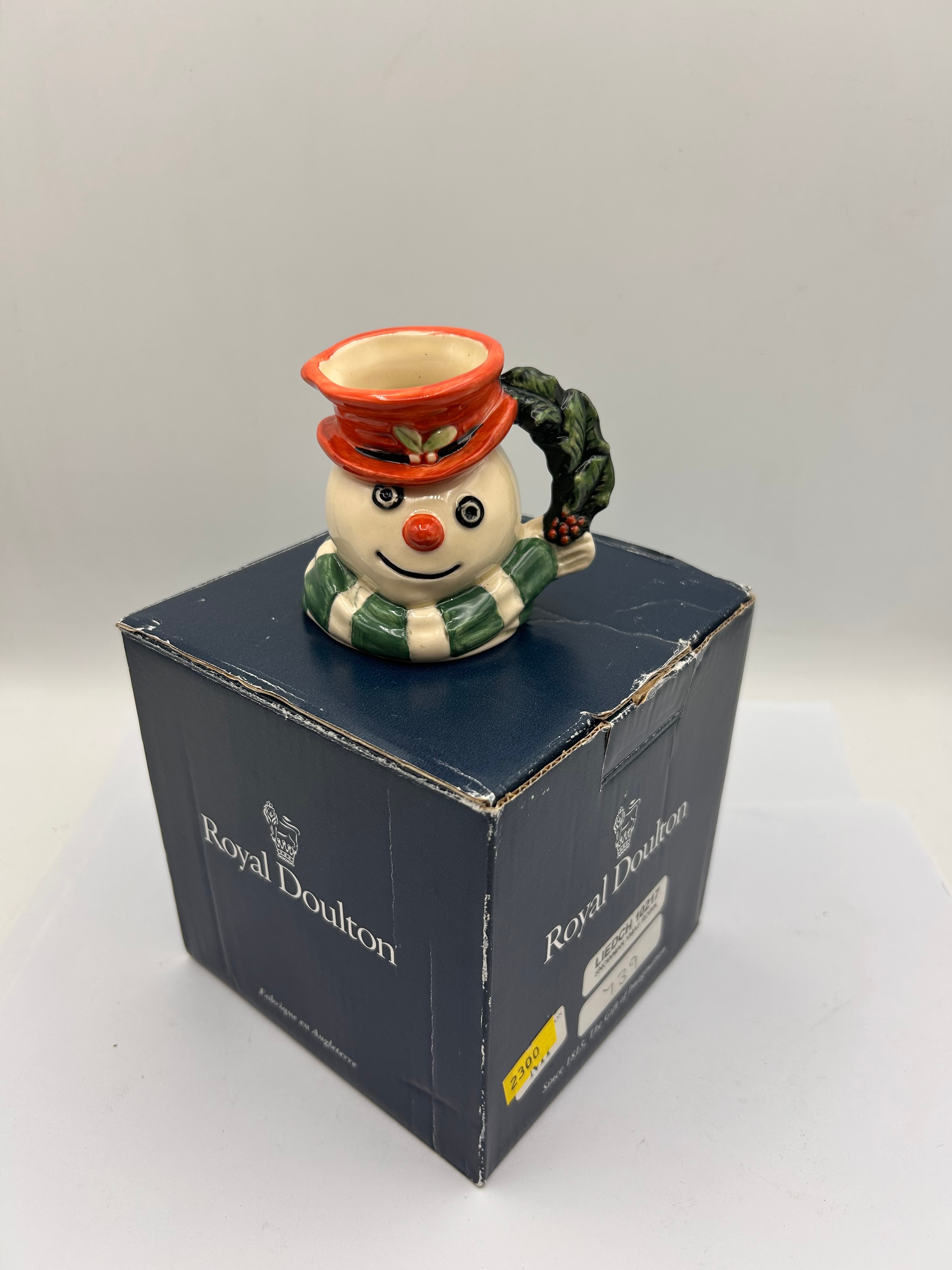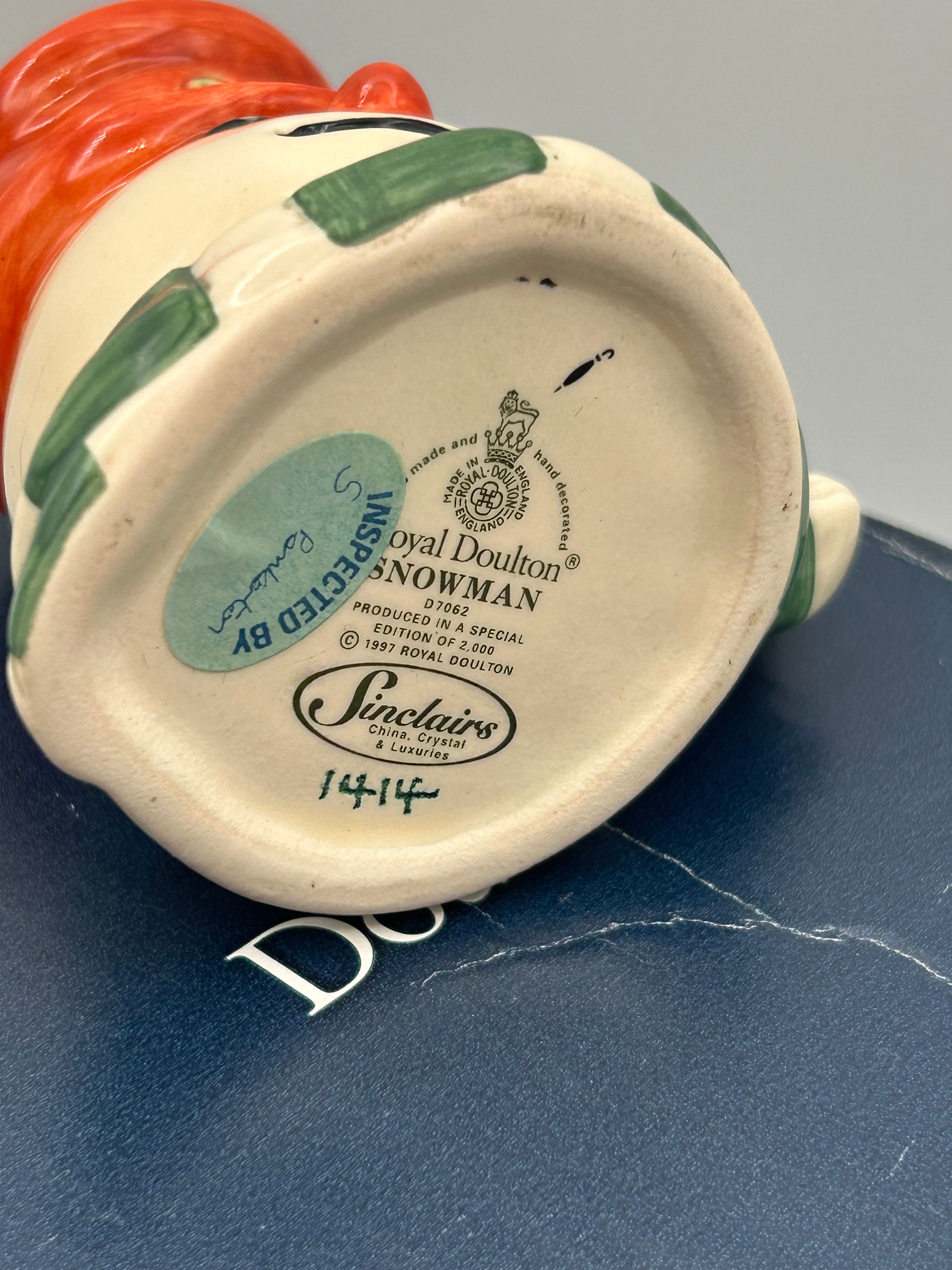 A Royal Doulton ‘Snowman’ Limited Edition Character Jug, model D7058. This hand-decorated ceramic figural mug or miniature jug is shaped like a snowman wearing a red top hat and a green and white striped scarf, with a holly sprig forming the handle, executed in a whimsical, festive style. The base is extensively marked with the Royal Doulton crown and lion trademark, “ROYAL DOULTON SNOWMAN,” model number “D7058,” “PRODUCED IN A SPECIAL EDITION OF 2,000,” and “© 1997 ROYAL DOULTON.” Further visible text on the base includes “Sinclairs China, Crystal & Luxuries,” a handwritten “1414,” and an “INSPECTED BY S. Pinkerton” sticker. The item is accompanied by its original dark blue Royal Doulton box, which also bears text including “Fabriqué en Angleterre.”