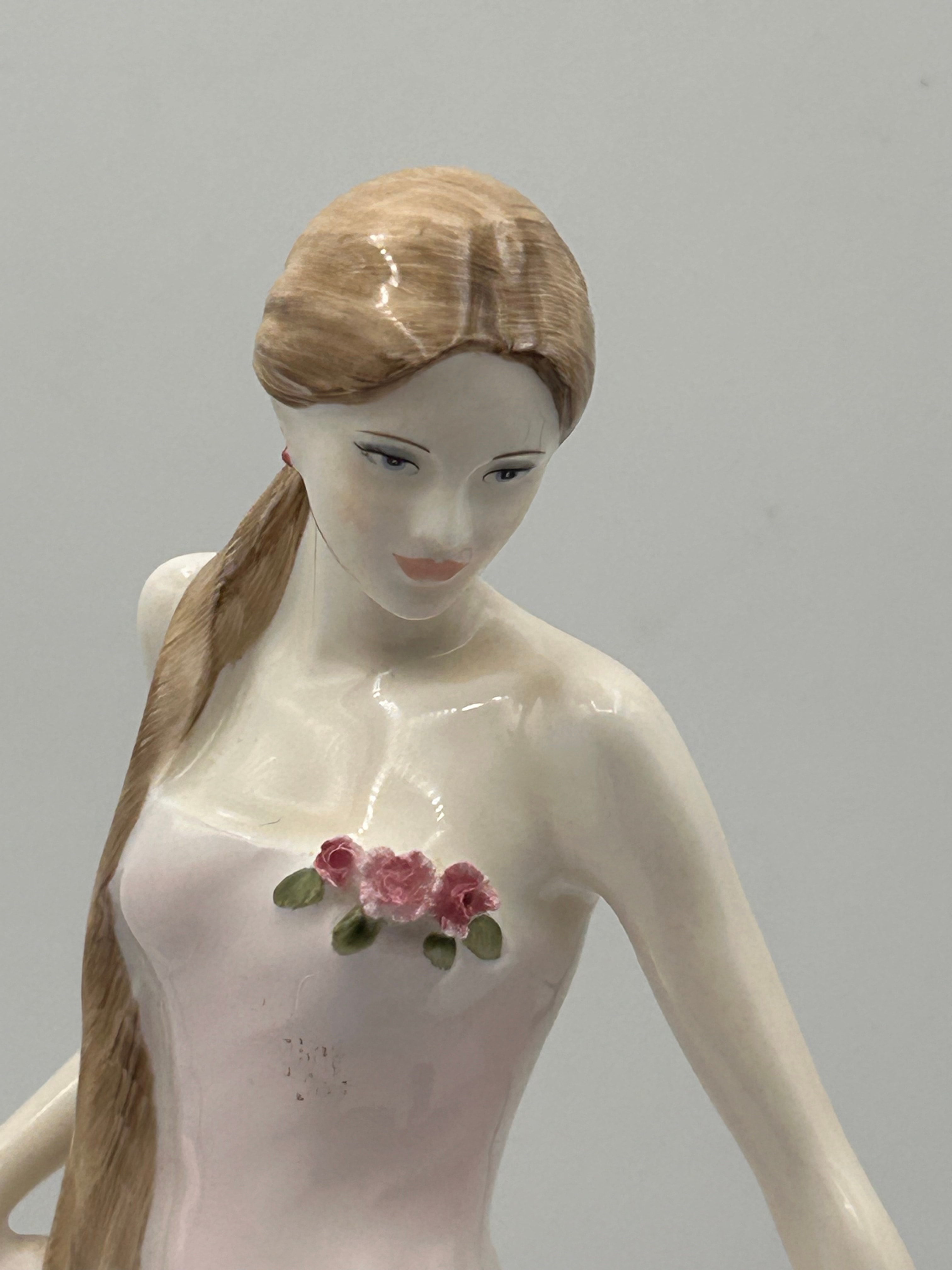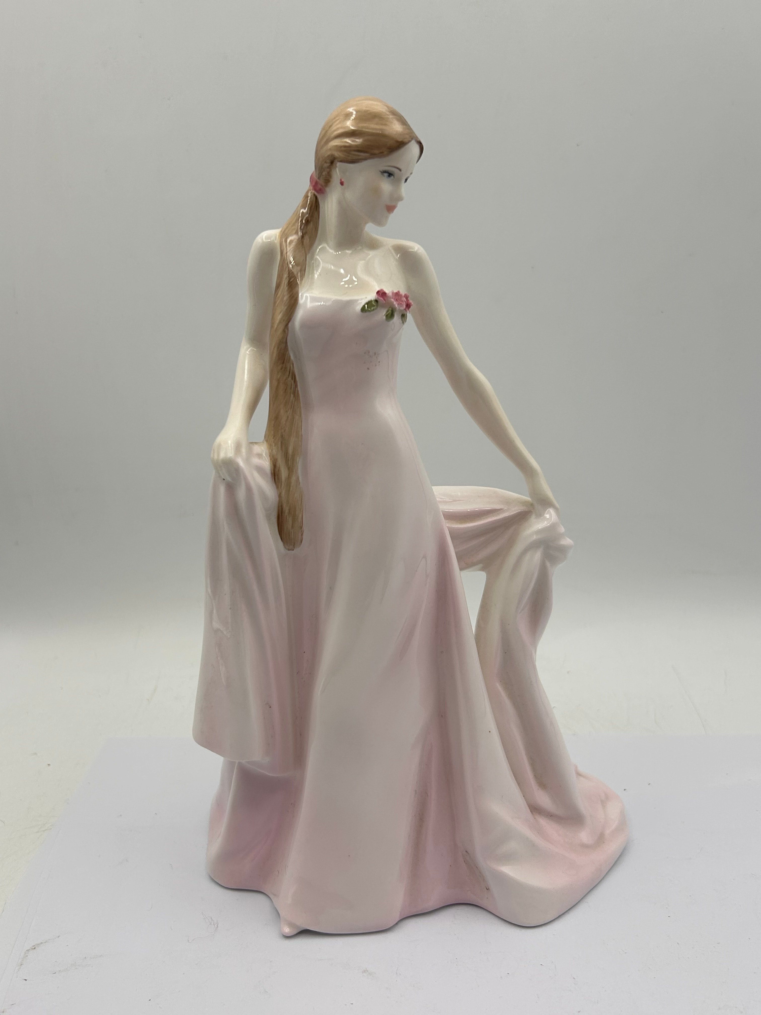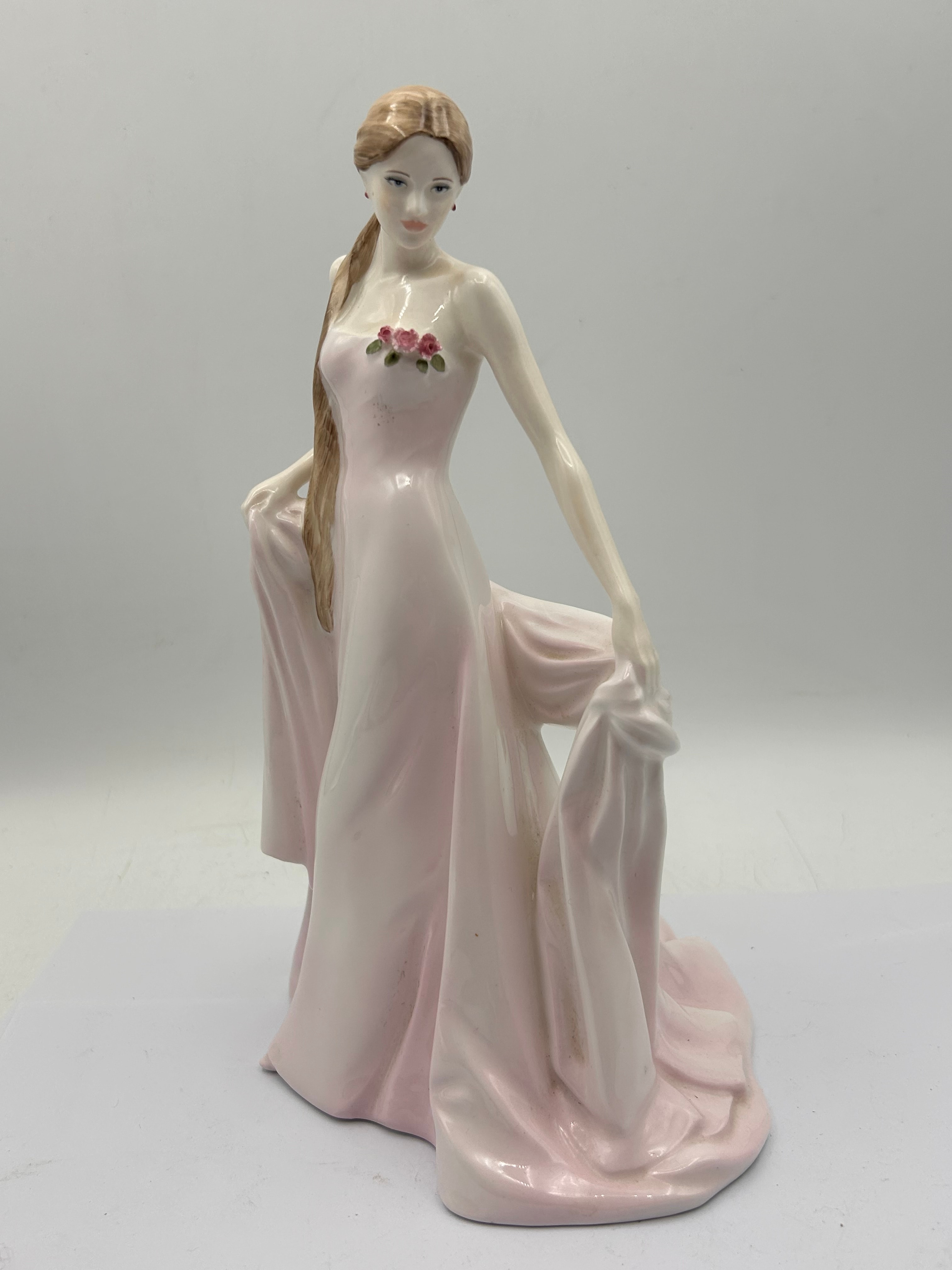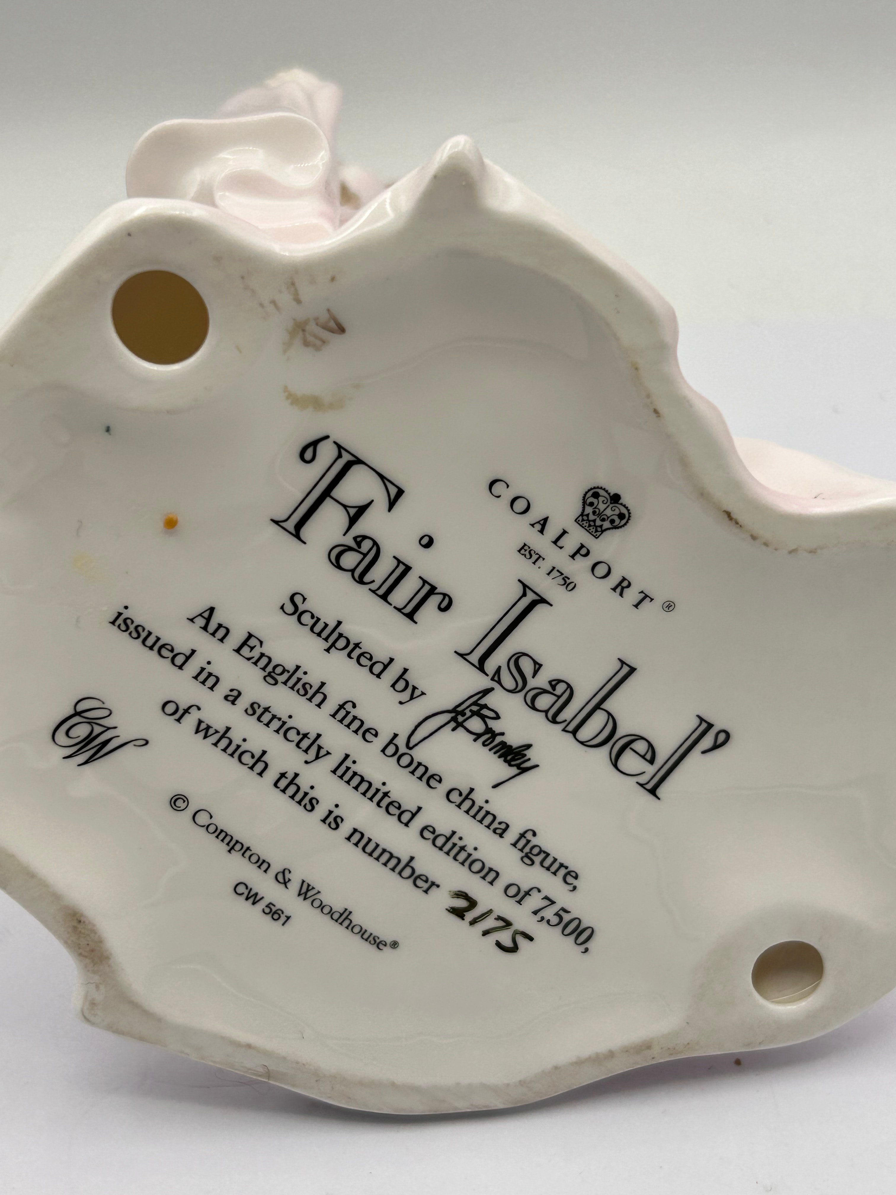 An English fine bone china figurine by Coalport, depicting “Fair Isabel.” The standing female figure wears a flowing, floor-length gown in pale pink and white, adorned with three sculpted pink roses on the bodice. Her long, light brown hair is styled in a braid over one shoulder, and she holds folds of her dress in each hand. The base is marked “COALPORT ® EST. 1750” with its crown logo, “Sculpted by A. Gribley,” and “© Compton & Woodhouse® CW 561.” Further text specifies it is “An English fine bone china figure, issued in a strictly limited edition of 7,500, of which this is number 2/75.” A small handwritten mark, possibly “A/2,” is also present on the underside.