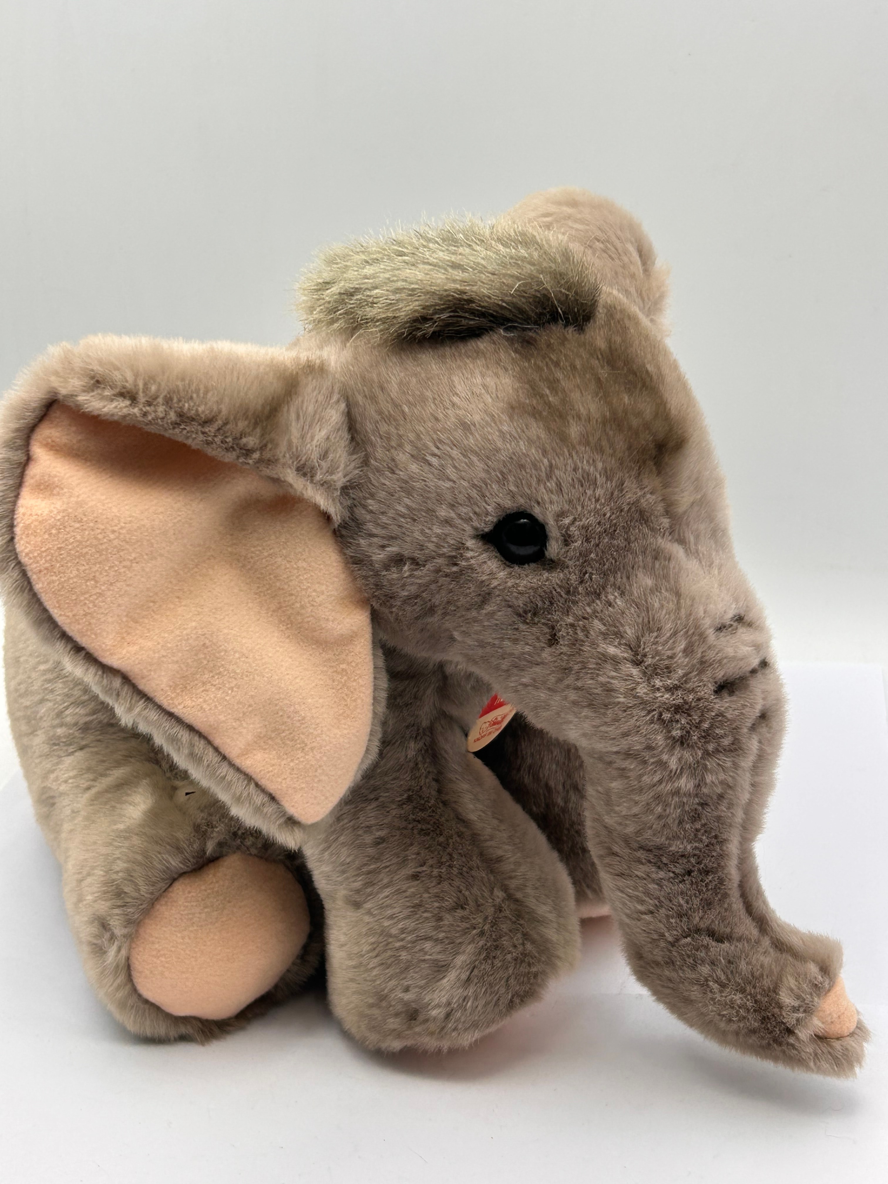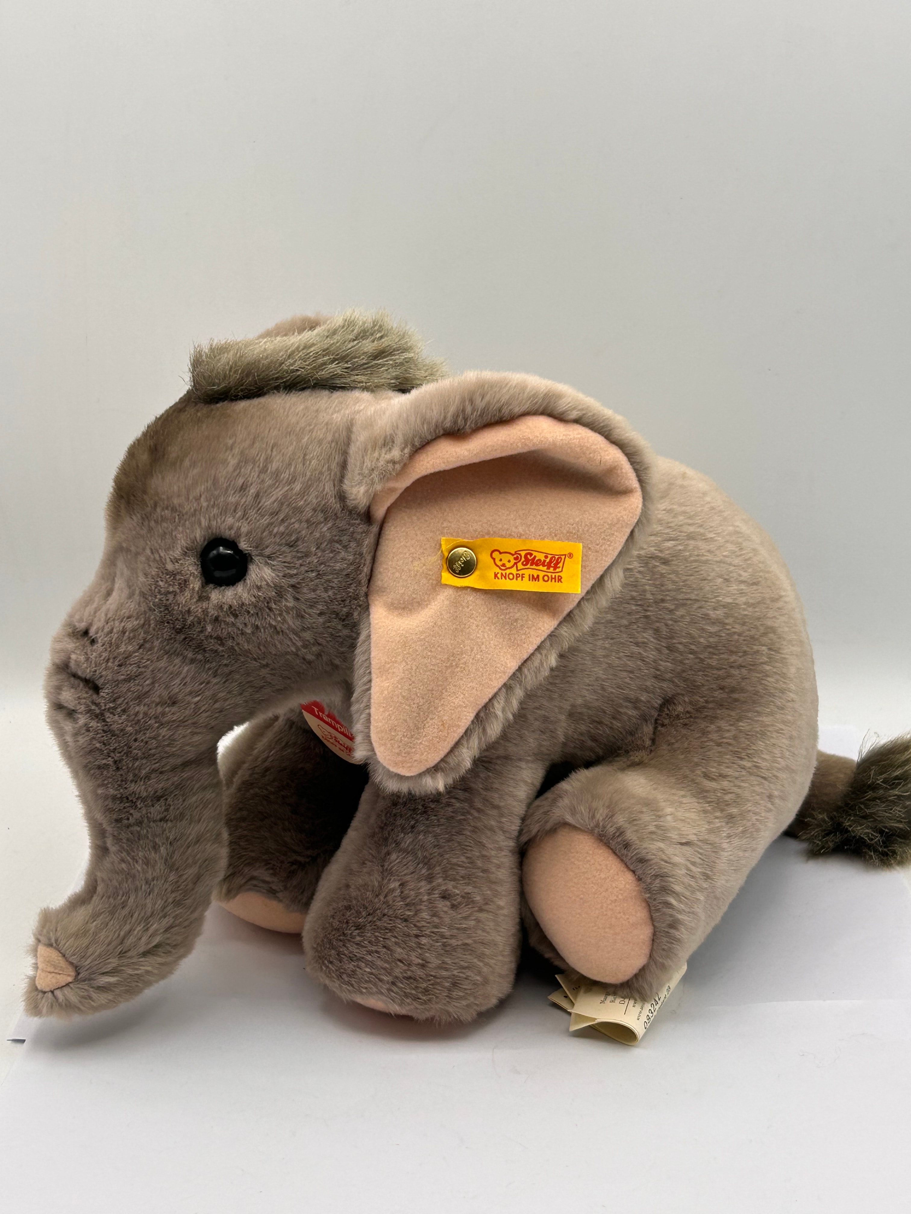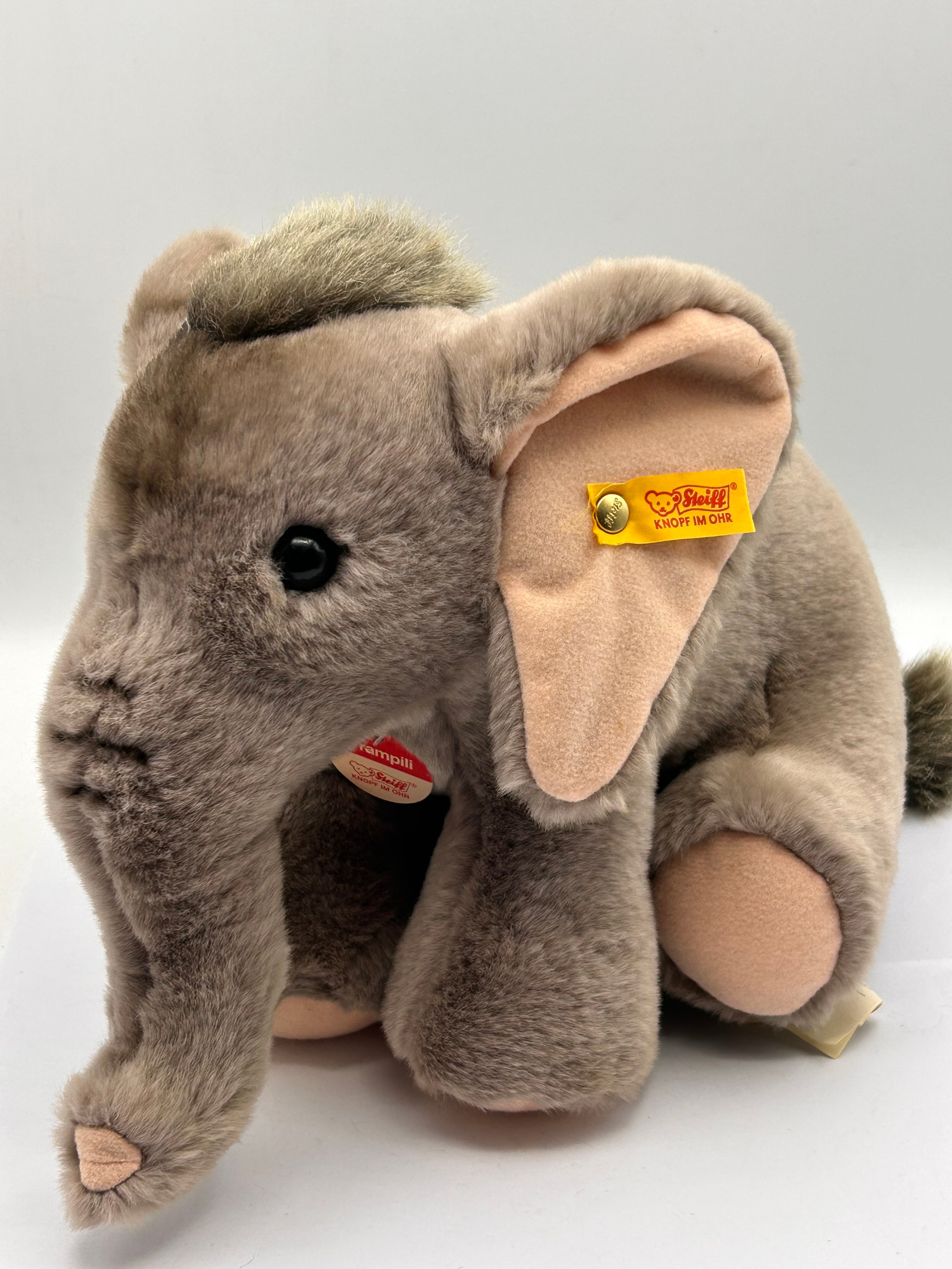 A Steiff Trampili Elephant plush stuffed animal, depicting an elephant, characterized by its soft, brown-grey faux fur material, black plastic eyes, and lighter peach-toned inner ears and foot pads, with a tuft of lighter brown fur on its head and tail tip. A prominent yellow tag is affixed to the left ear with a brass-colored button, bearing the stylized text “Steiff” and “KNOPF IM OHR” (German for “BUTTON IN EAR”). A red and white paper tag, partially visible around the neck area, shows the text “tempting”, and a white fabric tag is partially visible on the underside.