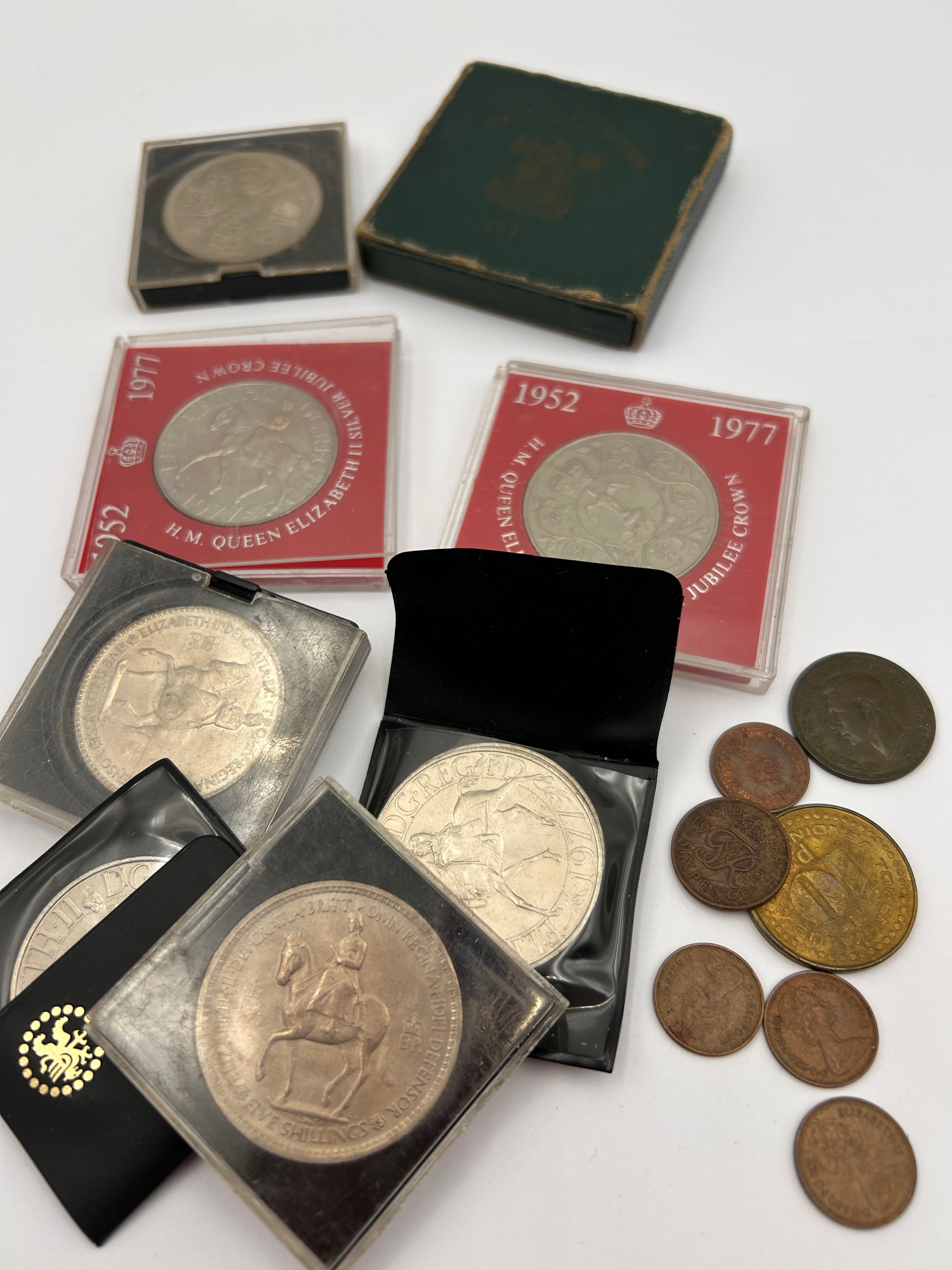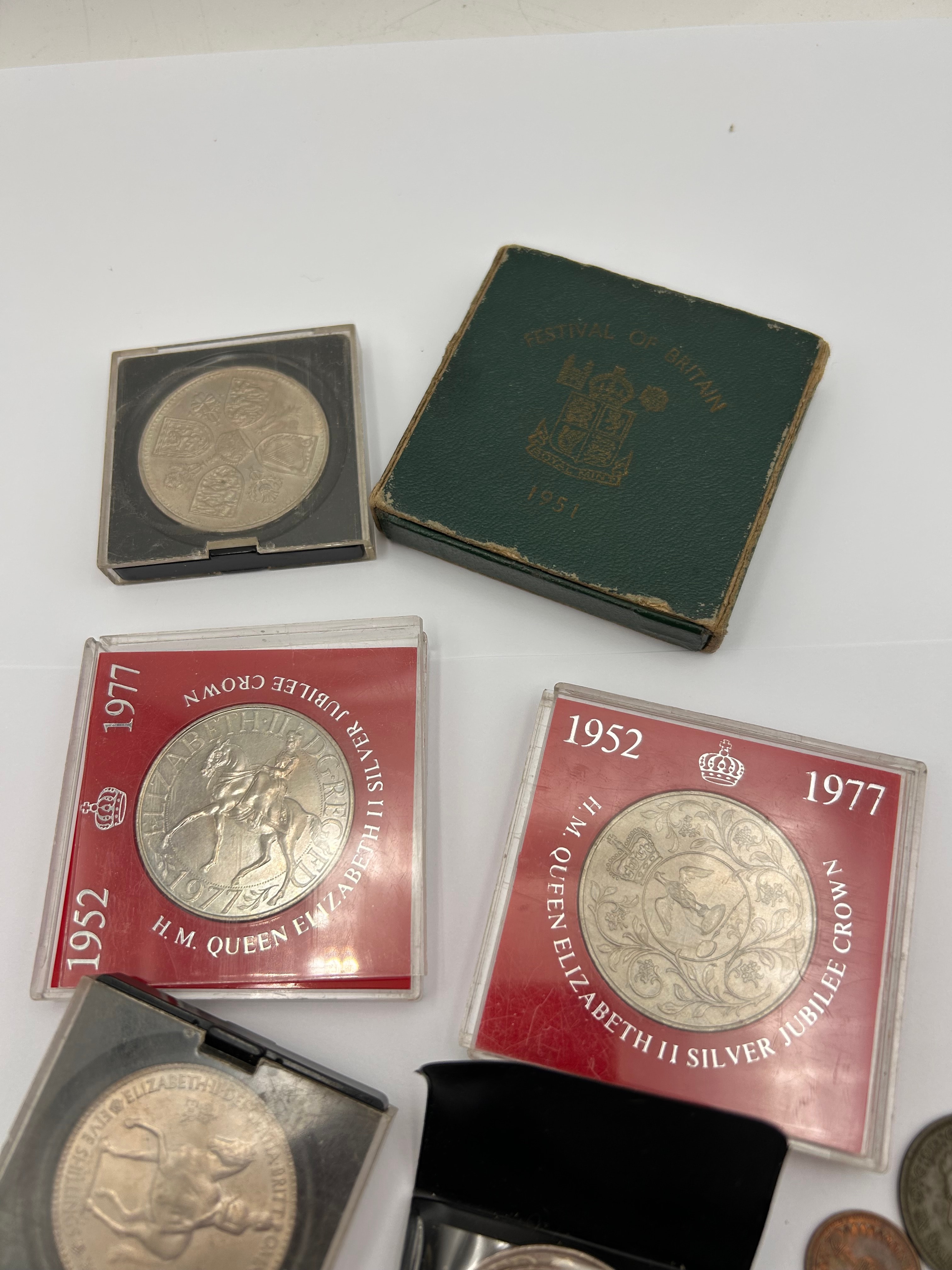 A collection of British commemorative coins and currency, primarily dating to the mid-20th century and associated with Queen Elizabeth II’s reign. The collection includes two 1952-1977 H.M. Queen Elizabeth II Silver Jubilee Crown coins, each presented in a red-backed plastic holder. Also present are two 1953 Coronation Five Shillings coins, one housed in a black sleeve and another in a small dark plastic box. A 1951 Festival of Britain Five Shillings coin is also included, housed in a black sleeve and accompanied by its original green cardboard box, marked “FESTIVAL OF BRITAIN 1951.” Additionally, a group of loose copper, bronze, and brass-toned coins of various denominations and ages are scattered.
