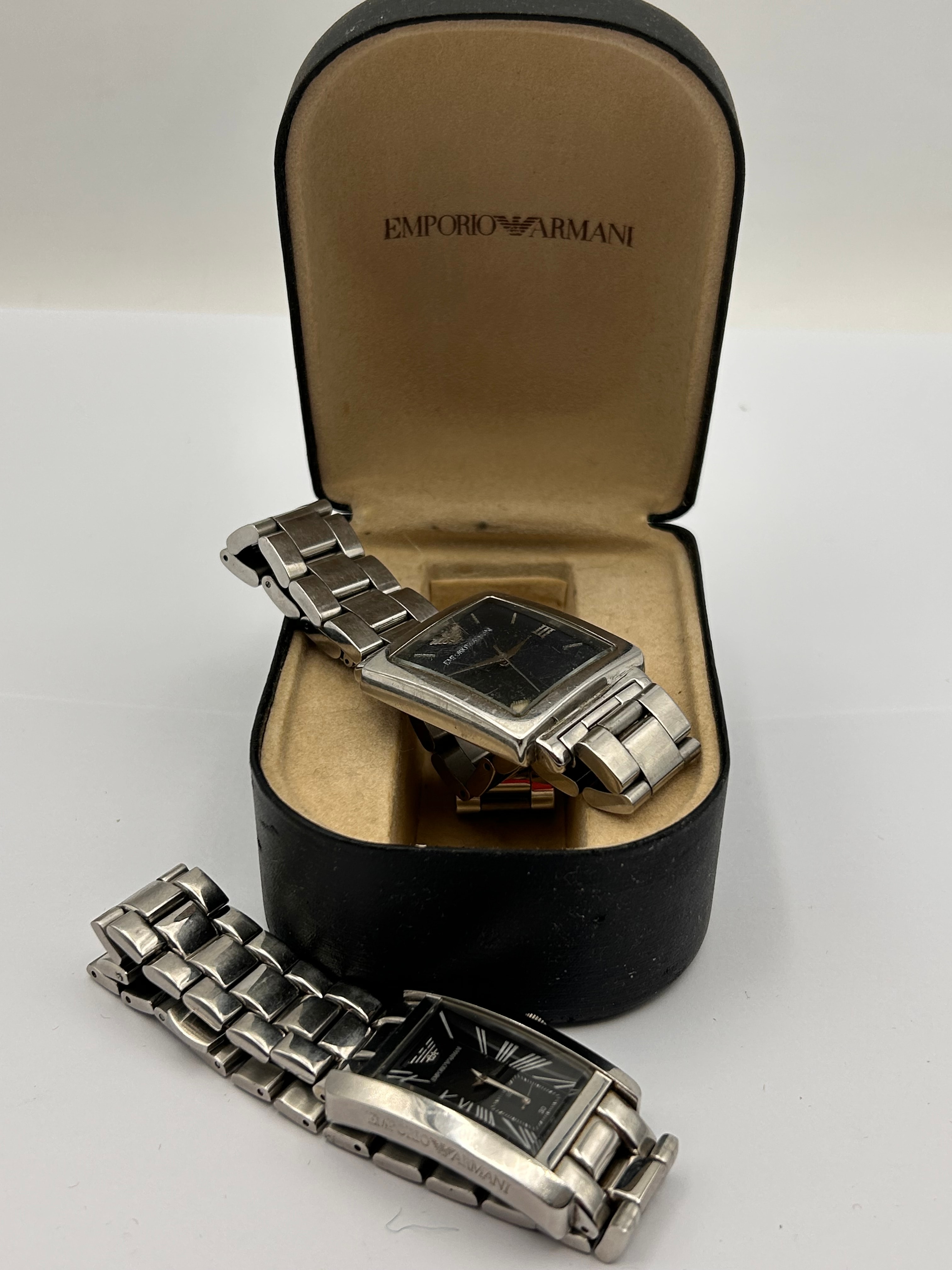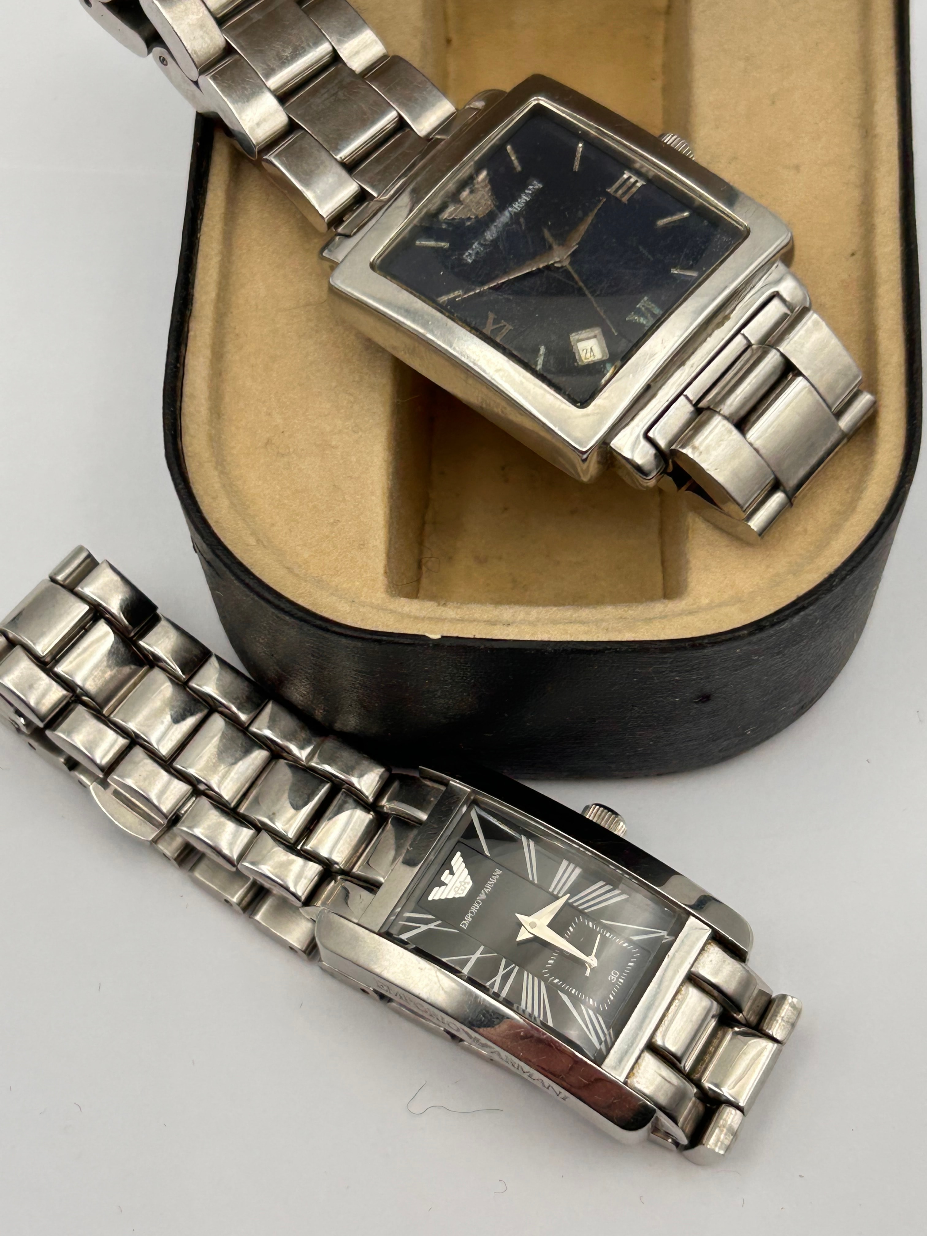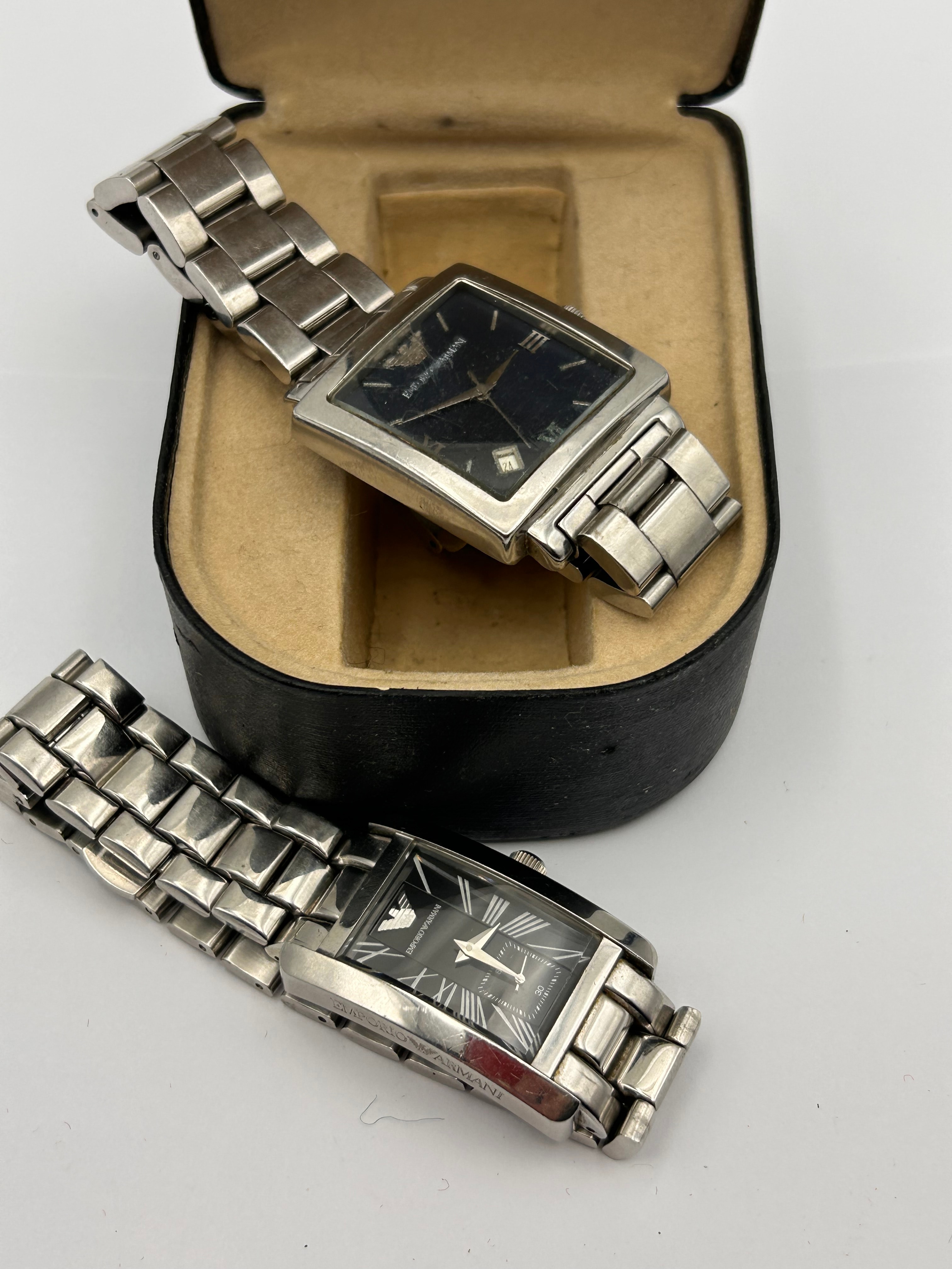 A pair of Emporio Armani stainless steel wristwatches, comprising models AR0156 and AR-0170. The AR0156 model features a square case with a black dial, stick markers, and a date window displaying “24,” with “WATER RESISTANT 5 BAR” visible on the dial. The AR-0170 model presents a rectangular case with a black dial, Roman numeral hour markers, and a sub-dial marked “30,” with “WATER RESISTANT” text visible. Both watches are constructed from stainless steel and are accompanied by an open black branded watch case lined with tan material, featuring “EMPORIO ARMANI” printed on the inner lid.