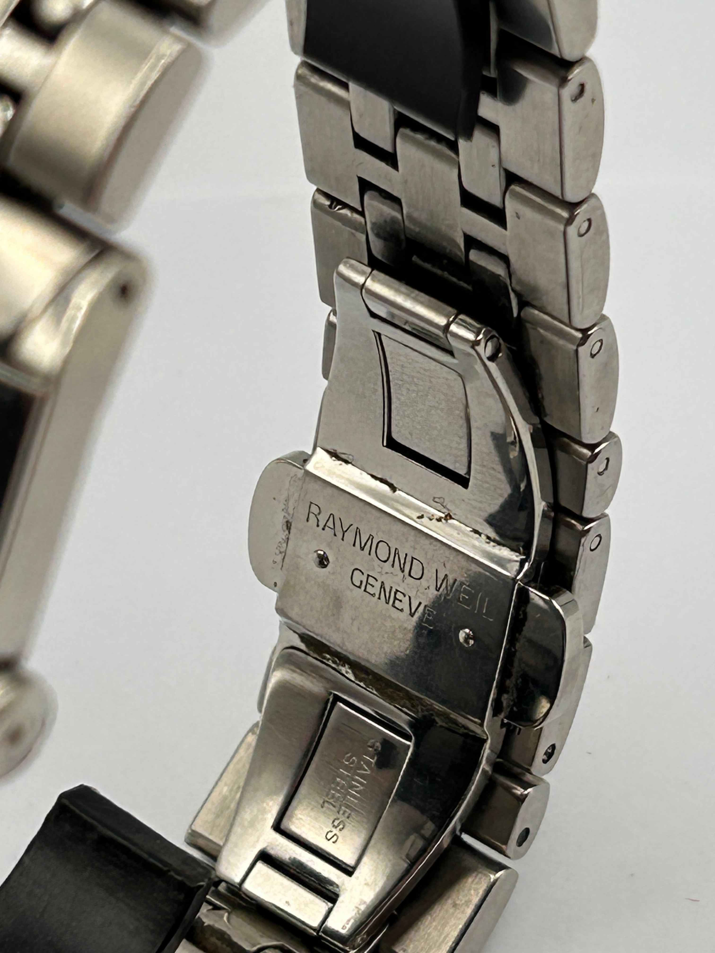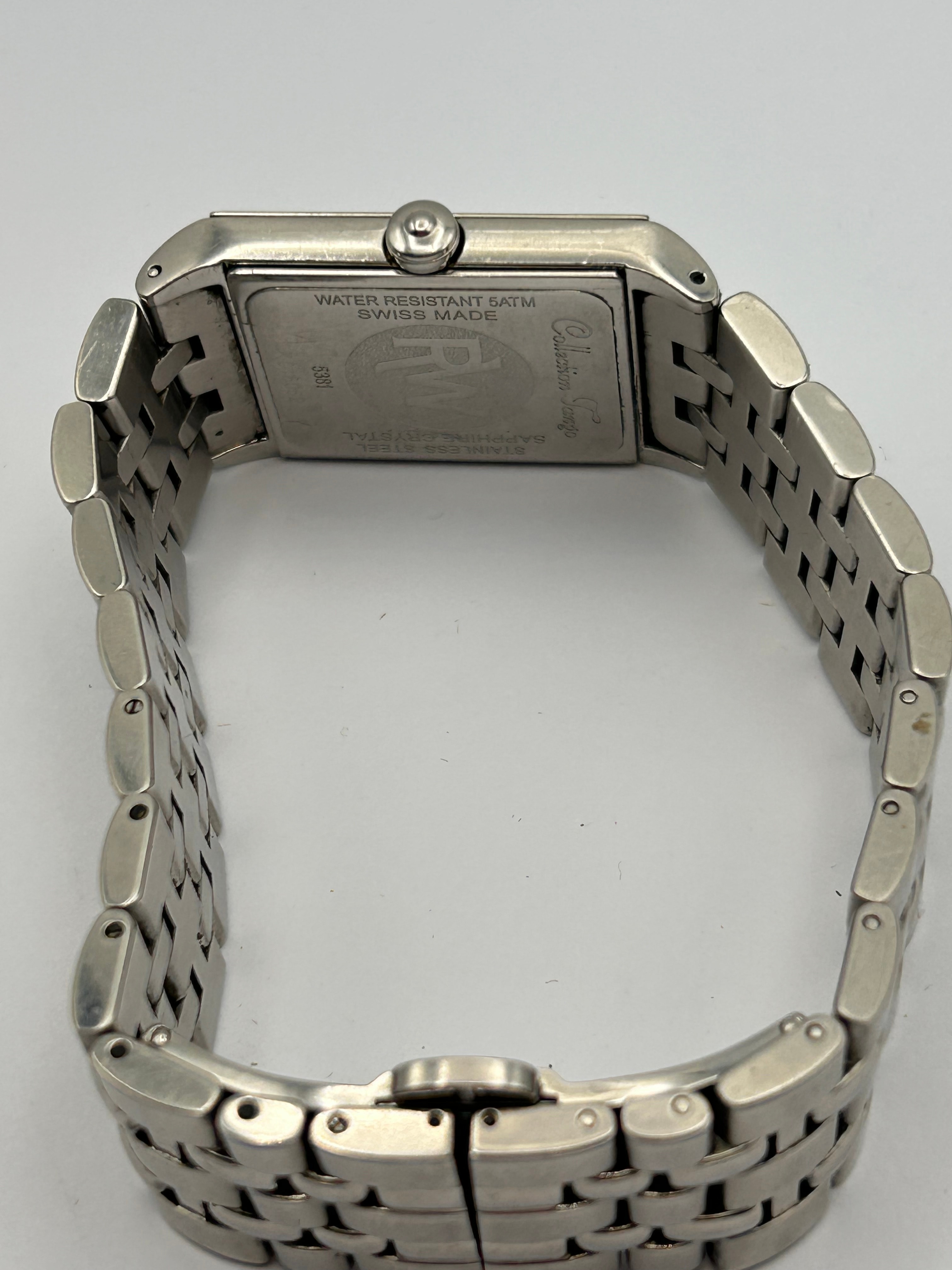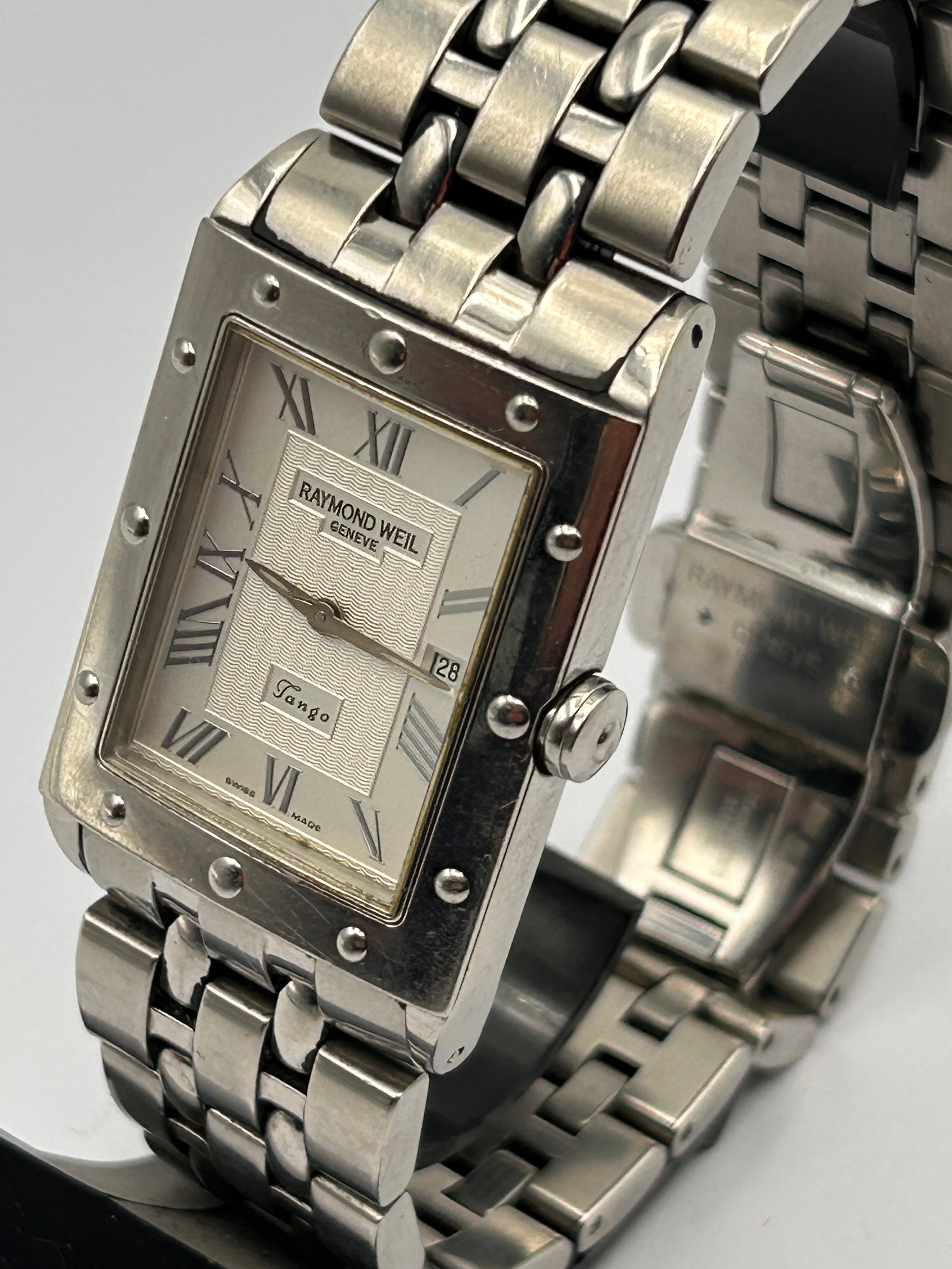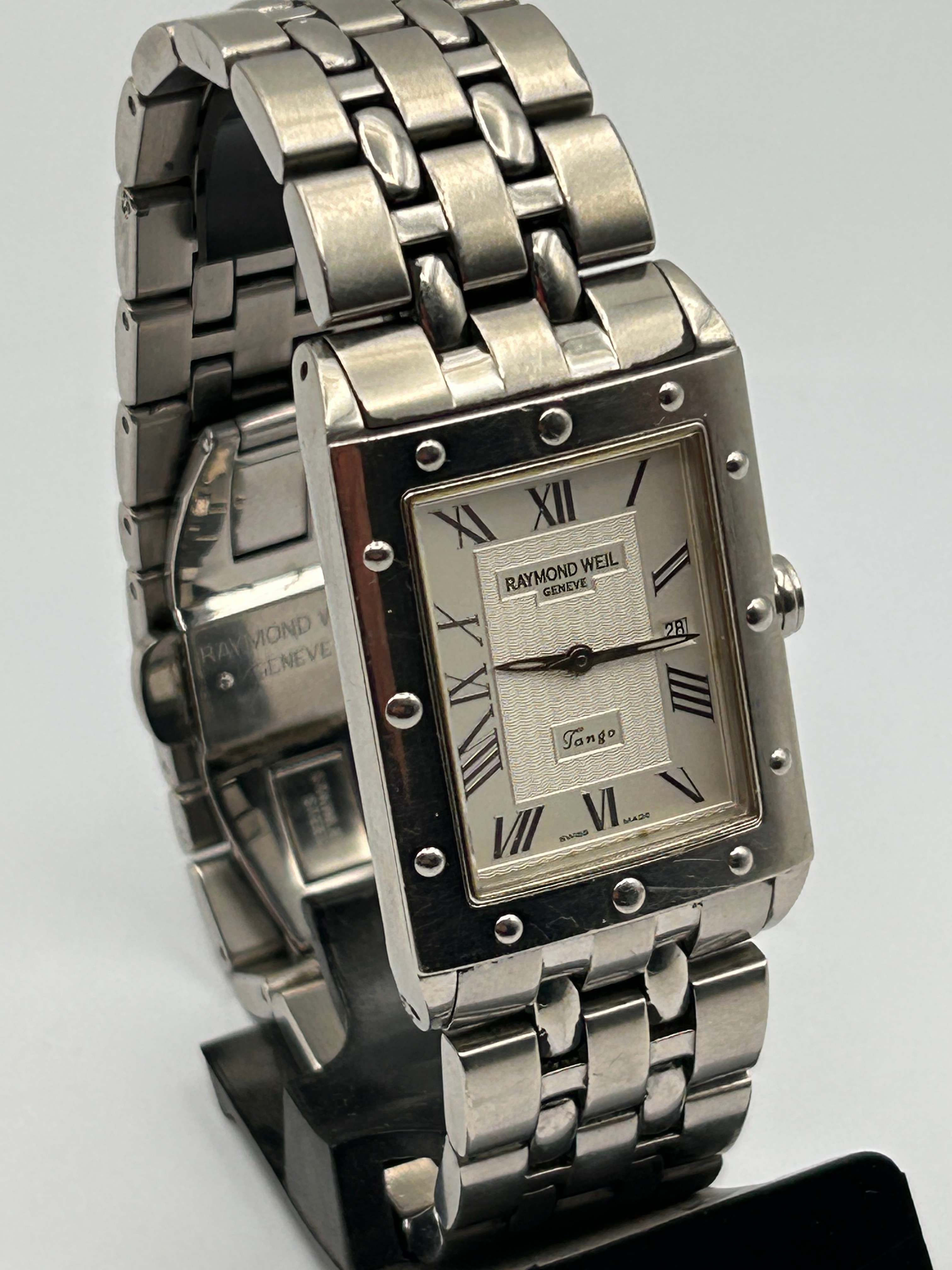 A Raymond Weil Tango 5380 stainless steel quartz rectangular wristwatch. The watch features a polished and brushed stainless steel case and an integrated multi-link stainless steel bracelet with a butterfly clasp. The silver-toned dial displays Roman numeral hour markers (II, III, V, VI, VII, VIII, IX, X, XII) and a date aperture at the 3 o’clock position showing “28”. Visible text on the dial includes “RAYMOND WEIL GENEVE” at 12 o’clock, “Tango” above 6 o’clock, and “SWISS MADE” at the bottom. The clasp is marked “RAYMOND WEIL GENEVE” and “STAINLESS STEEL”. The case back provides further details: “WATER RESISTANT 5ATM”, “SWISS MADE”, “SAPPHIRE CRYSTAL”, “STAINLESS STEEL”, and “5380”, along with an “RW Collection Tango” logo.