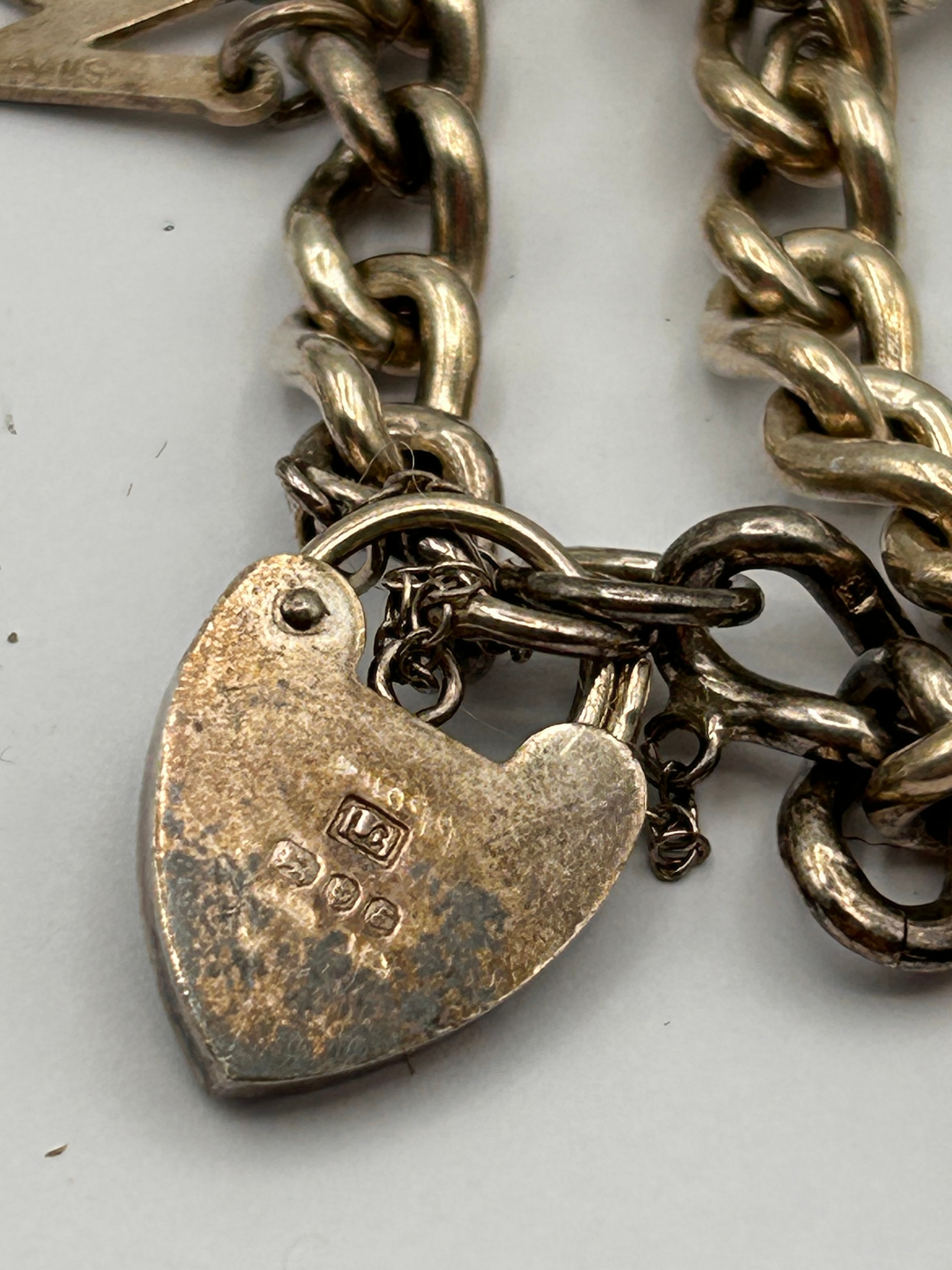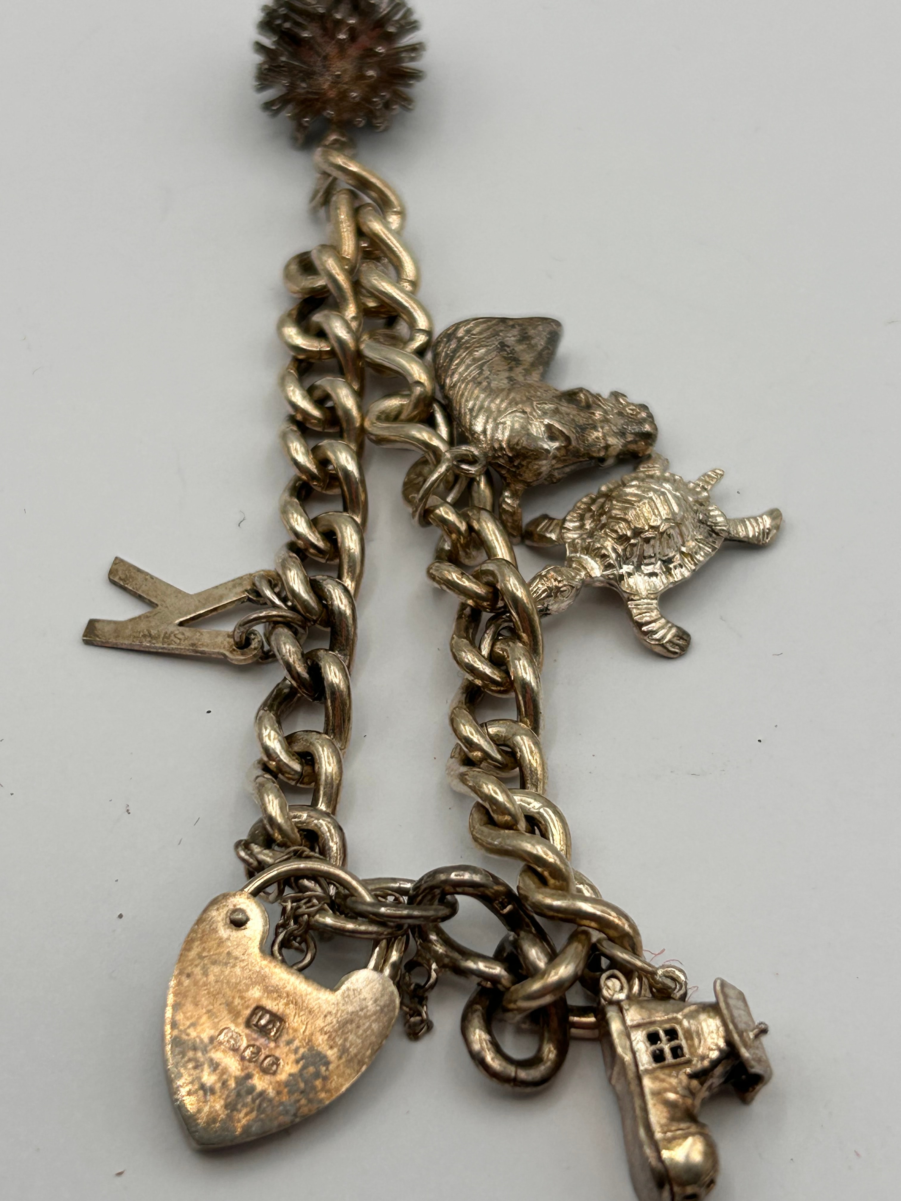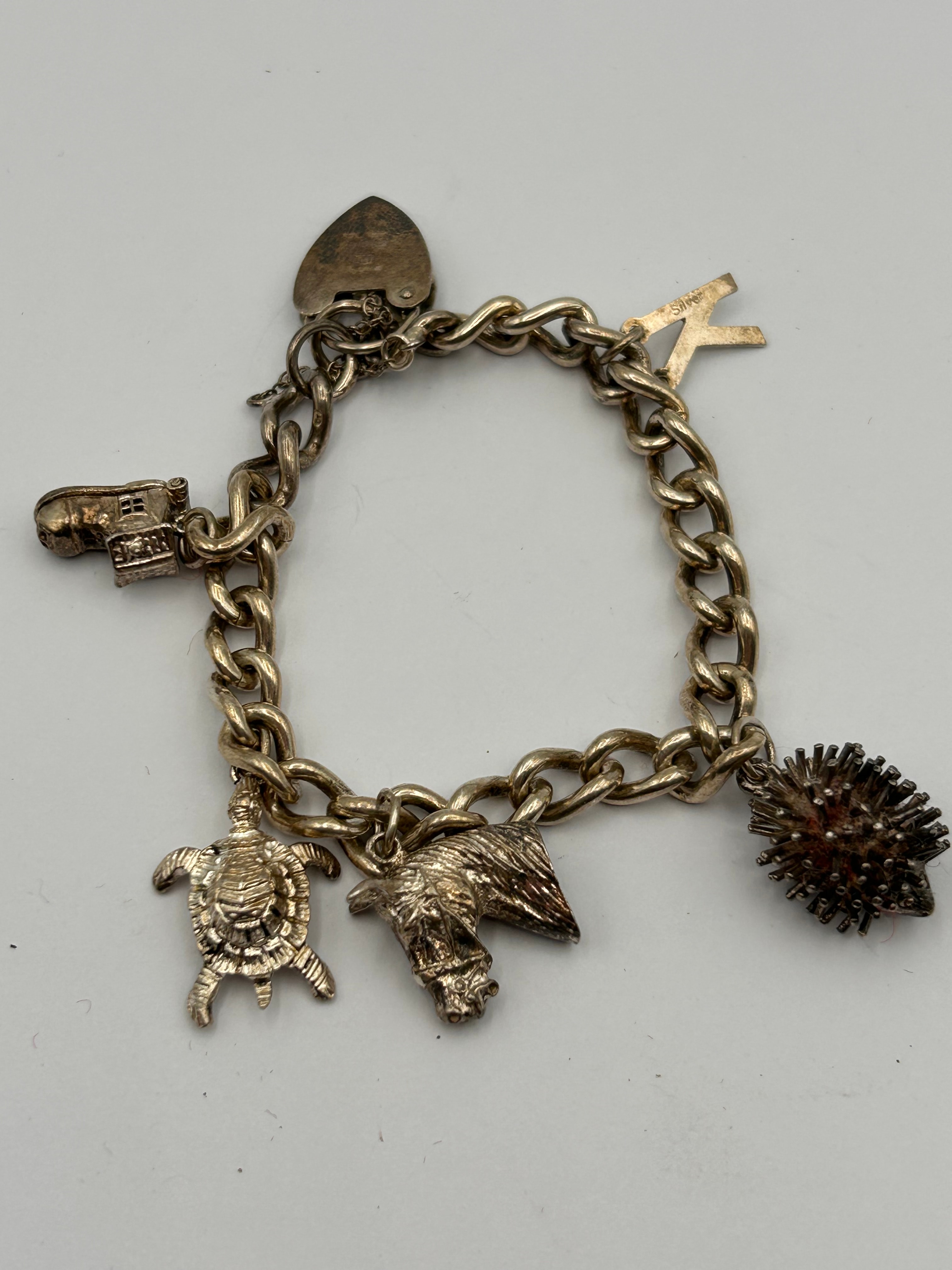 A vintage sterling silver charm bracelet featuring a heavy curb chain secured by a heart-shaped padlock clasp. Six individual charms are suspended from the bracelet, including a miniature revolver or gun engraved ‘SHAMUS’, a stylized initial ‘K’, a detailed turtle, a boar’s head, a spiky spherical object, and a small house-shaped charm. The heart clasp bears the maker’s mark ‘L&S’ within a rectangular cartouche, a lion passant (the standard mark for sterling silver in England), an anchor (indicating the Birmingham assay office), and the lowercase date letter ‘p’. The material is confirmed as 925 sterling silver.