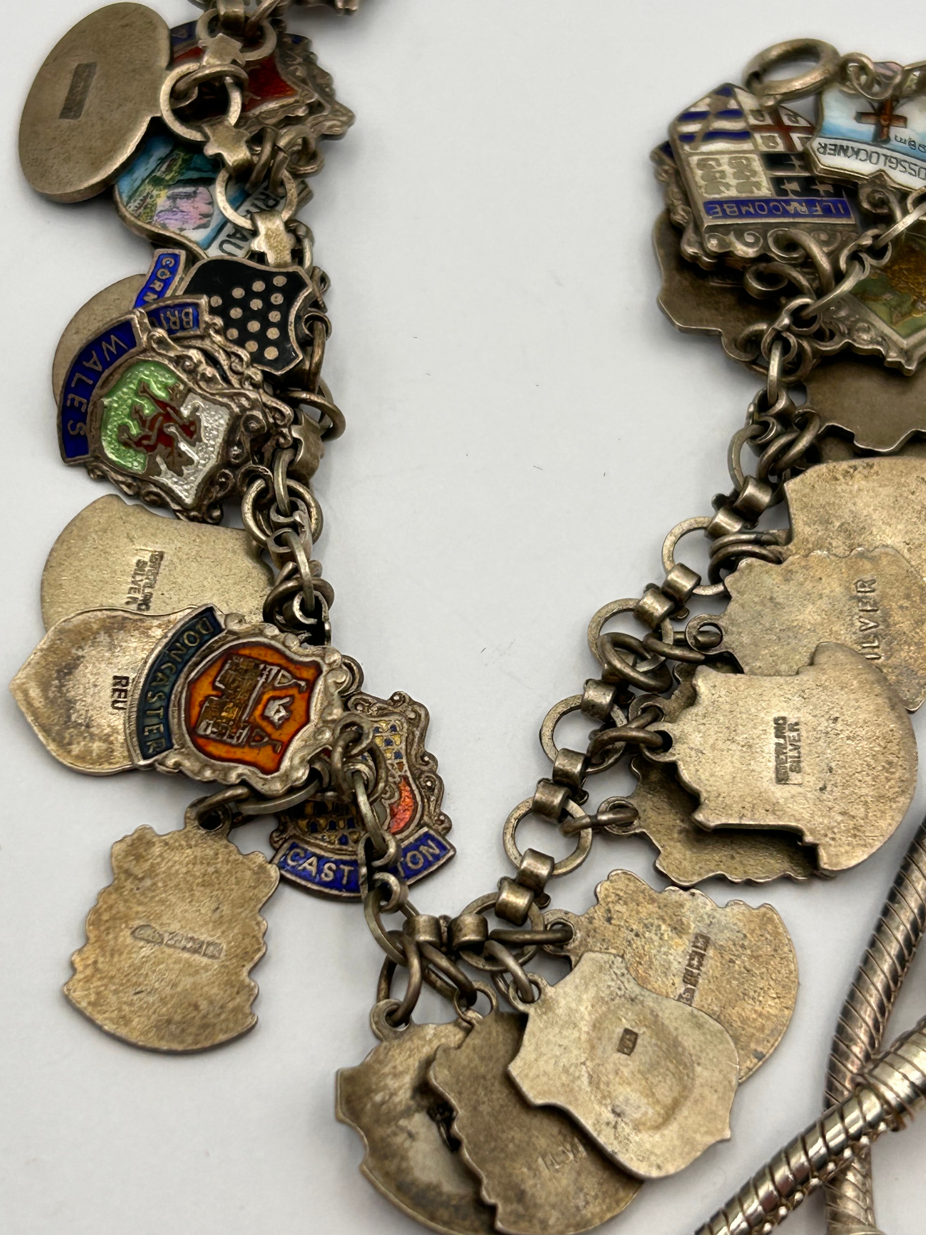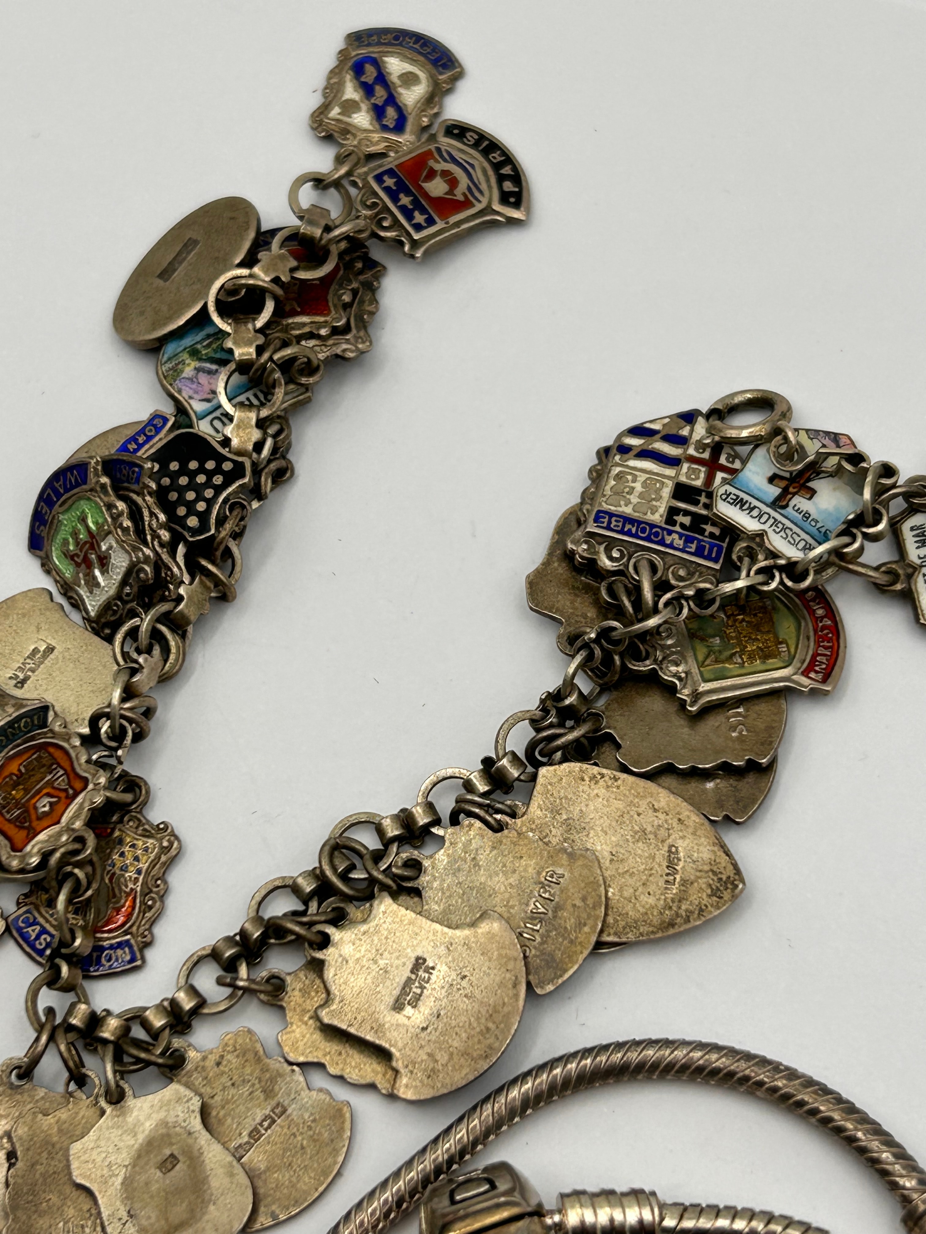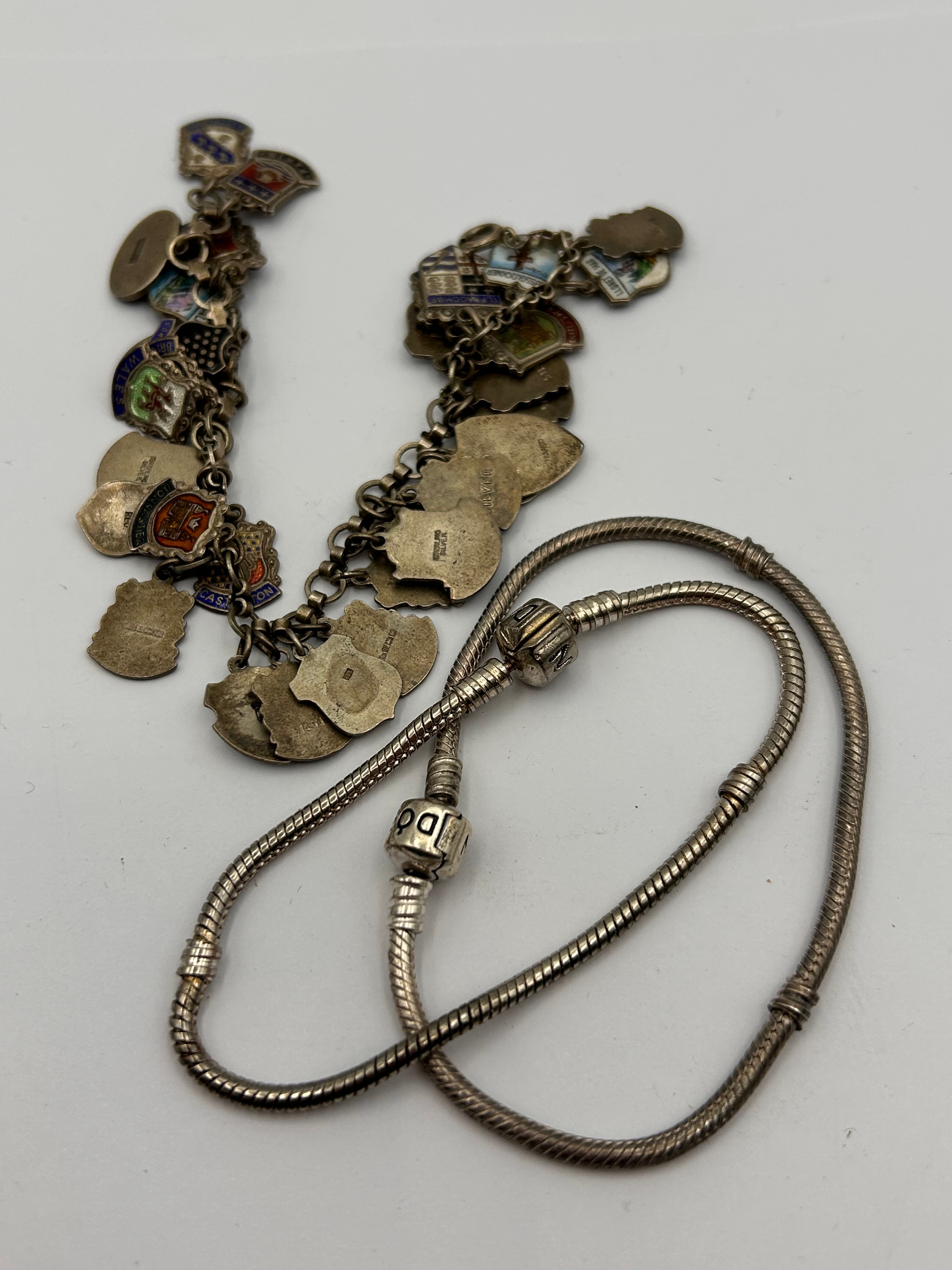 A Pandora sterling silver barrel clasp snake chain bracelet, featuring a decorative, textured bead and a clasp marked ‘DO’. Accompanied by a sterling silver charm bracelet adorned with a multitude of small, mostly shield-shaped souvenir charms. Many charms are vibrantly enameled with heraldic crests or place names including ‘DUSSELDORF,’ ‘ILFRACOMBE,’ ‘PARIS,’ ‘WALES,’ ‘CORNWALL,’ and ‘LONGLEAT.’ Several charms are stamped ‘STERLING SILVER’ or ‘SILVER’ on the reverse.