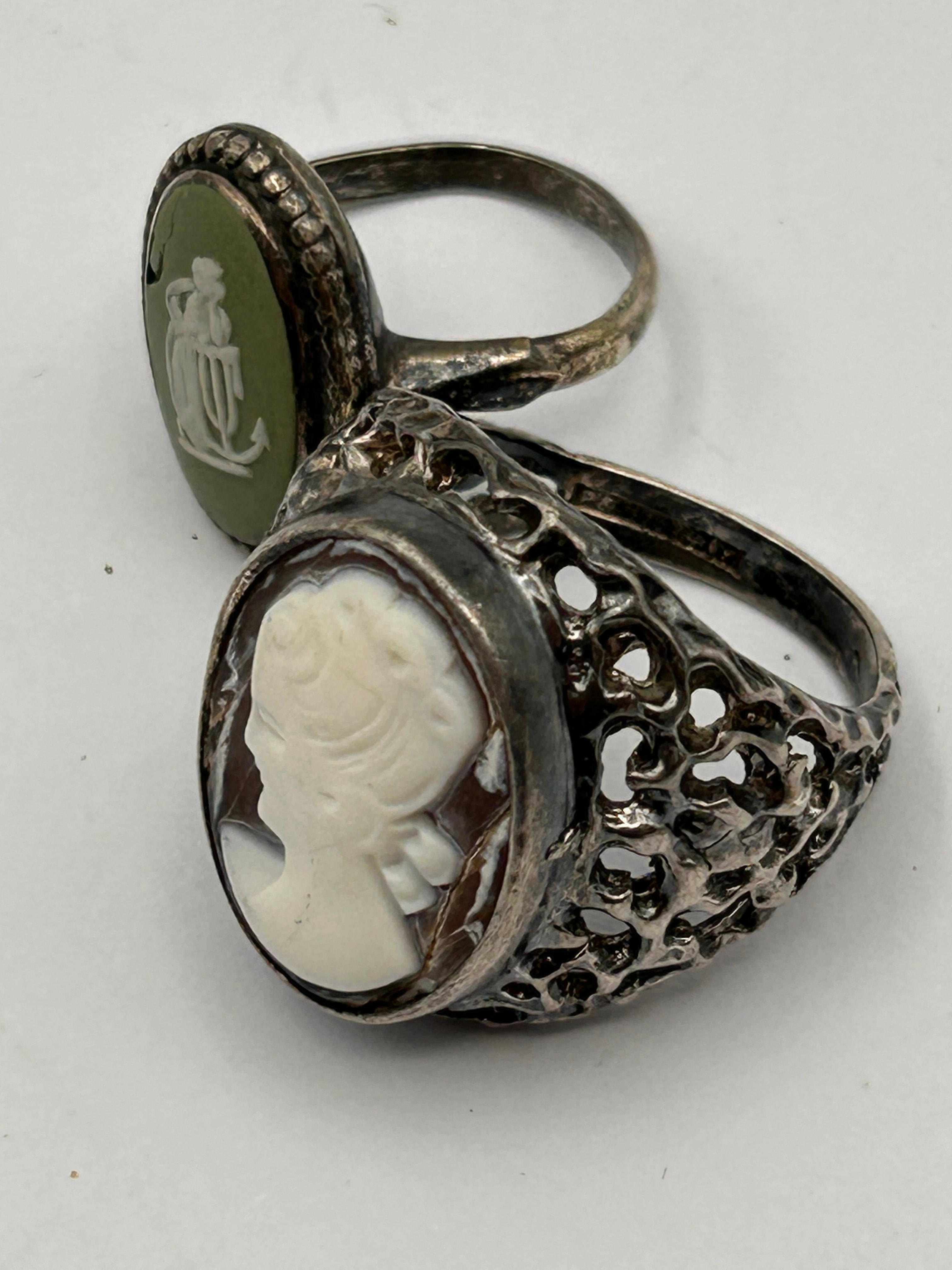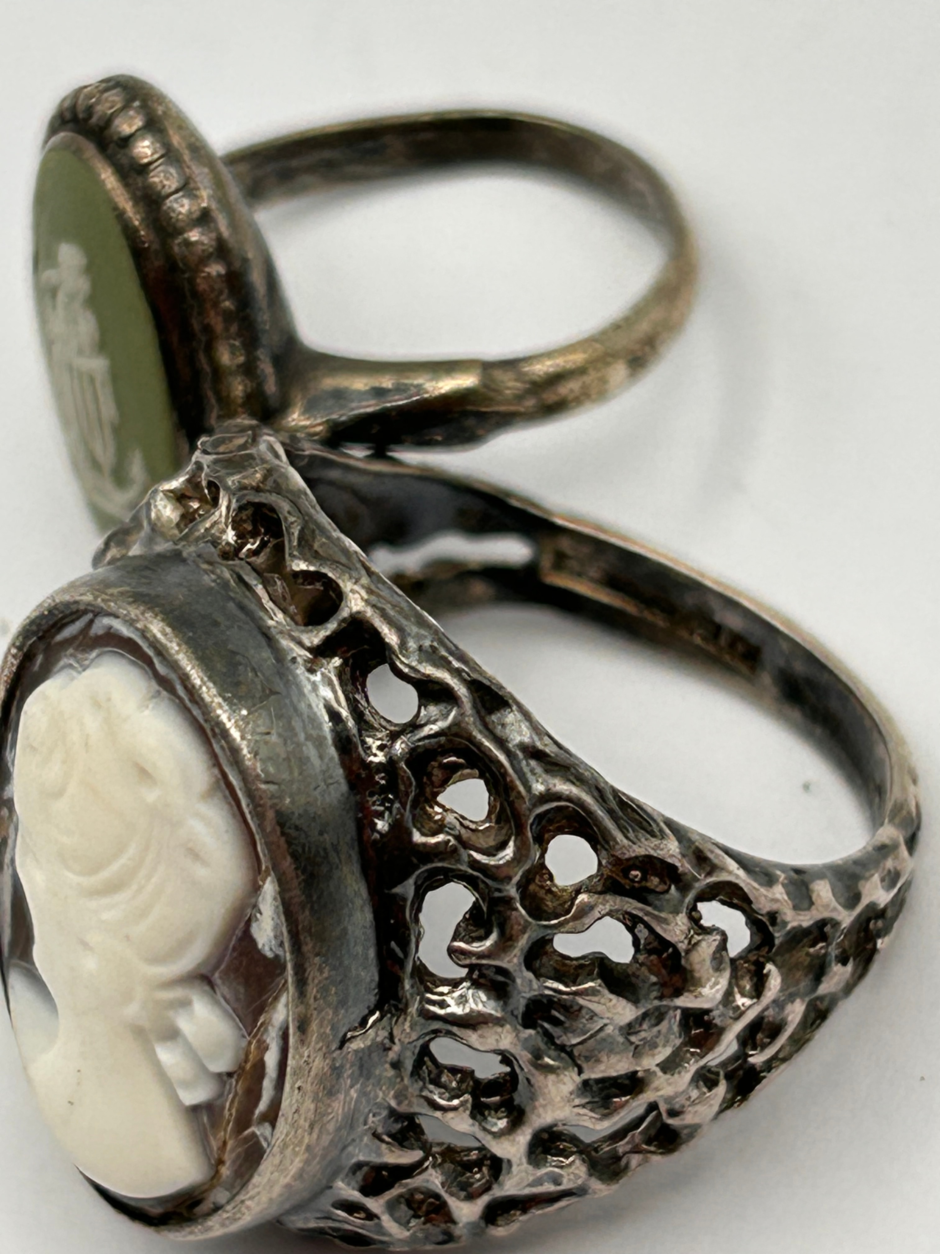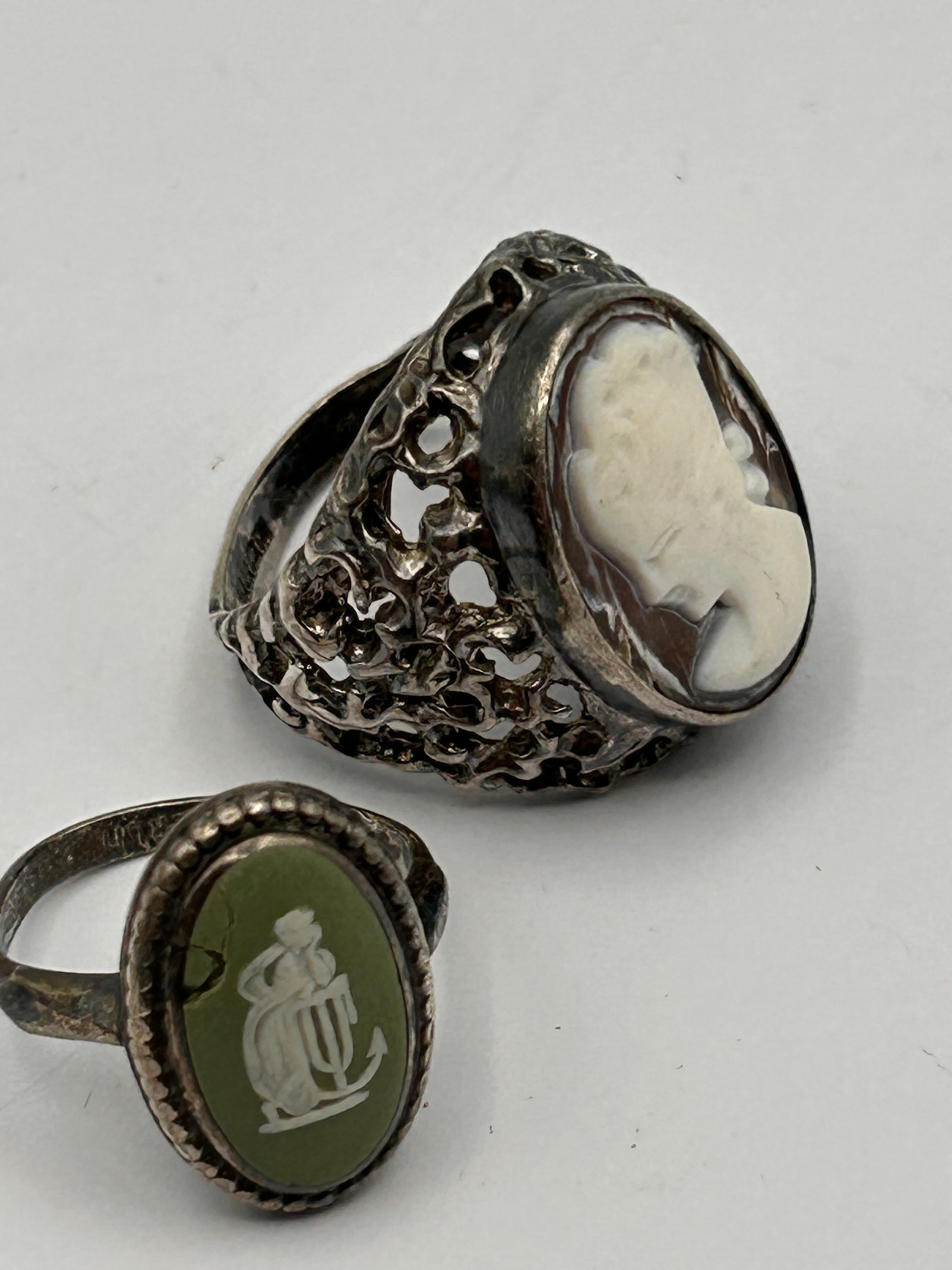 This lot comprises two cameo rings. The larger ring features an oval white cameo, appearing to be carved shell or resin, depicting a female profile in relief, set in a silver-toned metal band with an intricate openwork or filigree design. The inside of this band is marked “925.” The smaller ring has a simpler silver-toned metal band and holds an oval green cameo with a white relief depicting a classical allegorical figure holding an anchor and what appears to be a rudder or oar, consistent with a Jasperware-style ceramic or glass.
