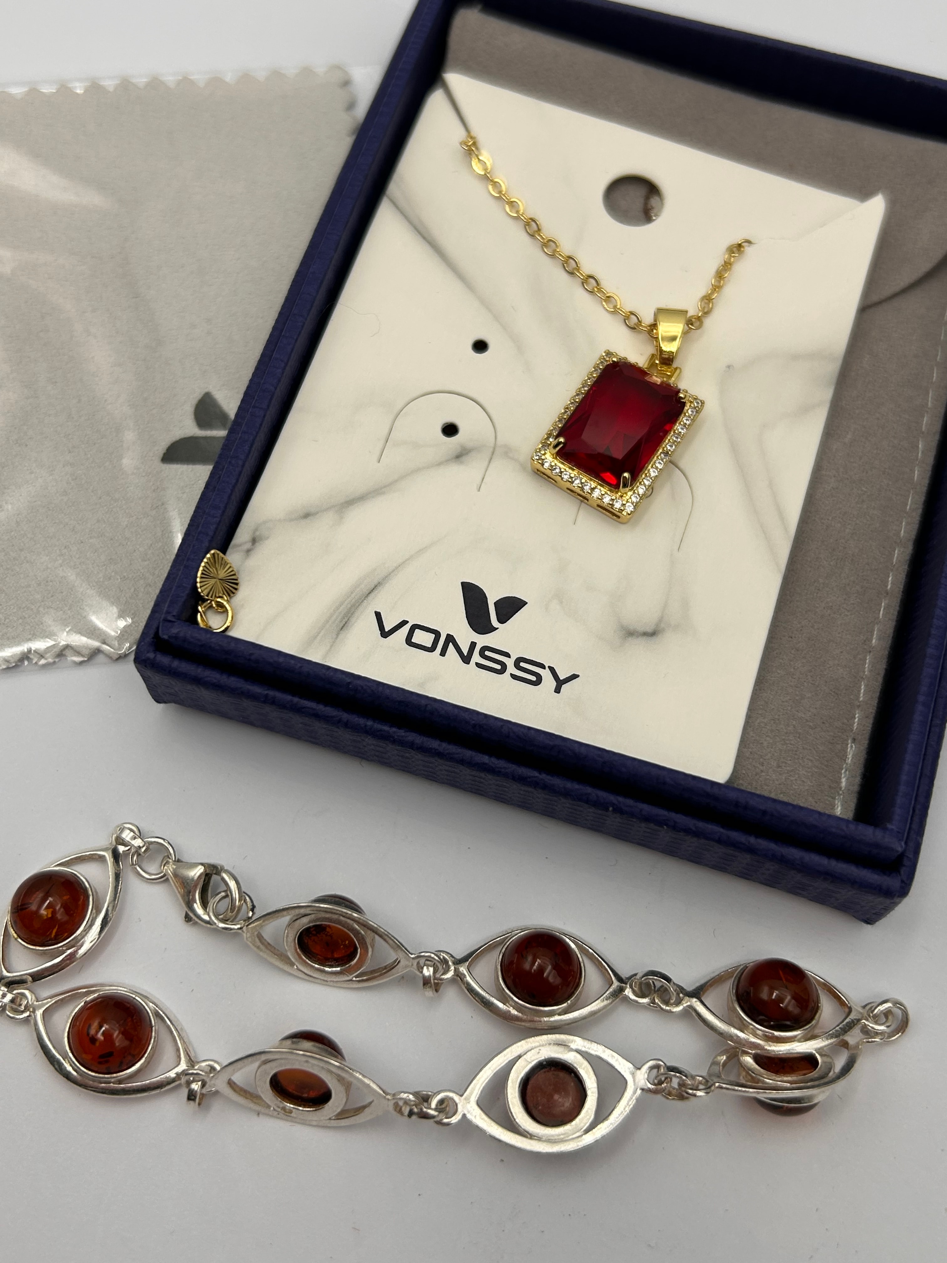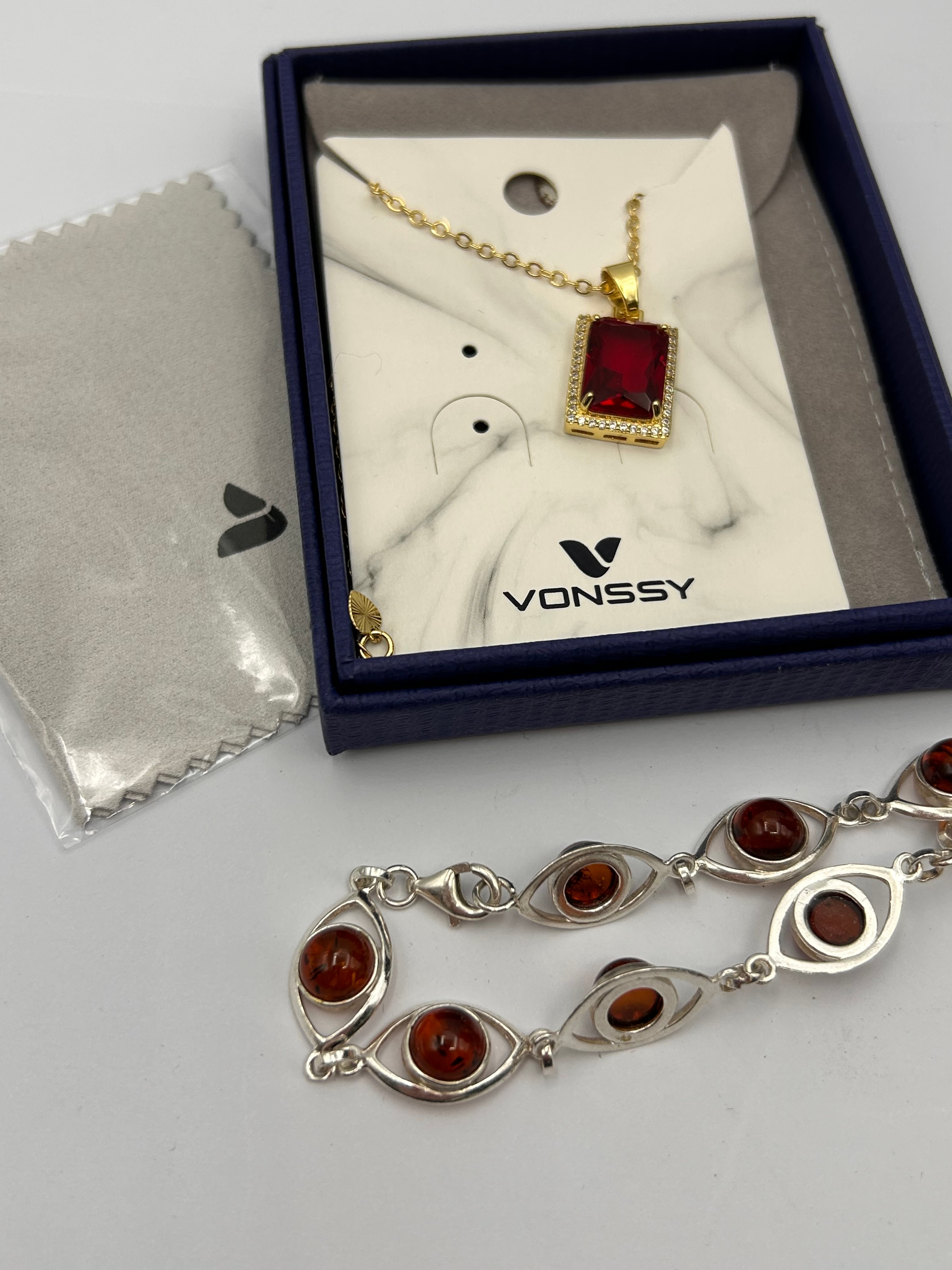 A contemporary jewelry ensemble, comprising a gold-tone metal pendant necklace and a silver-tone metal link bracelet. The necklace features a rectangular red stone, possibly a synthetic ruby or glass, bordered by a single row of small clear stones (likely simulants), suspended from a delicate chain. This necklace is displayed on a card marked “VONSSY” with a stylized ‘V’ logo, and is nested in a navy blue presentation box with a grey fabric interior. The silver-tone metal link bracelet features each link designed as an eye shape containing a rounded, amber-colored cabochon stone, secured with a lobster clasp. An accompanying grey fabric polishing cloth with the “VONSSY” logo is also included.
