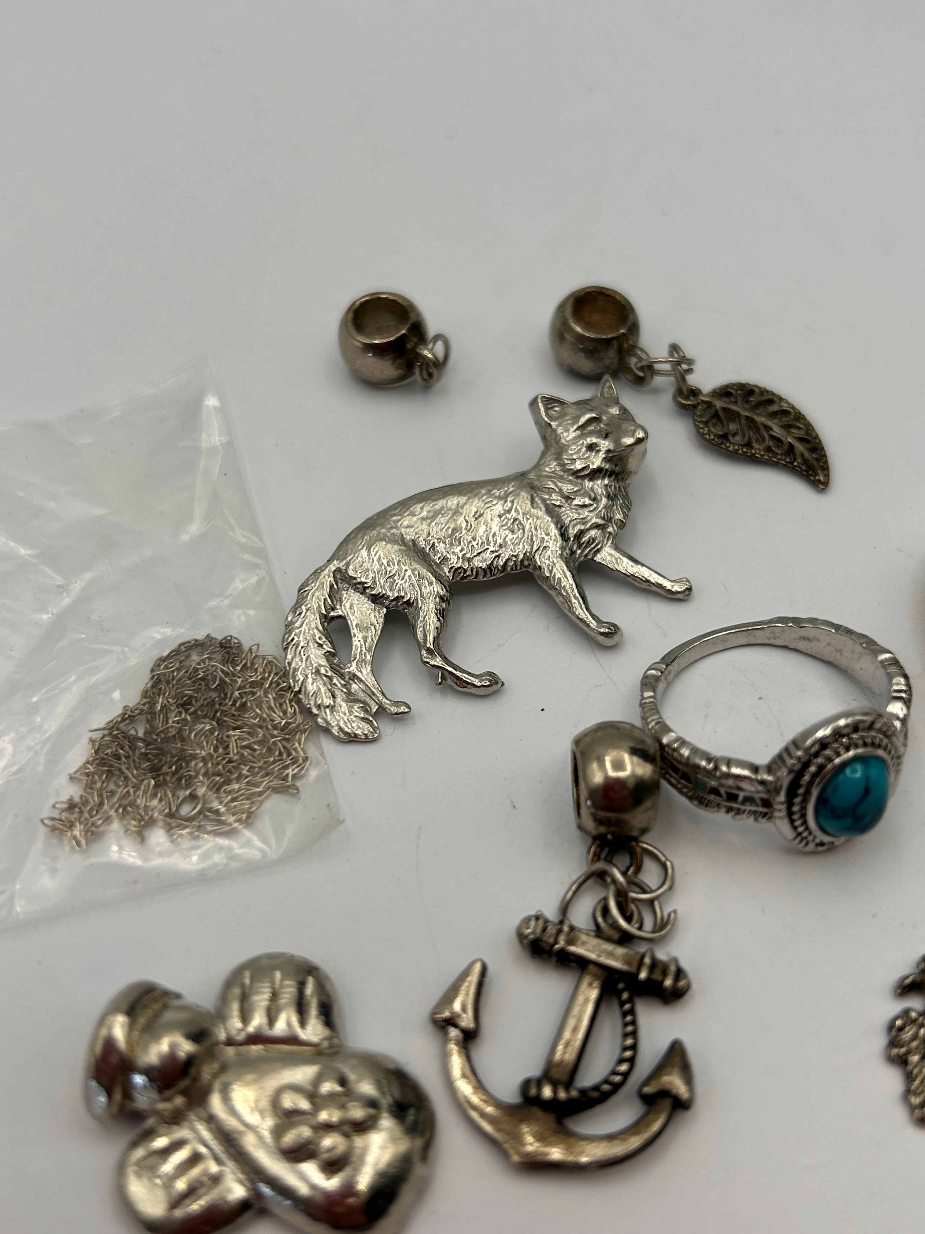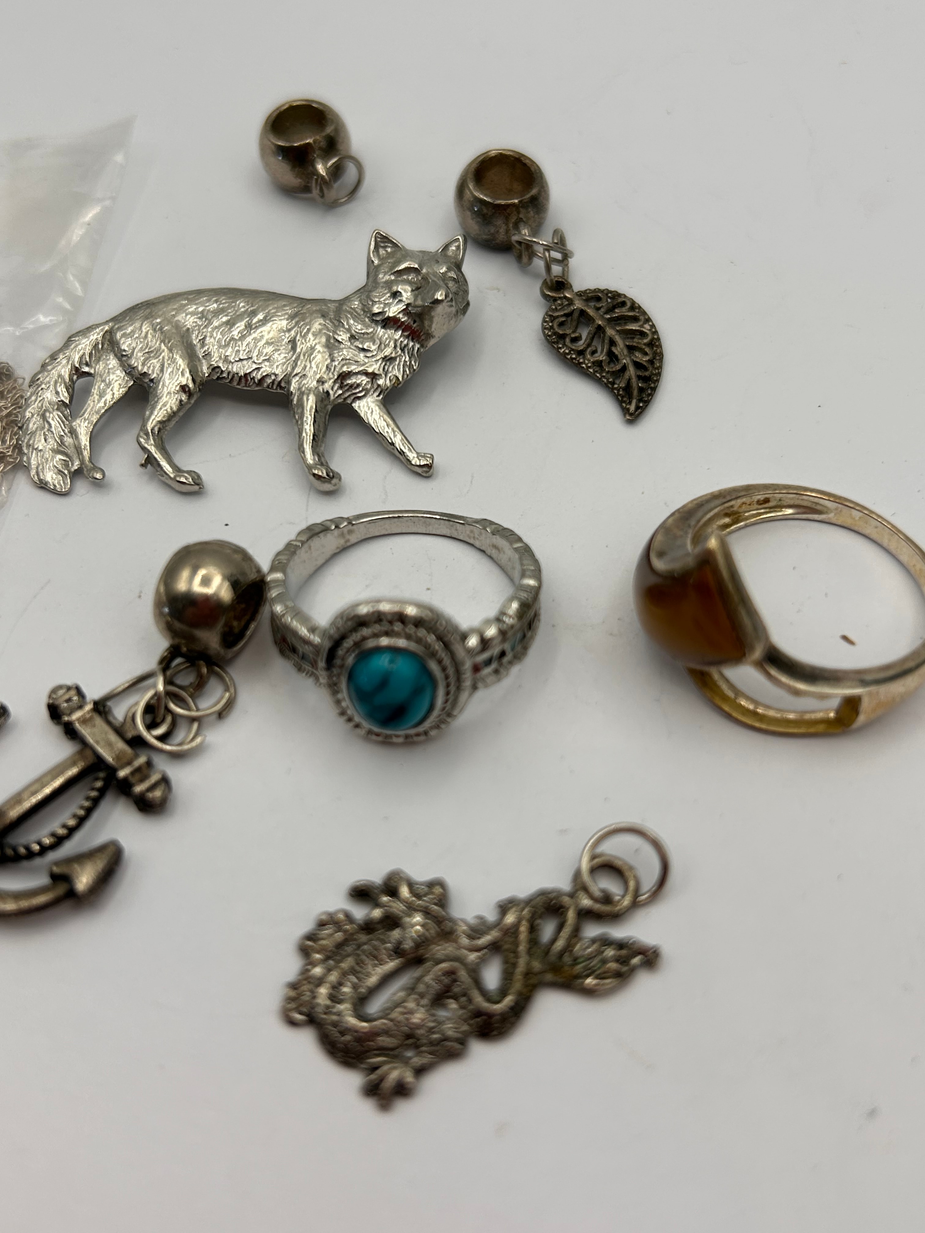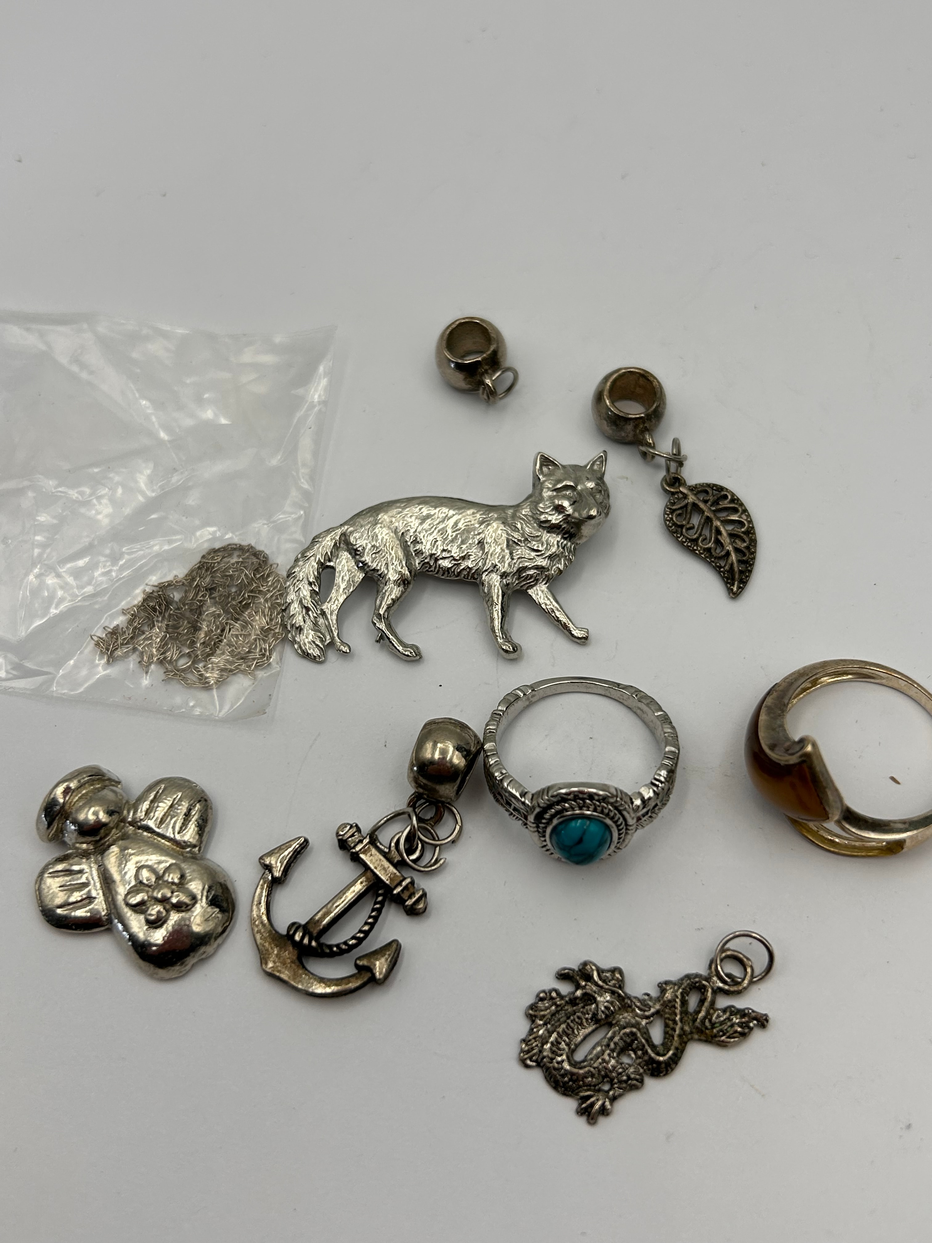 This lot presents a collection of ten silver-toned jewelry items. The assortment includes several figural charms, such as a detailed fox, an anchor, a dragon, a leaf, and a floral-embossed heart. Also present are two barrel-shaped beads, one of which is accompanied by a small dangling leaf charm. The collection further includes two rings: one set with a round, cabochon-cut turquoise stone in a decorative band, and another featuring an oval, amber-toned cabochon. A small chain is included in a plastic bag. All items are crafted from a silver-toned metal.