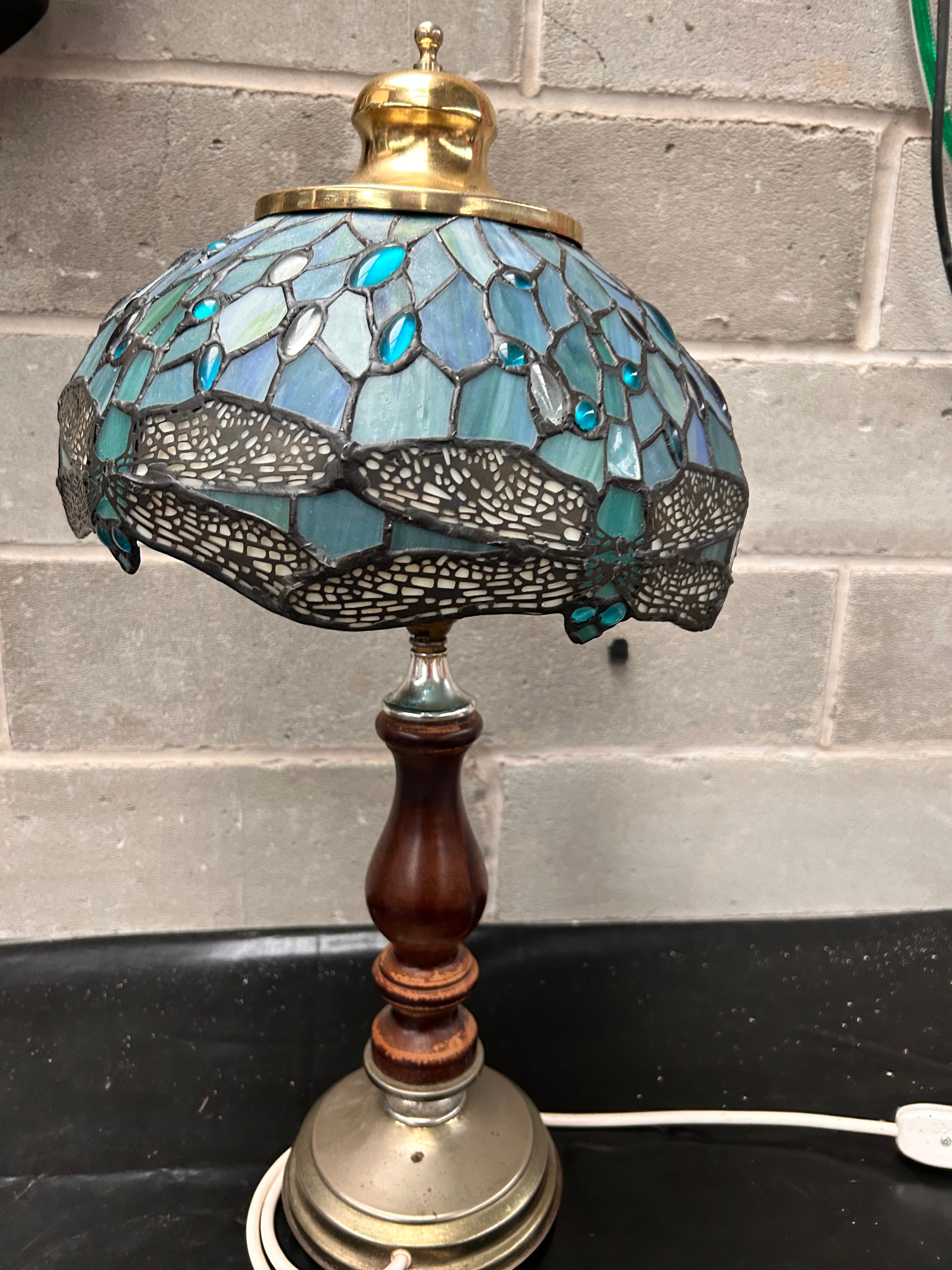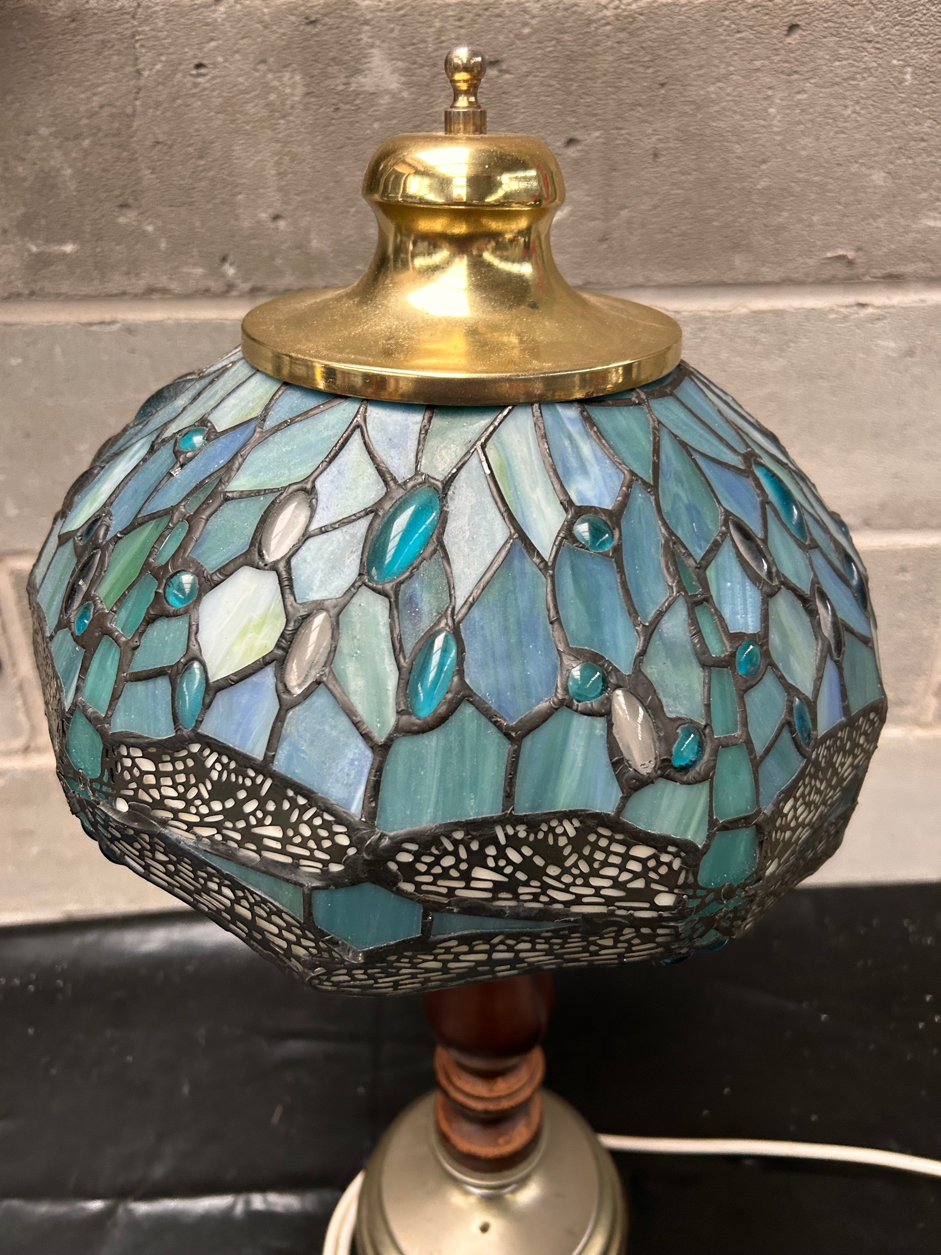 A Tiffany-style table lamp, featuring a domed leaded stained glass shade. The shade is predominantly composed of various shades of blue, turquoise, green, and white/grey glass pieces, some being larger, brighter blue cabochon-like inserts, set in a geometric pattern. The lower perimeter of the shade is adorned with a repeating dragonfly motif, depicting detailed wings. The lamp’s base features a dark-stained wooden central column, flanked by brass-tone metal sections, transitioning to a wider, silver-tone or nickel-plated metal circular foot. A gold-tone finial secures the shade at the top. It features a modern white electrical cord with an inline switch.