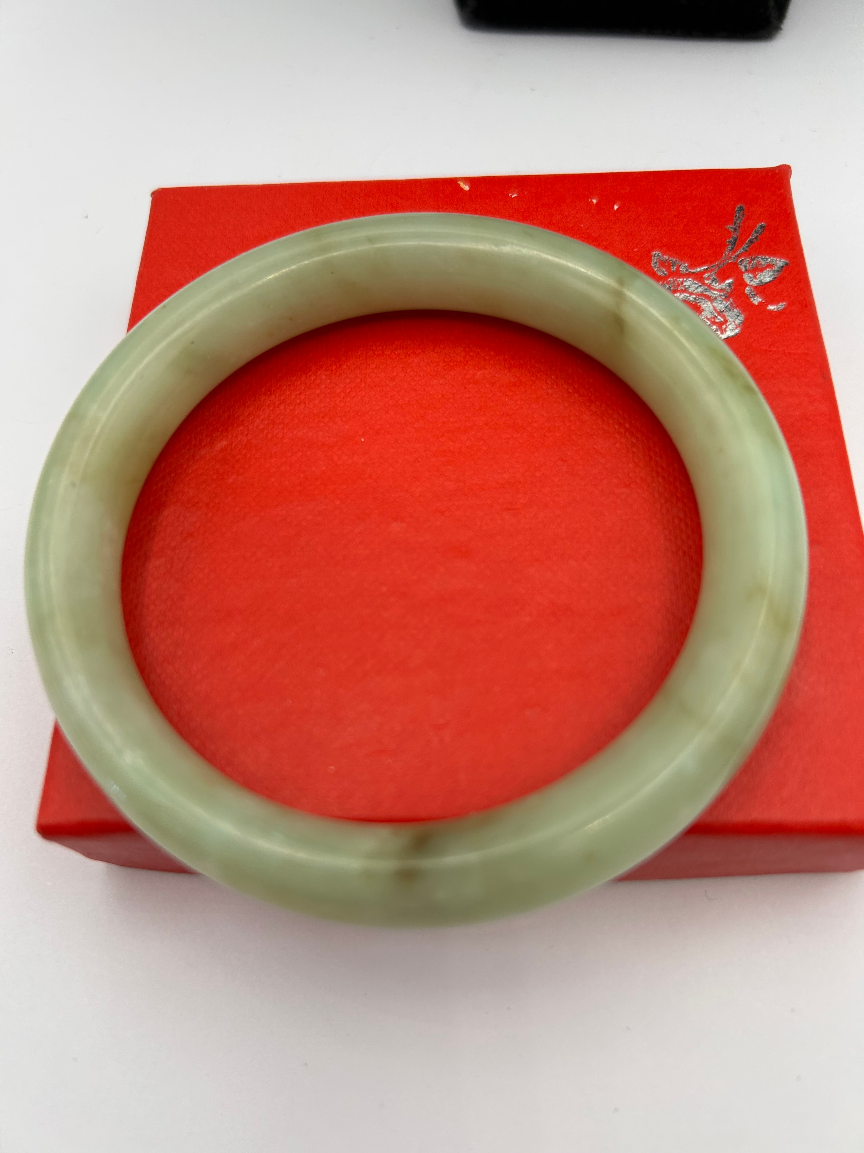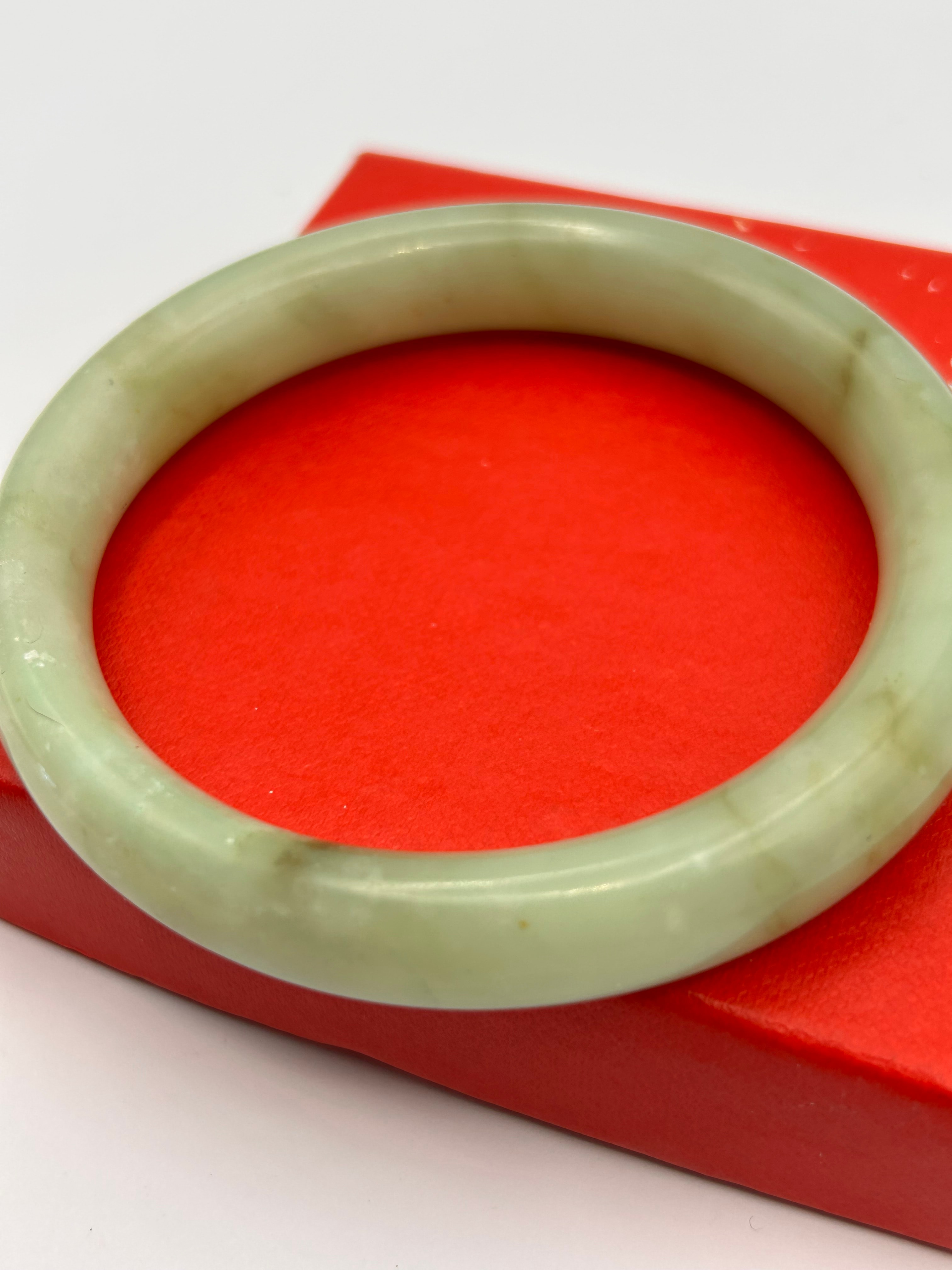 A natural green jadeite bangle bracelet, smooth and circular, crafted from a polished translucent stone. It exhibits a variegated pale green to whitish color with some natural darker inclusions. The bangle itself shows no visible text or markings. It rests on a red hinged box, the lid of which features a silver-colored stylized character in the upper right corner, identified as “福” (fú), meaning “fortune” or “blessing.”