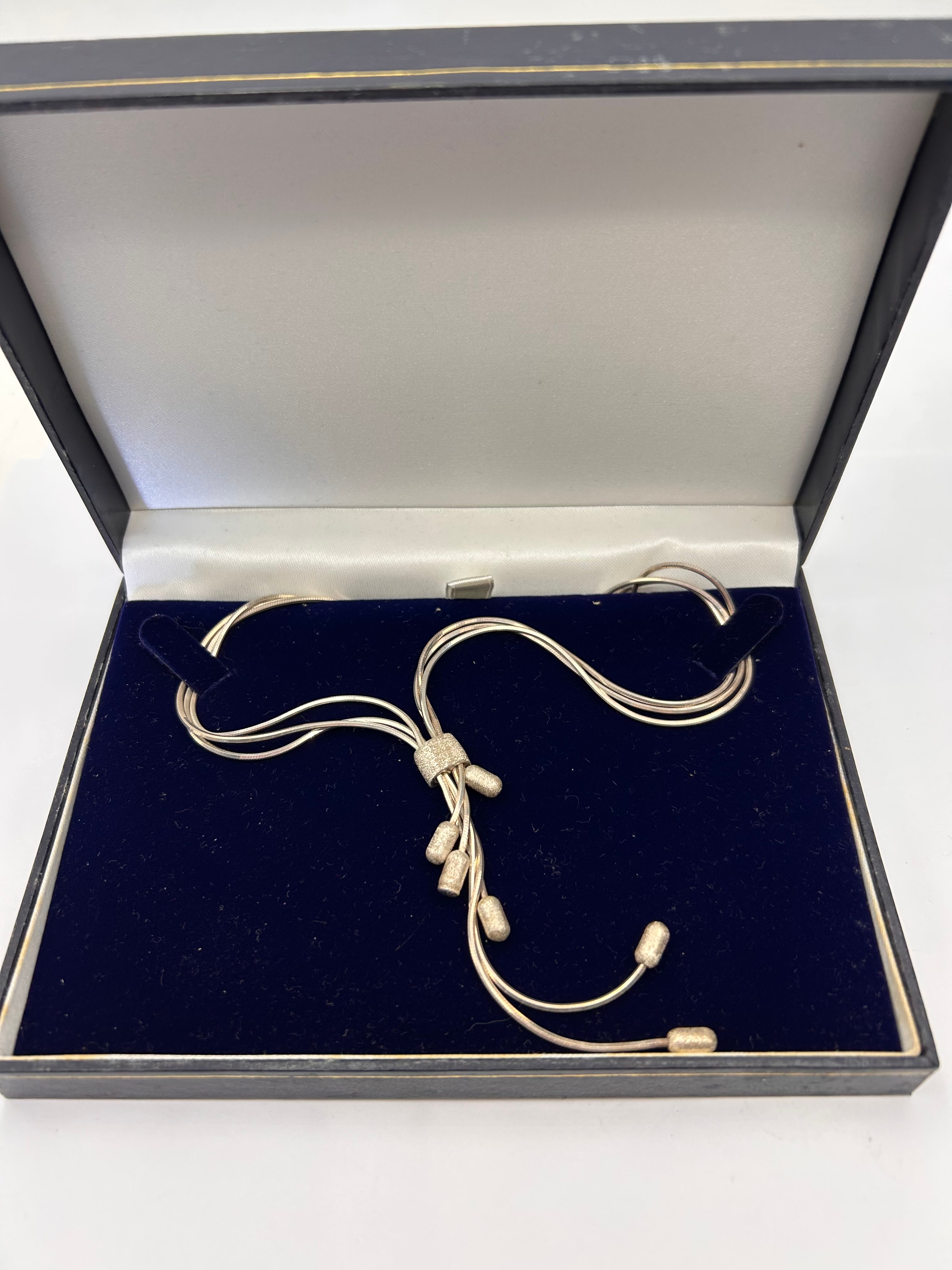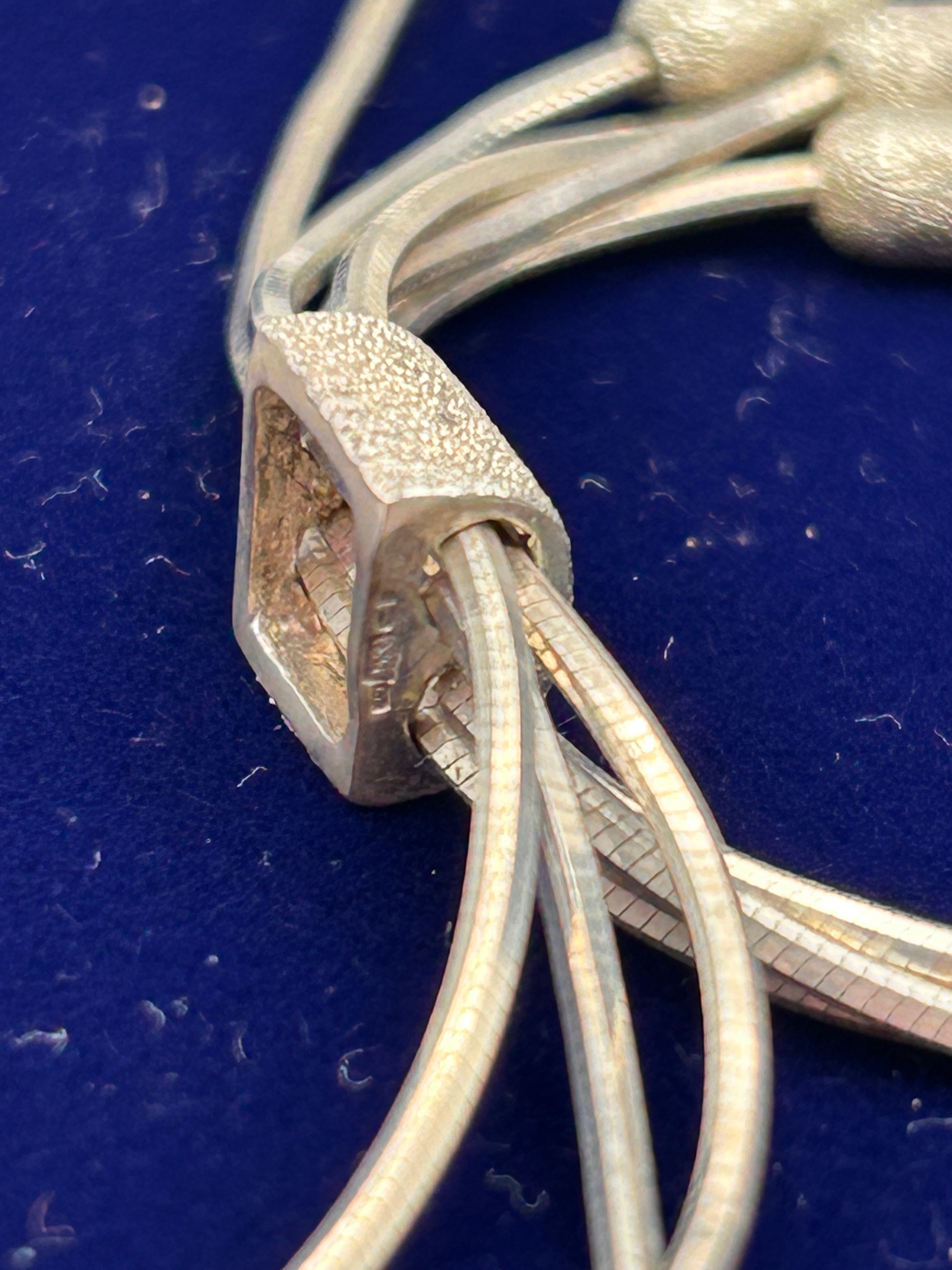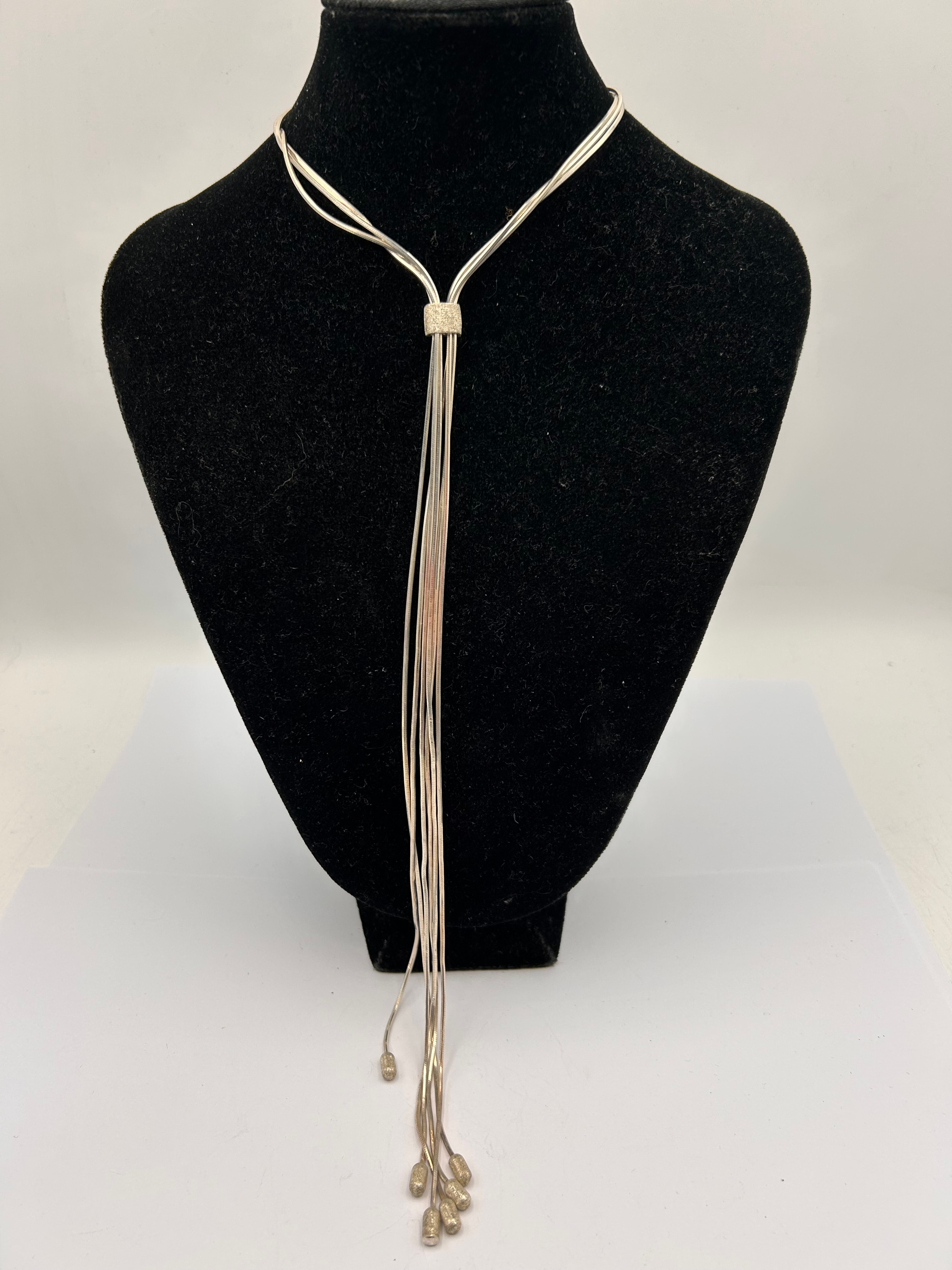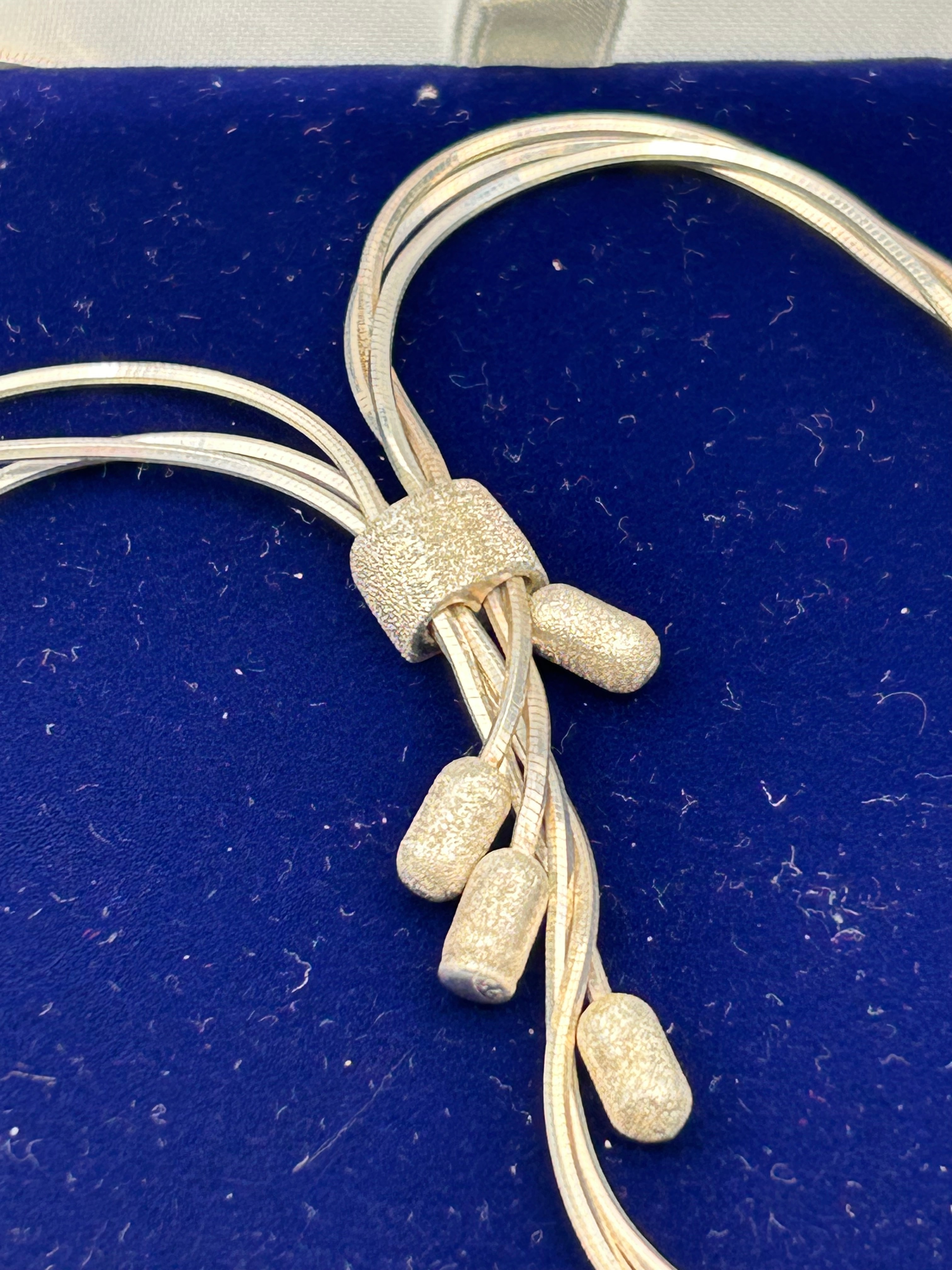 A contemporary multi-strand lariat or Y-style necklace crafted from sterling silver, marked ‘ 925’. The design features several fine snake chains that pass through a textured, rectangular slider. From this slider, additional strands extend downwards, terminating in multiple textured, elongated capsule-shaped drops. The metal throughout exhibits a silver luster, with the slider and drops featuring a granular or sandblasted texture. The necklace is presented within a black hinged presentation box with a blue velvet interior.