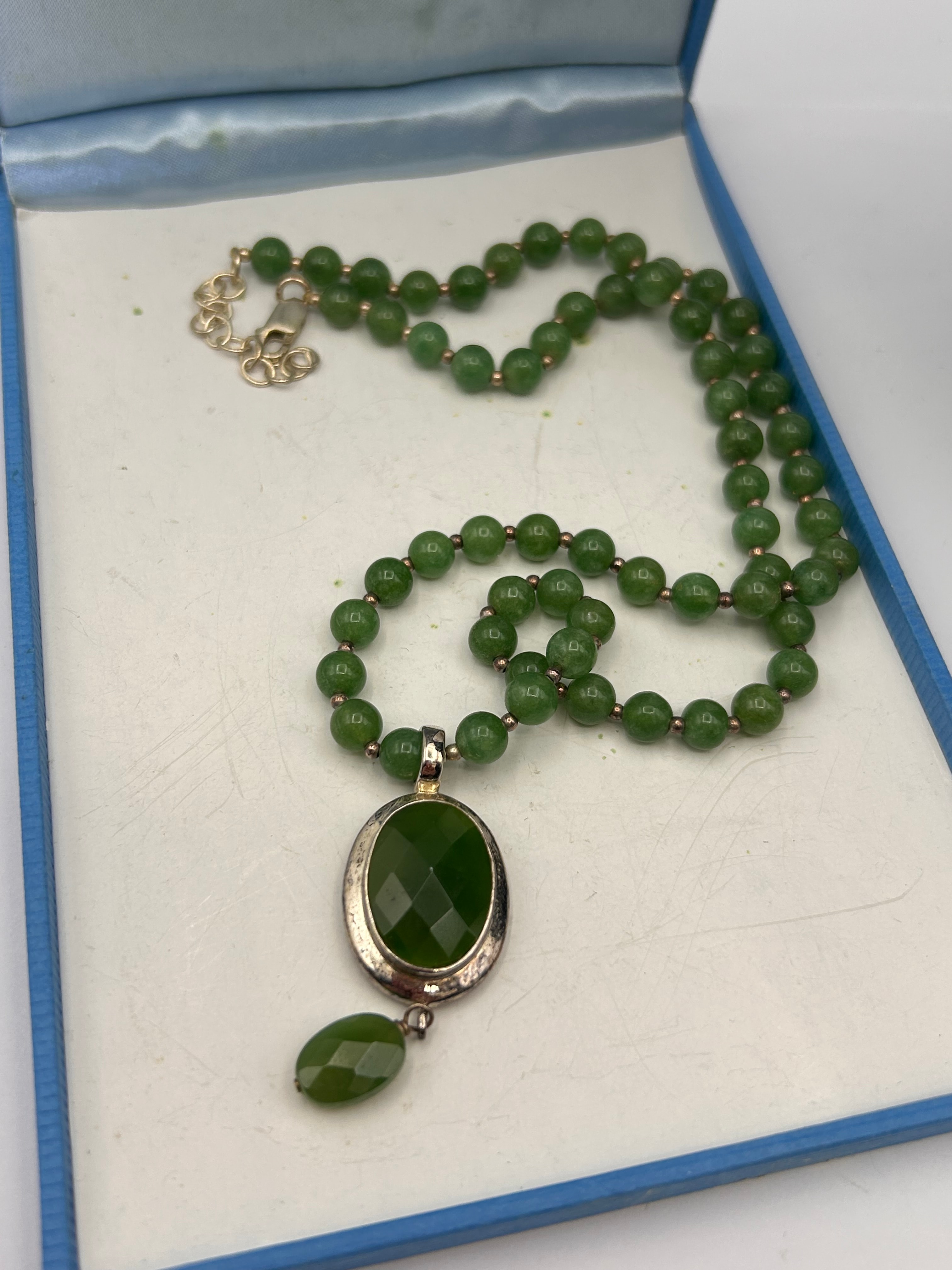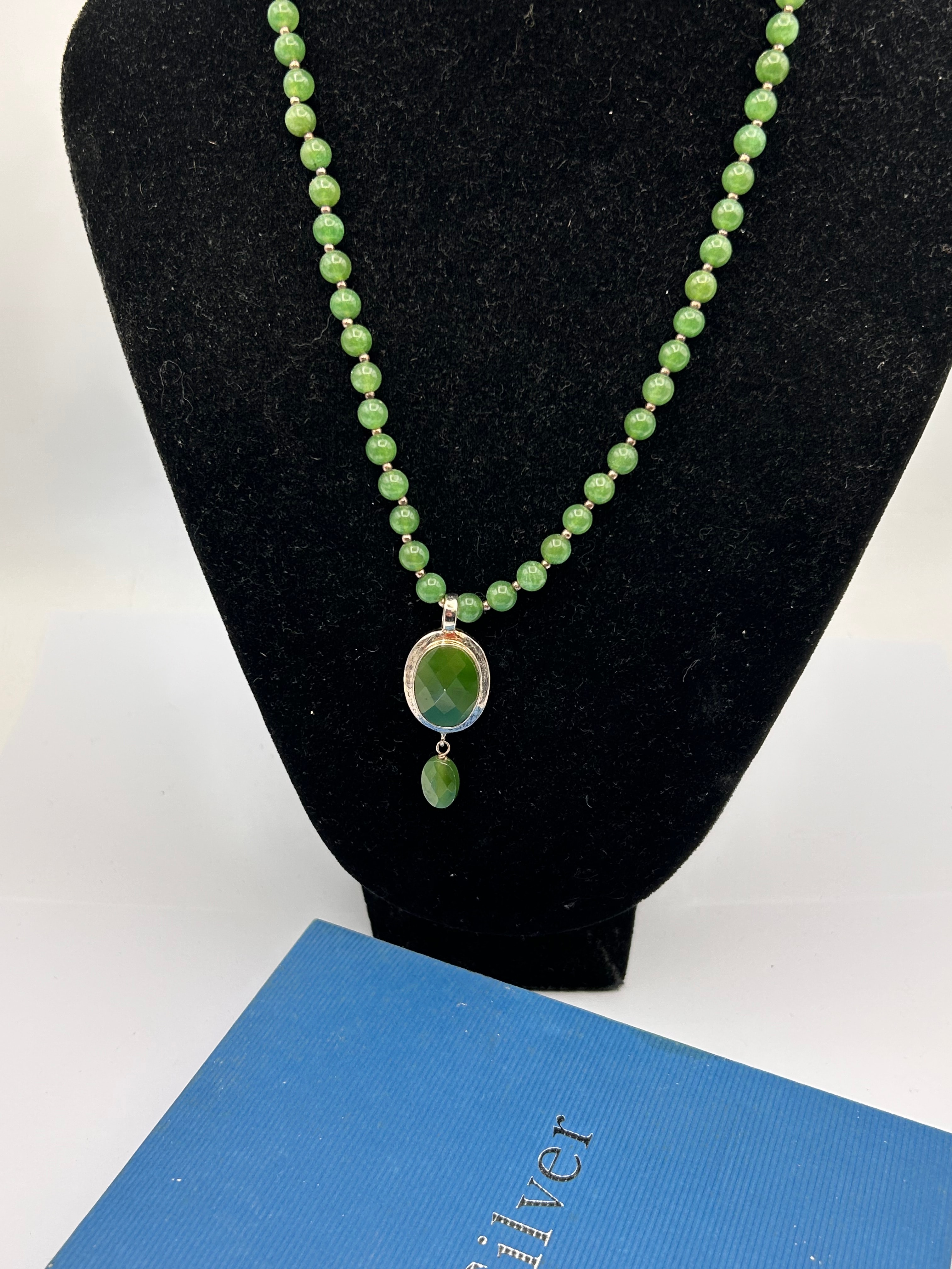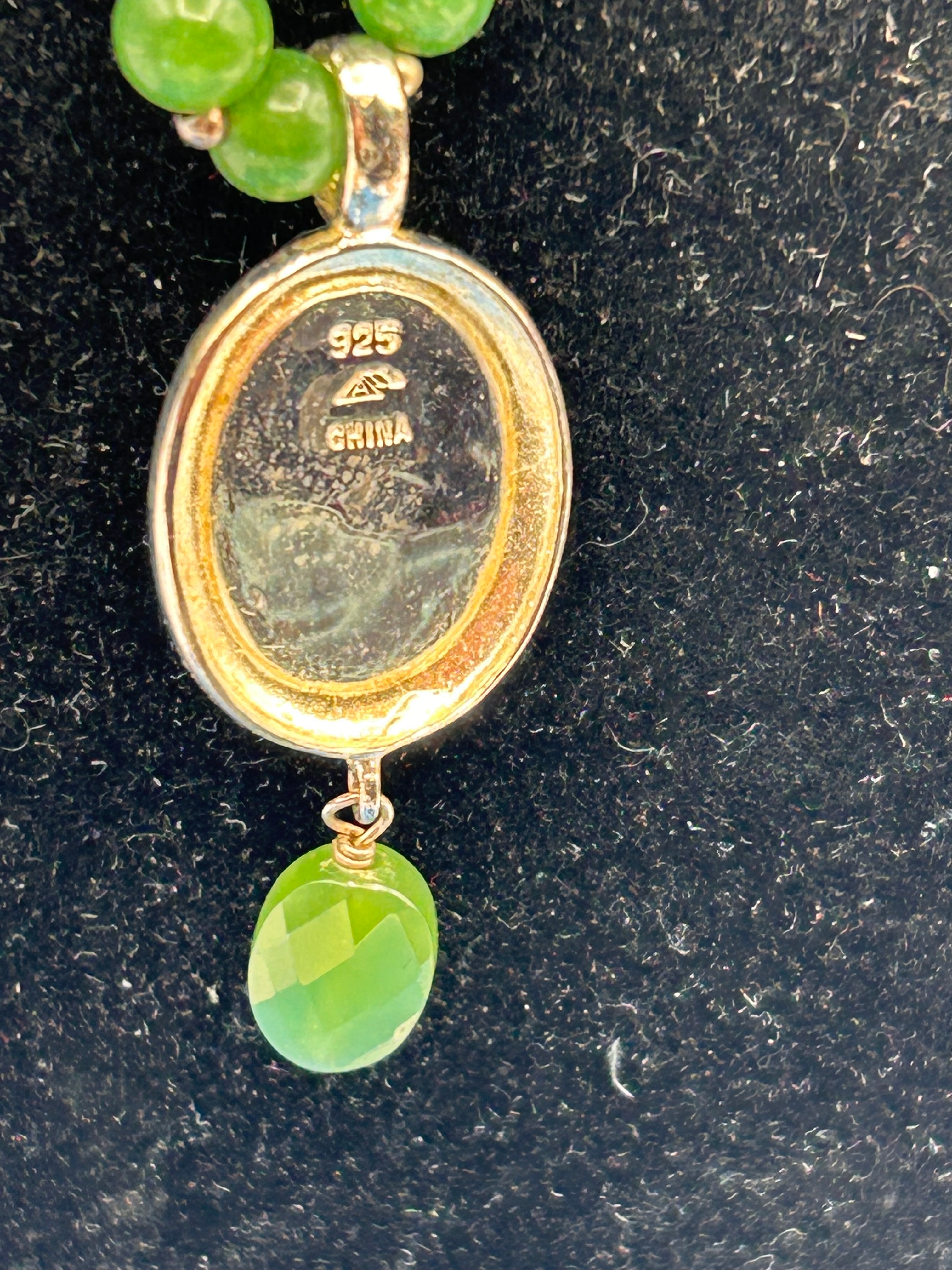 A Nephrite Jade Beaded Necklace, composed of numerous spherical, polished green beads. The necklace features an oval-shaped pendant with a larger faceted green stone set in a silver-toned bezel, from which a smaller faceted green drop bead is suspended. The reverse of the pendant is visibly marked “925” and “CHINA”, indicating the metal is sterling silver and its country of origin.
