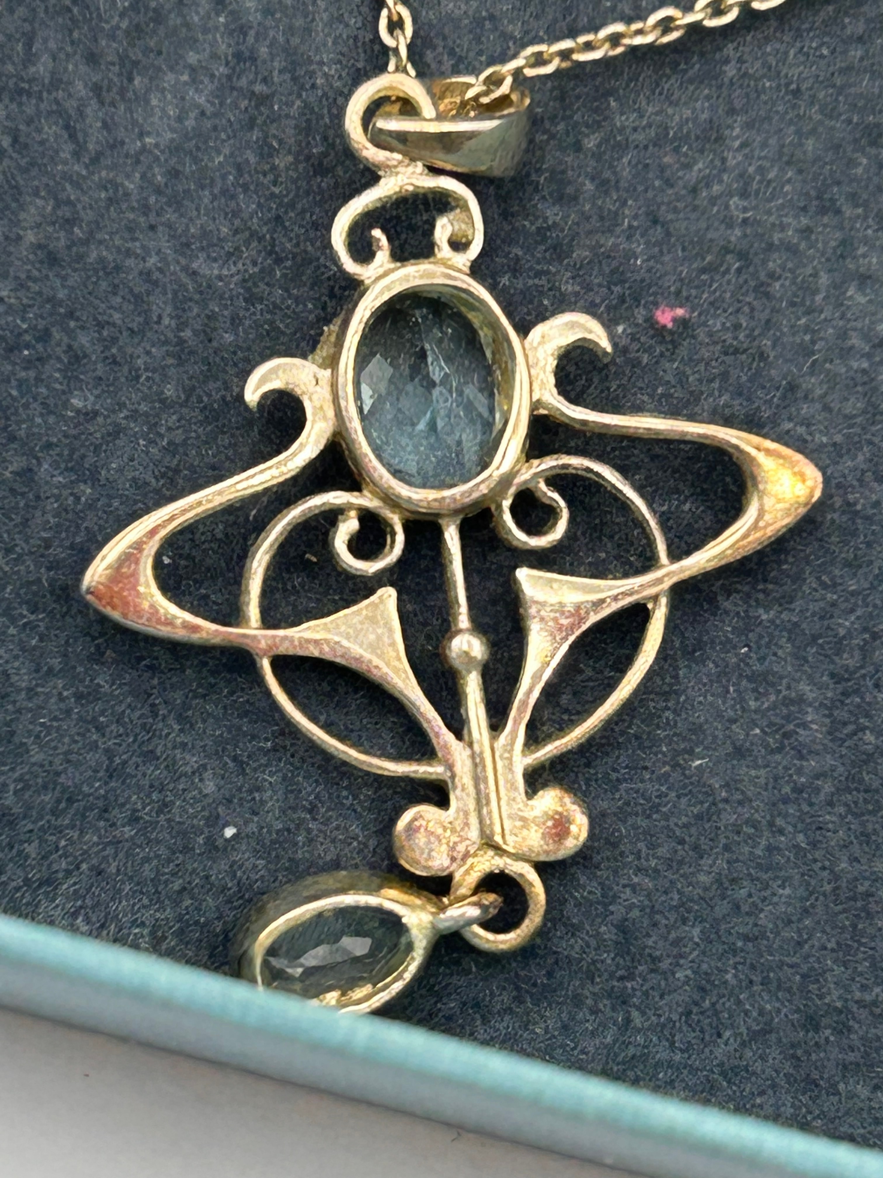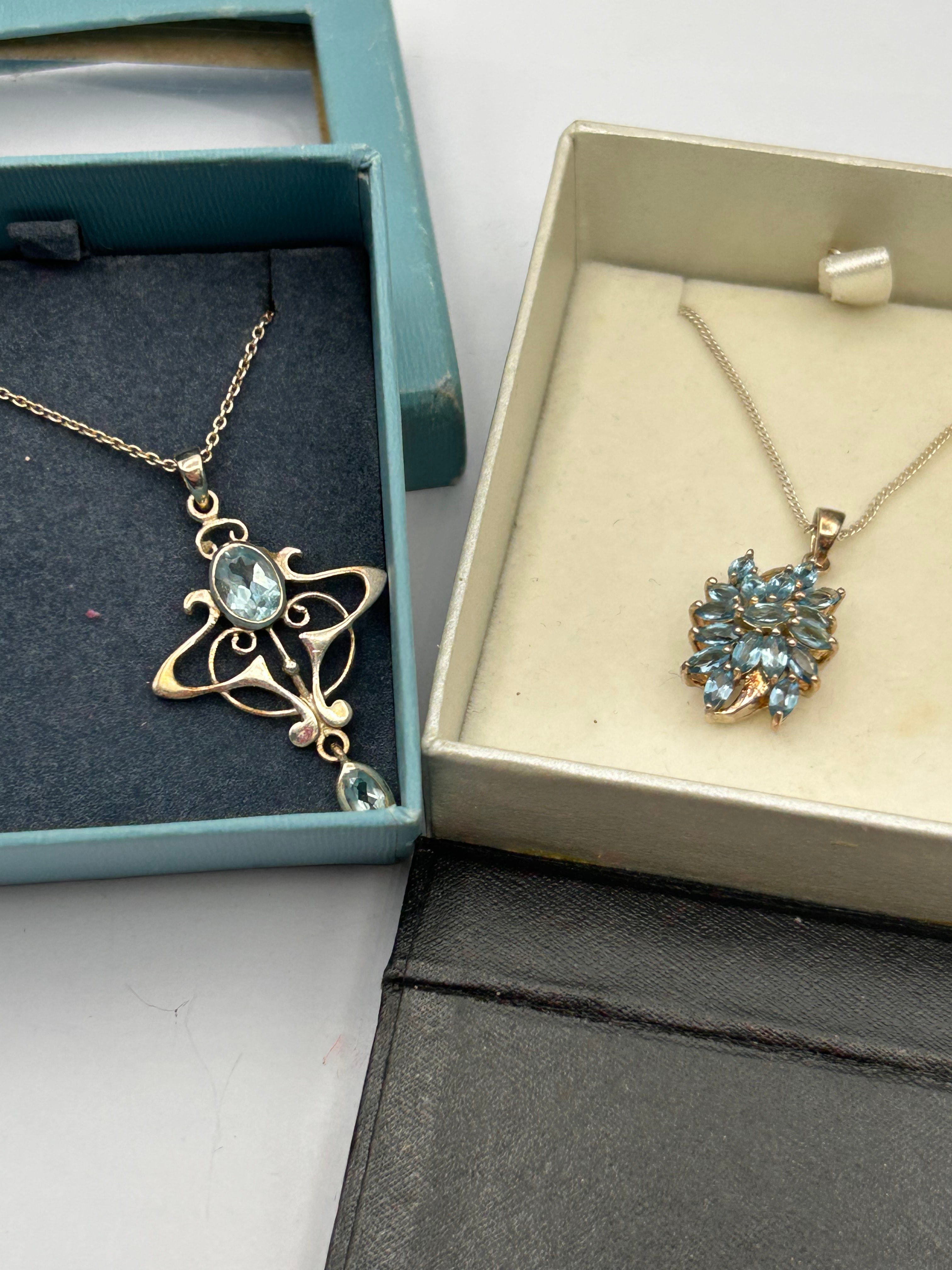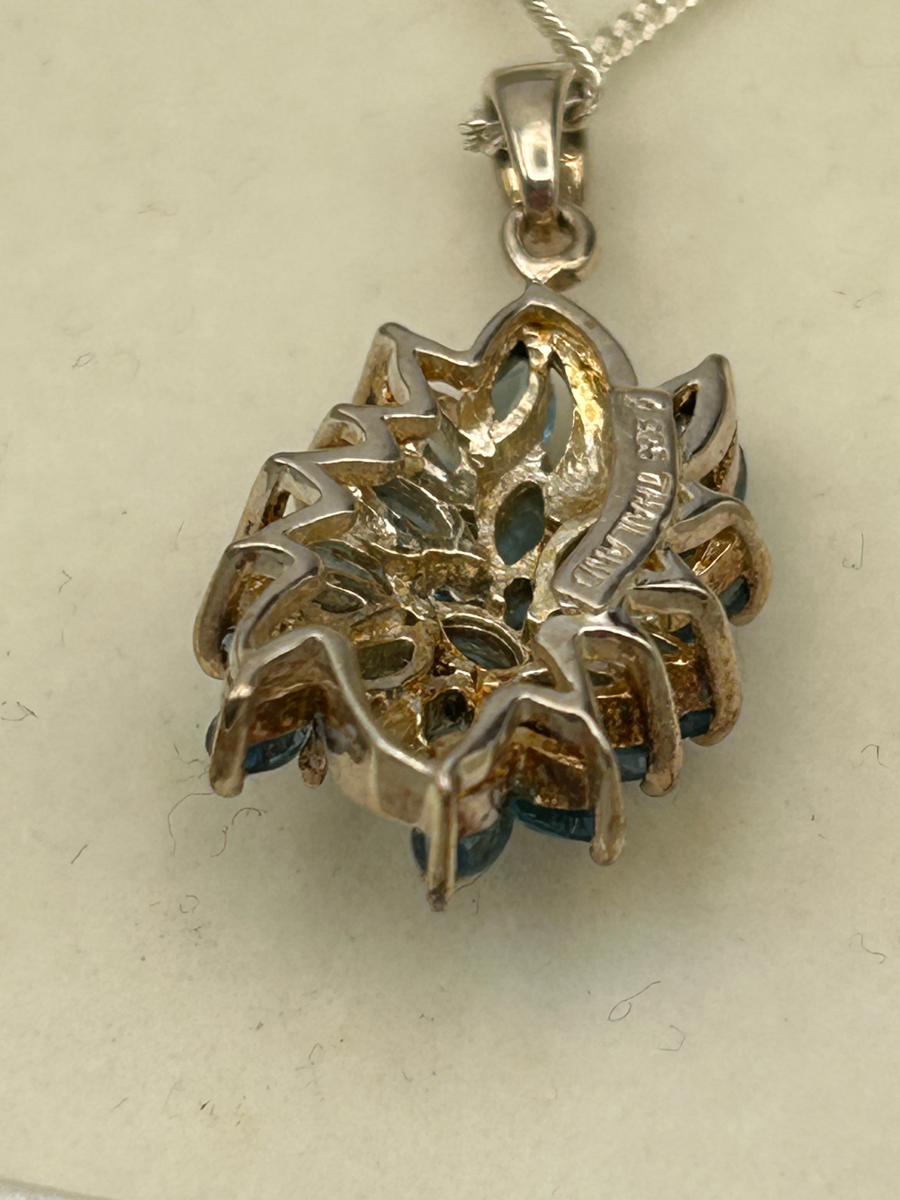 A pair of necklaces. The first necklace features an Art Nouveau style pendant in silver-tone metal, designed with curvilinear forms and an openwork motif. It is set with a central oval-cut light blue aquamarine, a smaller round aquamarine, and a suspended tear-drop shaped aquamarine. This pendant is affixed to a silver-tone chain. The second necklace presents a contemporary cluster-style pendant crafted from sterling silver, as indicated by the “925 THAI” mark on its reverse. It is densely set with multiple marquise or pear-shaped faceted aquamarines arranged in a radiating, floral-like pattern, attached to a matching sterling silver chain.