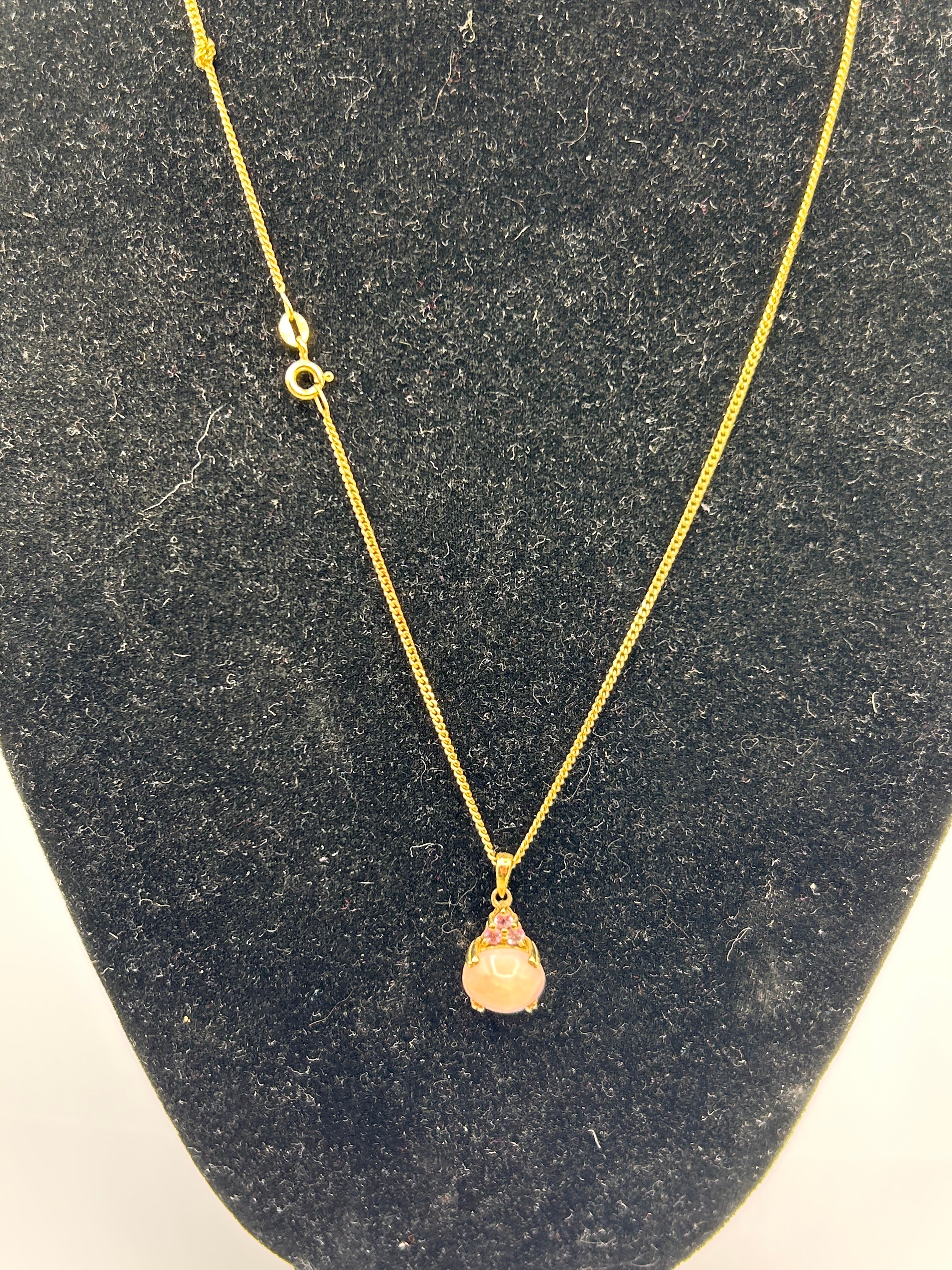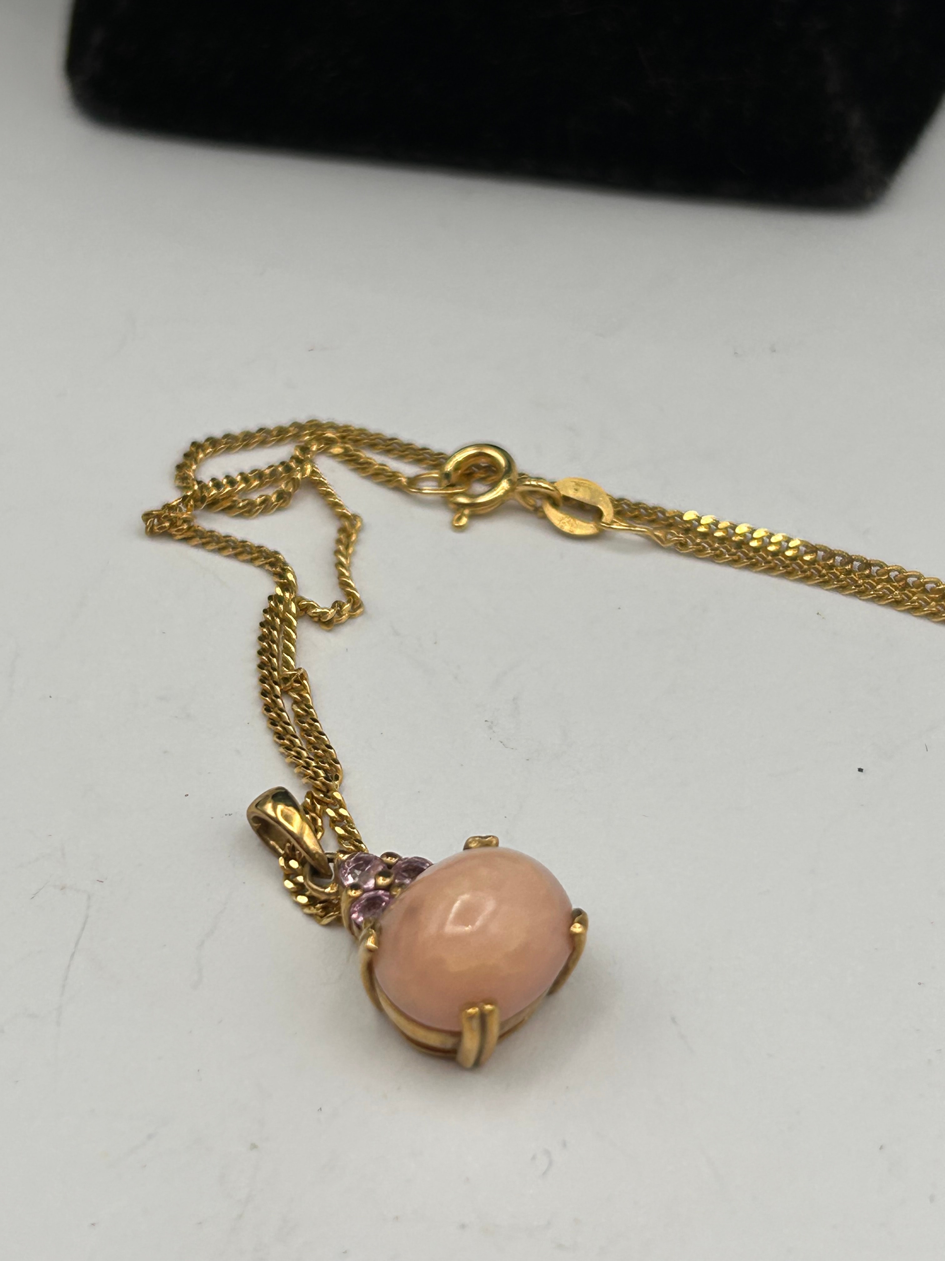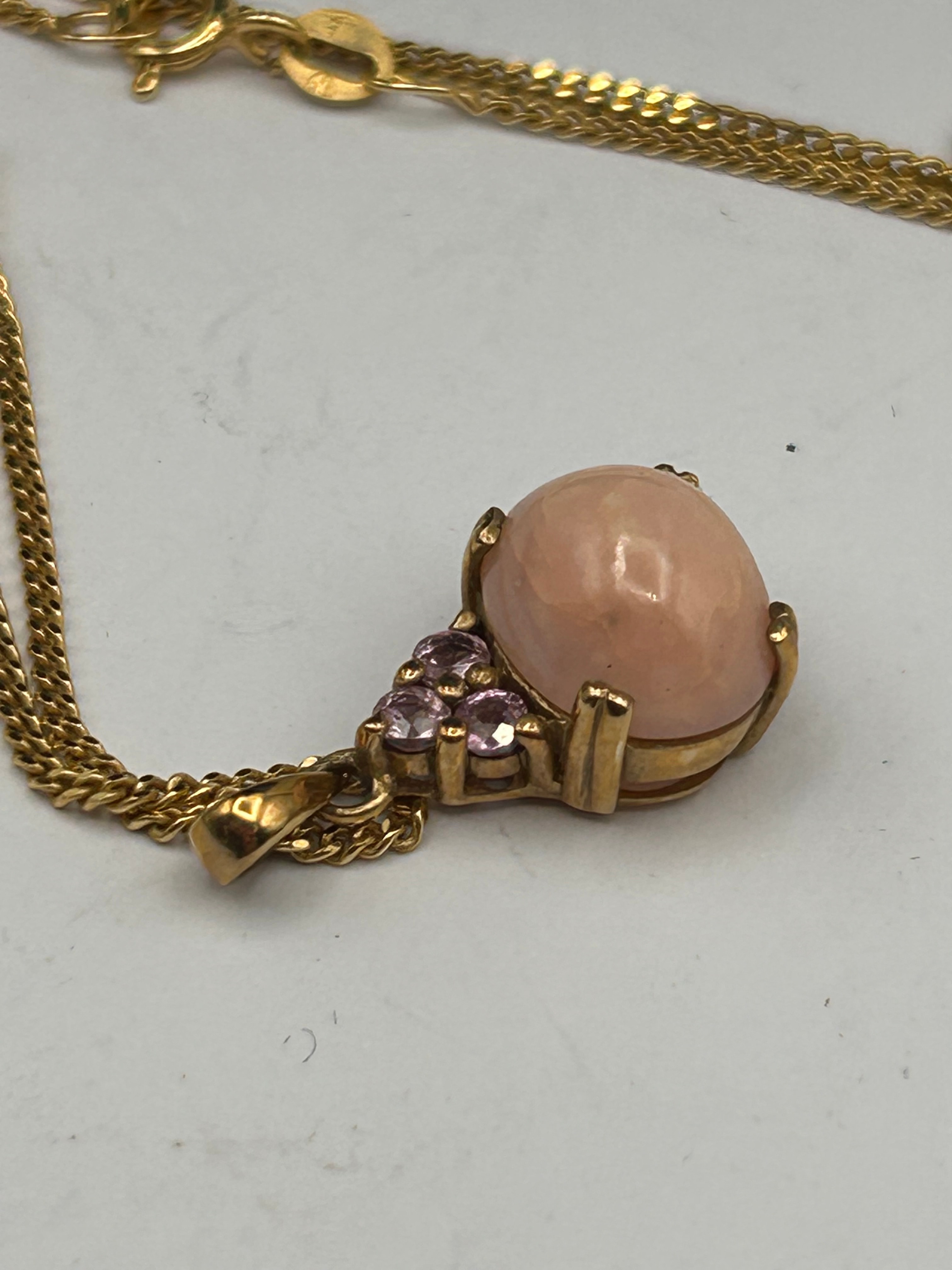A necklace composed of a fine, 9ct yellow gold chain equipped with a spring ring clasp, which bears a small, indistinct marking. The chain suspends a pendant featuring a prominent, oval, cabochon-cut stone in a pale pink to peach coloration, securely set within a 9ct yellow gold frame. Directly above the main stone, a cluster of three smaller, round-cut accent stones, appearing pink to light purple, are set in a triangular arrangement. The piece presents a classic style.