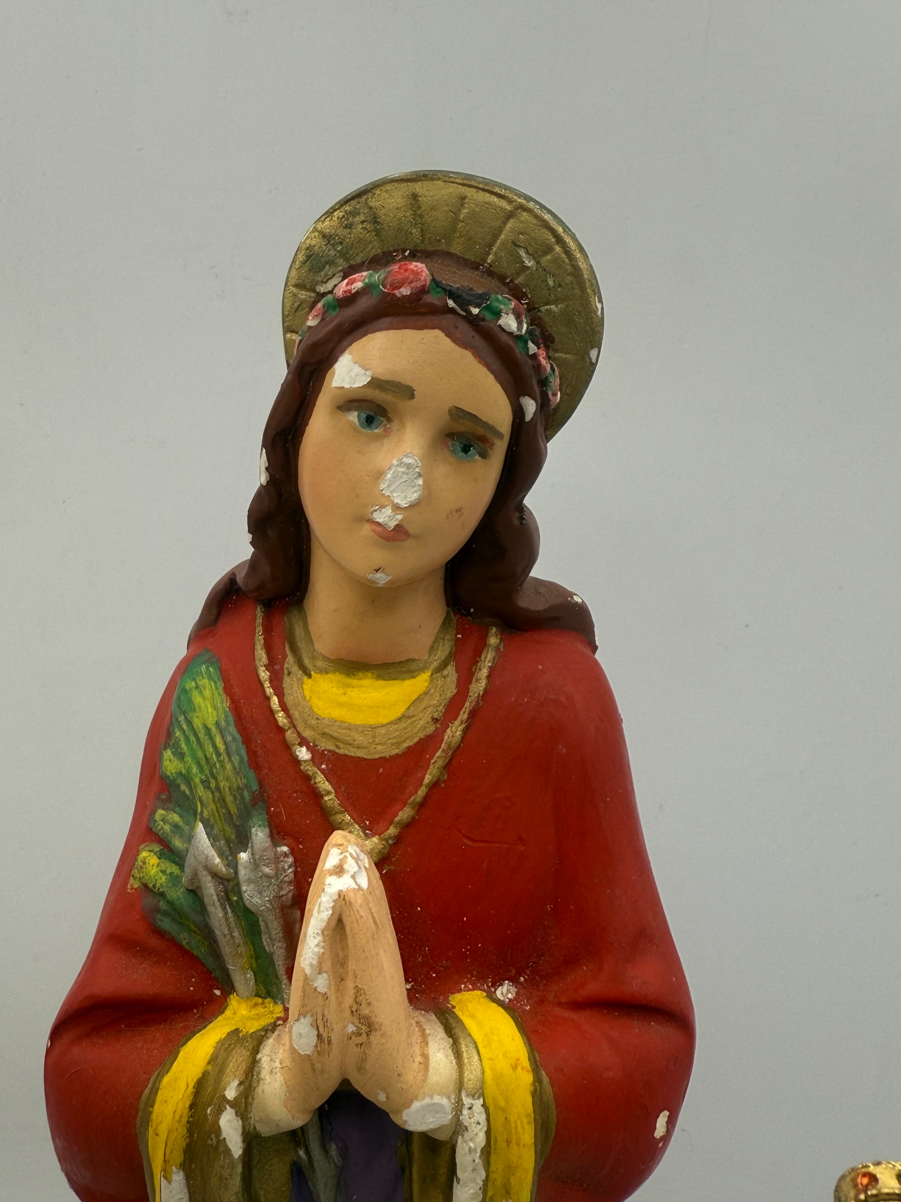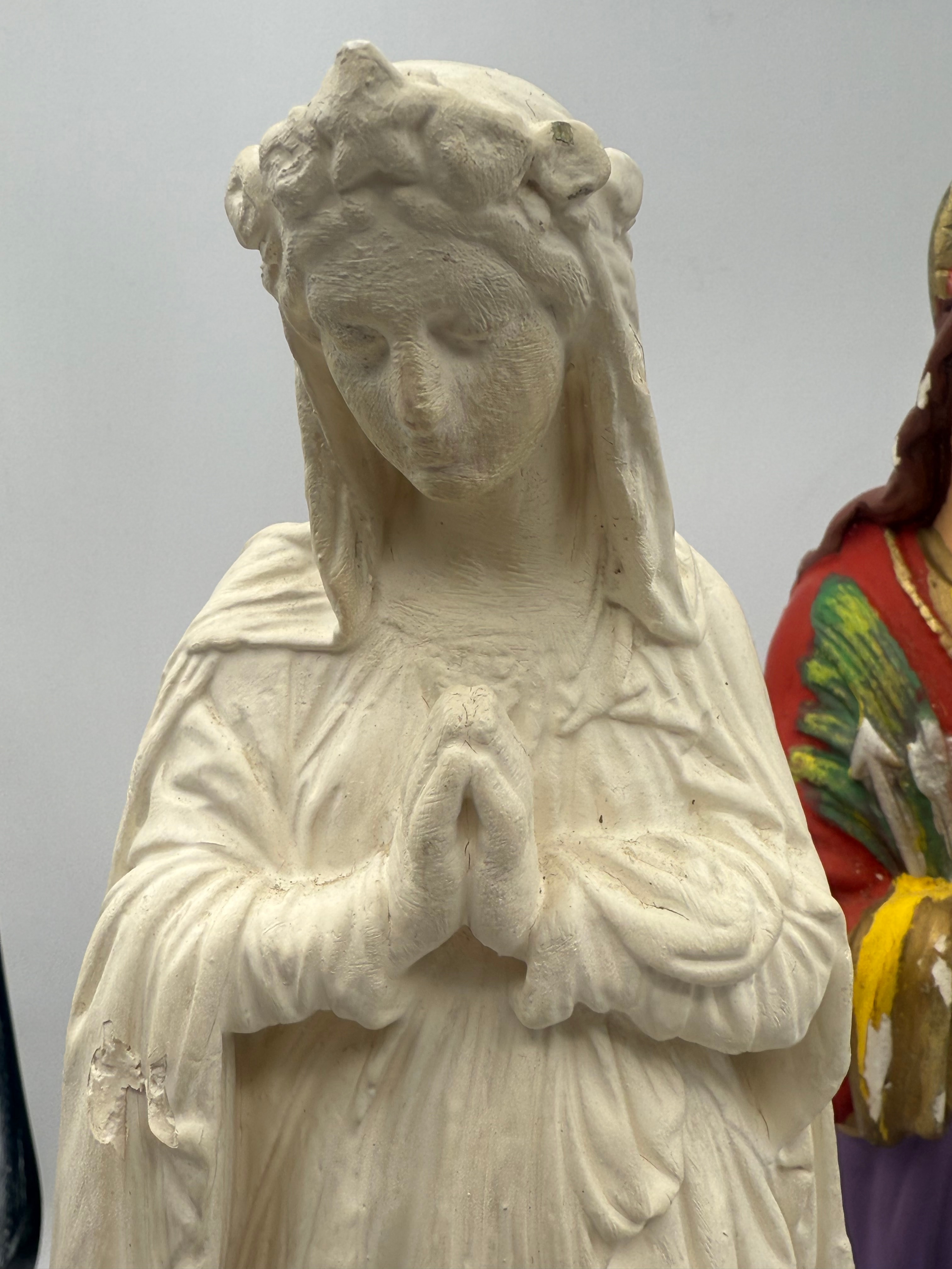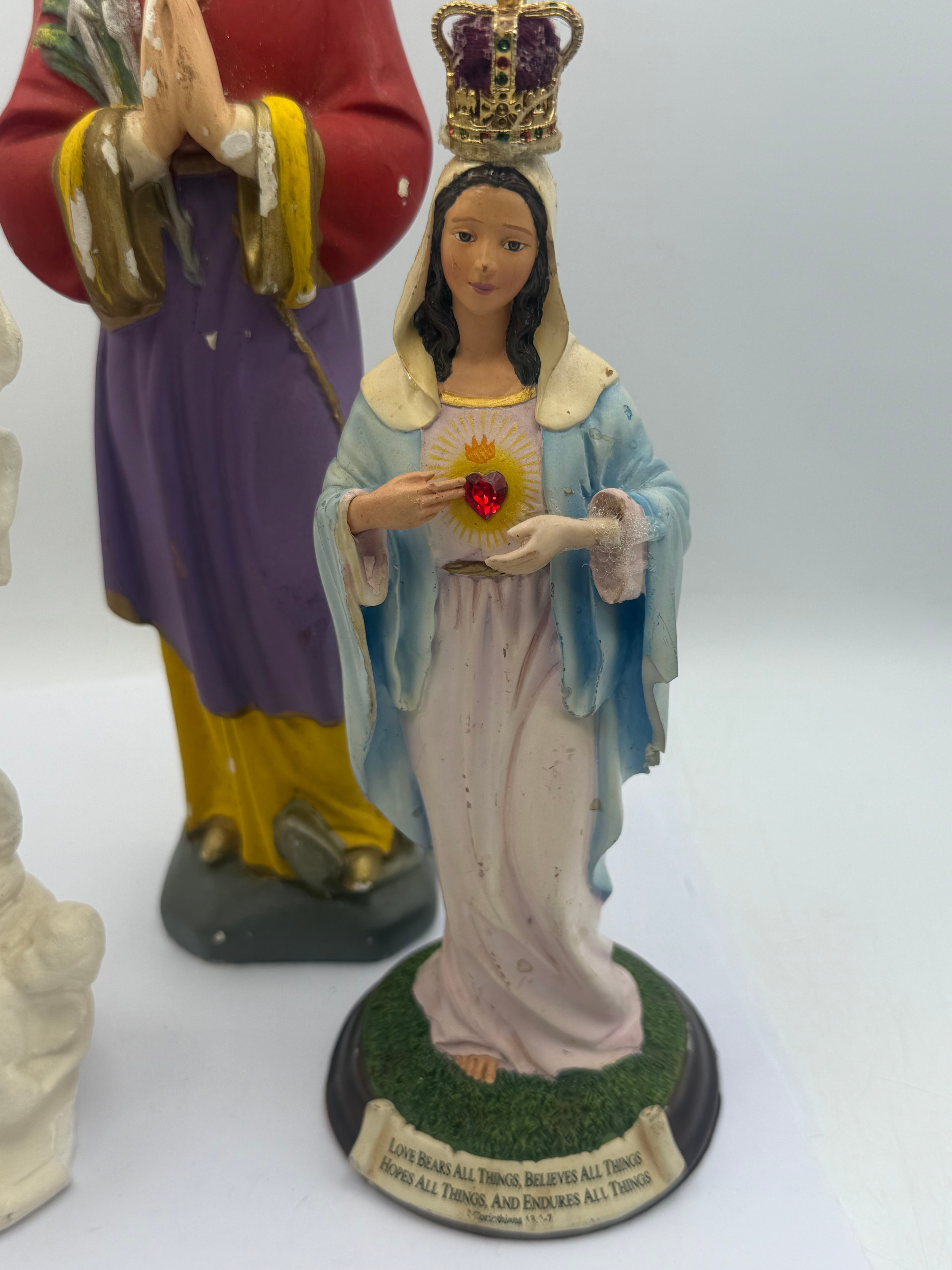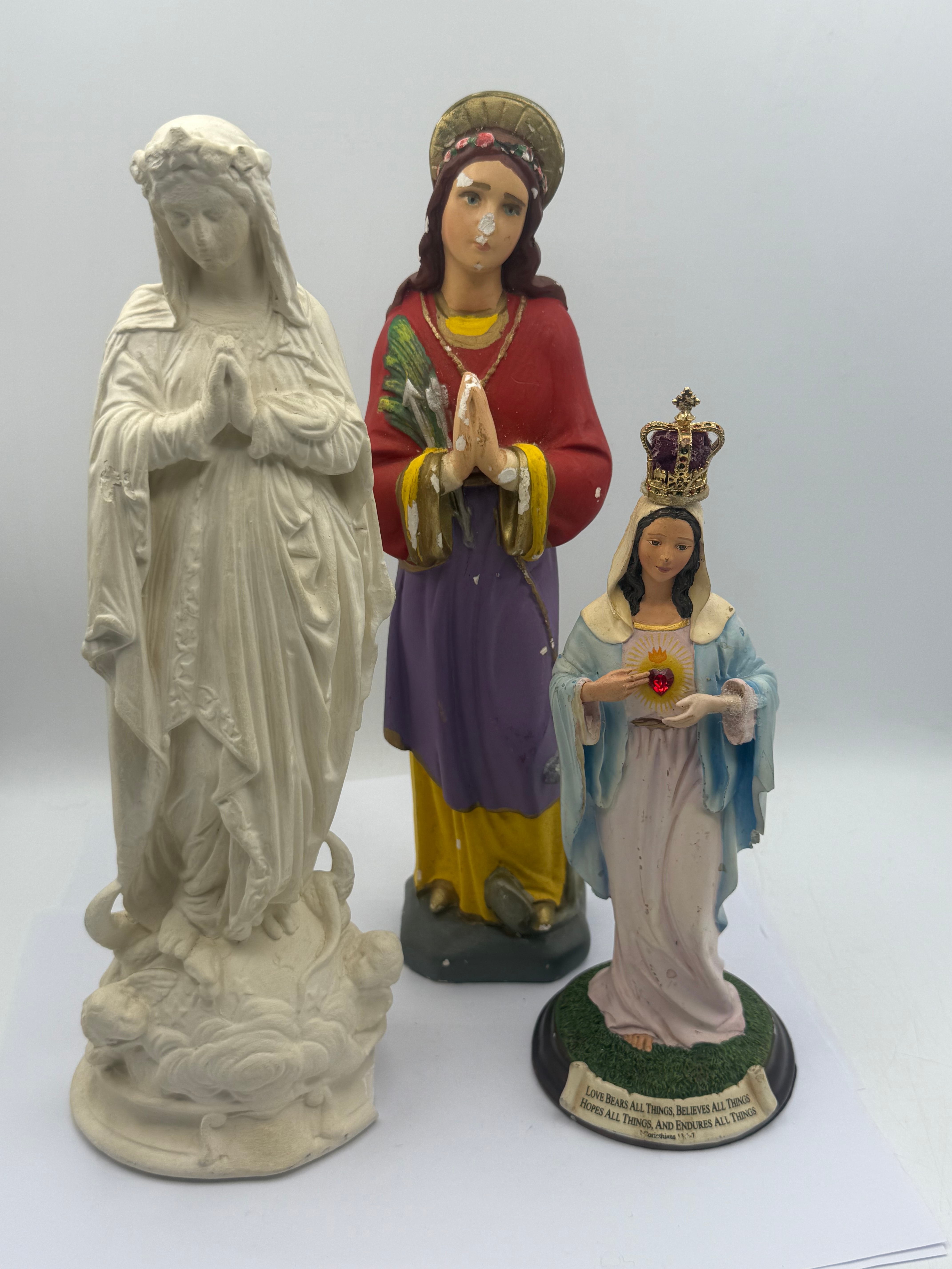 This lot comprises three modern religious figurines. The largest is an unpainted white statue depicting a draped female figure, possibly the Virgin Mary, with hands clasped in prayer, resting on a cloud-like base adorned with cherubs. This piece appears to be molded from plaster or a similar composite material. The central figurine is brightly painted, portraying a haloed female saint with a floral headband, holding what appear to be palm fronds and arrows, dressed in red, yellow, and purple robes with hands in prayer. This piece is likely painted plaster or ceramic. The smallest figurine, also painted, depicts a crowned female figure consistent with the Immaculate Heart of Mary, holding a flaming heart with a red jewel accent, standing on a green and black base. This piece is likely plaster or resin, and its black base is inscribed in English: “LOVE BEARS ALL THINGS, BELIEVES ALL THINGS, HOPES ALL THINGS, AND ENDURES ALL THINGS. 1 CORINTHIANS 13:7.”