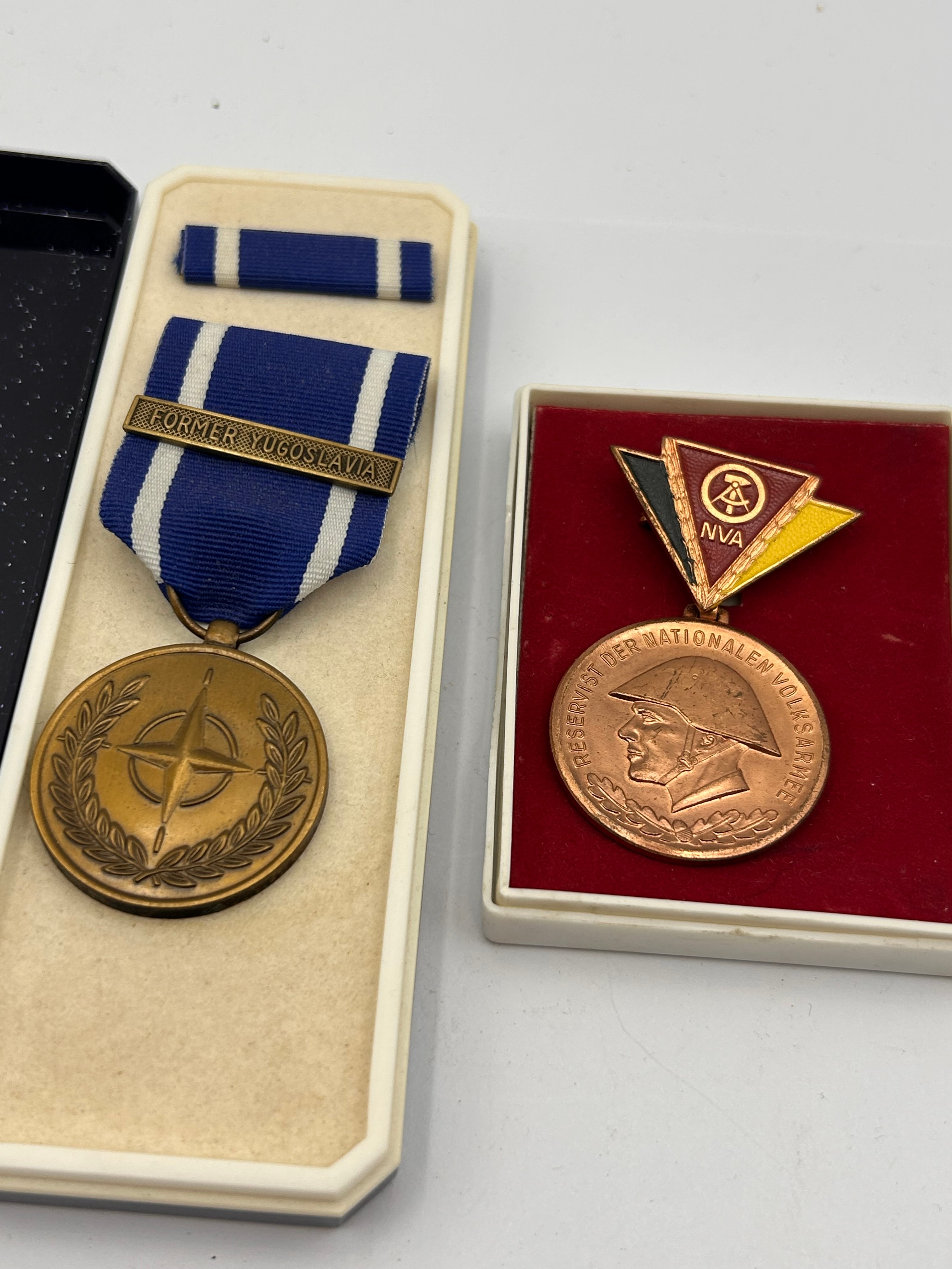 This lot comprises two distinct military-style medals. The first is a Non-Article 5 NATO Medal for Former Yugoslavia, a bronze-toned circular medal depicting a four-pointed star (resembling a compass rose) within a circle, framed by a laurel wreath. It is suspended from a blue ribbon with two white vertical stripes, which also features a bronze bar inscribed “FORMER YUGOSLAVIA.” A separate, smaller ribbon bar matching the main ribbon is also included. This set is housed in a black hinged box with a cream-colored felt interior. The second item is an East German Reservist Medal (NVA), a copper-toned circular medal portraying a profile bust of a helmeted soldier, encircled by the text “RESERVIST DER NATIONALEN VOLKSARMEE” (Reservist of the National People’s Army) and a partial laurel wreath. Above the medal, a triangular metal device, colored black, red, and yellow, features a stylized compass and hammer-and-pick emblem along with the initials “NVA.” This item is presented in a white box with a red velvet-like interior.