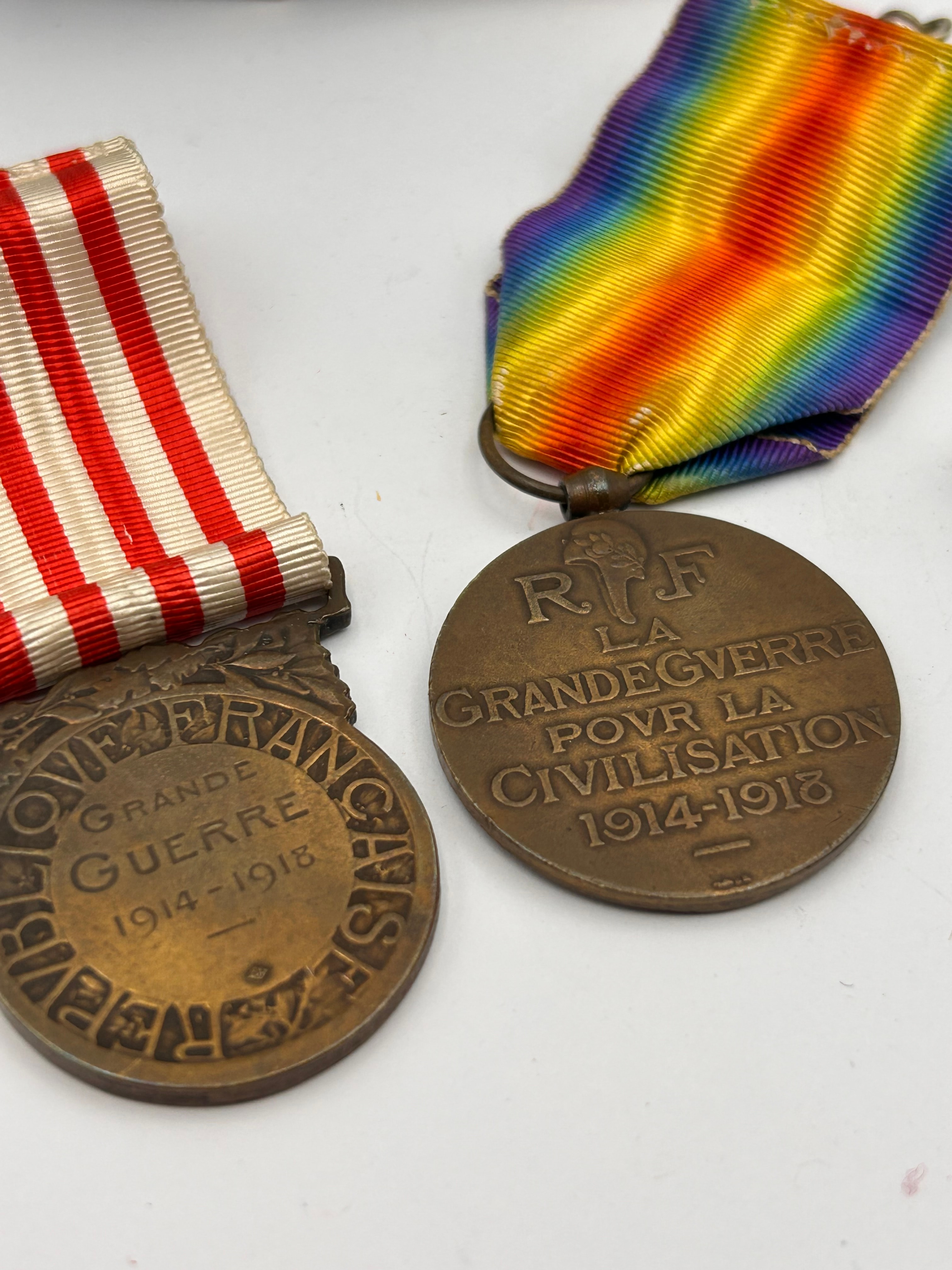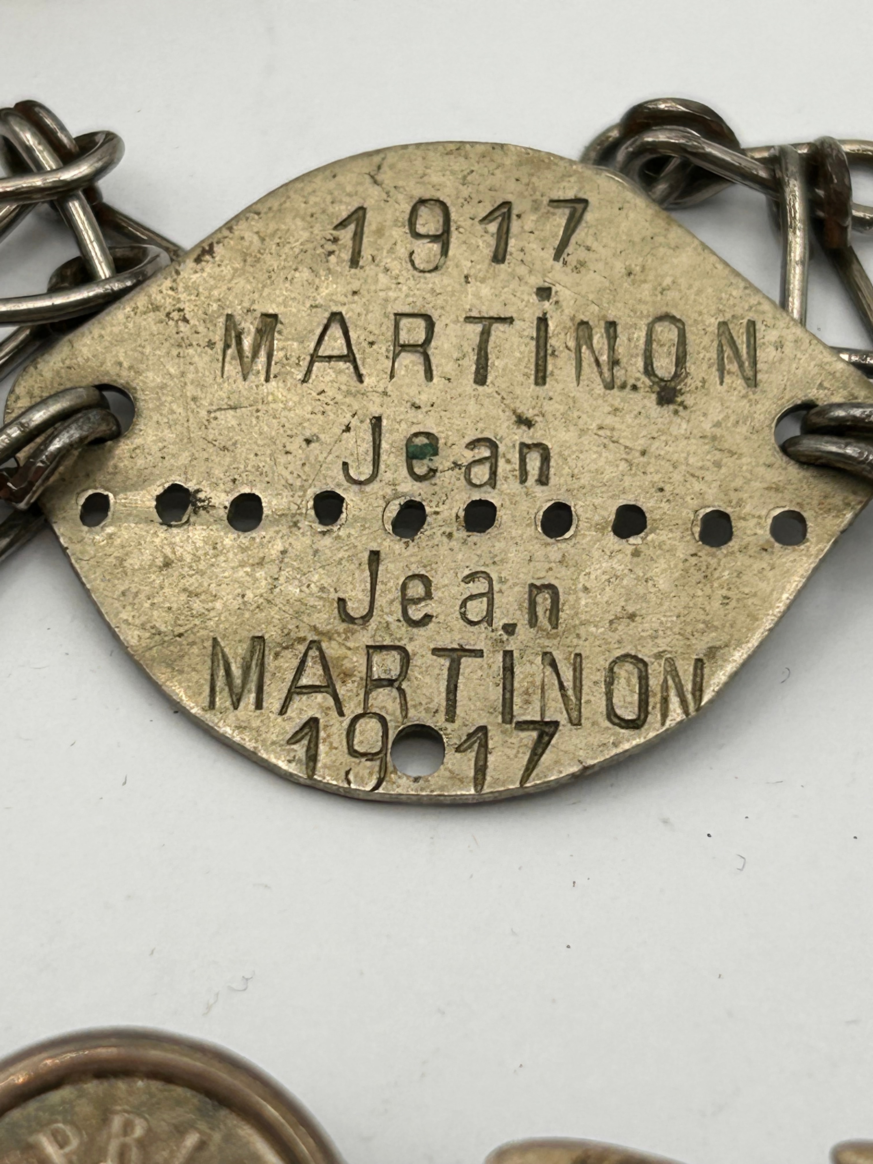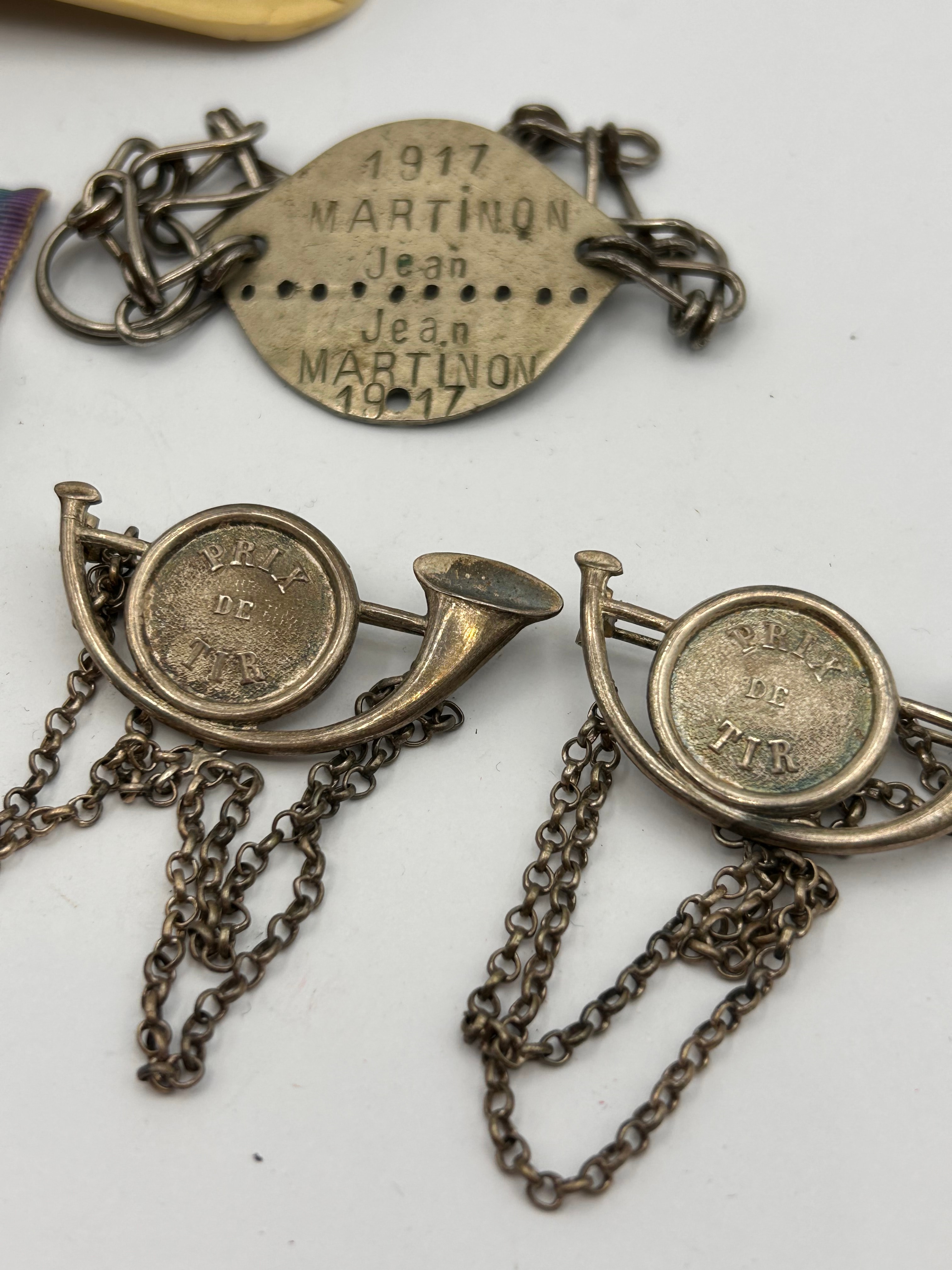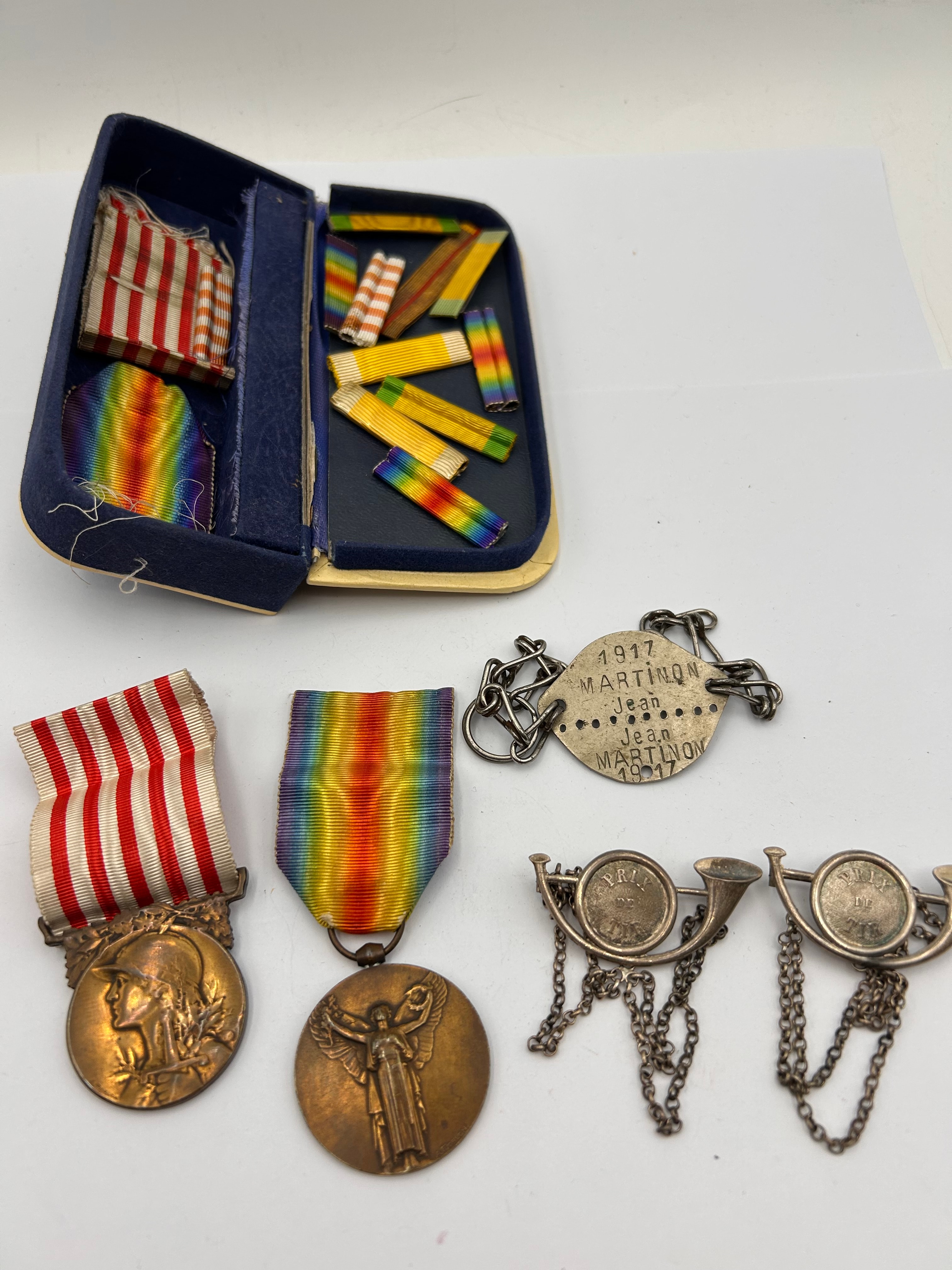 A collection of French World War I-era military and commemorative artifacts. The group comprises two bronze medals on ribbons: a WWI Commemorative Medal inscribed “GRANDE GUERRE 1914-1918” and “REPUBLIQUE FRANCAISE”, and an Inter-Allied Victory Medal inscribed “R.F. LA GRANDE GUERRE POUR LA CIVILISATION 1914-1918”. Also included is a metal identification tag clearly stamped with “1917 MARTINON Jean” and “Jean MARTINON 1917”, alongside two horn-shaped metal shooting prize pins marked “PRIX DE TIR”. The ensemble is completed by a hinged blue case containing multiple lengths of medal ribbons.
