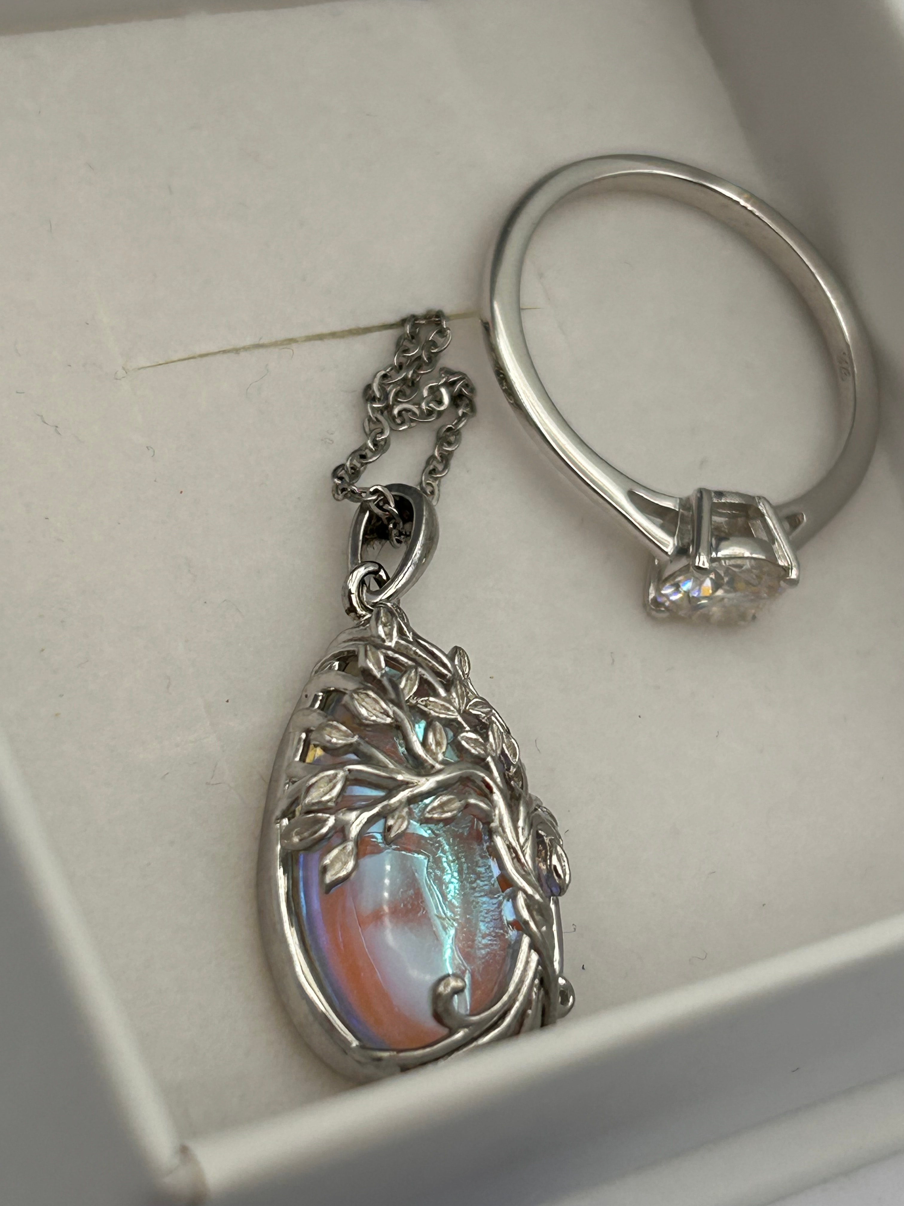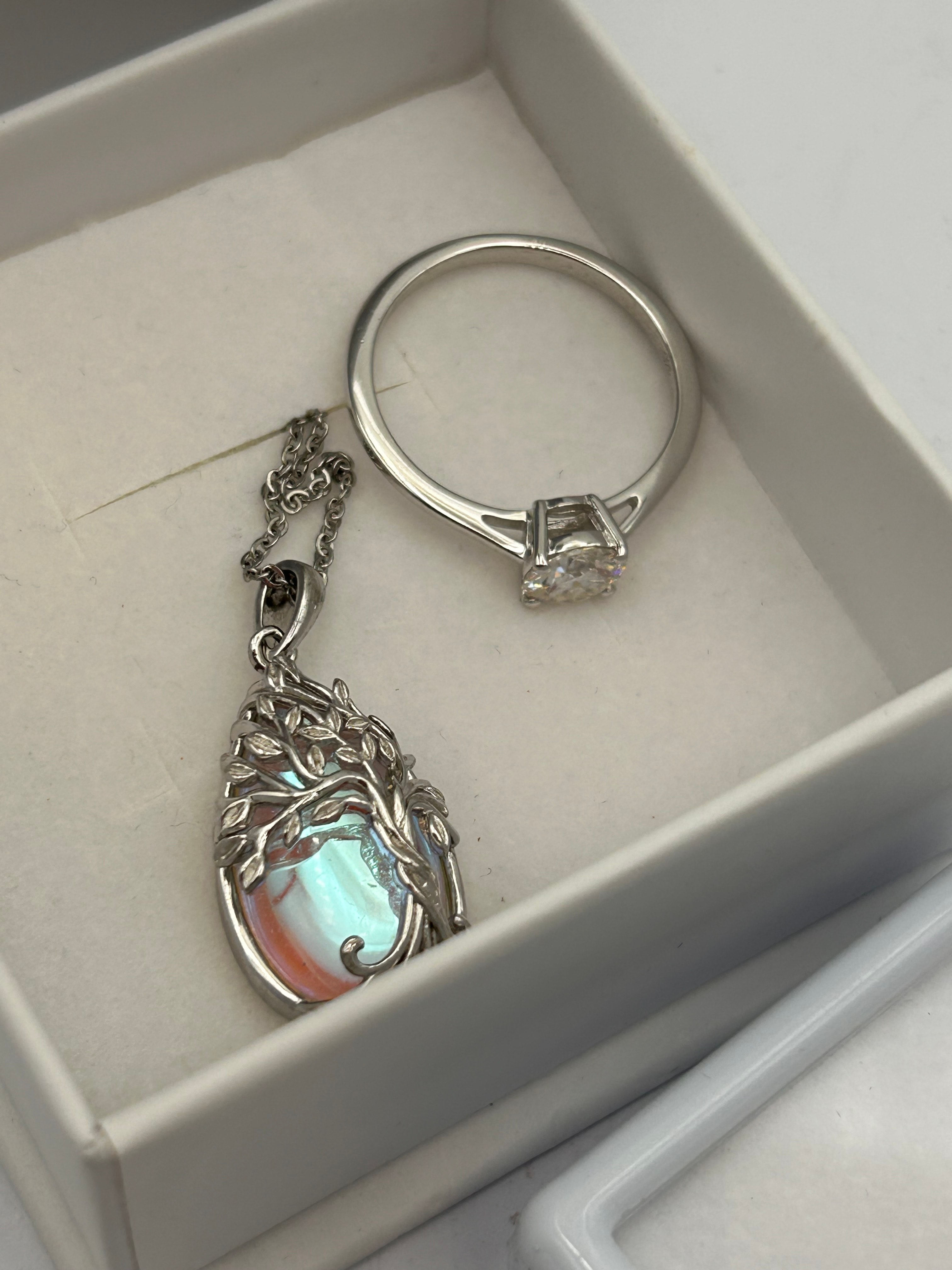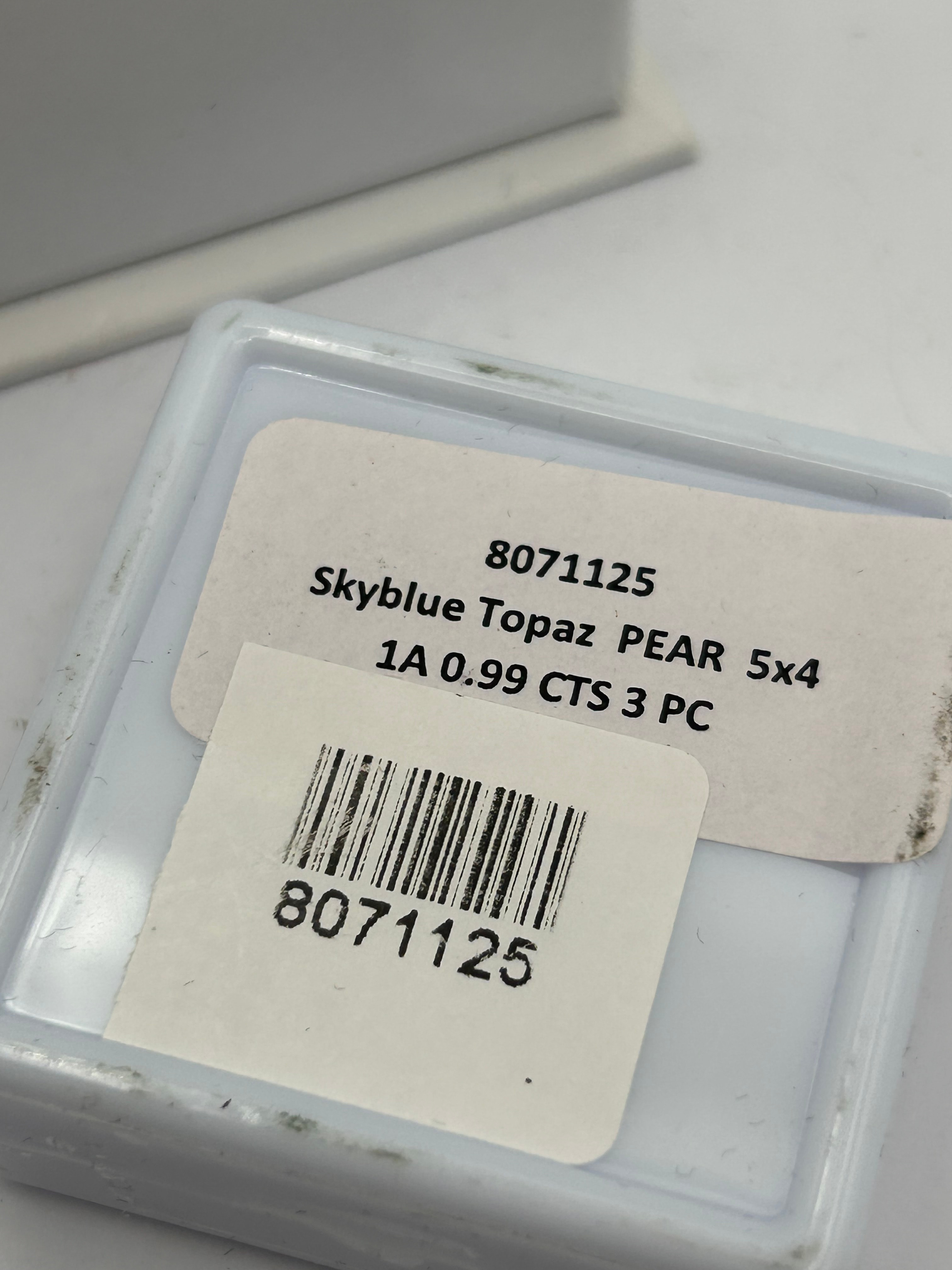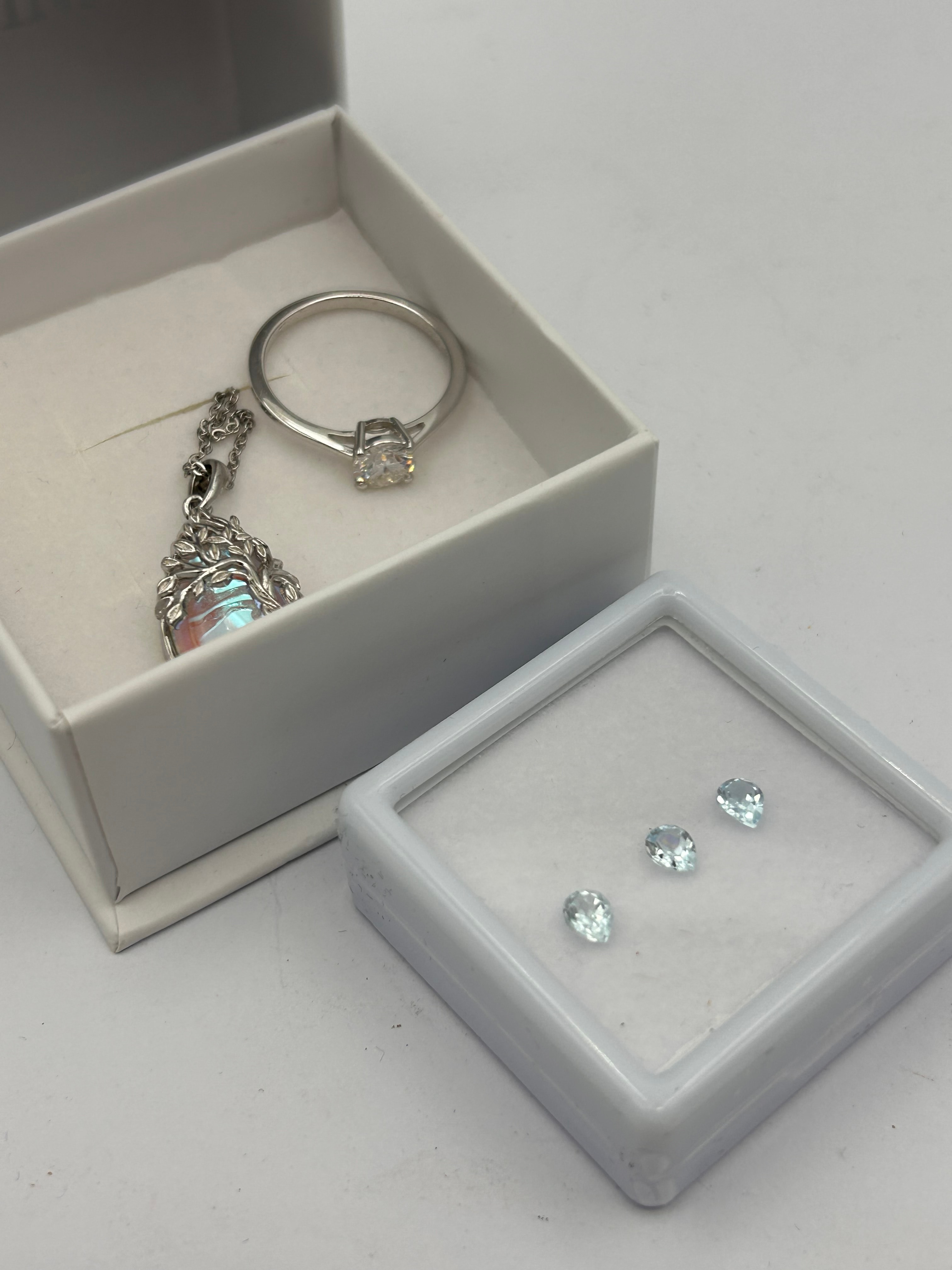 A group of three Skyblue Topaz pear-shaped faceted gemstones, each measuring approximately 5×4 mm. The total weight for the three pieces is 0.99 carats, graded 1A. Accompanying these is a silver solitaire ring, featuring a round, clear faceted stone set in a four-prong setting. Also included is a silver pendant on a delicate chain, designed with a ‘Tree of Life’ motif encircling an oval, iridescent gemstone displaying a play of pink, orange, blue, and green colors.