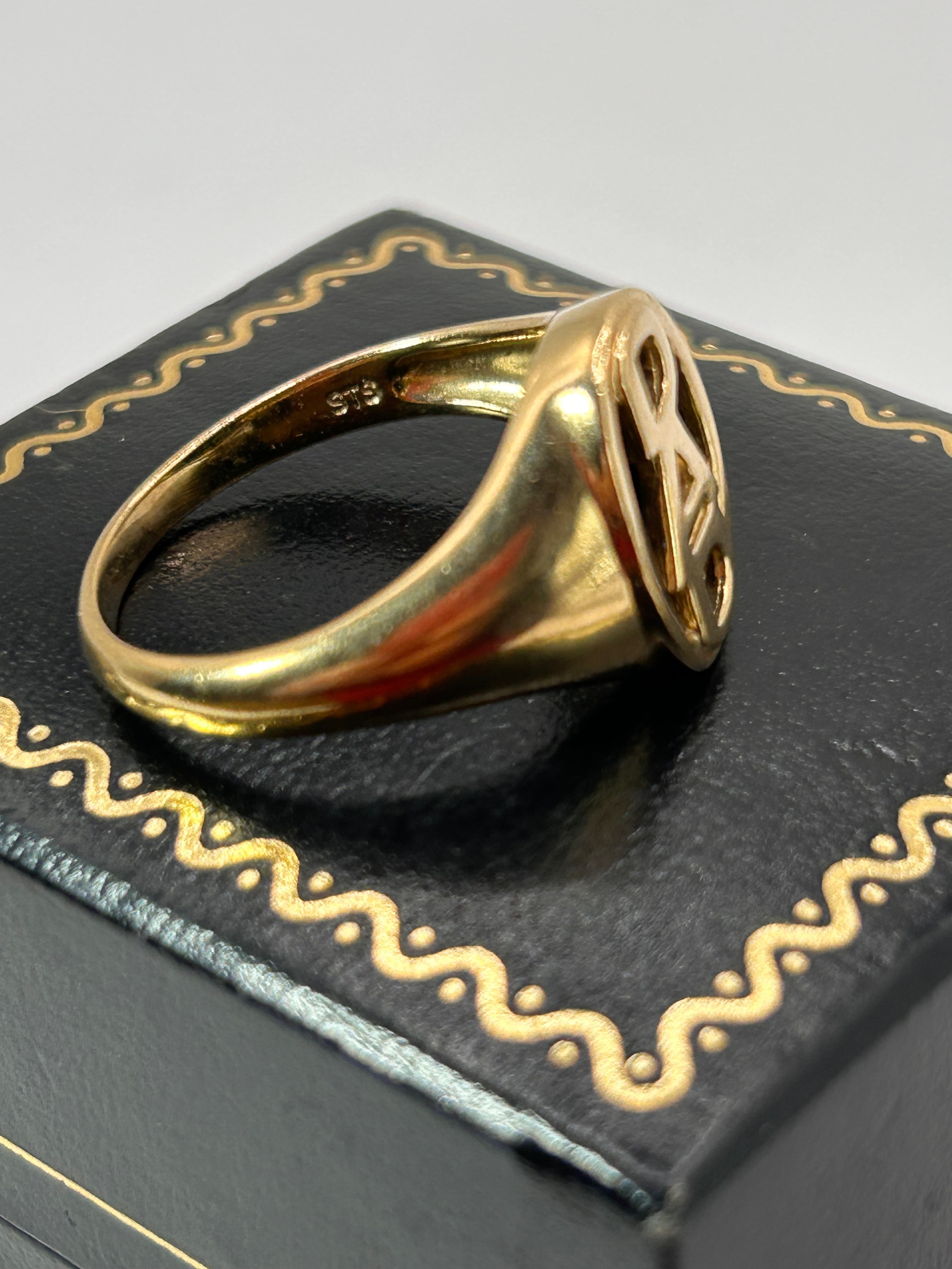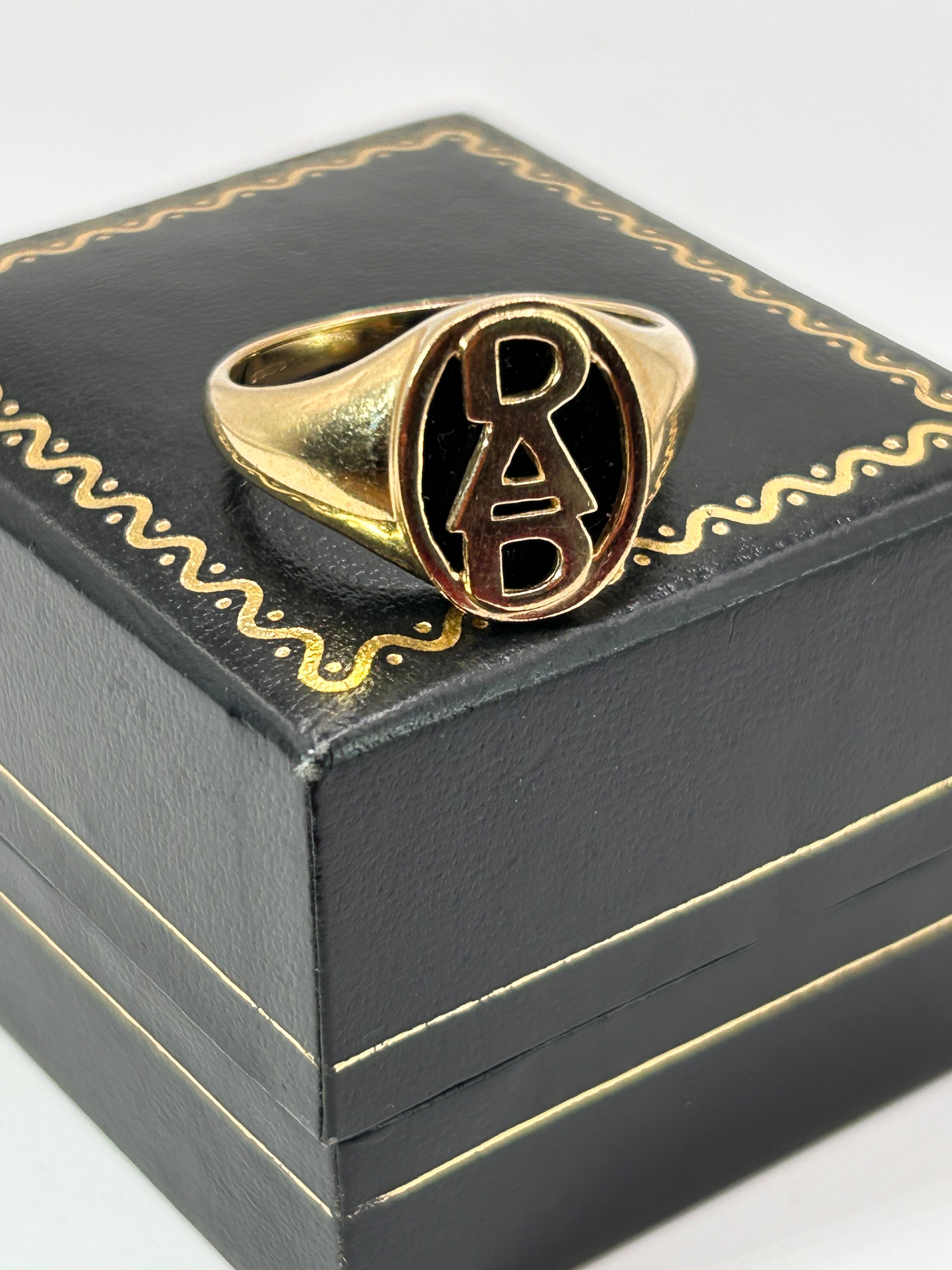 A 9ct yellow gold signet ring, designed in a signet style with an oval-shaped face featuring a dark, possibly enameled, background. The face prominently displays a DAD clearly formed within its counter-space.