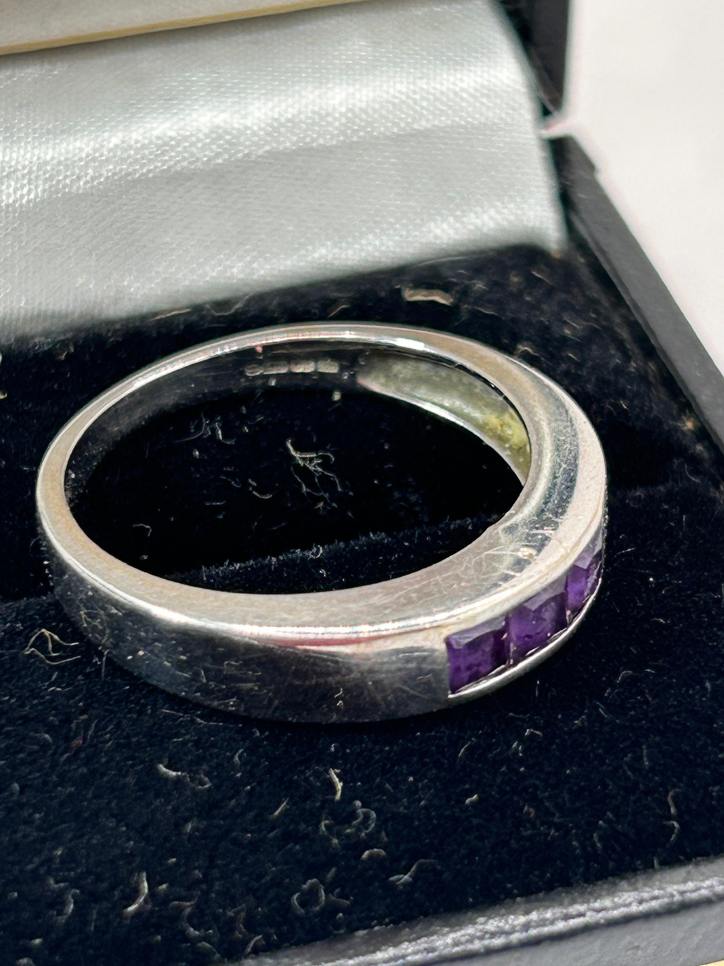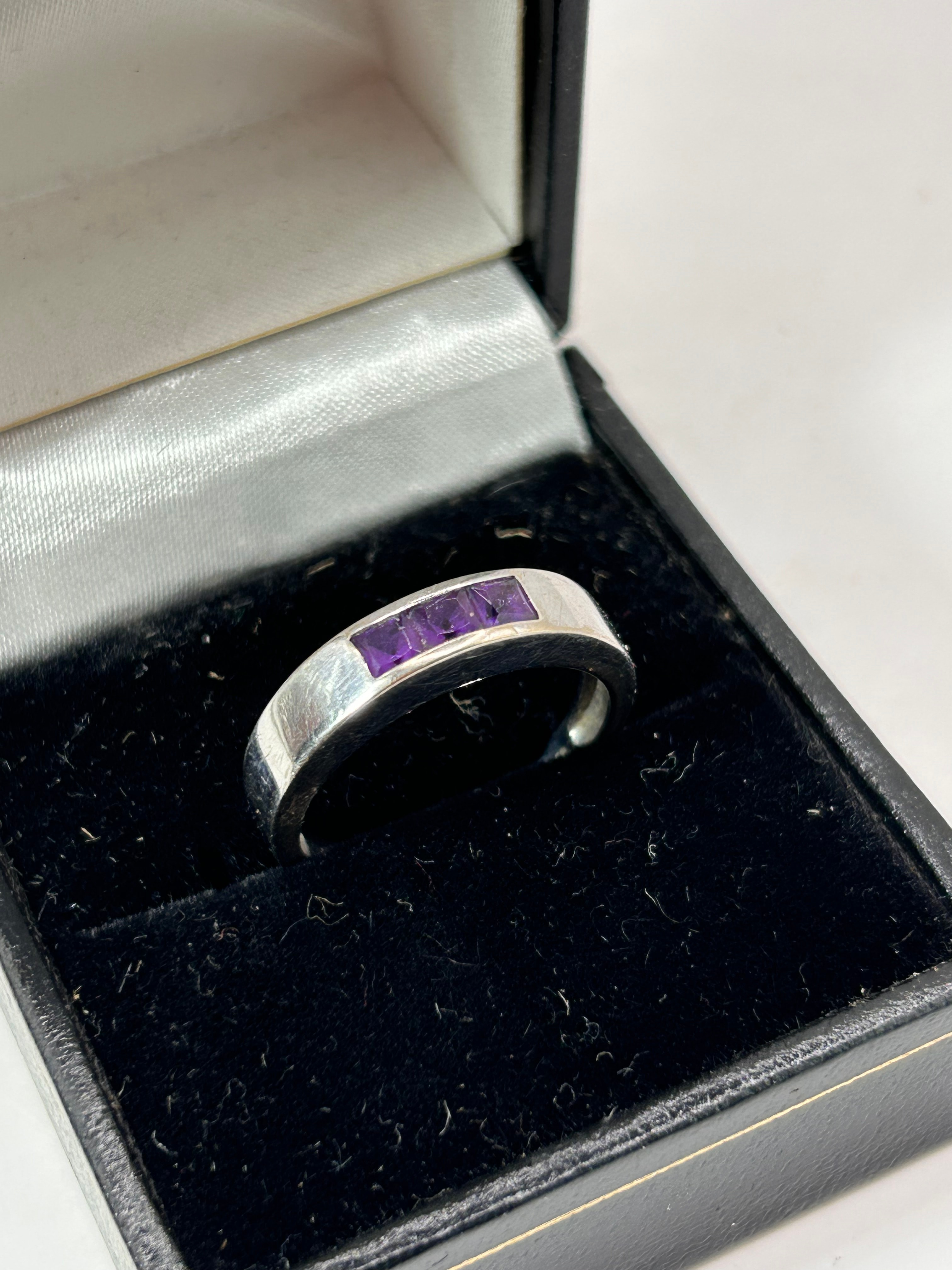 A contemporary 9ct gold band ring featuring three rectangular, channel-set amethyst gemstones. The stones are flush-set into a polished, unadorned band. Faint, indecipherable hallmarks are visible on the interior of the ring. The ring is a Size P.