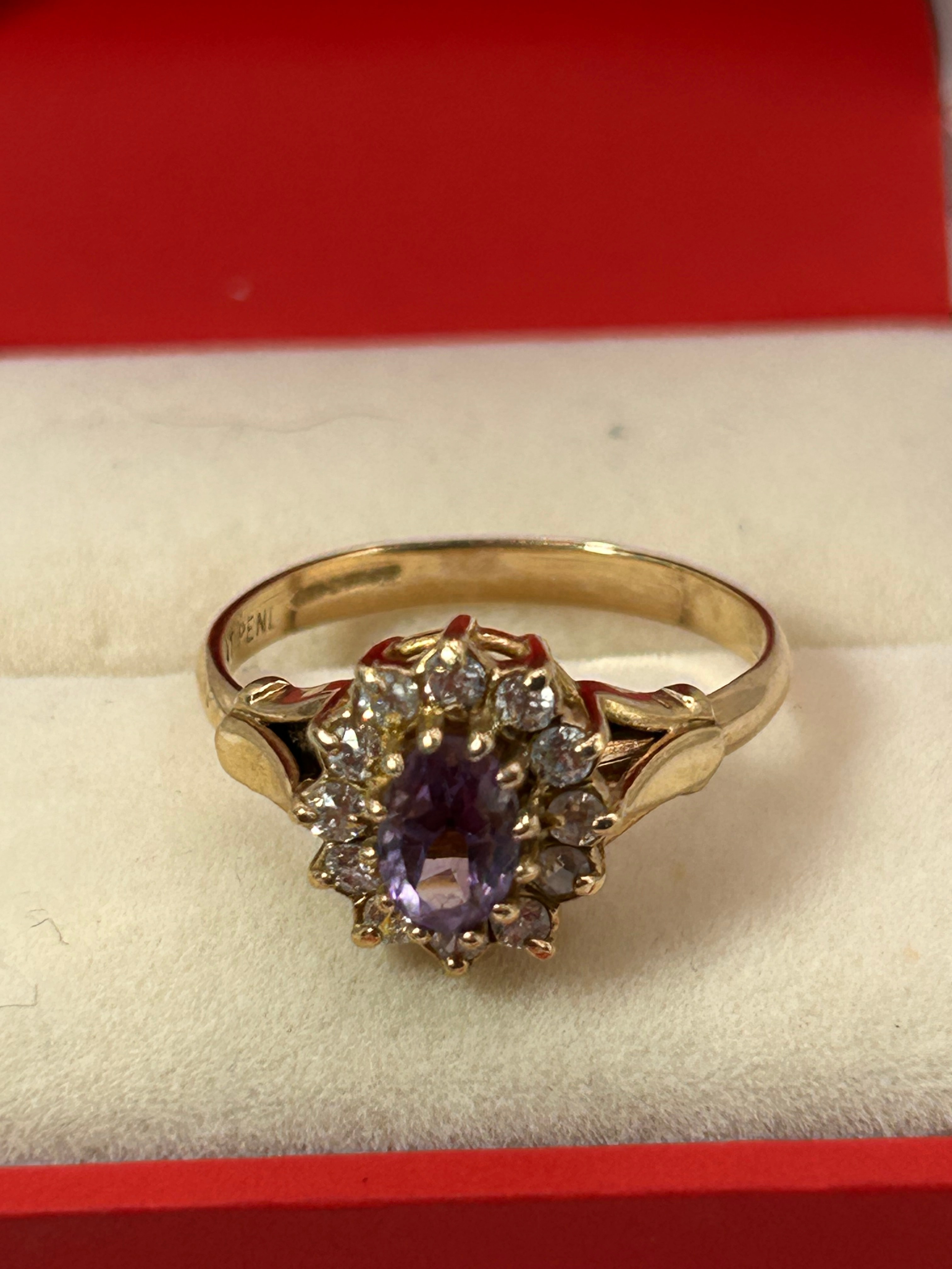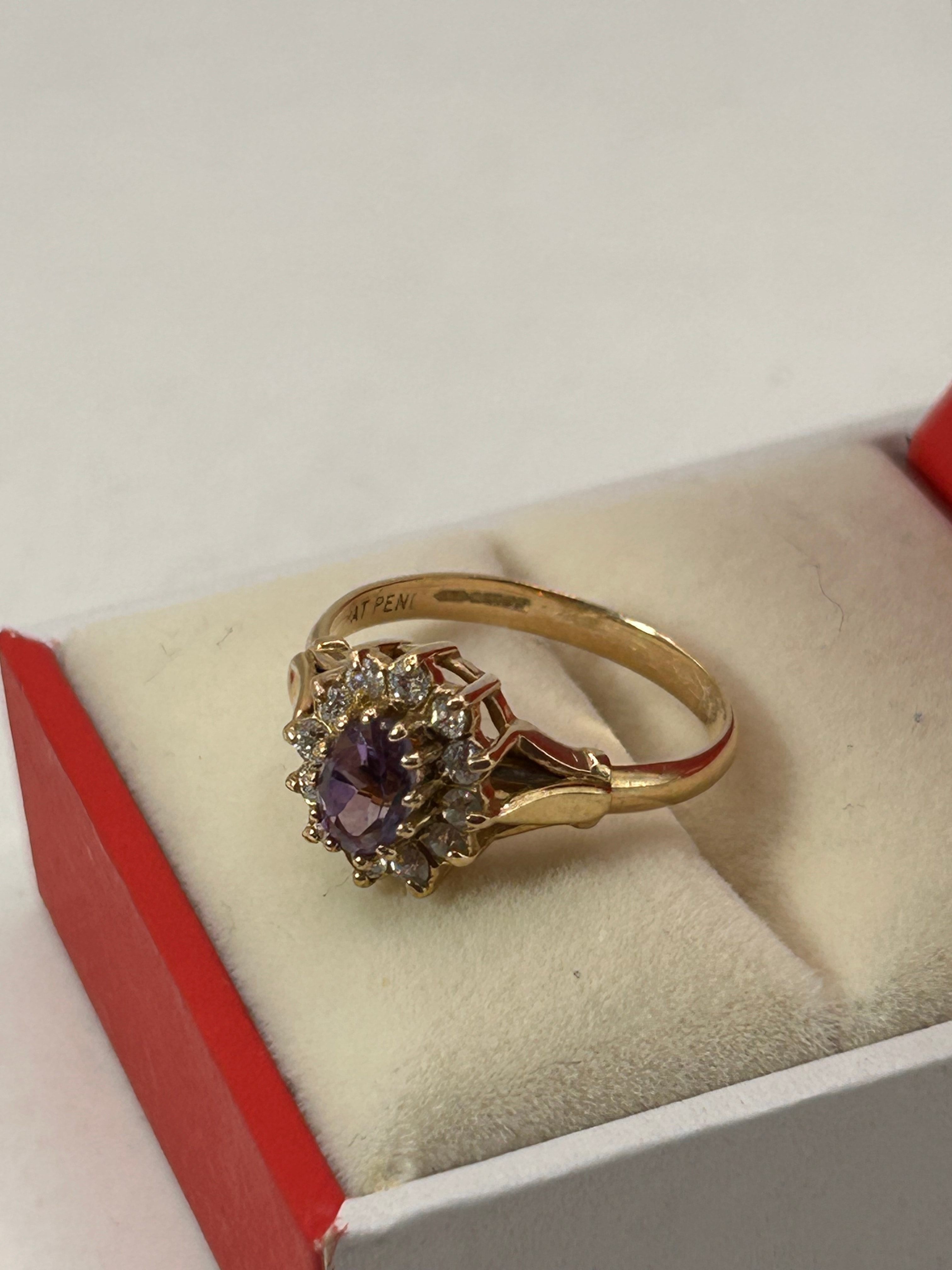A vintage 9ct yellow gold ring, featuring an oval-cut purple amethyst central stone, surrounded by a cluster of smaller round-cut cubic zirconia stones. The stones are set in a halo or floral arrangement. The plain band widens slightly towards the shoulders, which exhibit simple decorative detailing. Visible markings on the interior of the band include the partial inscription “AT PENL” and a blurry hallmark adjacent to it.