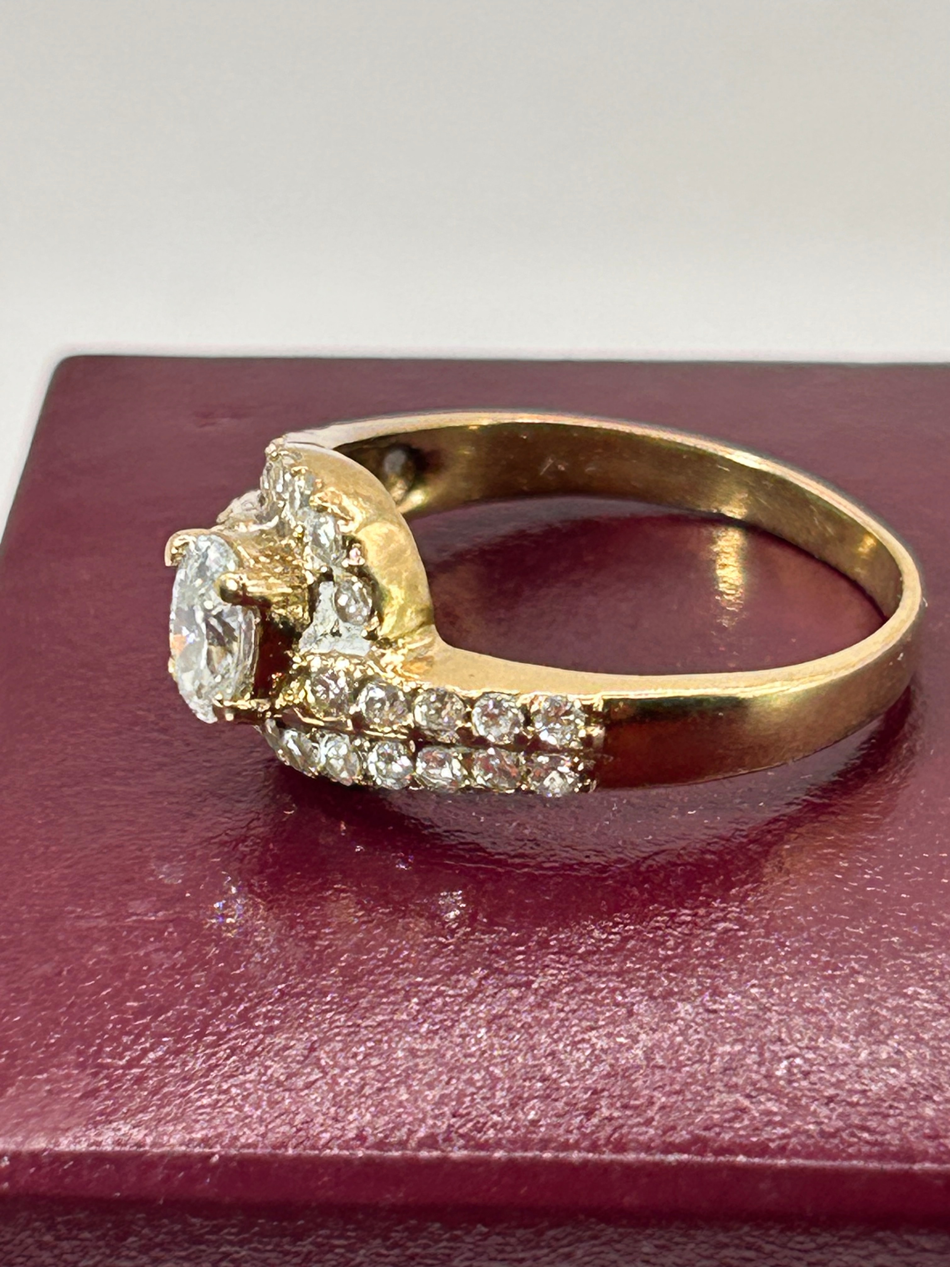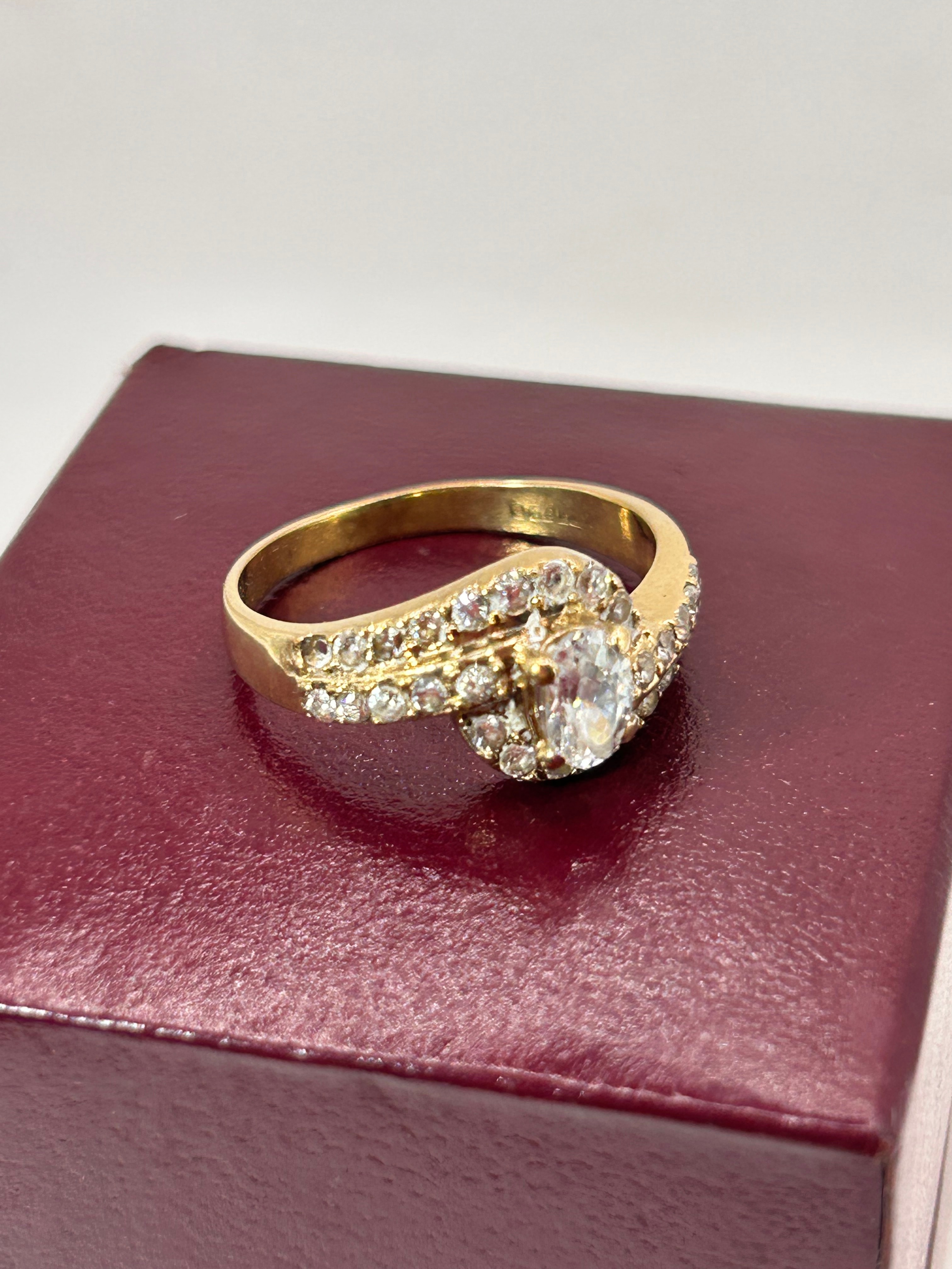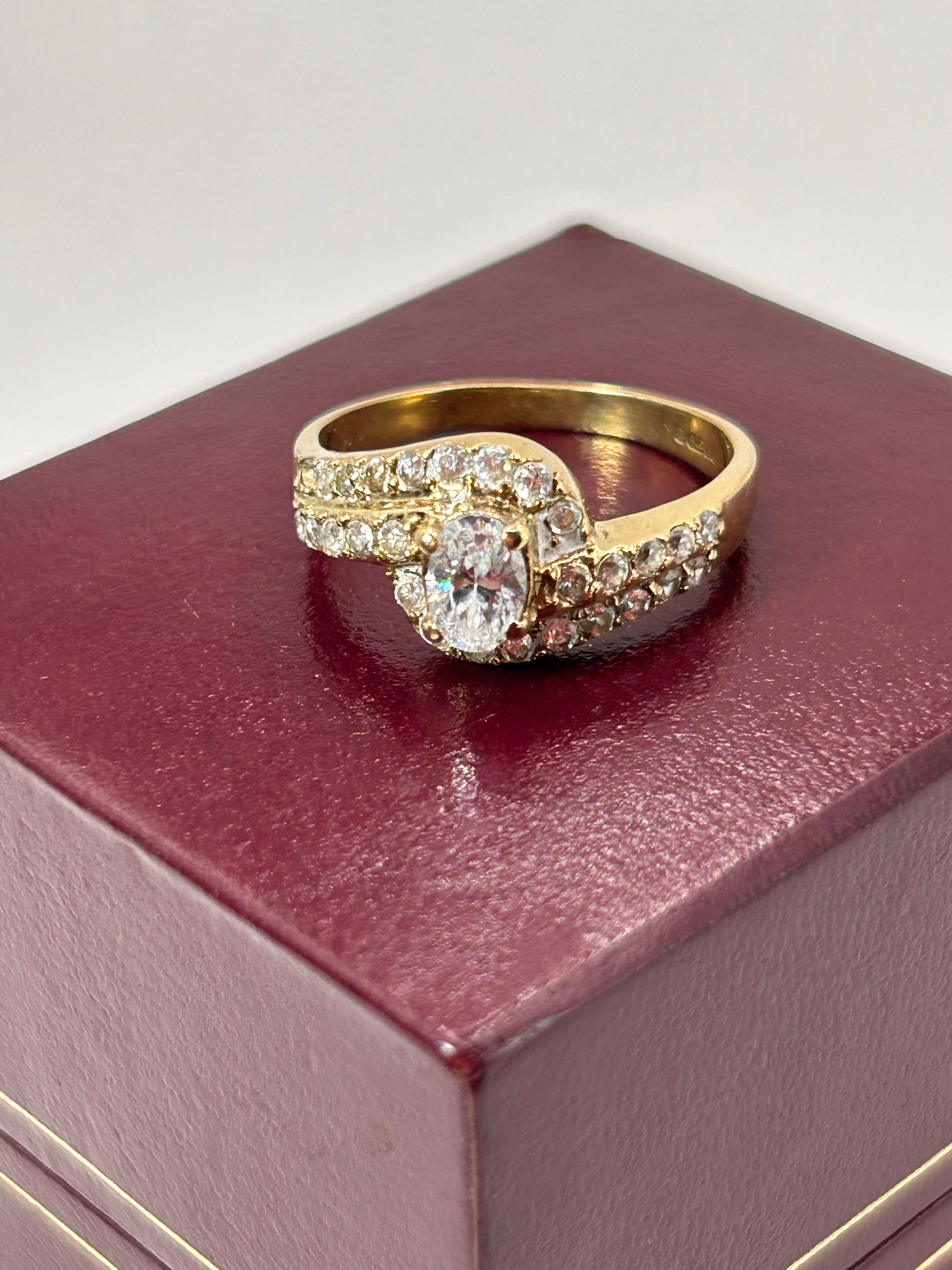 A contemporary 9ct yellow gold bypass engagement ring. The design features a prominent faceted round or oval-cut clear central cubic zirconia stone, prong-set, surrounded and flanked by numerous smaller, clear cubic zirconia accent stones pavé-set along the curved bands of the ring.