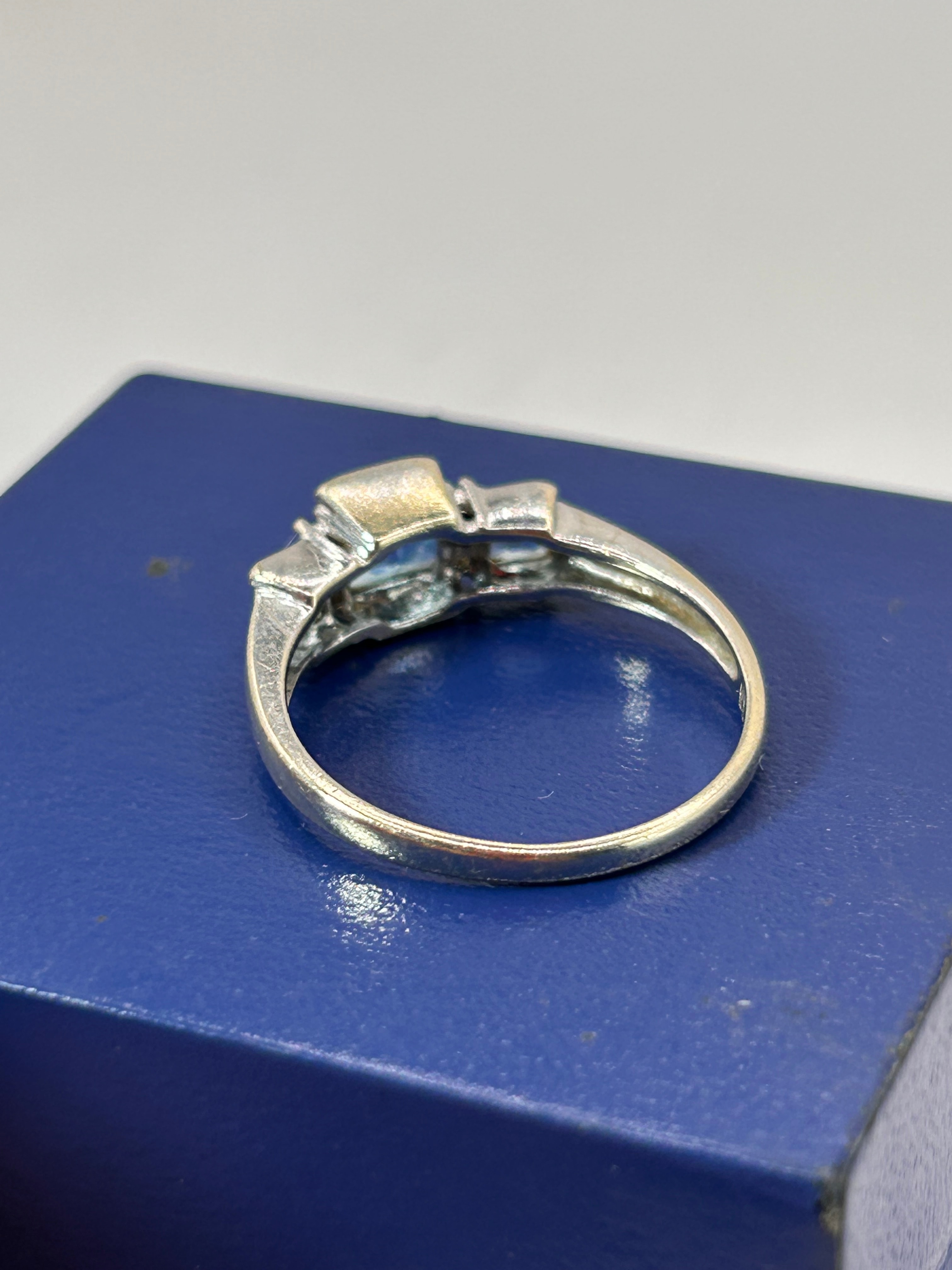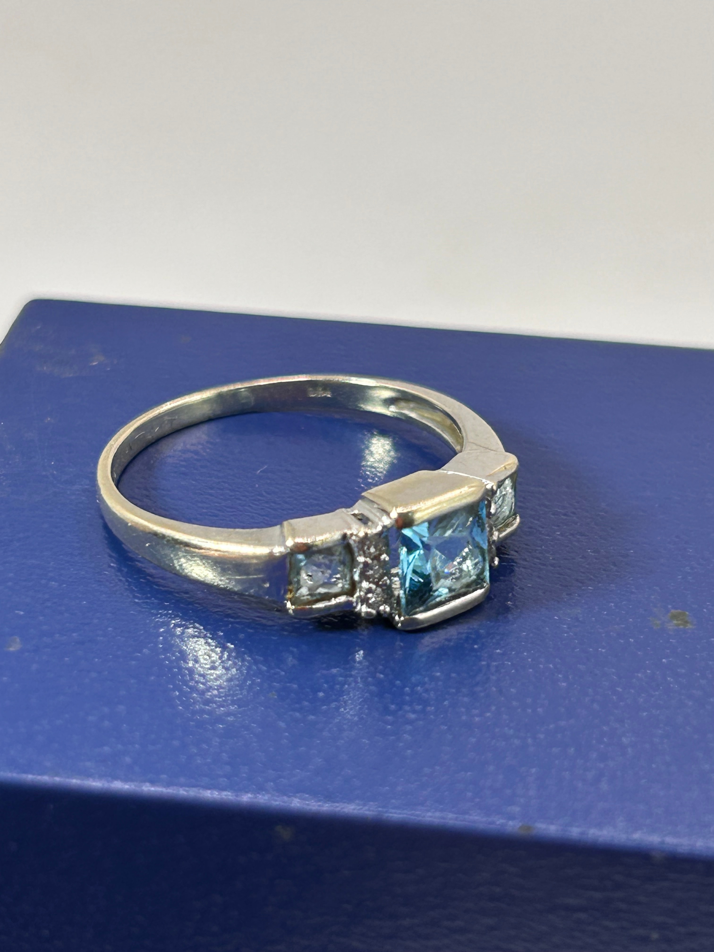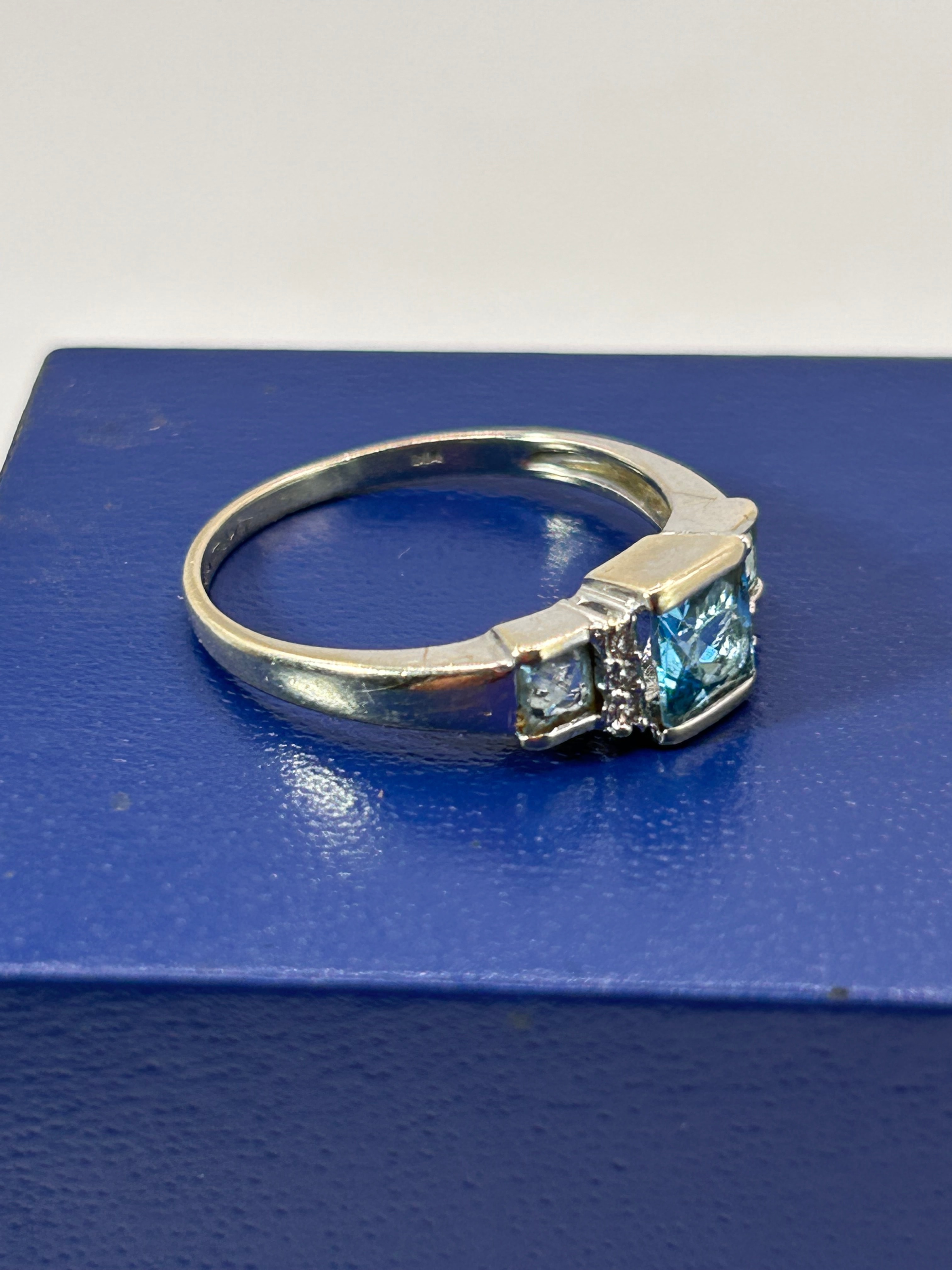 A 9ct Gold Blue Topaz and Diamond Trilogy Ring. The ring features a central rectangular-cut light blue topaz, bezel-set, flanked on each side by a smaller square-cut light blue topaz. A cluster of small, round, colorless diamonds accentuates the design, set with prongs and pave. The item’s materials are confirmed to be Gold.