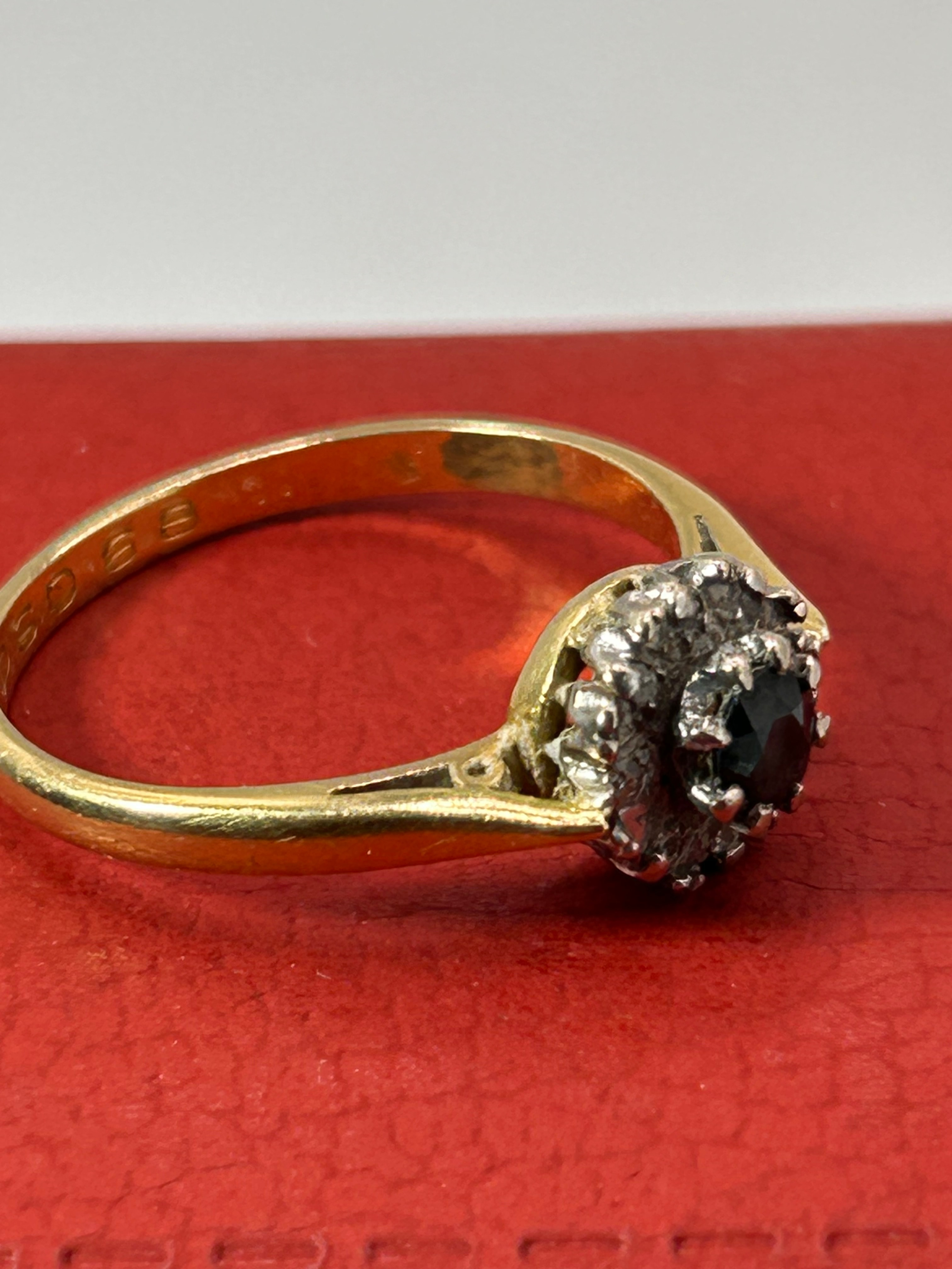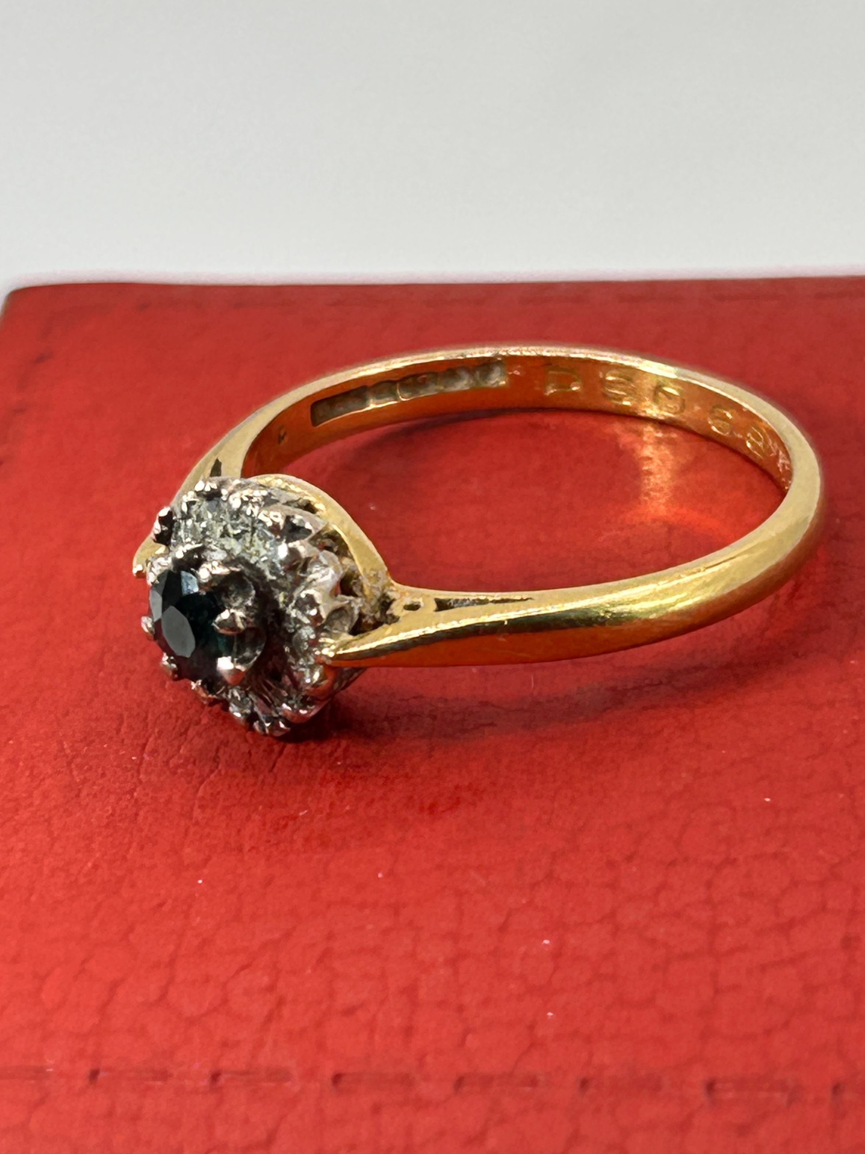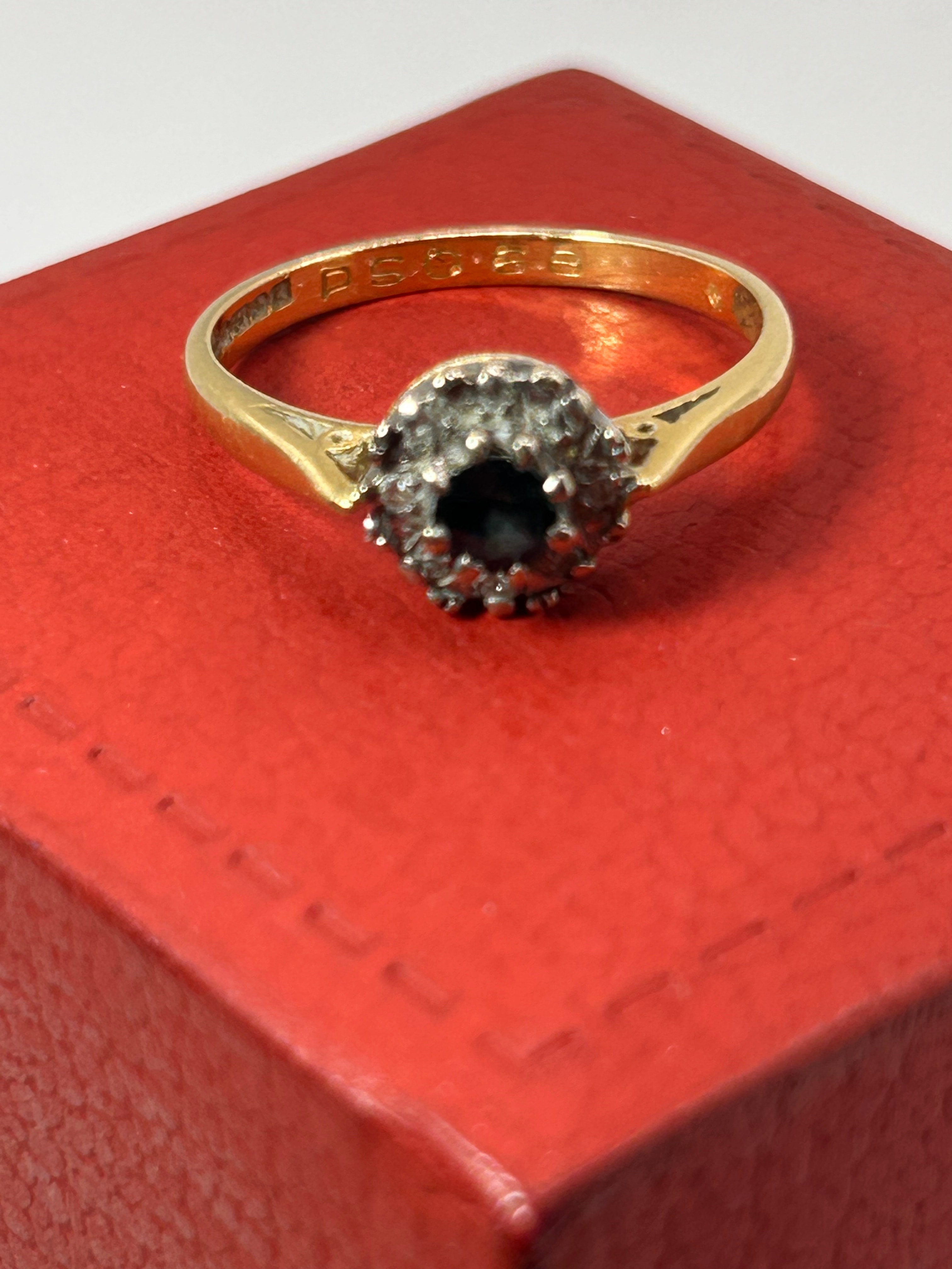 An 18K yellow gold finger ring featuring a cluster head setting. The central round faceted dark blue sapphire is encircled by a halo of smaller, colorless faceted diamonds. The cluster setting is crafted from a white metal.
