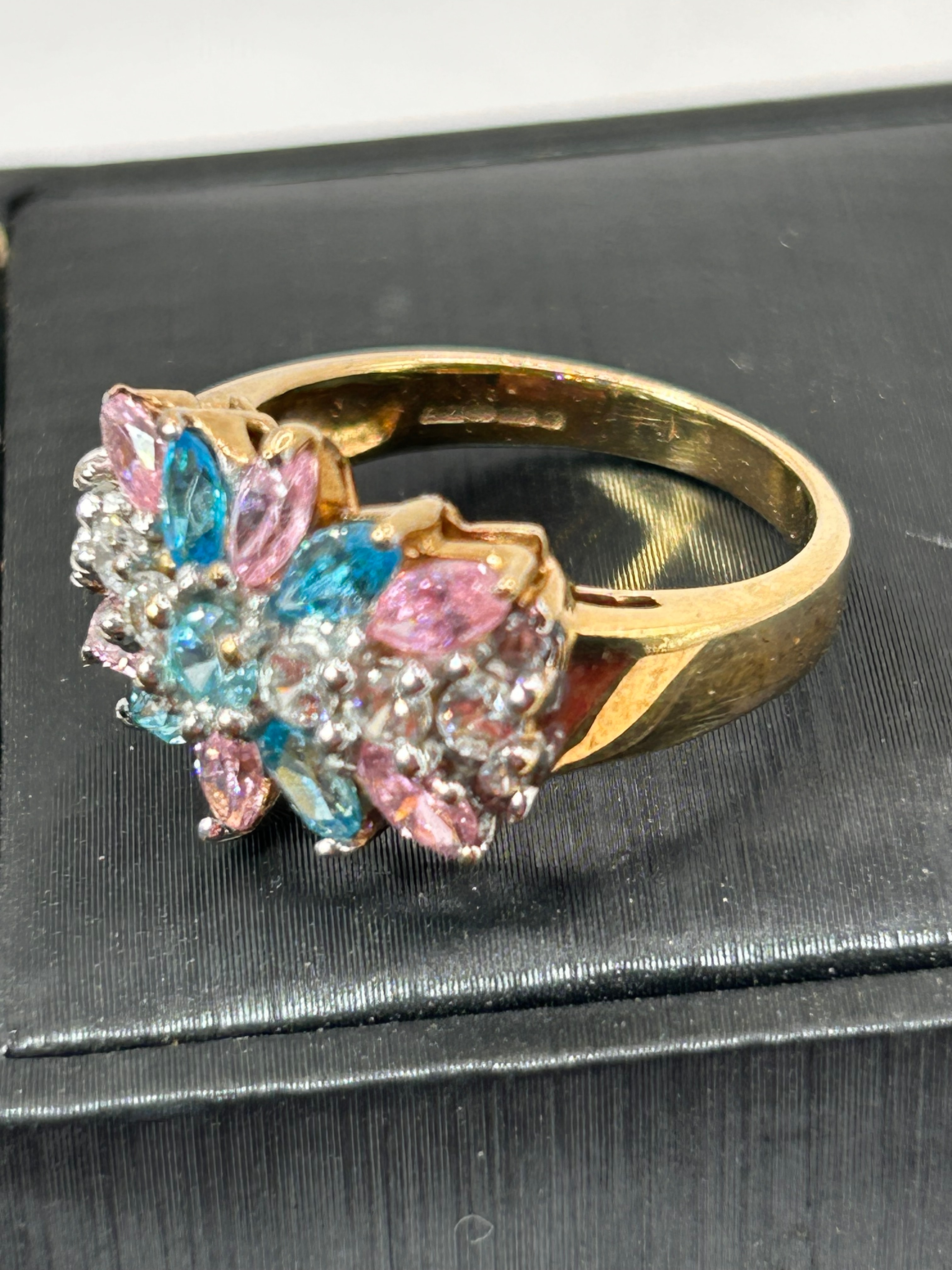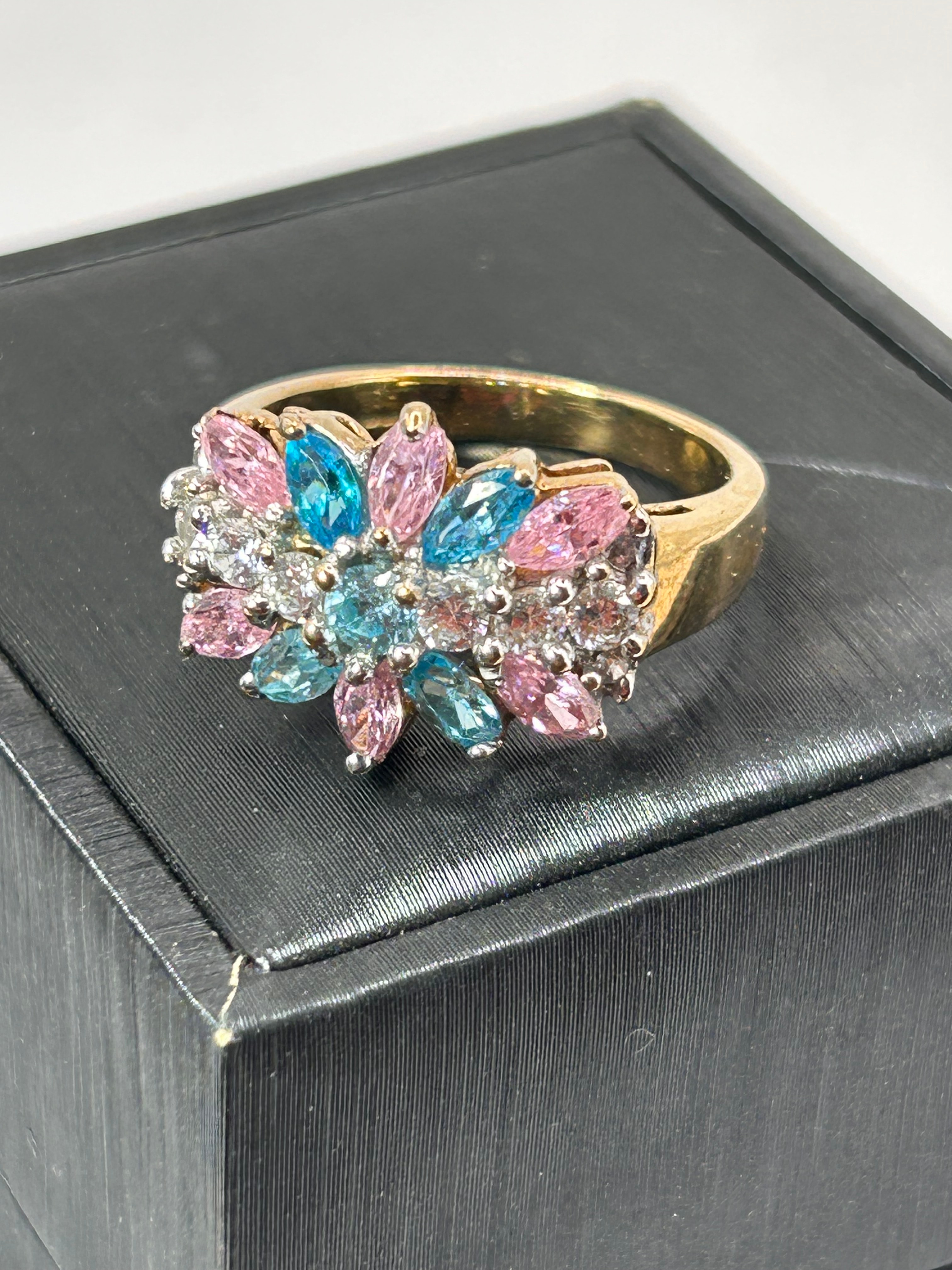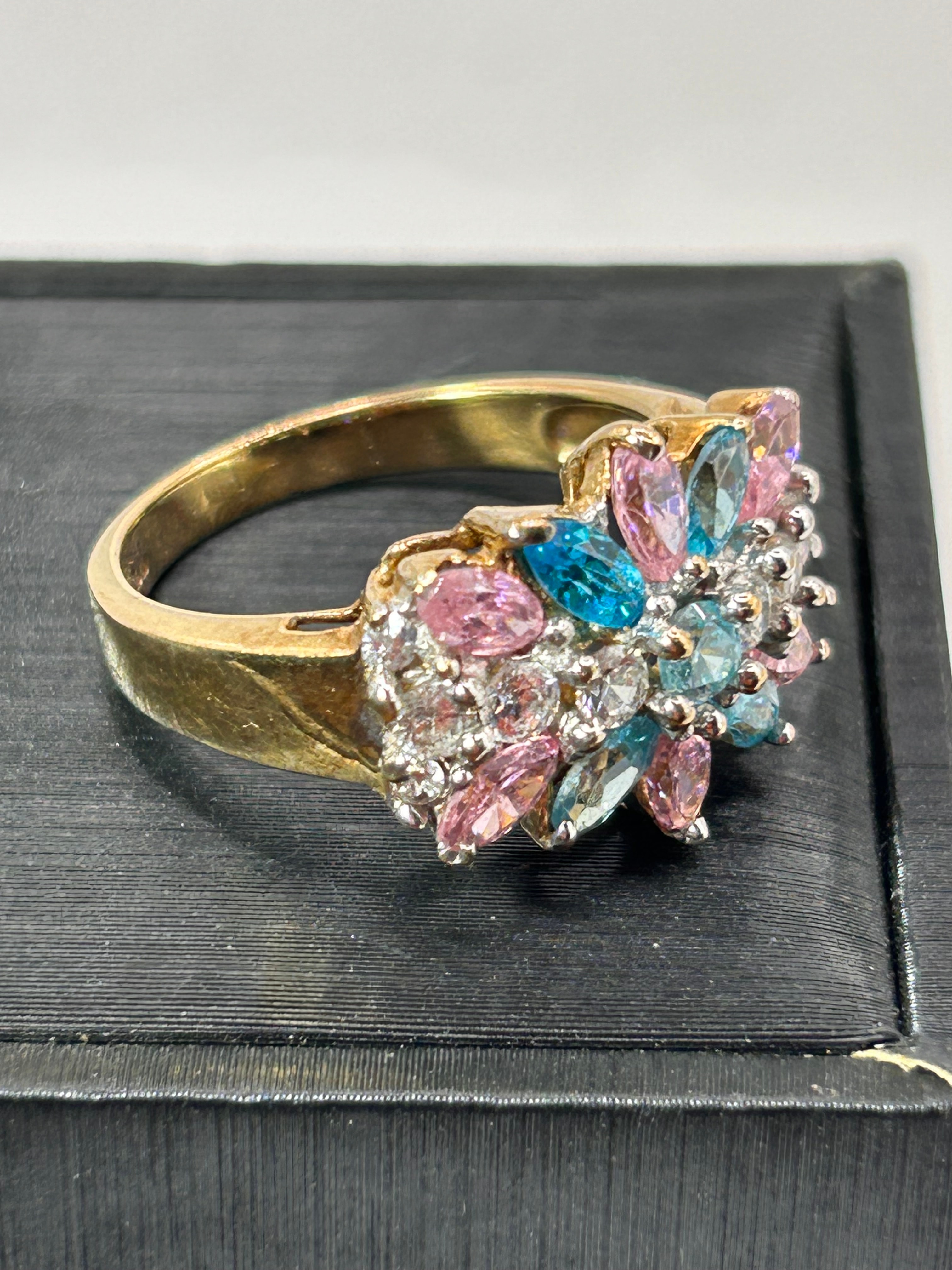 A contemporary-style finger ring featuring a prominent cluster design in a floral or starburst motif. The band and setting are crafted from 9ct yellow gold. The central cluster is adorned with numerous faceted stones, presenting a vibrant mix of light pink, light blue/aquamarine, and clear/white colors, arranged to form a multi-petaled or star-like pattern.