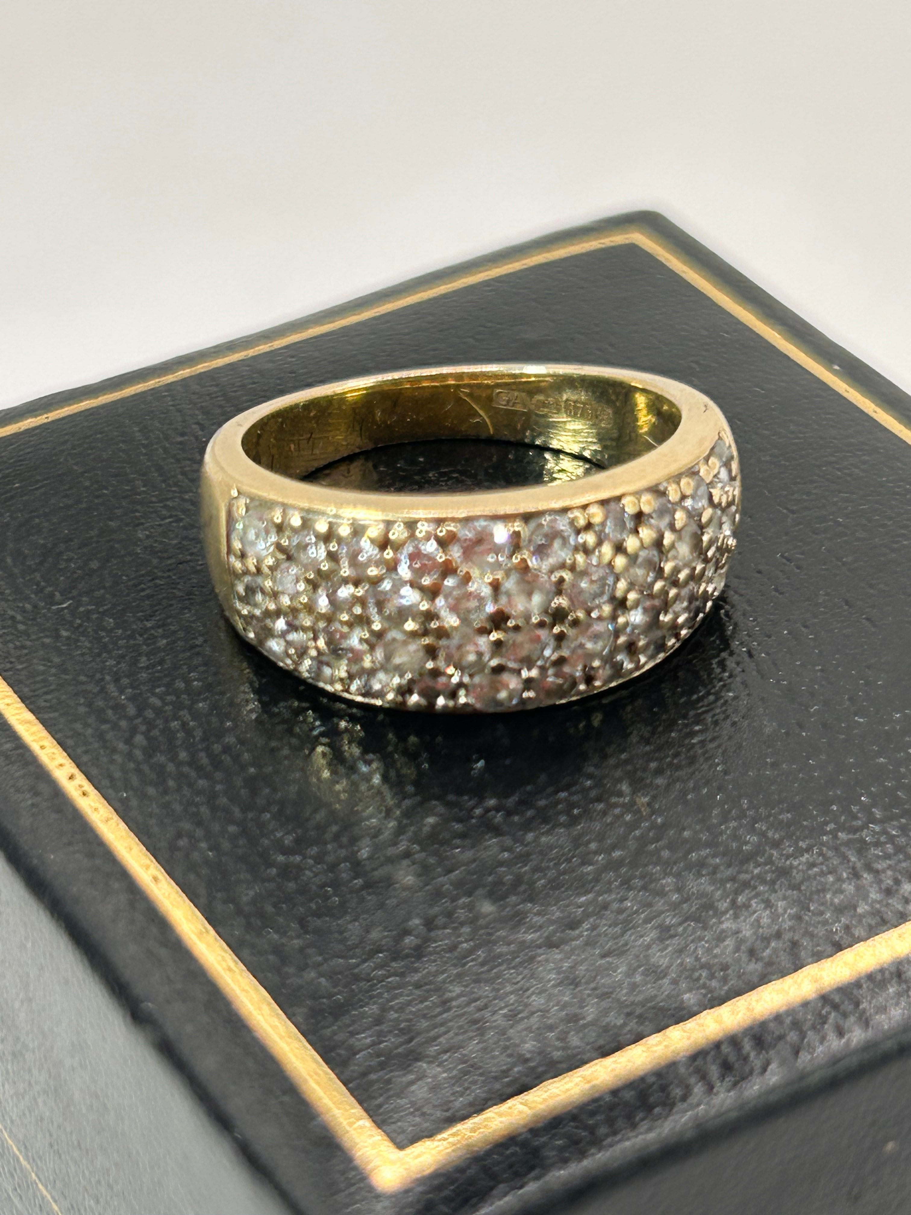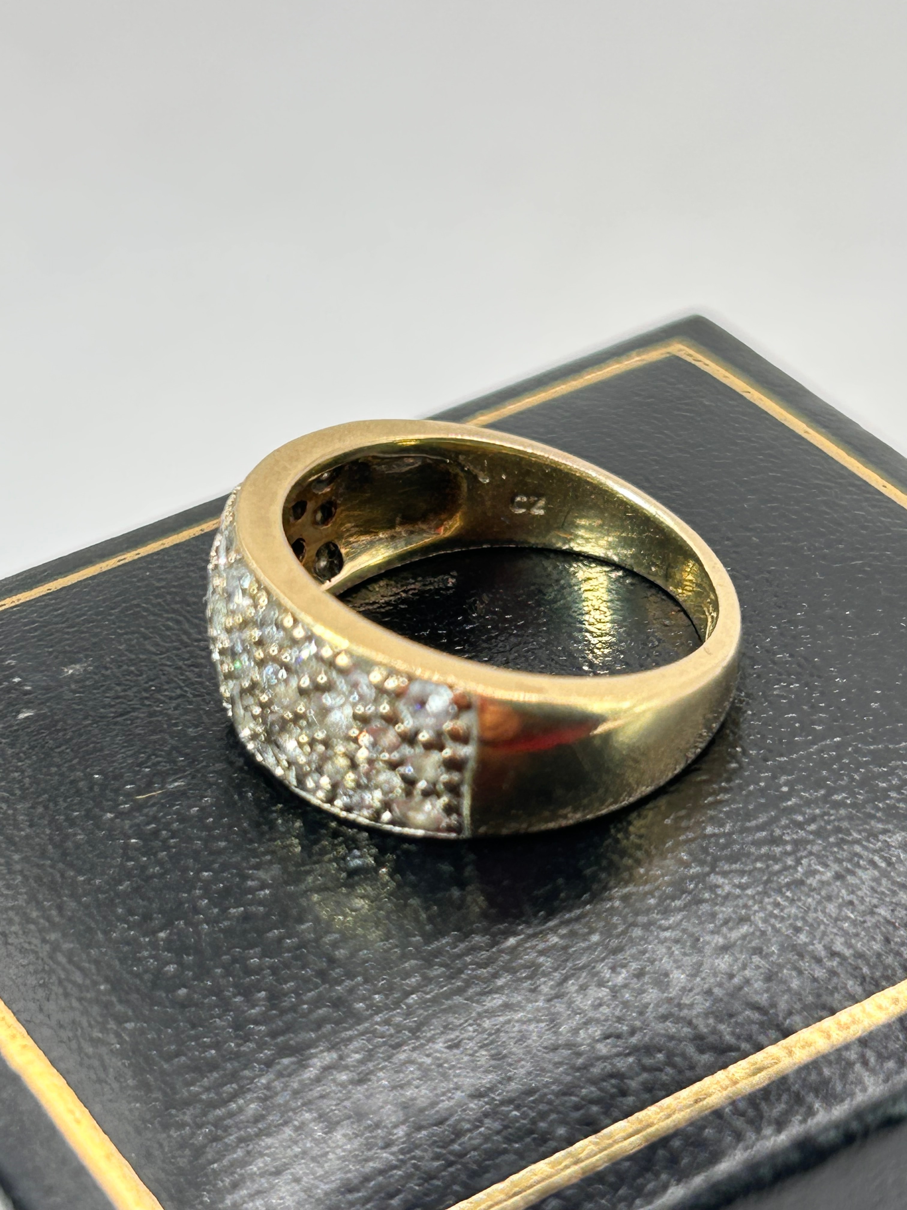A 9ct yellow gold cubic zirconia domed pavé cluster ring. The ring is crafted from 9ct yellow gold and features a wide, domed band with its surface extensively pavé-set with numerous small, round, brilliant-cut, colorless stones. The interior of the band is clearly stamped ‘CZ’, confirming the stones are Cubic Zirconia.